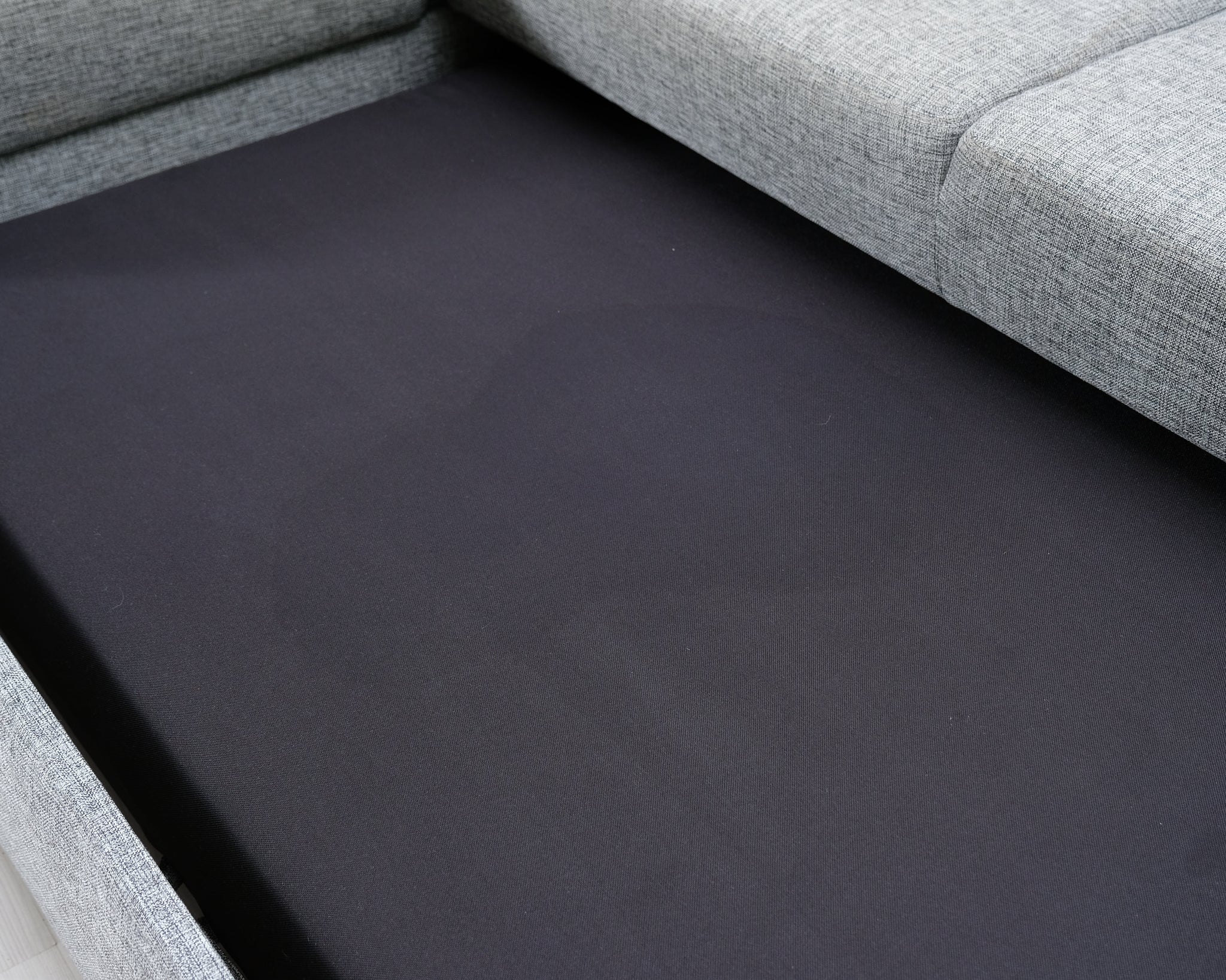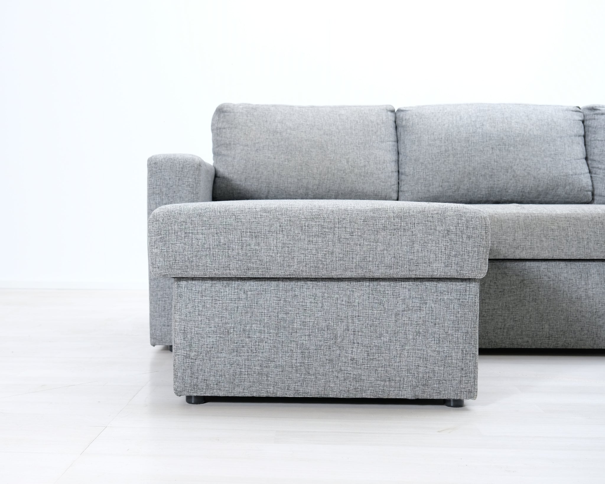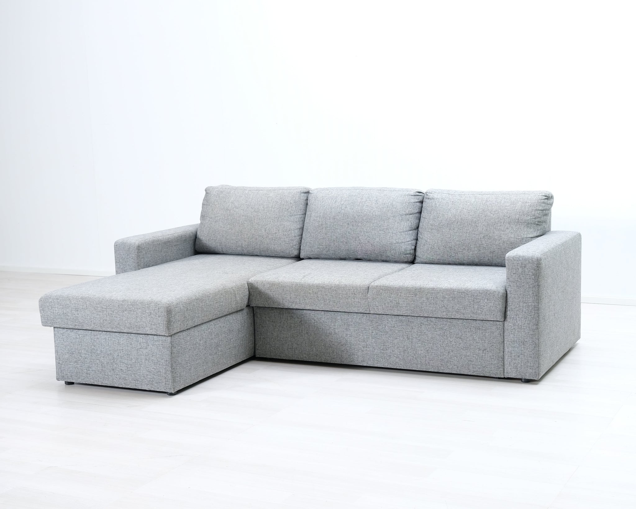 Kolmen istuttava VIGO-divaanisvuodesohva. Vaaleanharmaa kangasverhoilu. Sohvassa on tilava vuodevaatelaatikko.