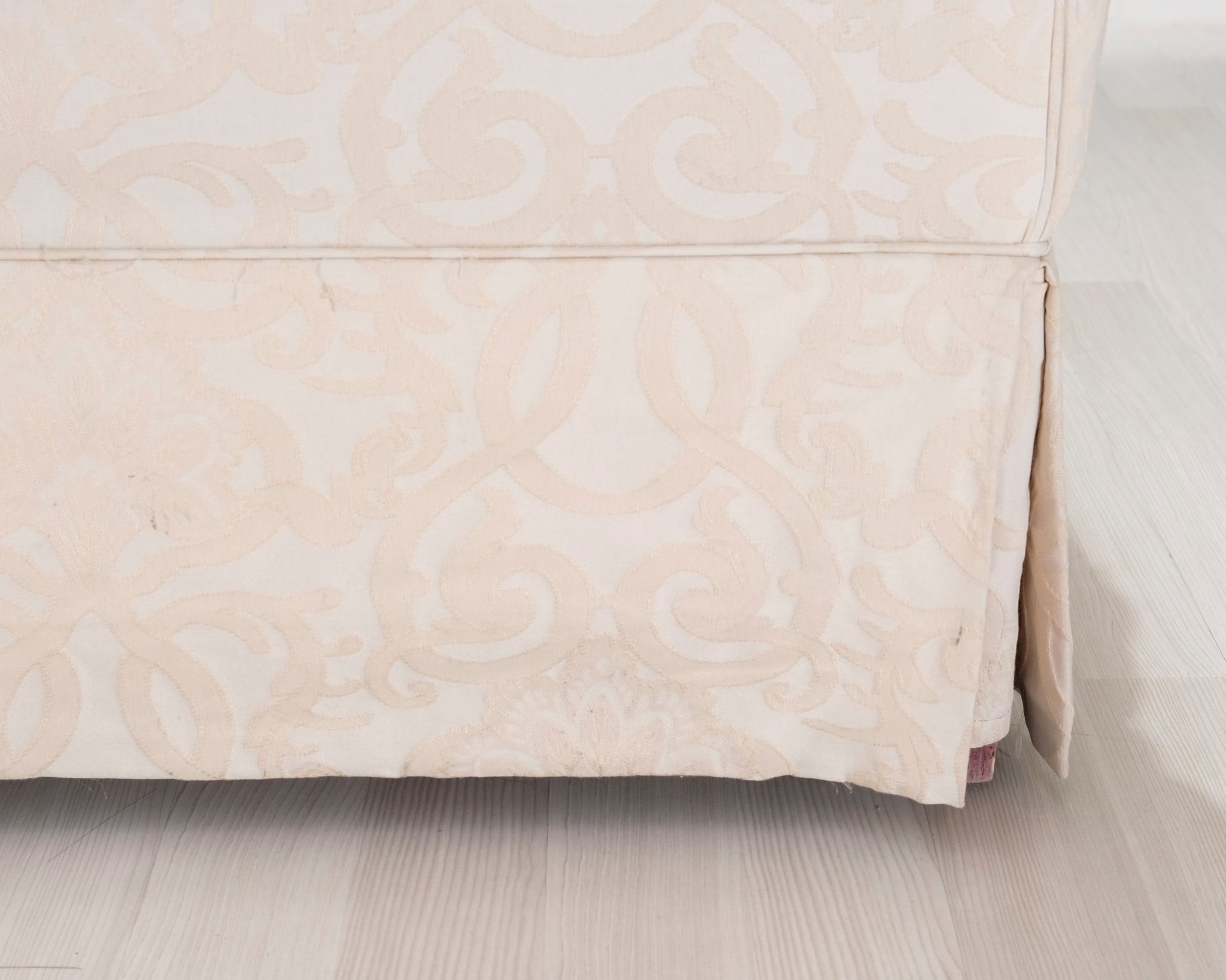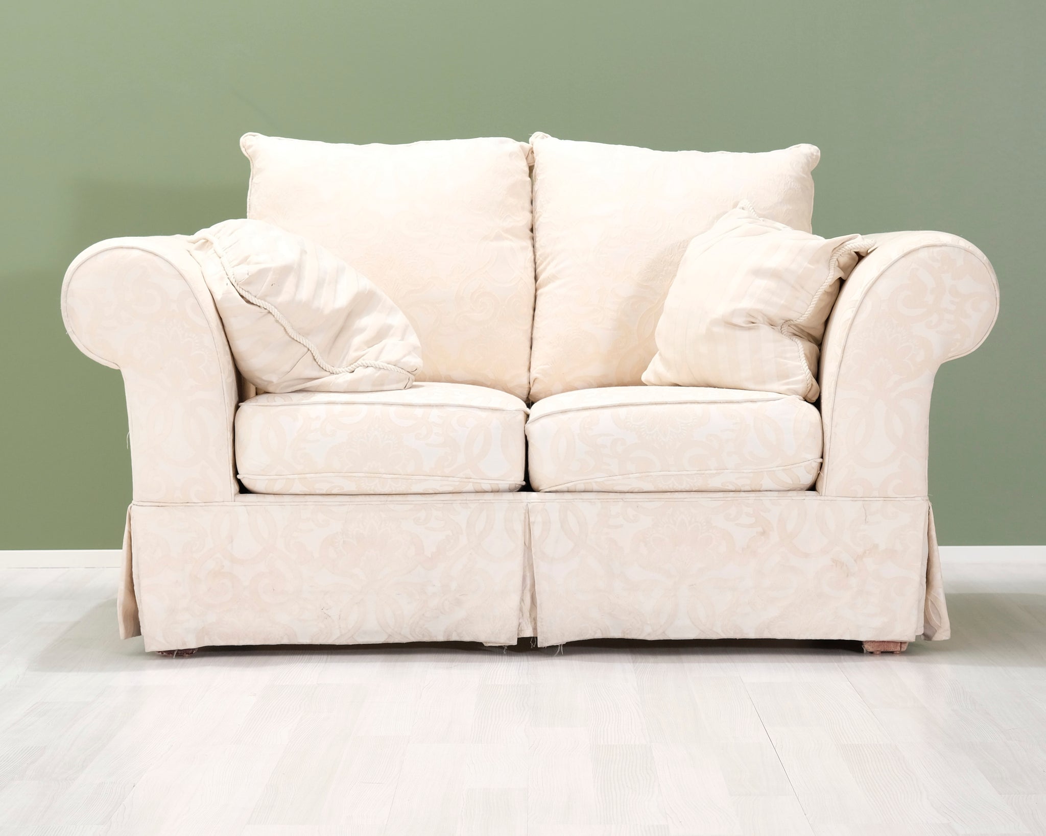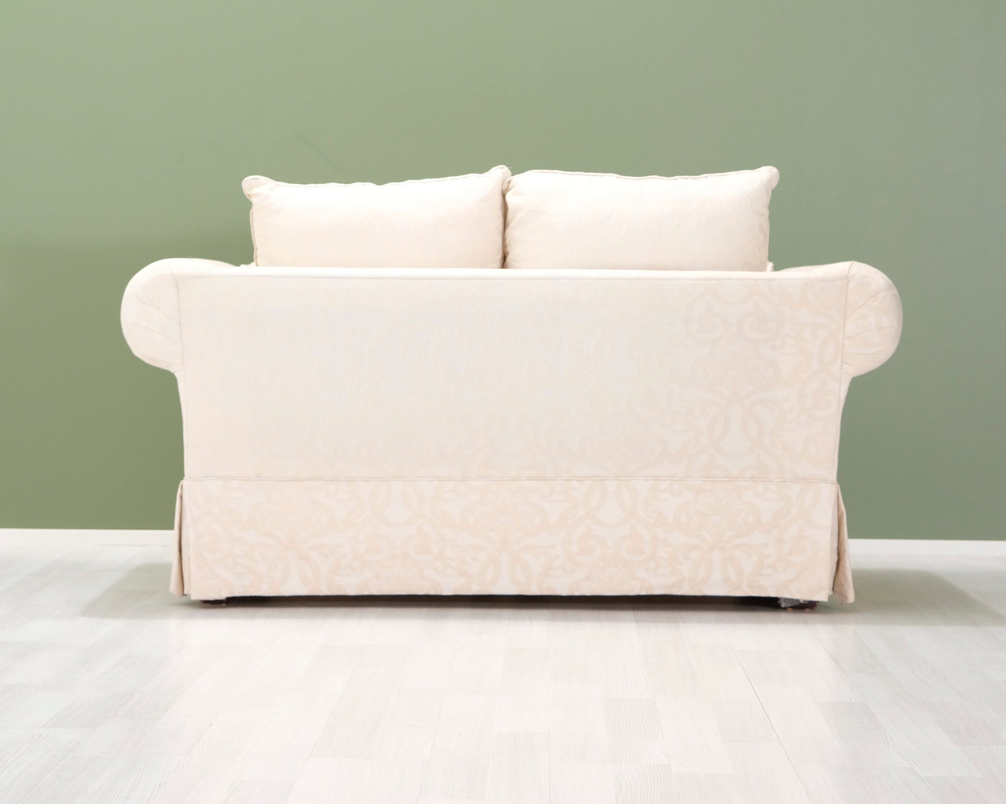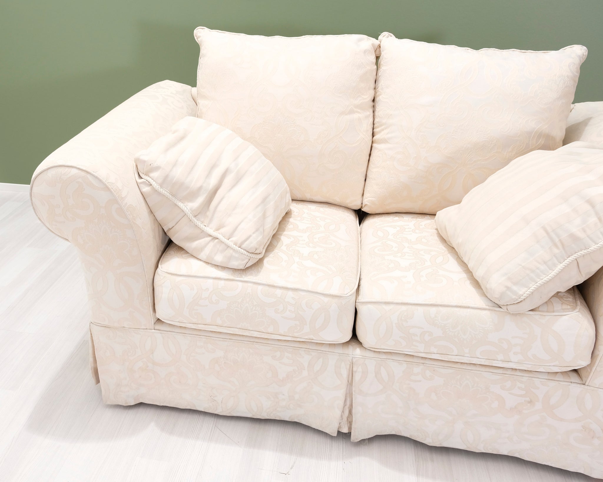 Kompakti, kahden istuttava kangassohva. Beige verhoilu, jossa kevyttä kuviota. Tyynyt ovat konepestävät.