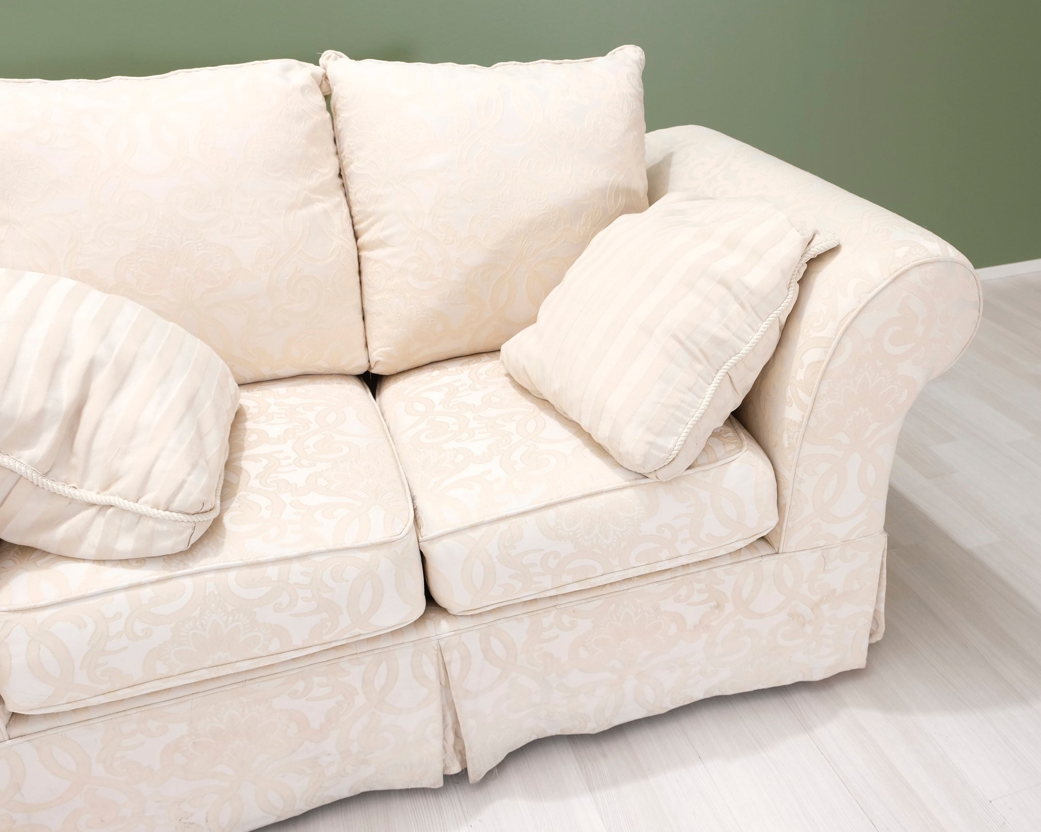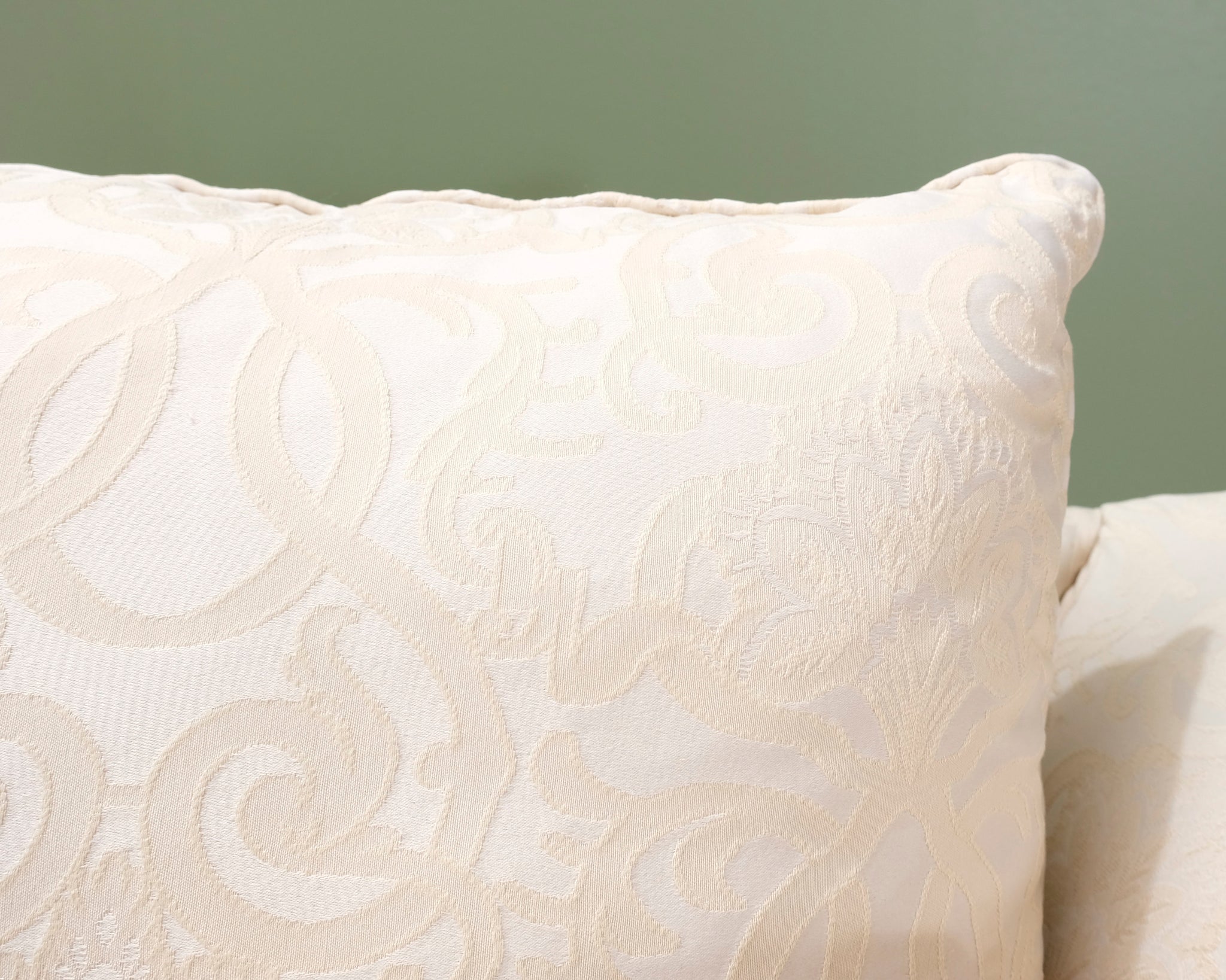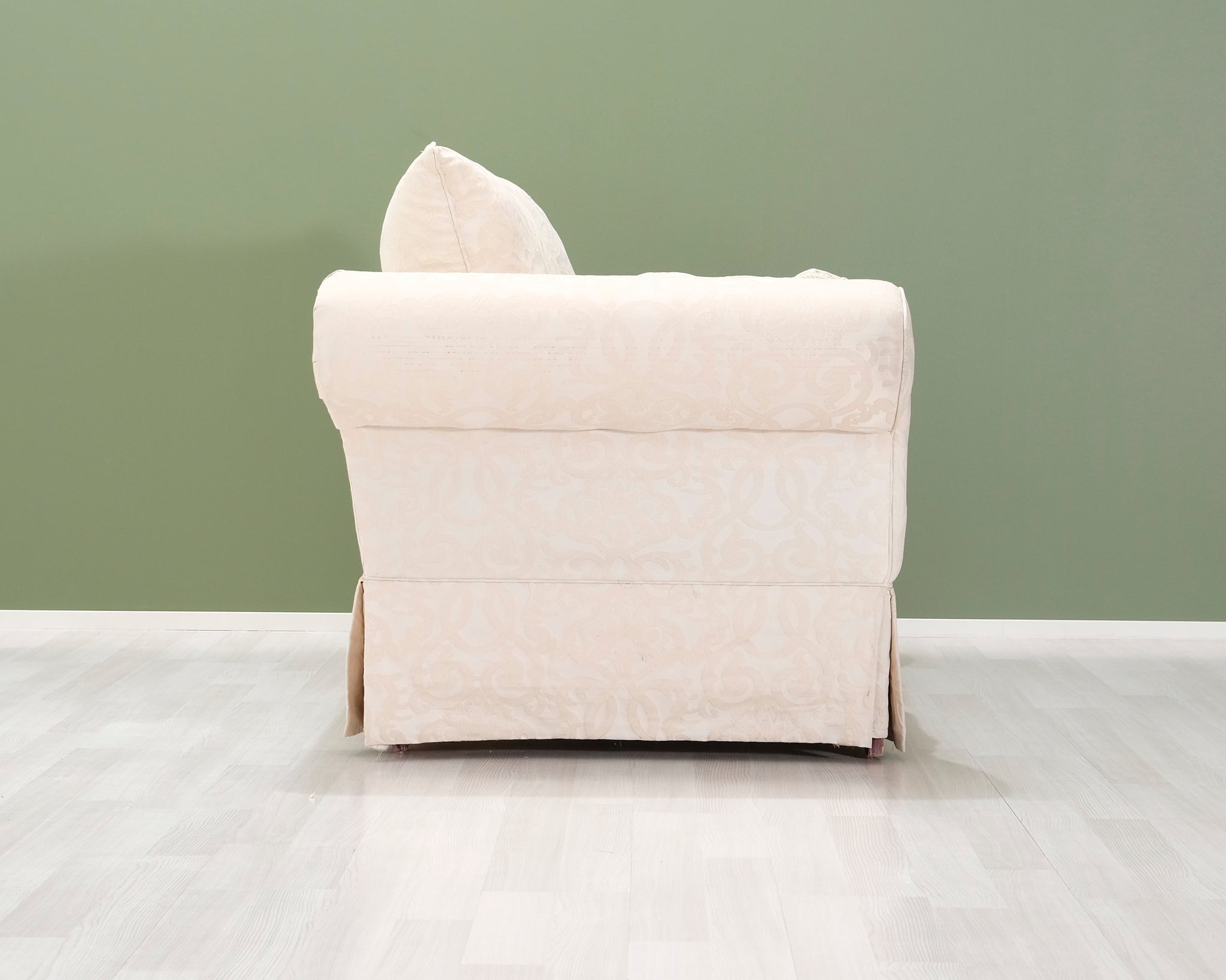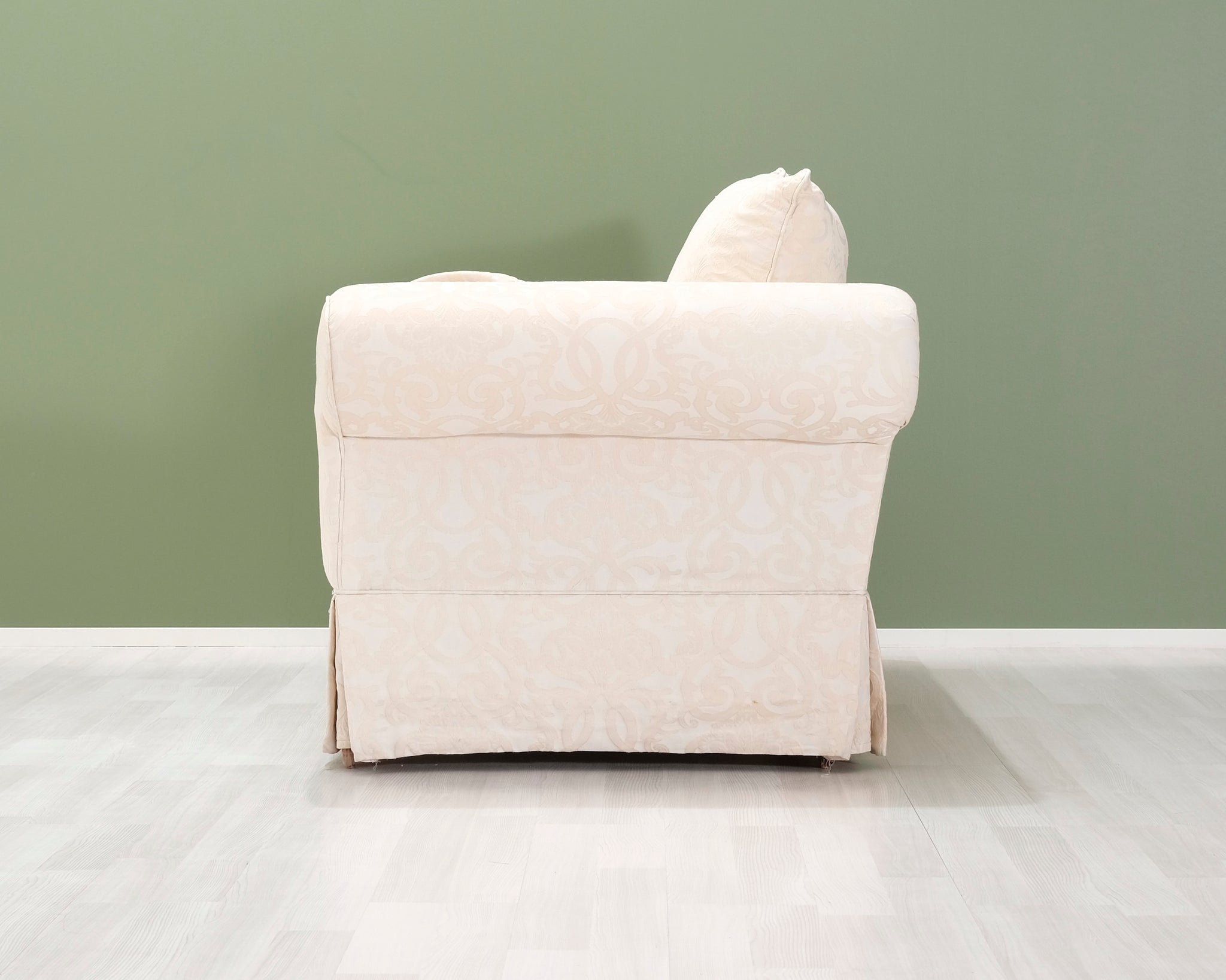 Kompakti, kahden istuttava kangassohva. Beige verhoilu, jossa kevyttä kuviota. Tyynyt ovat konepestävät.
