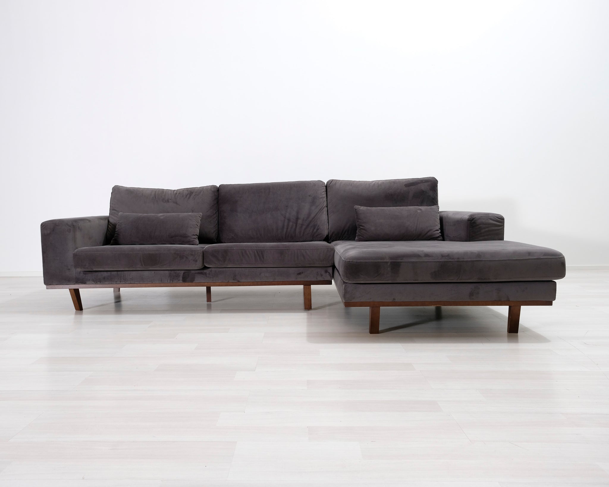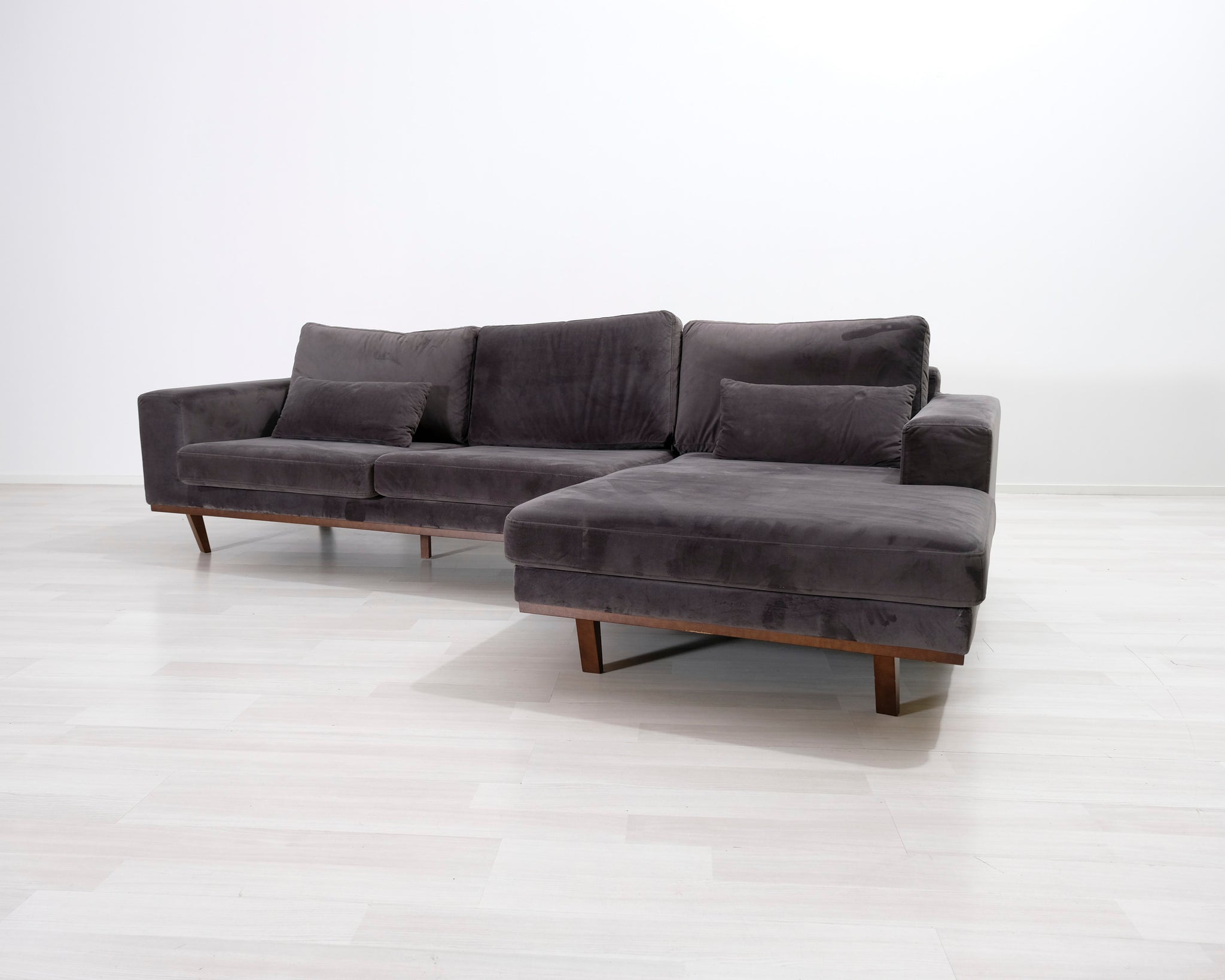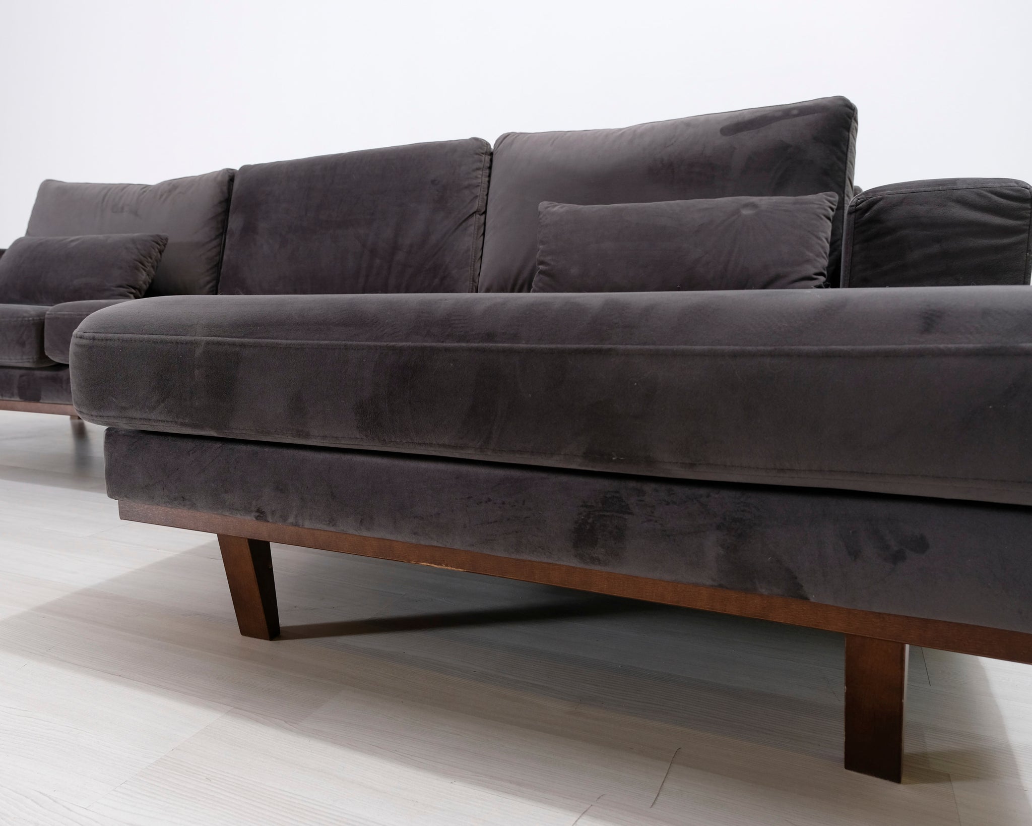 Suurikokoinen divaanisohva kahdella irtotyynyllä. Harmaa samettiverhoilu.