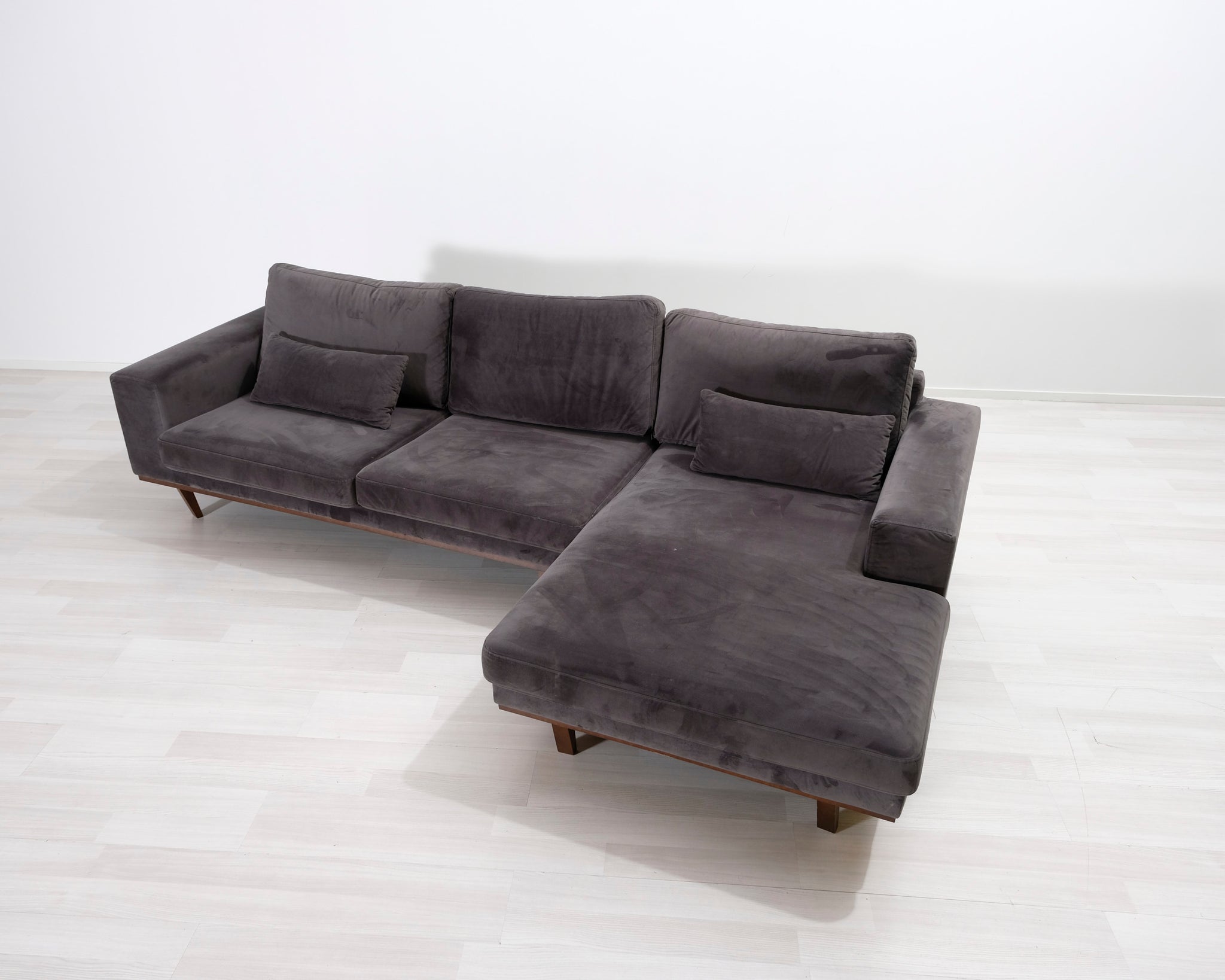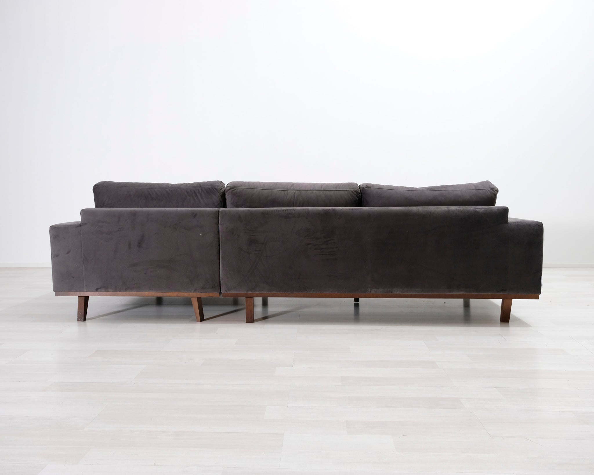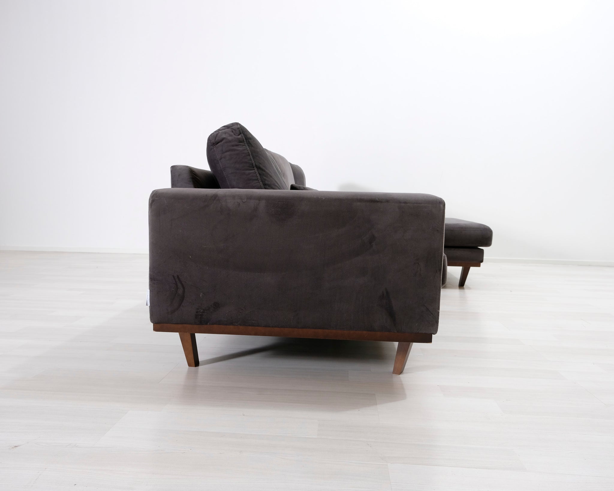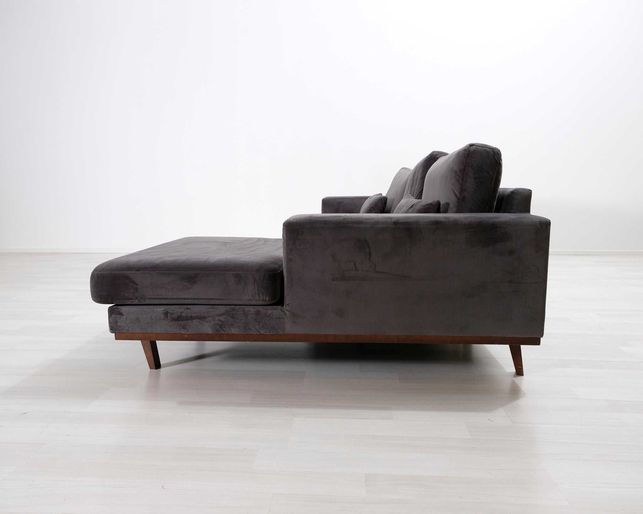 Suurikokoinen divaanisohva kahdella irtotyynyllä. Harmaa samettiverhoilu.
