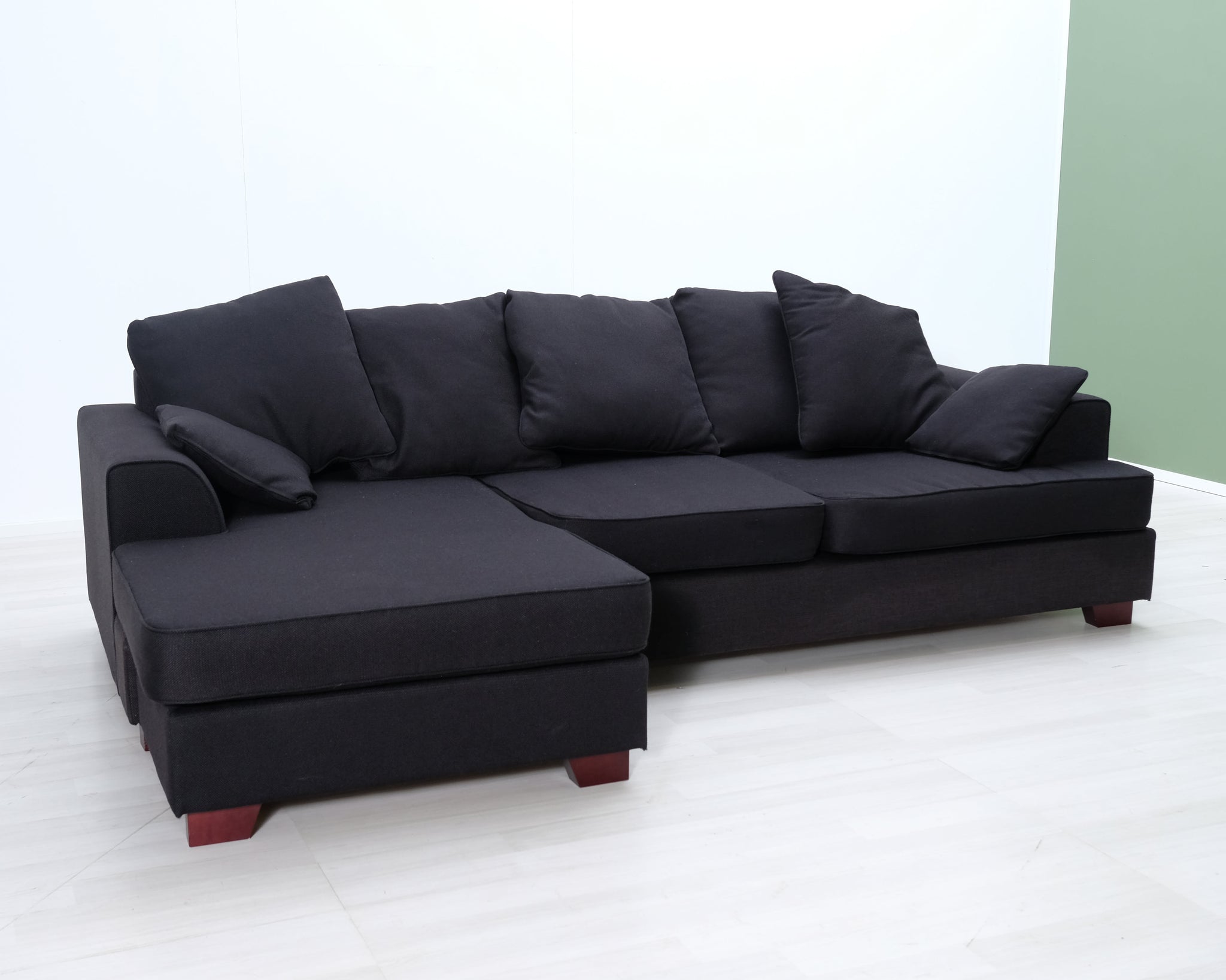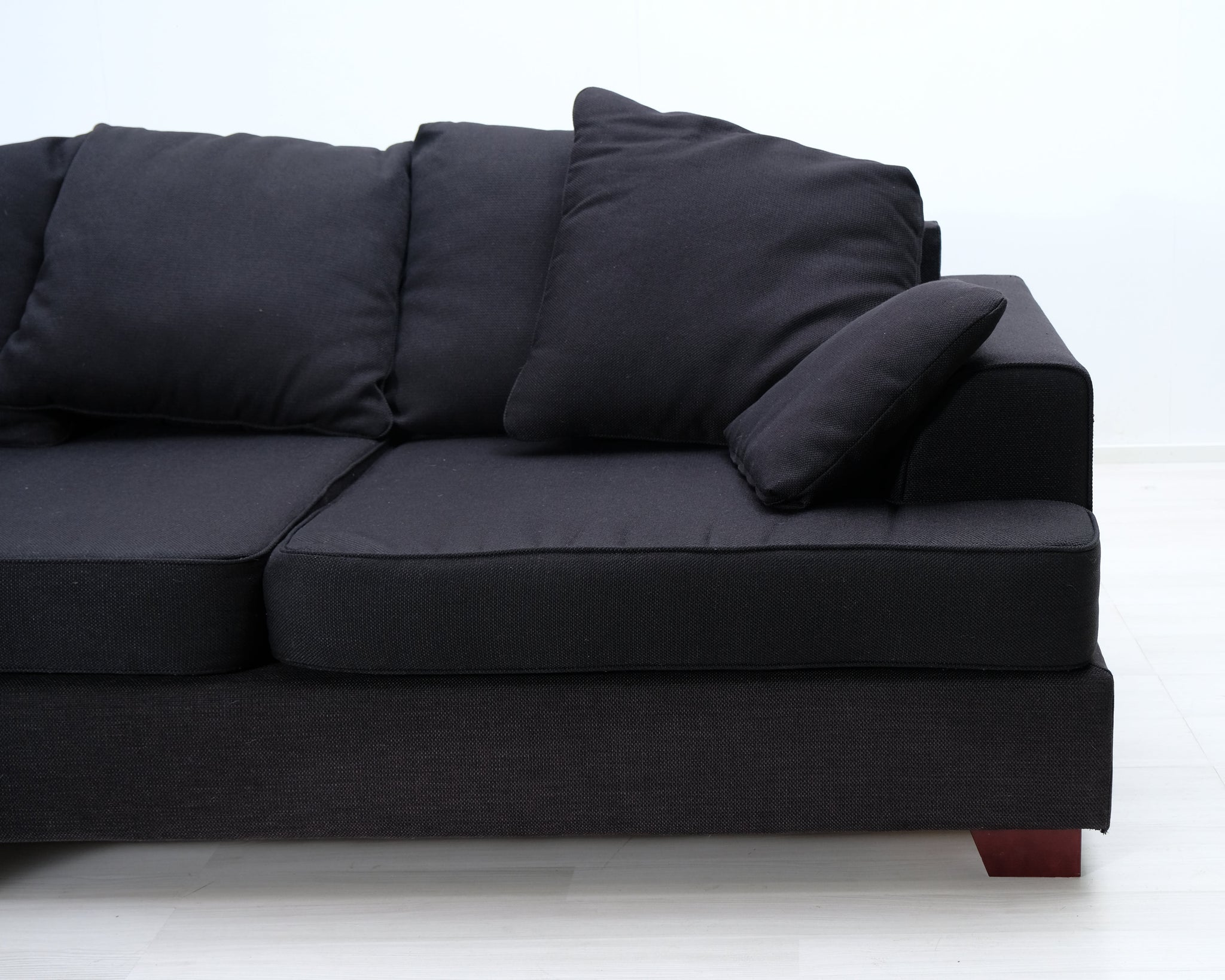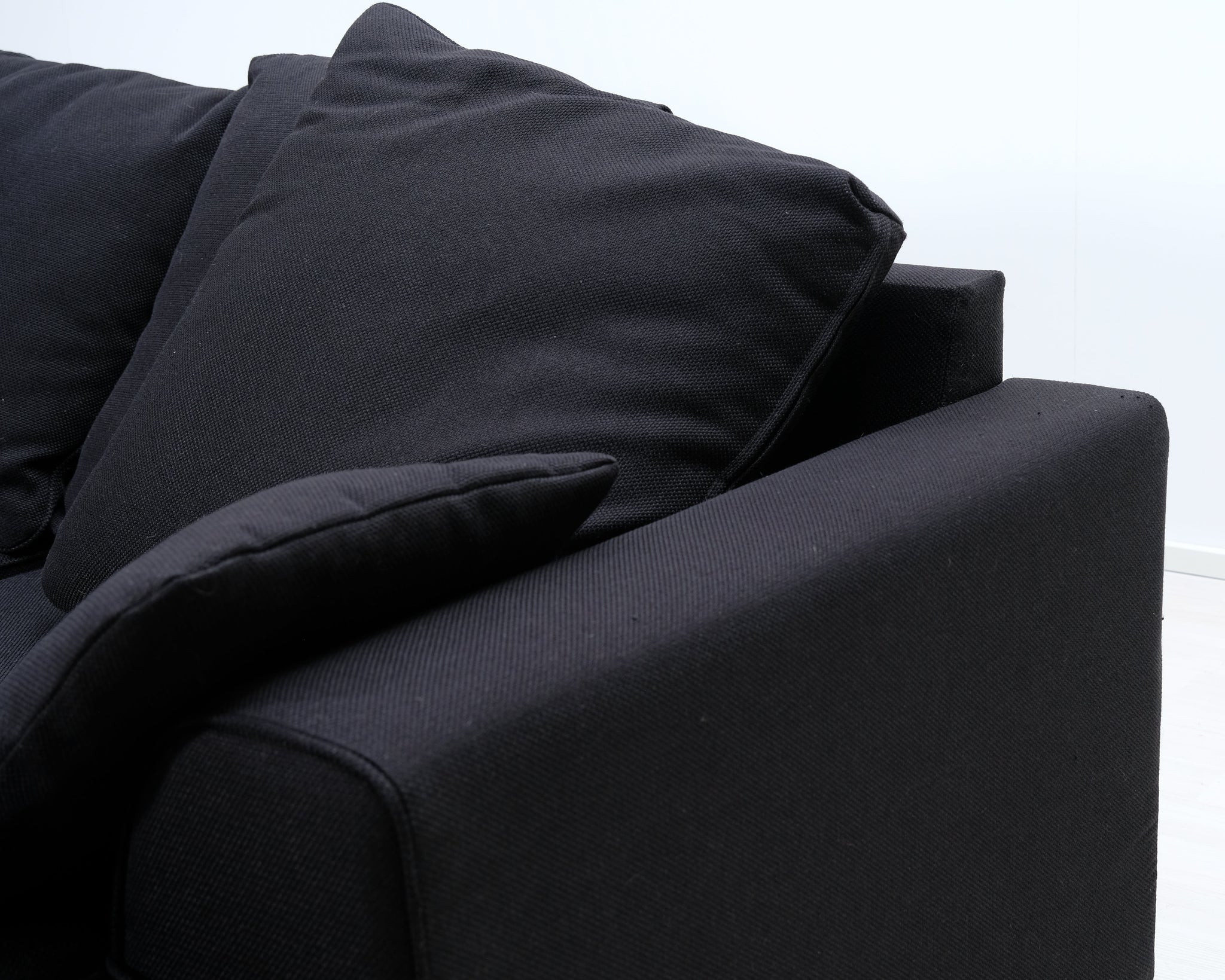 Neljän istuttava divaanisohva. Tummanharmaa kangasverhoilu. Leveä divaaniosa tekee sohvasta todella mukavan isommankin porukan tarpeisiin.