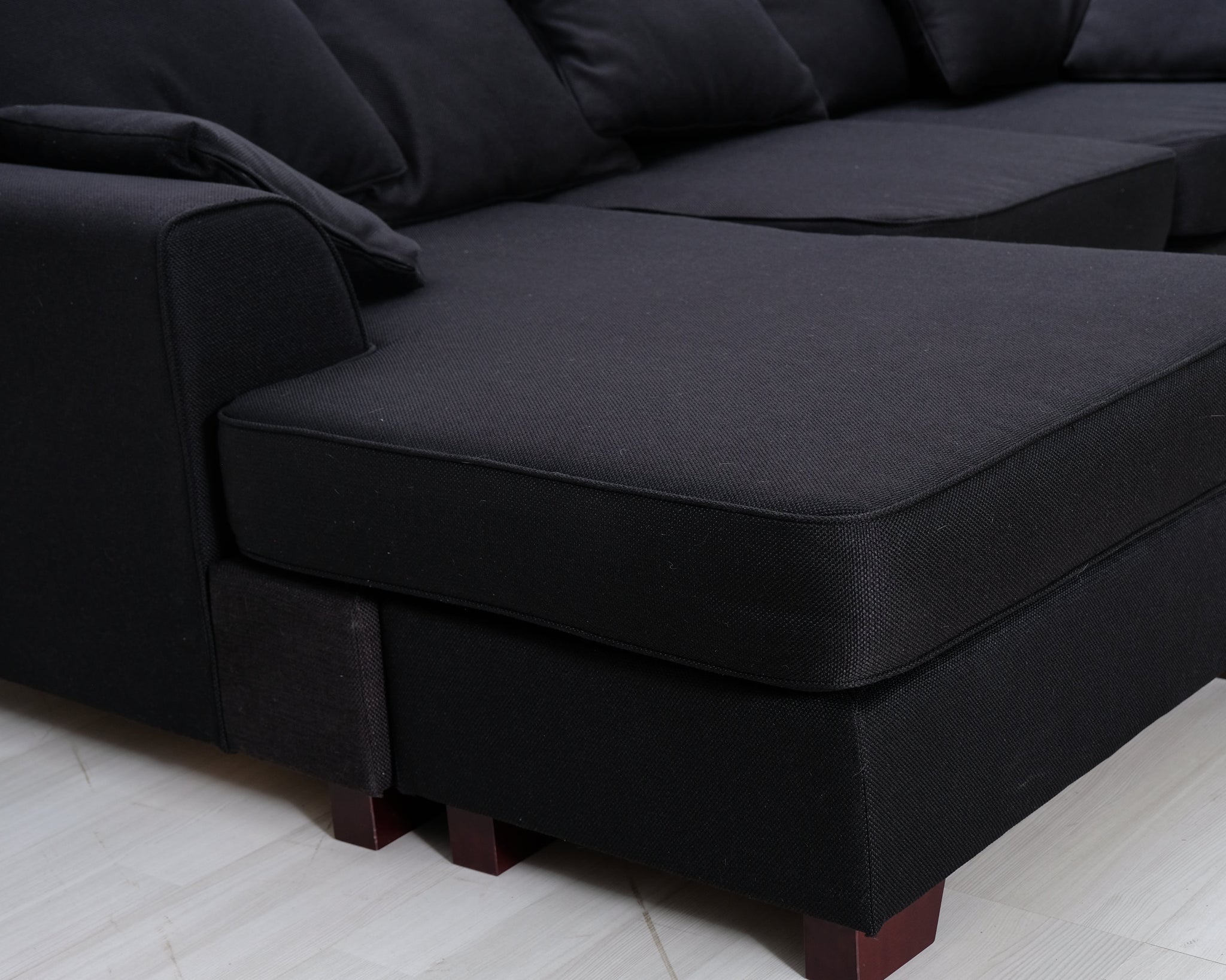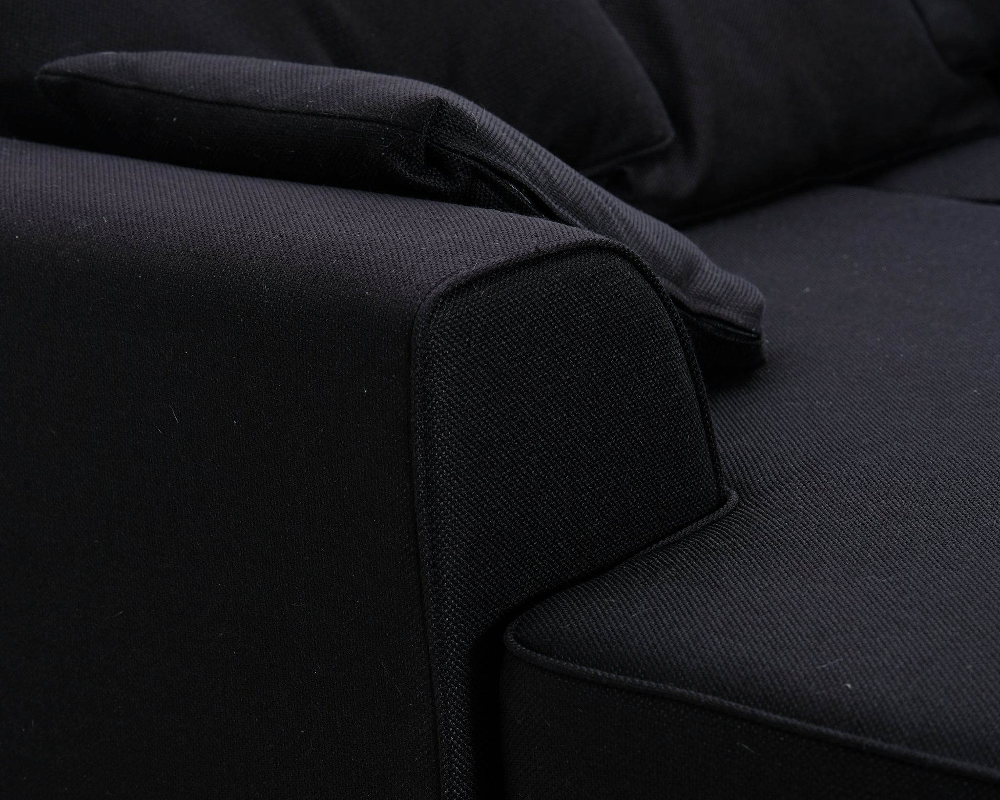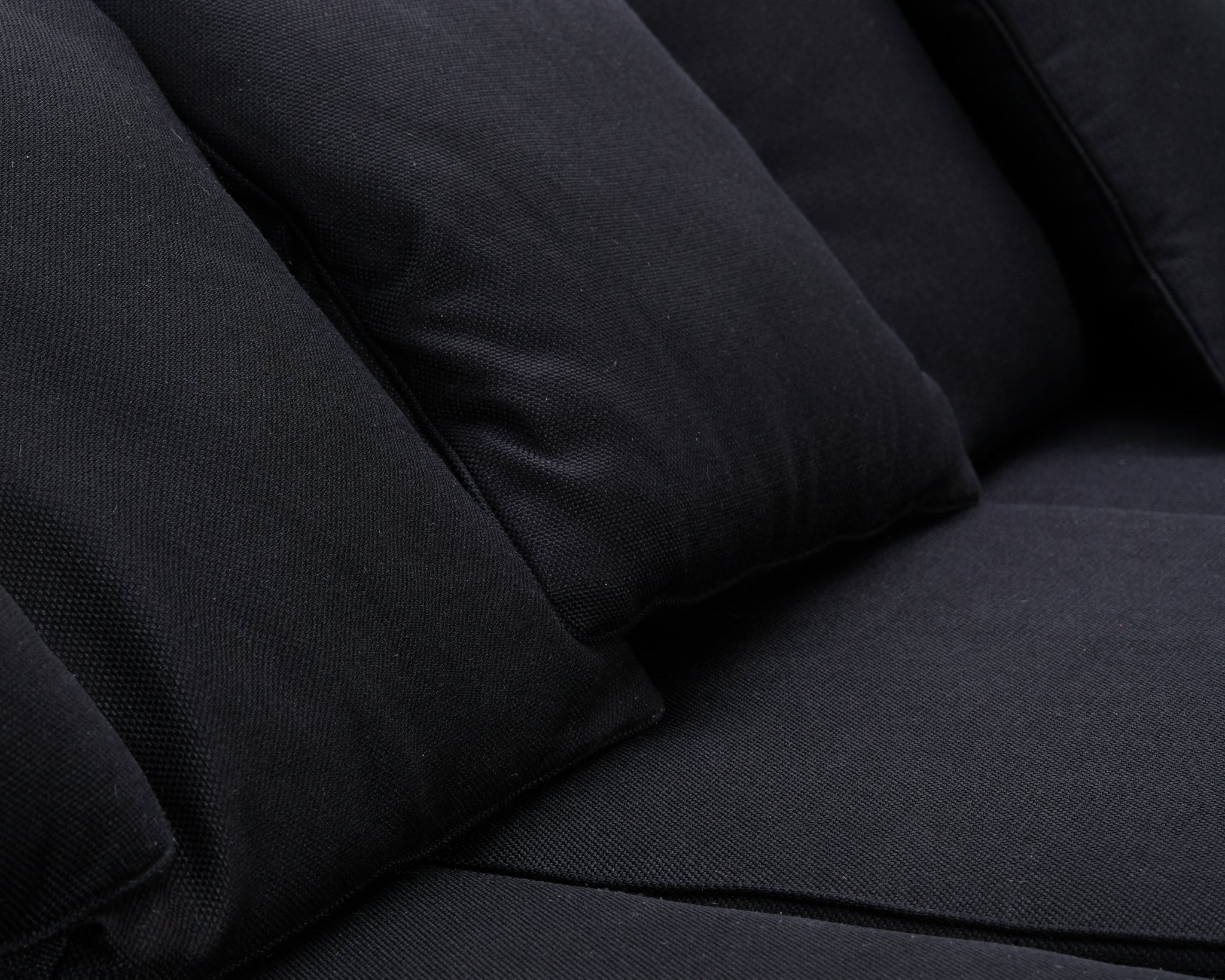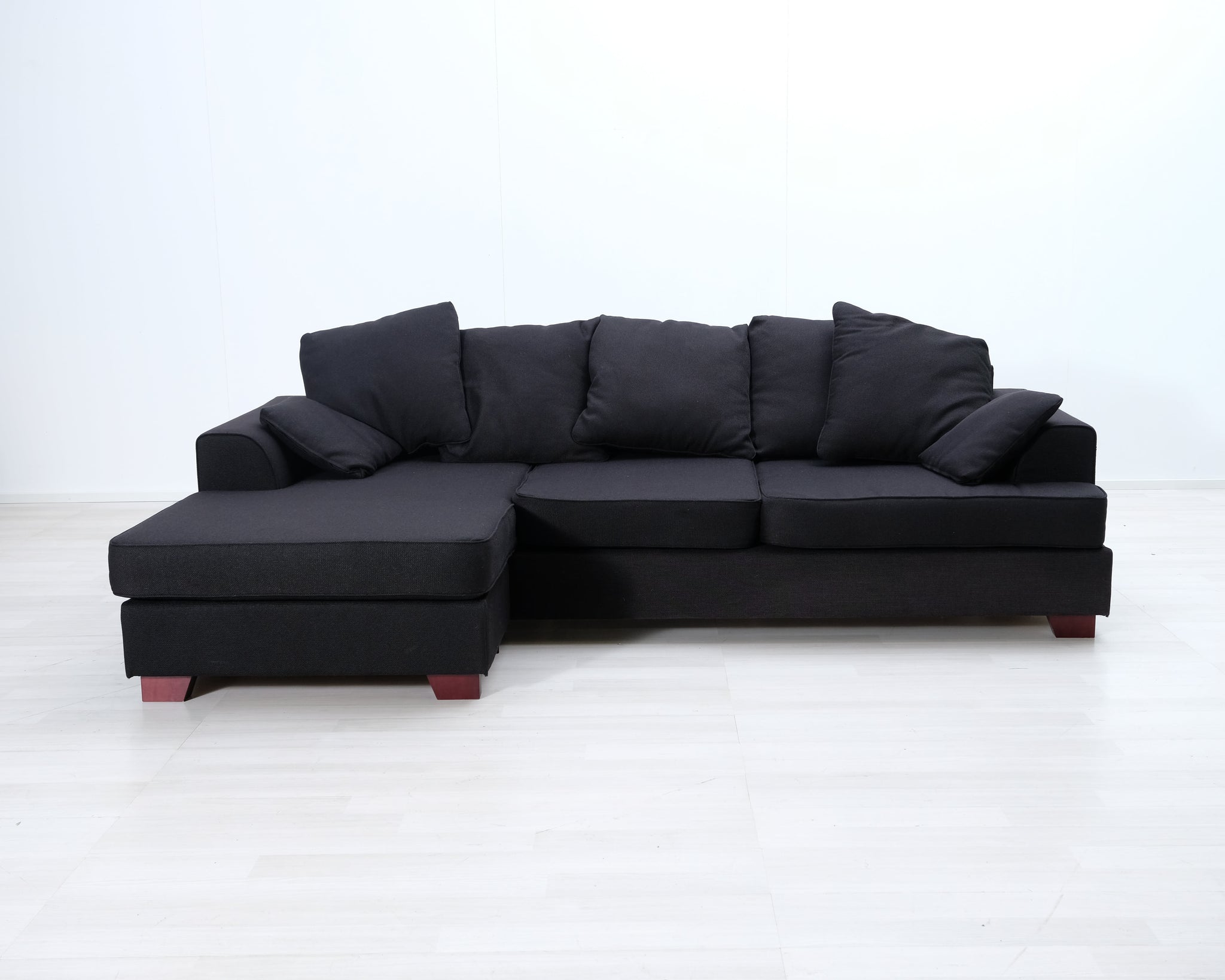 Neljän istuttava divaanisohva. Tummanharmaa kangasverhoilu. Leveä divaaniosa tekee sohvasta todella mukavan isommankin porukan tarpeisiin.