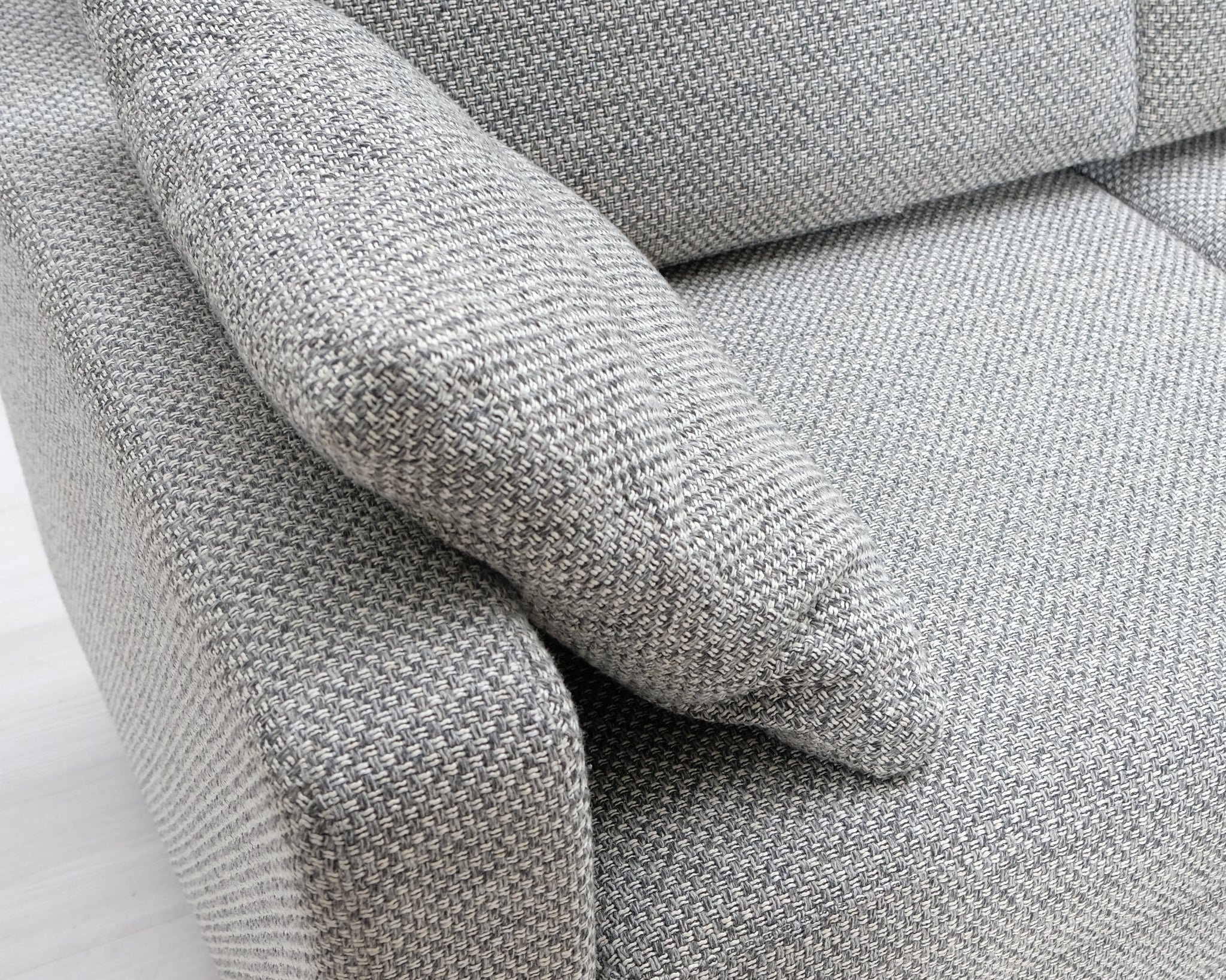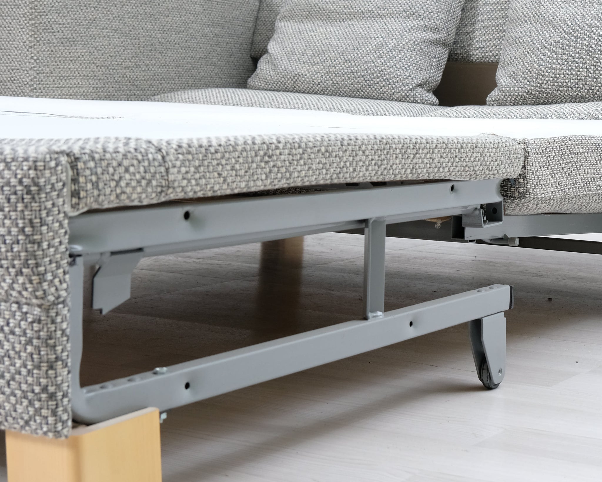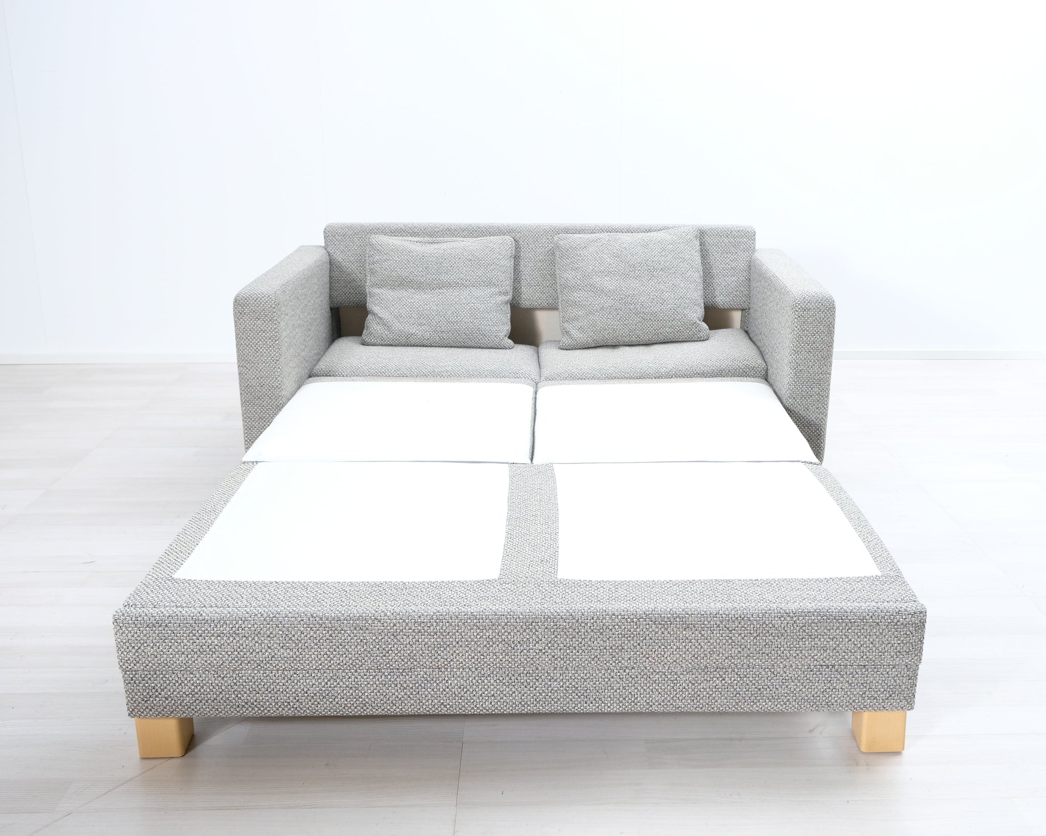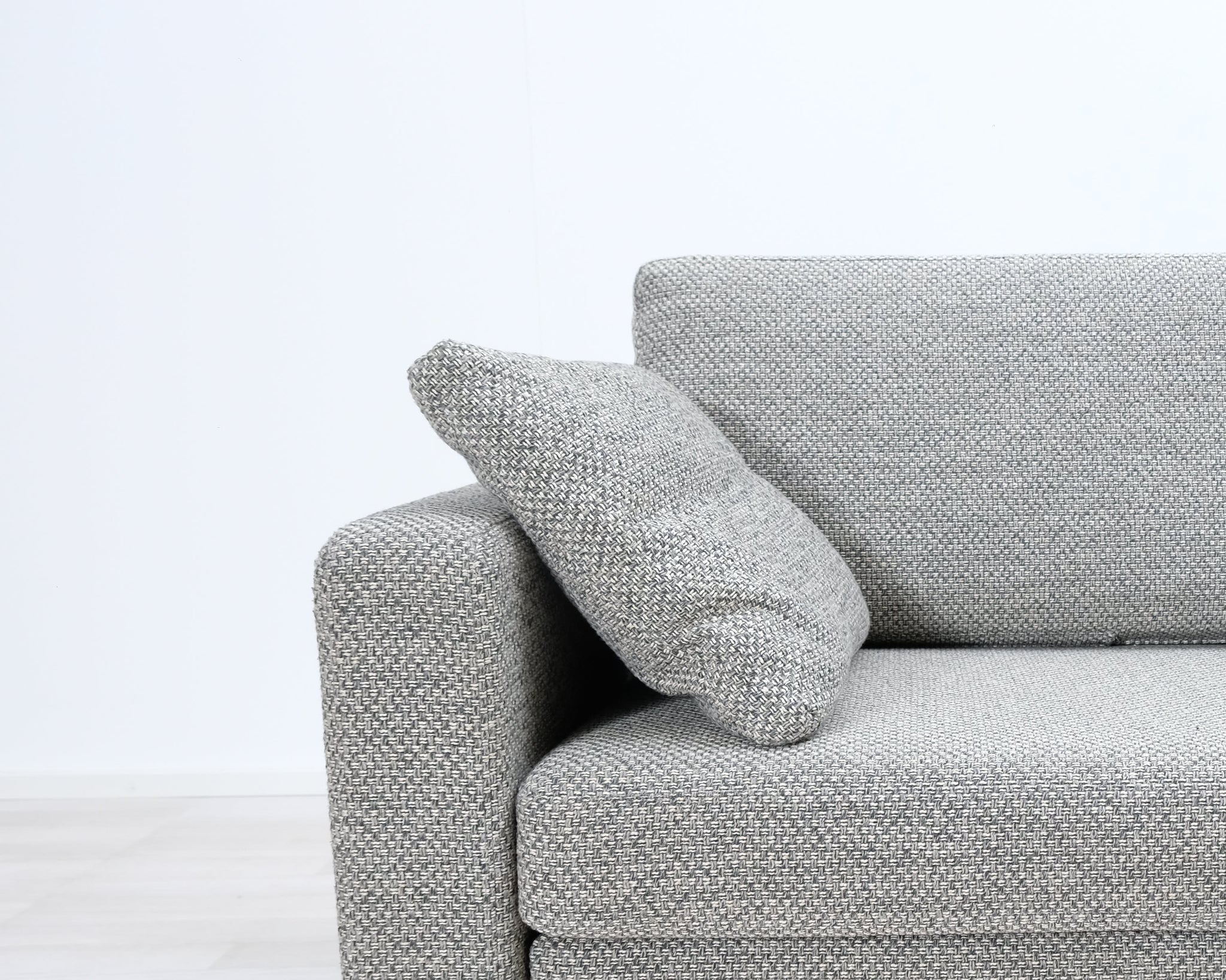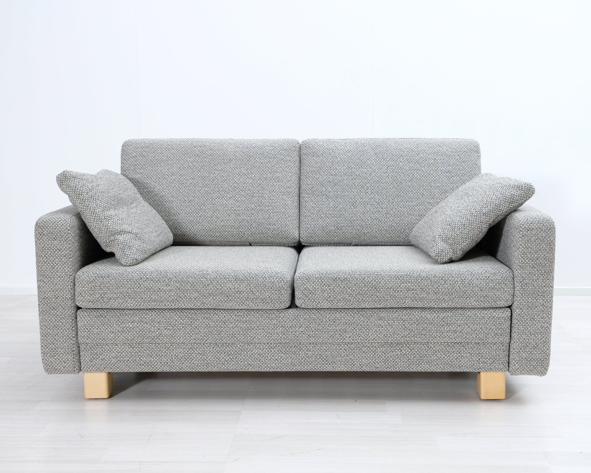 Kahden istuttava kompakti vuodesohva. Harmaa kangasverhoilu.