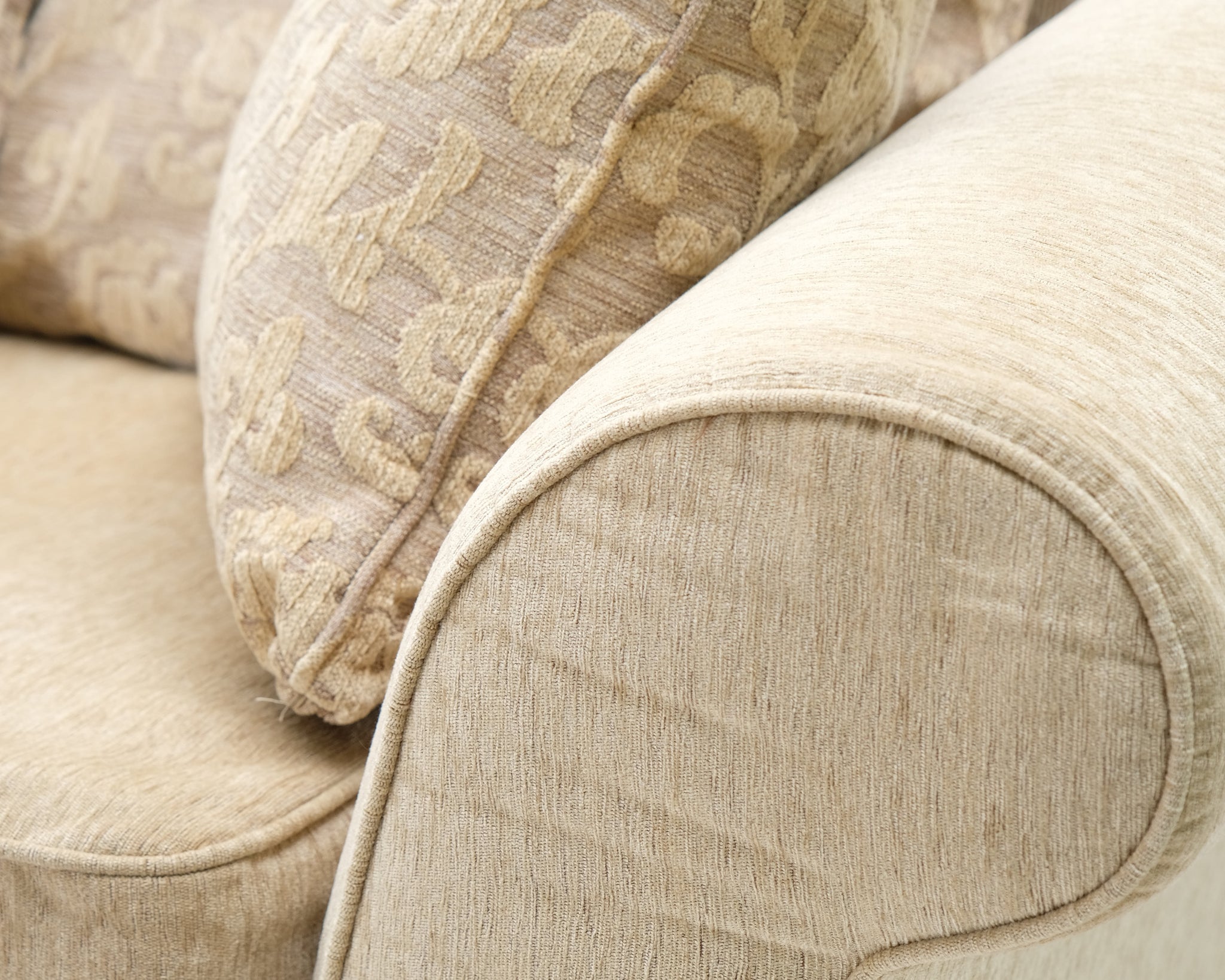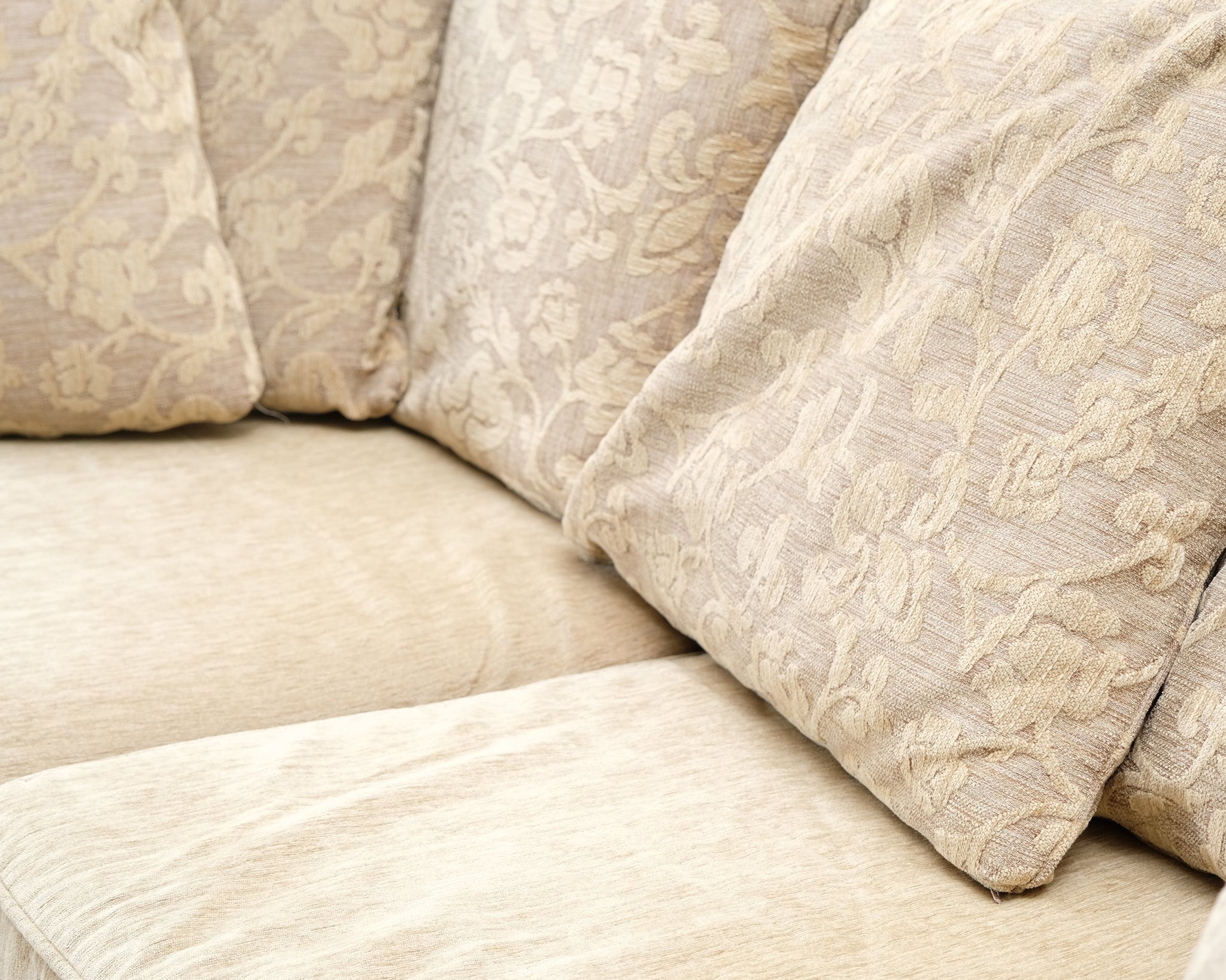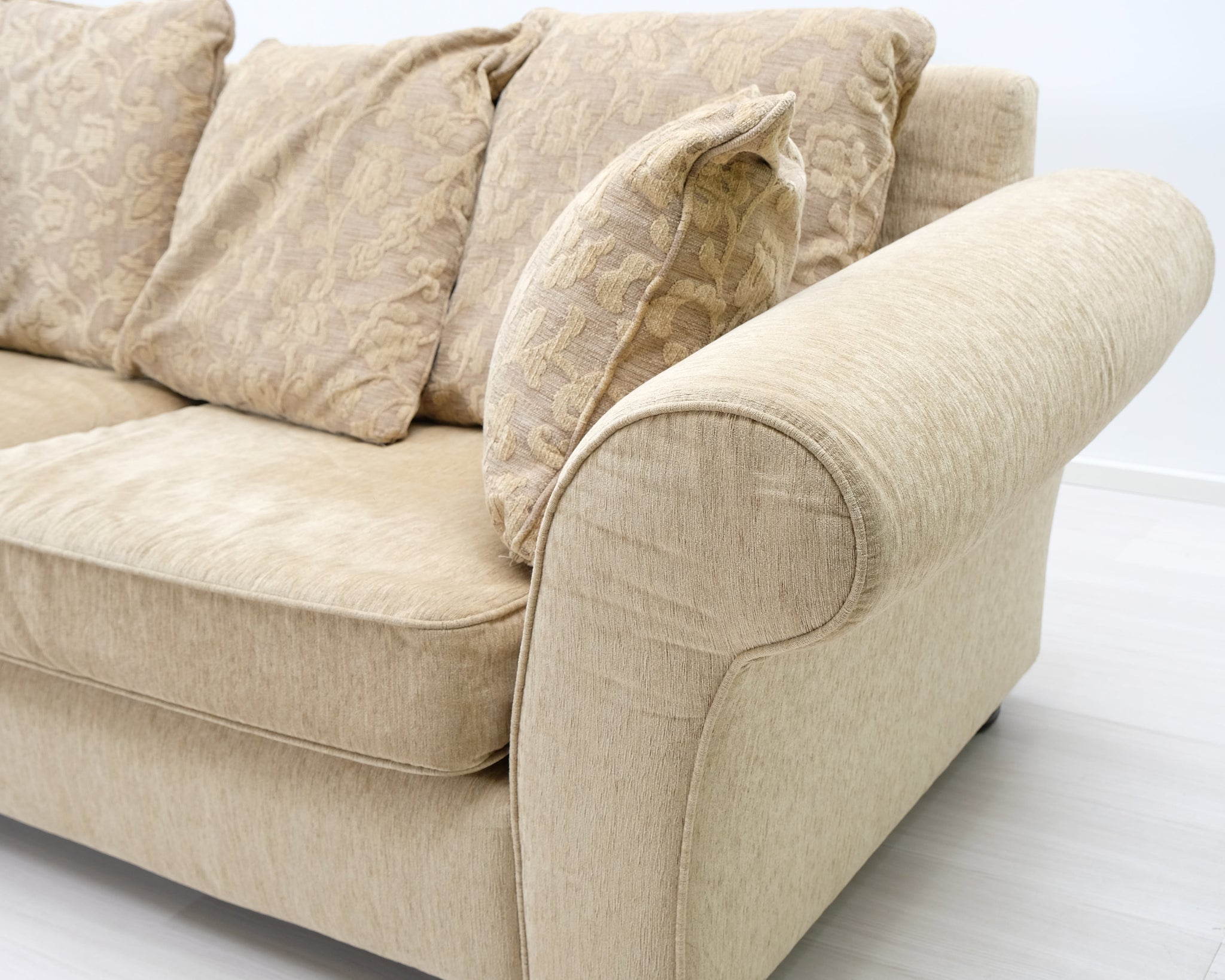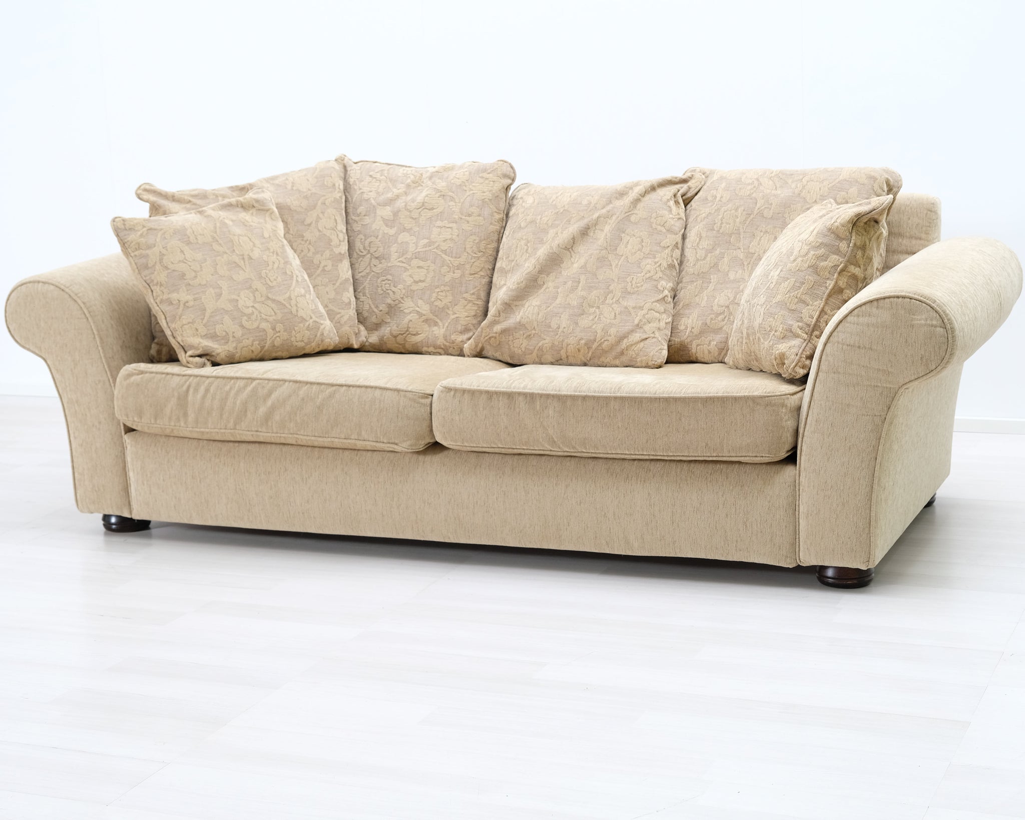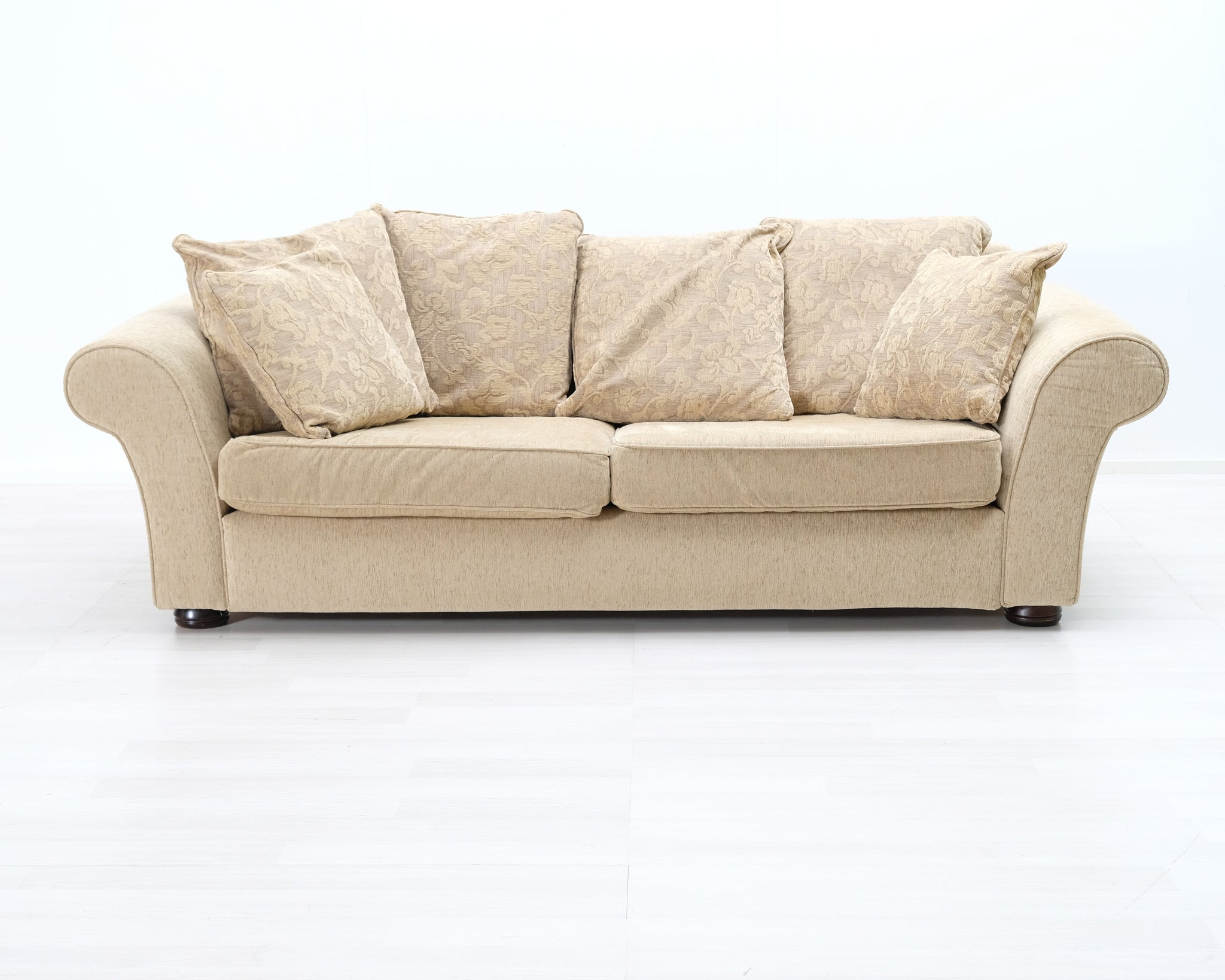 Pehmeä kolmen istuttava kangassohva. Beige, kukkakuvioinen verhoilu. Irrotettavat päälliset helpottavat sohvan huoltoa.