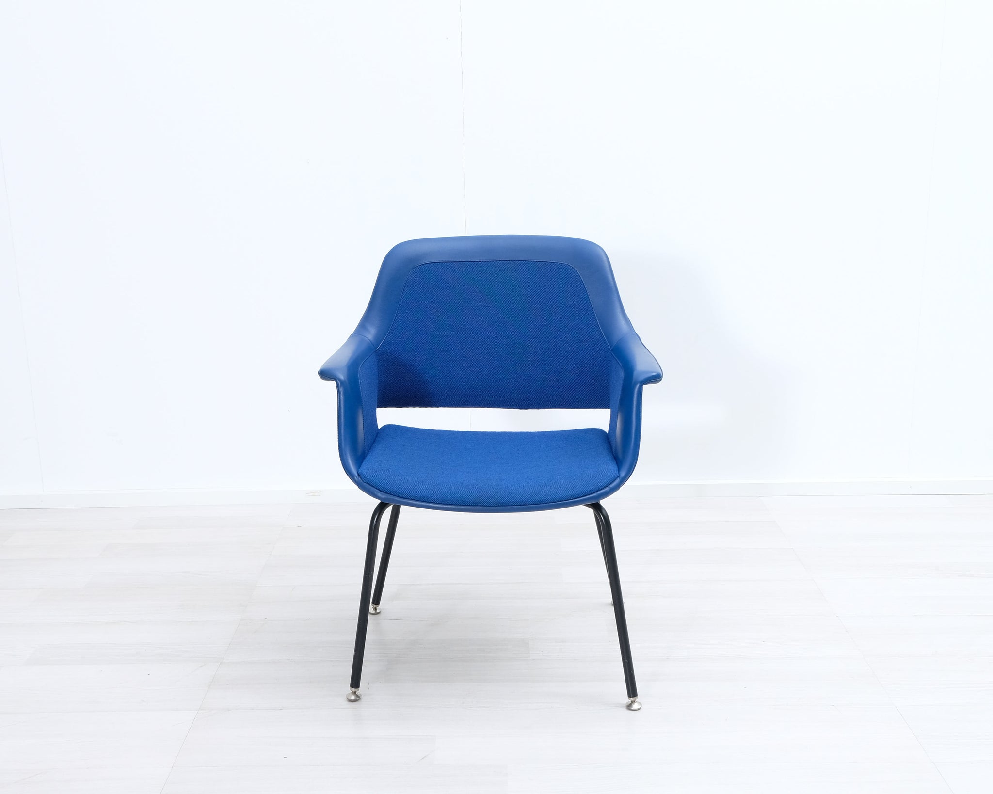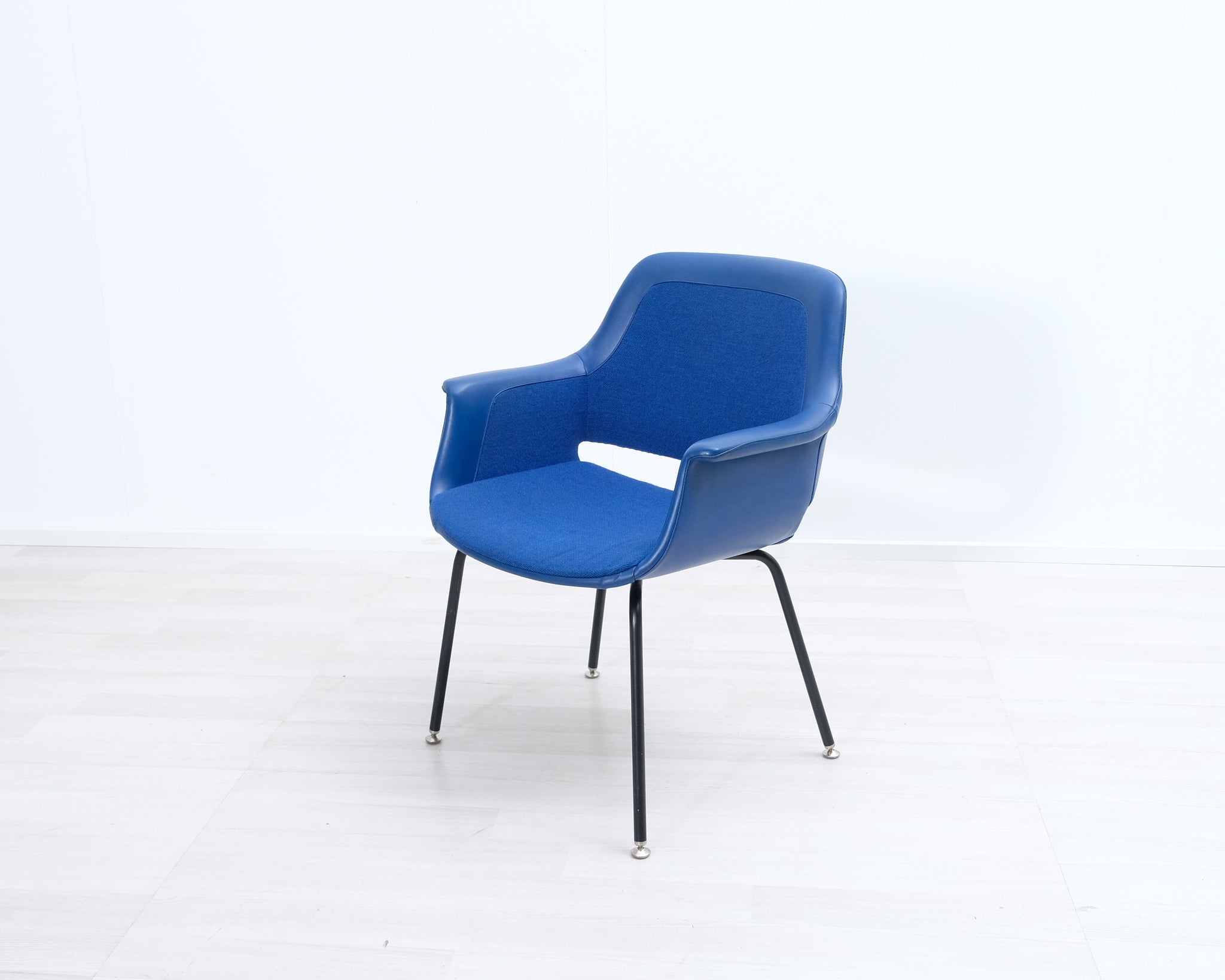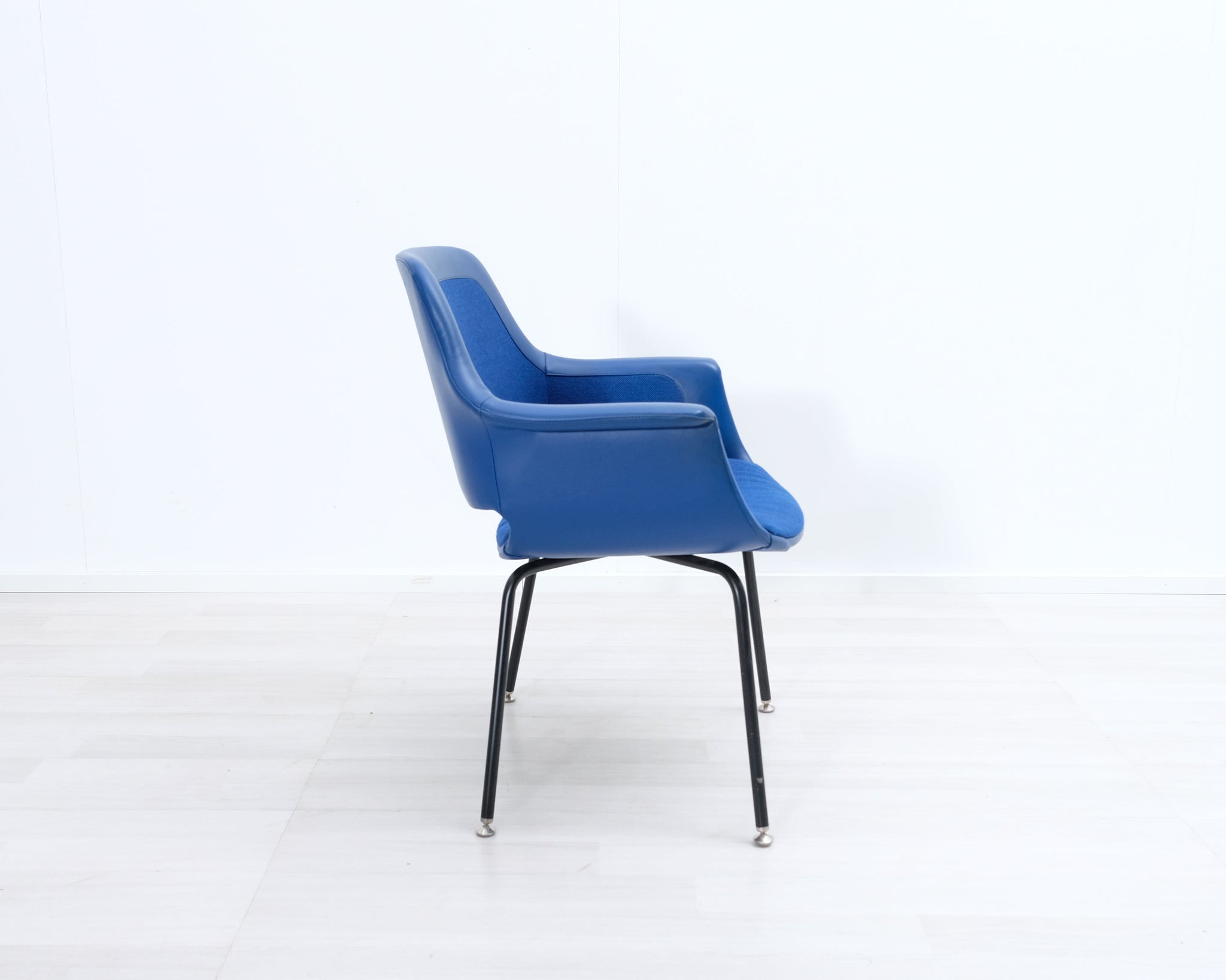 Piristä sisustustasi tällä sinisellä retrotuolilla! Mustat metallijalat ja kangasverhoilu nahkayksityiskohdilla. Valmistajana Asko.