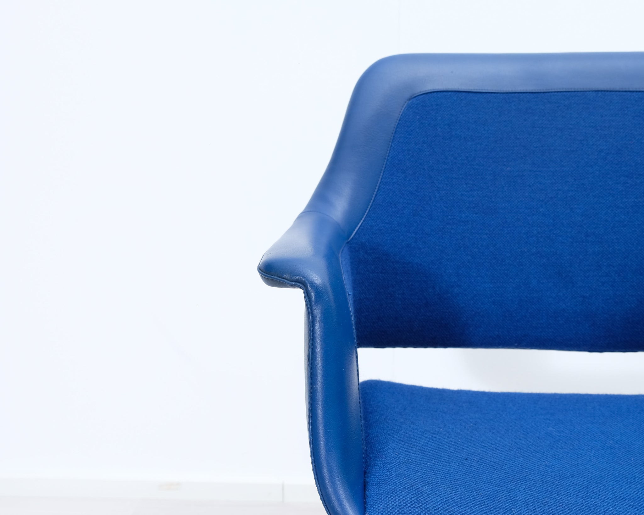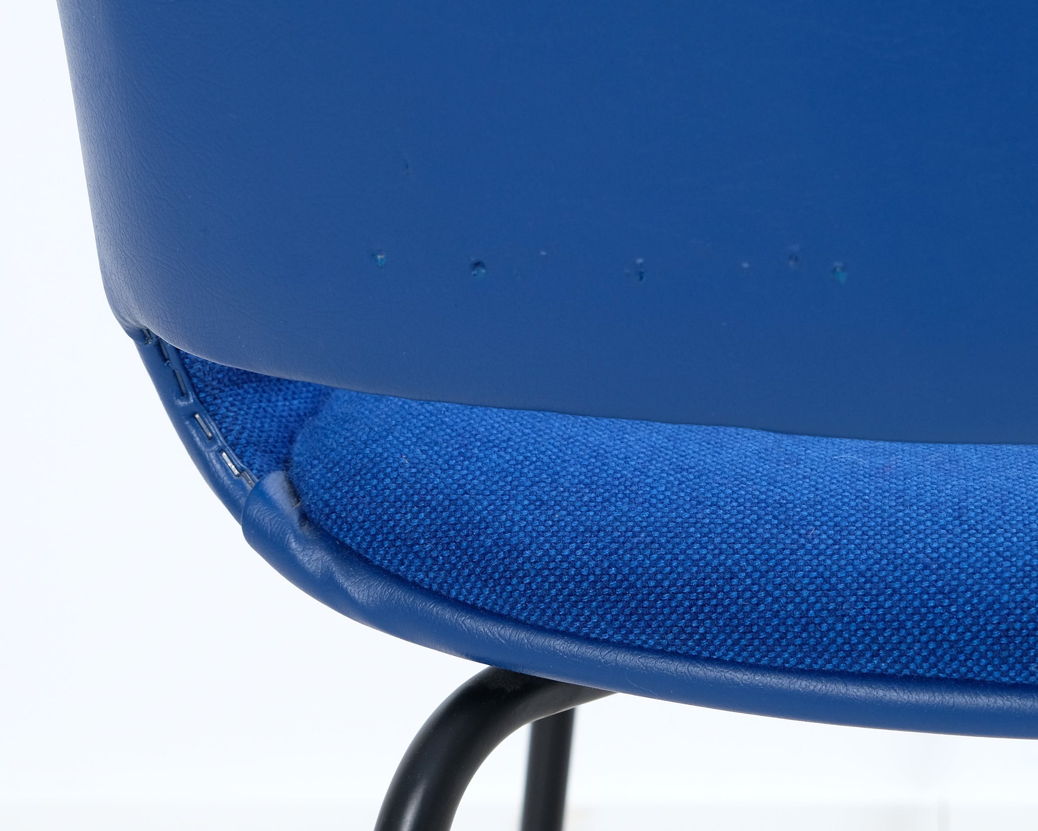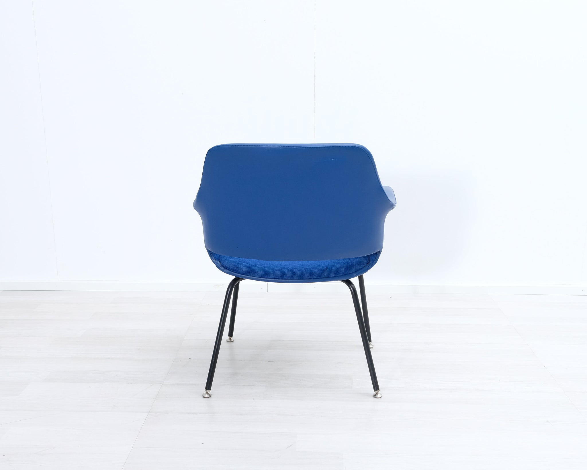 Piristä sisustustasi tällä sinisellä retrotuolilla! Mustat metallijalat ja kangasverhoilu nahkayksityiskohdilla. Valmistajana Asko.