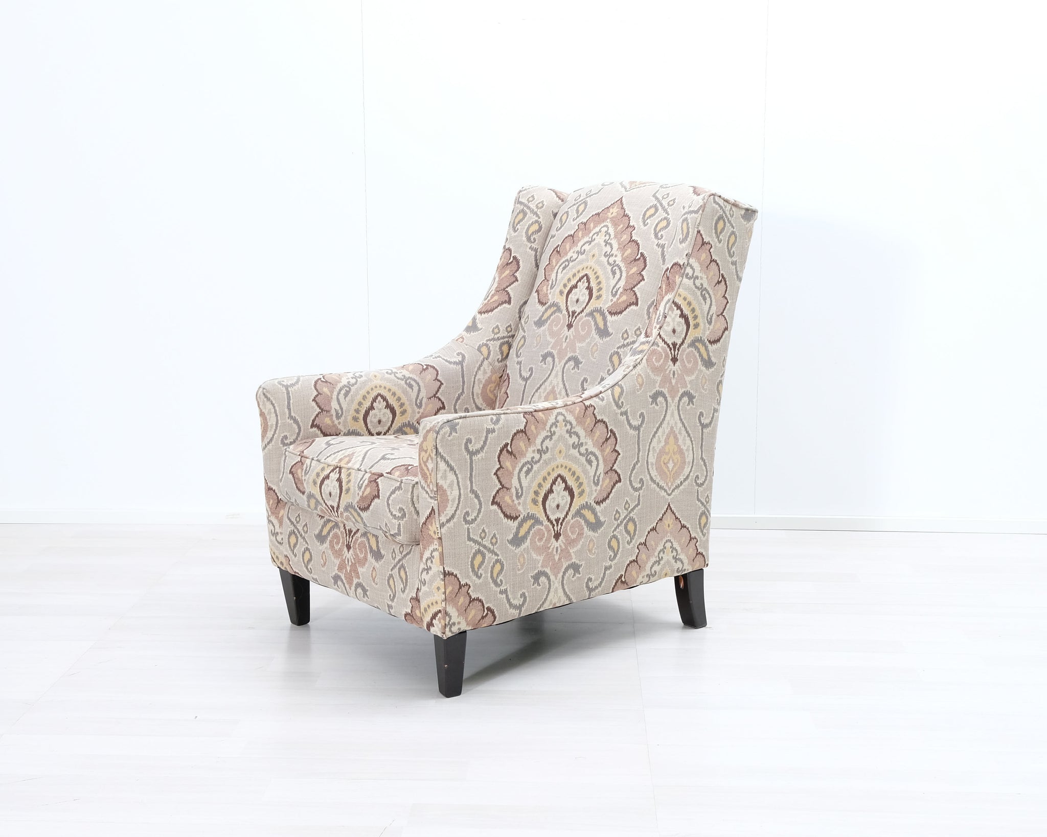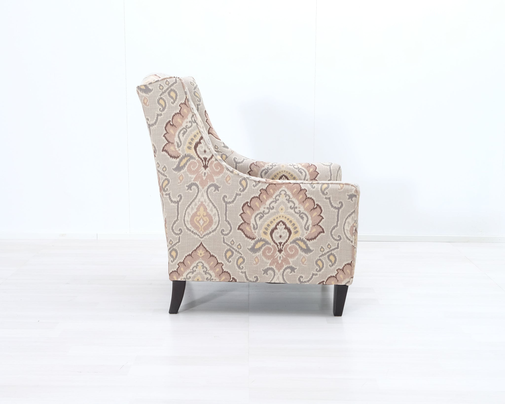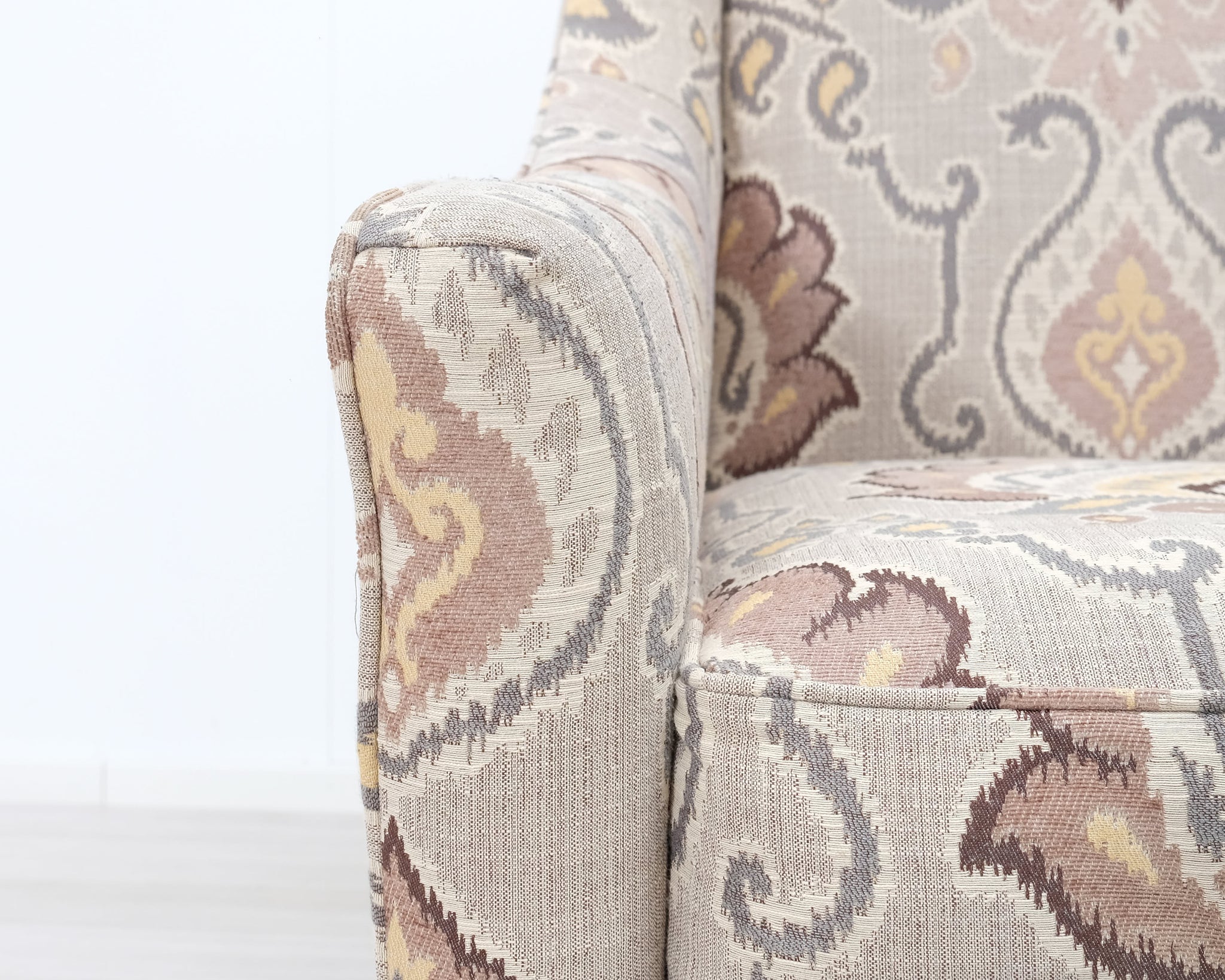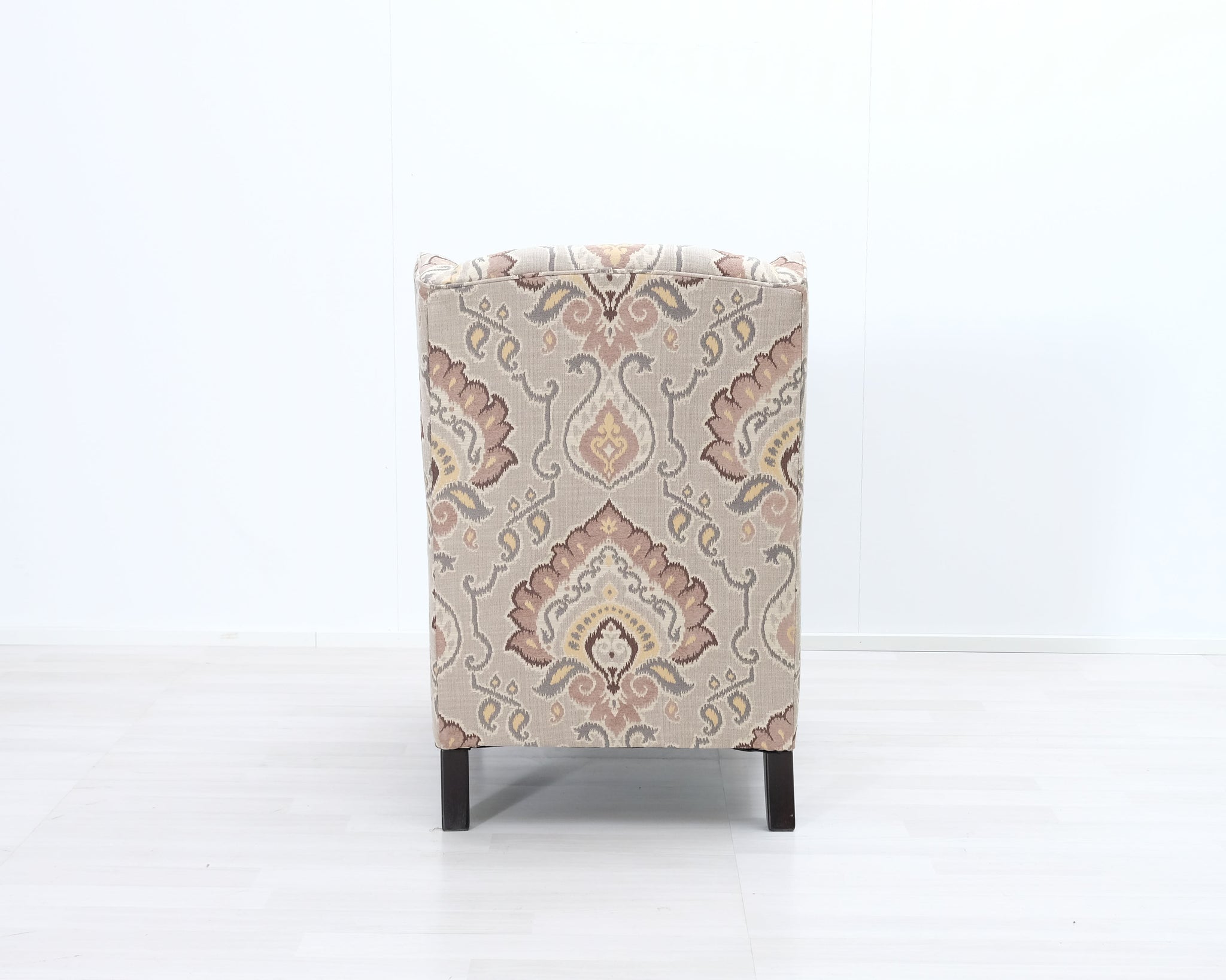 Ashley Wilcox -nojatuoli kauniilla kangasverhoilulla. Puiset jalat.