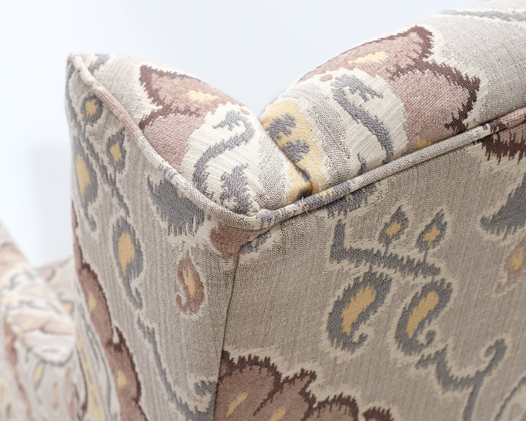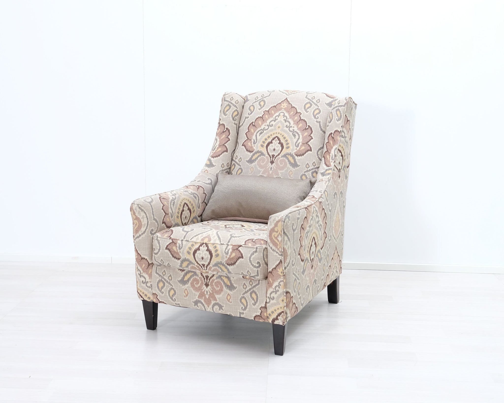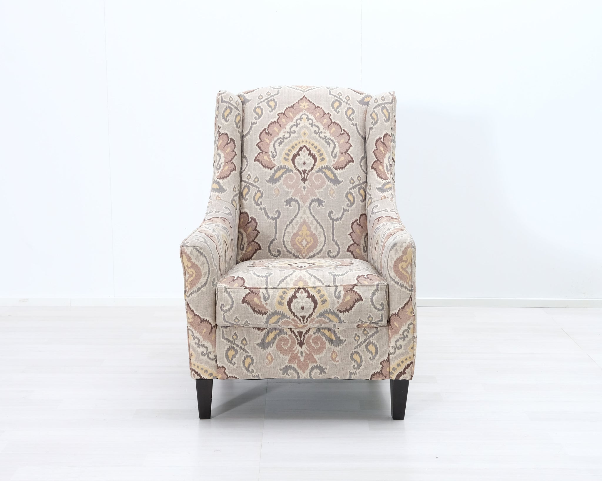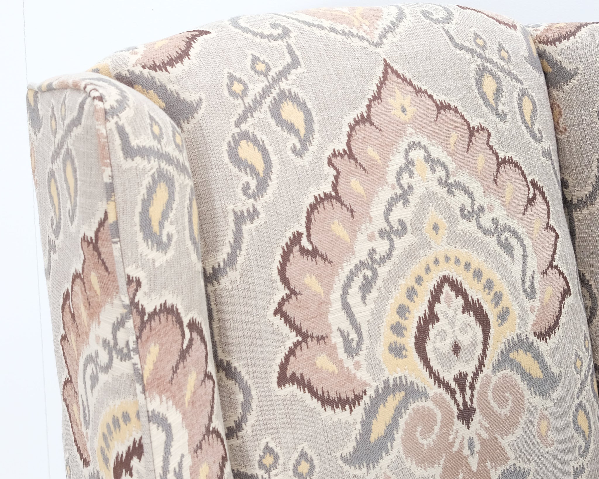 Ashley Wilcox -nojatuoli kauniilla kangasverhoilulla. Puiset jalat.