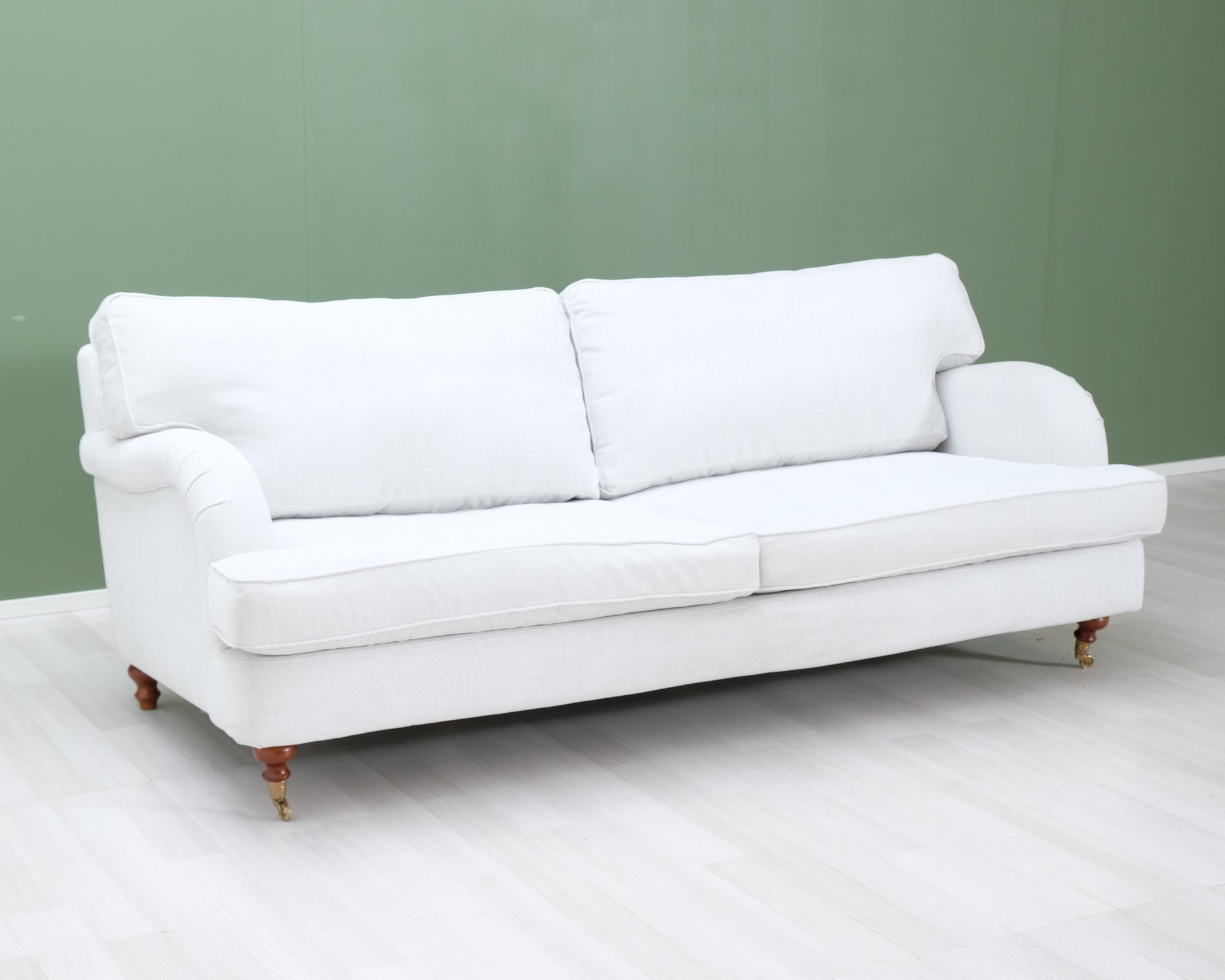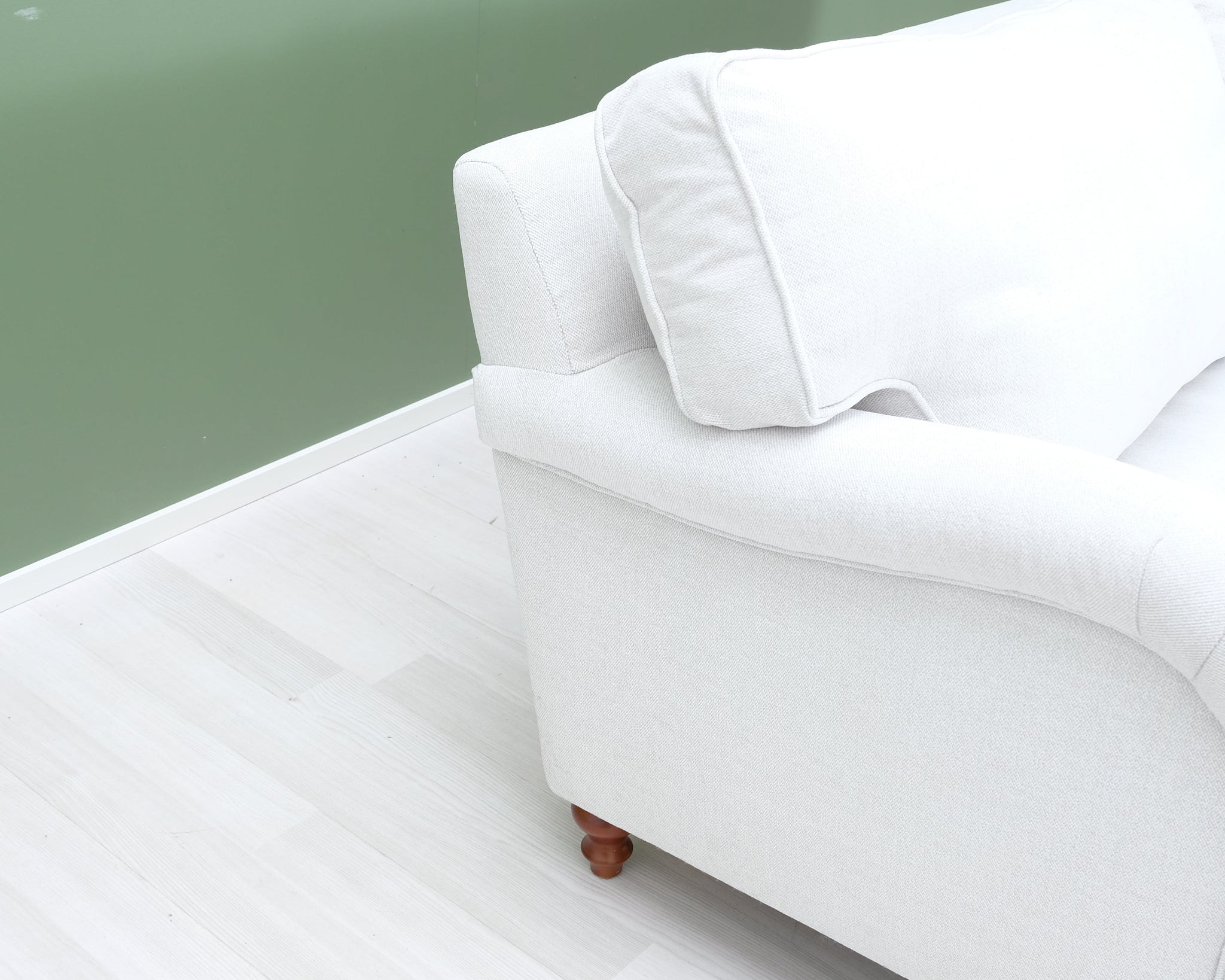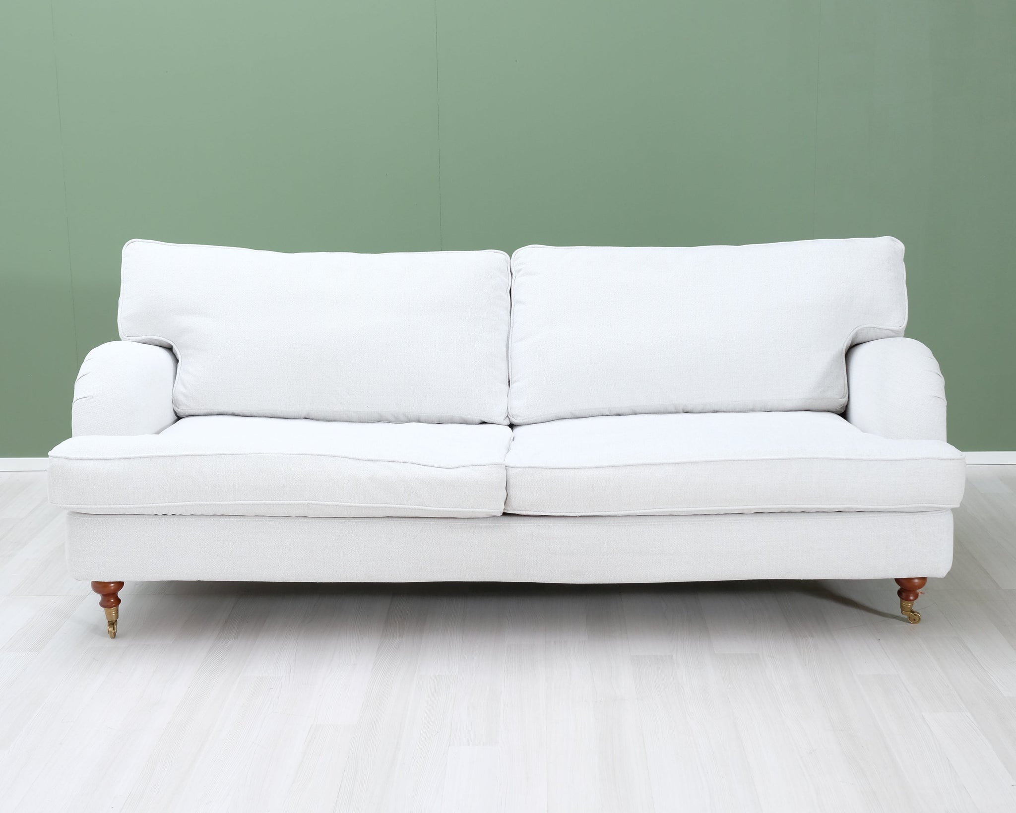 Askon valmistama Noel-sohva. Howard-tyylinen sohva on klassinen valinta, joka sopii kotiin kuin kotiin. Puurunko. Vaalean kitin värinen kangasverhoilu.