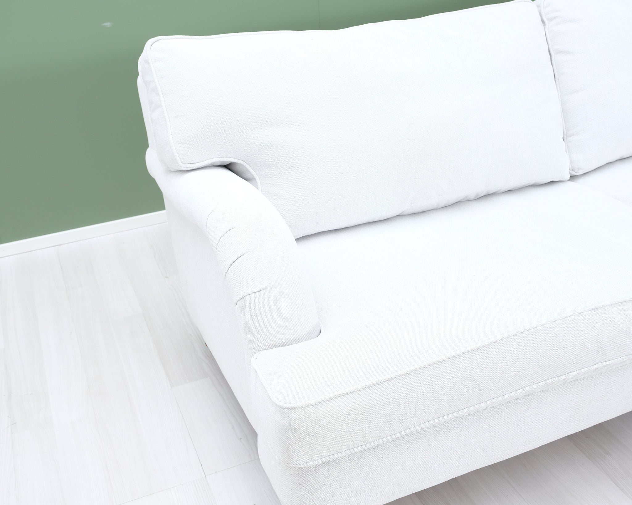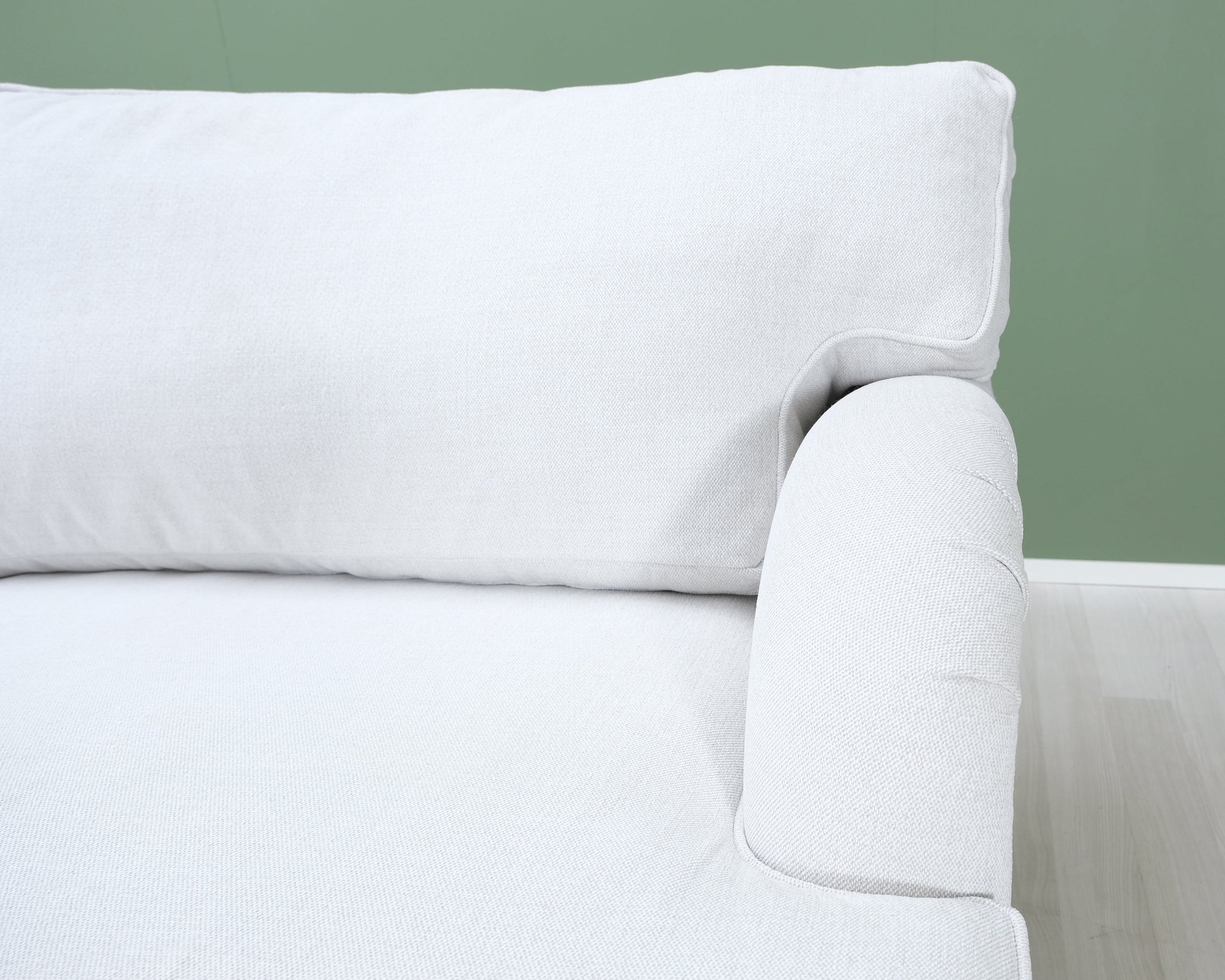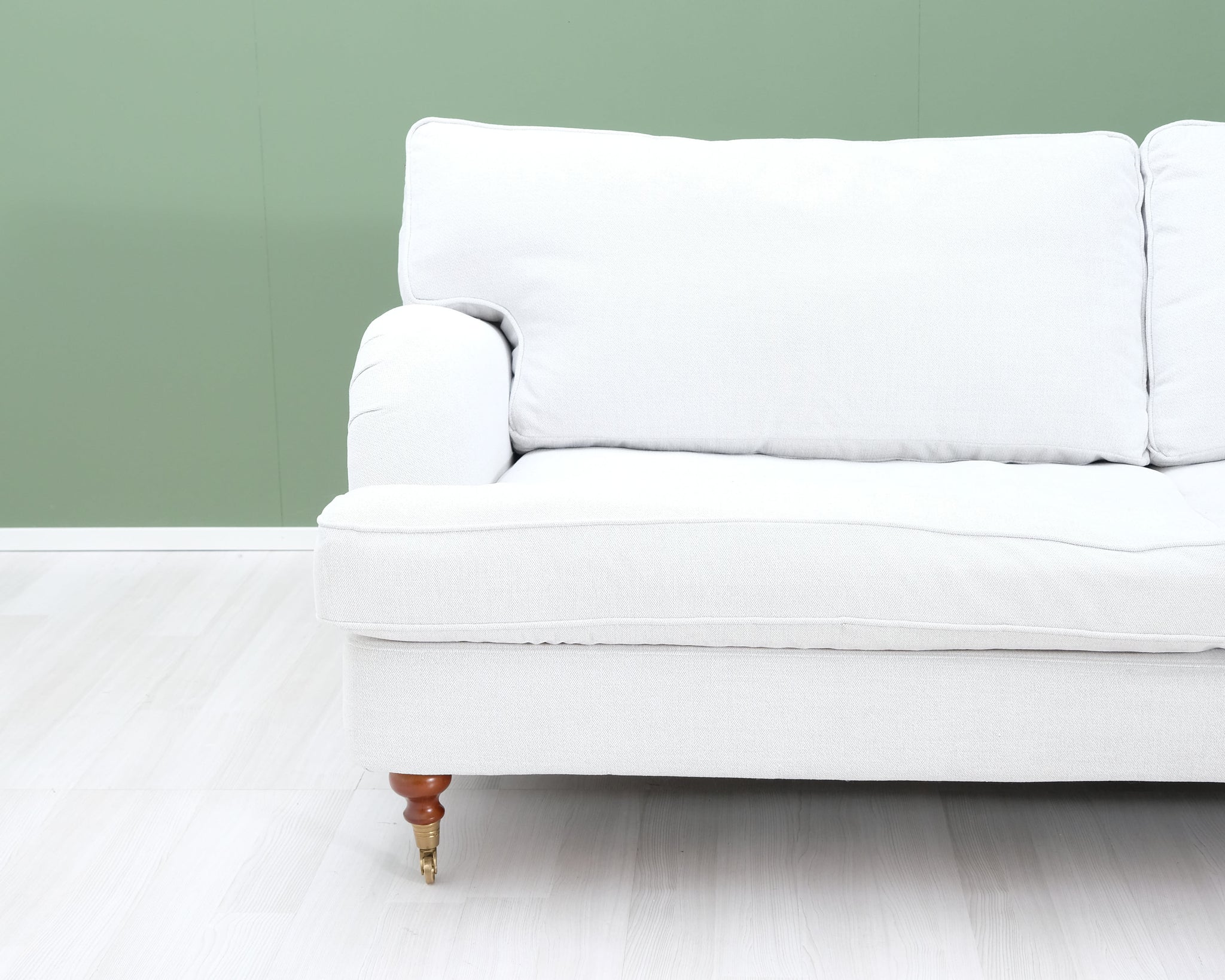 Askon valmistama Noel-sohva. Howard-tyylinen sohva on klassinen valinta, joka sopii kotiin kuin kotiin. Puurunko. Vaalean kitin värinen kangasverhoilu.