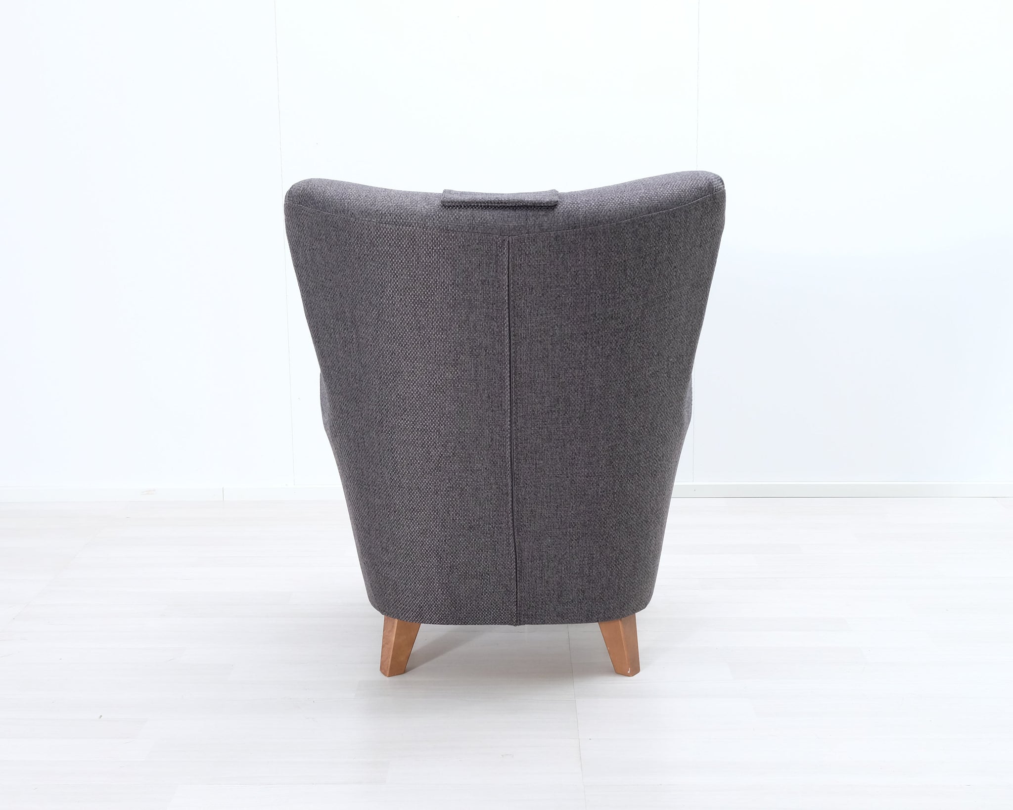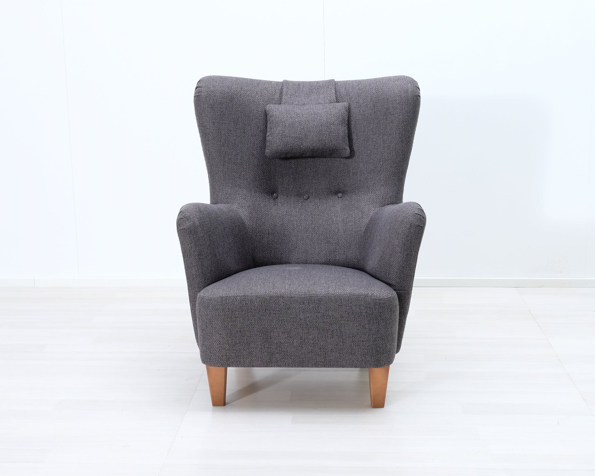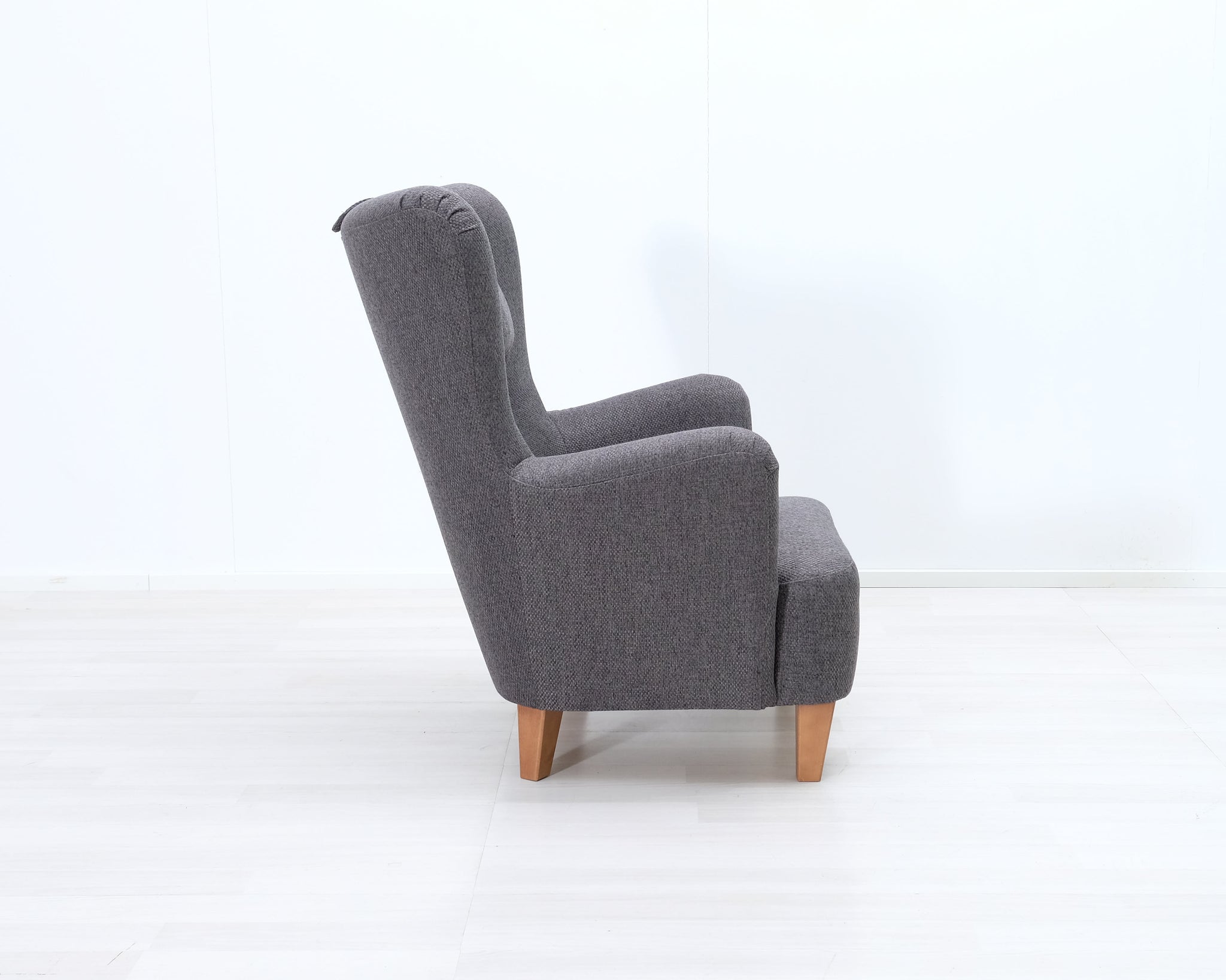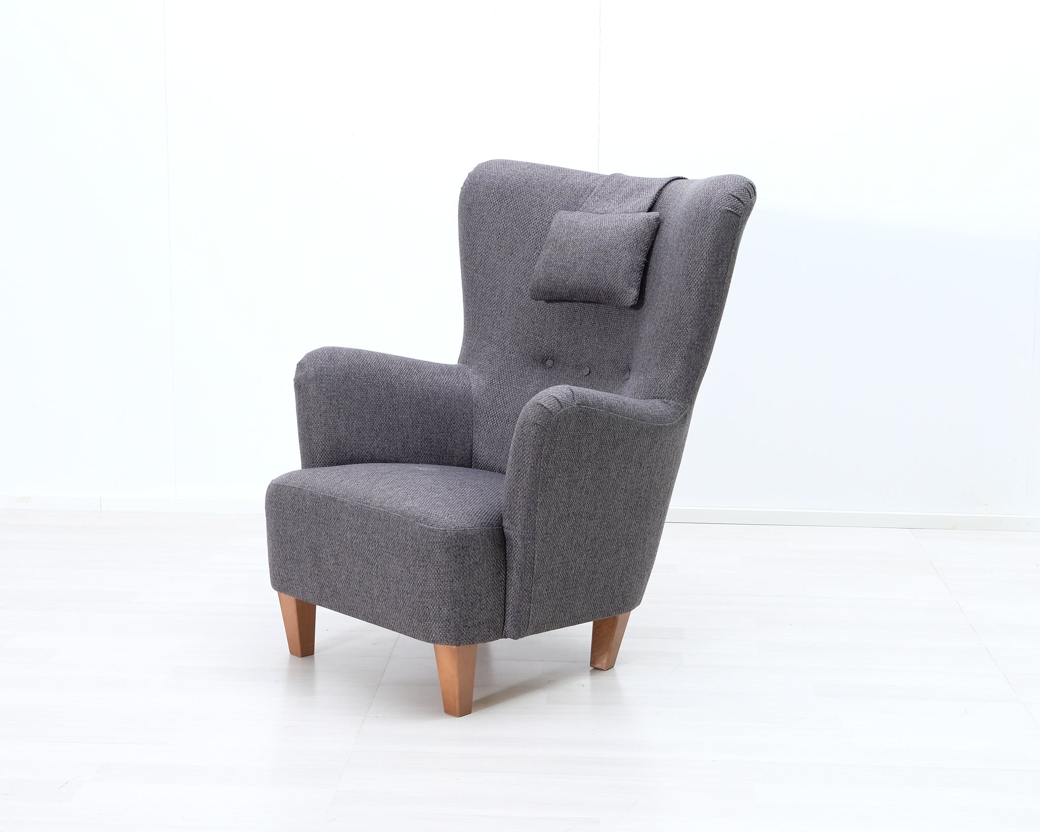 Askon Richard-nojatuoli harmaalla kangasverhoilulla. Klassikkonojatuolin malli on peräisin 40-luvulta.