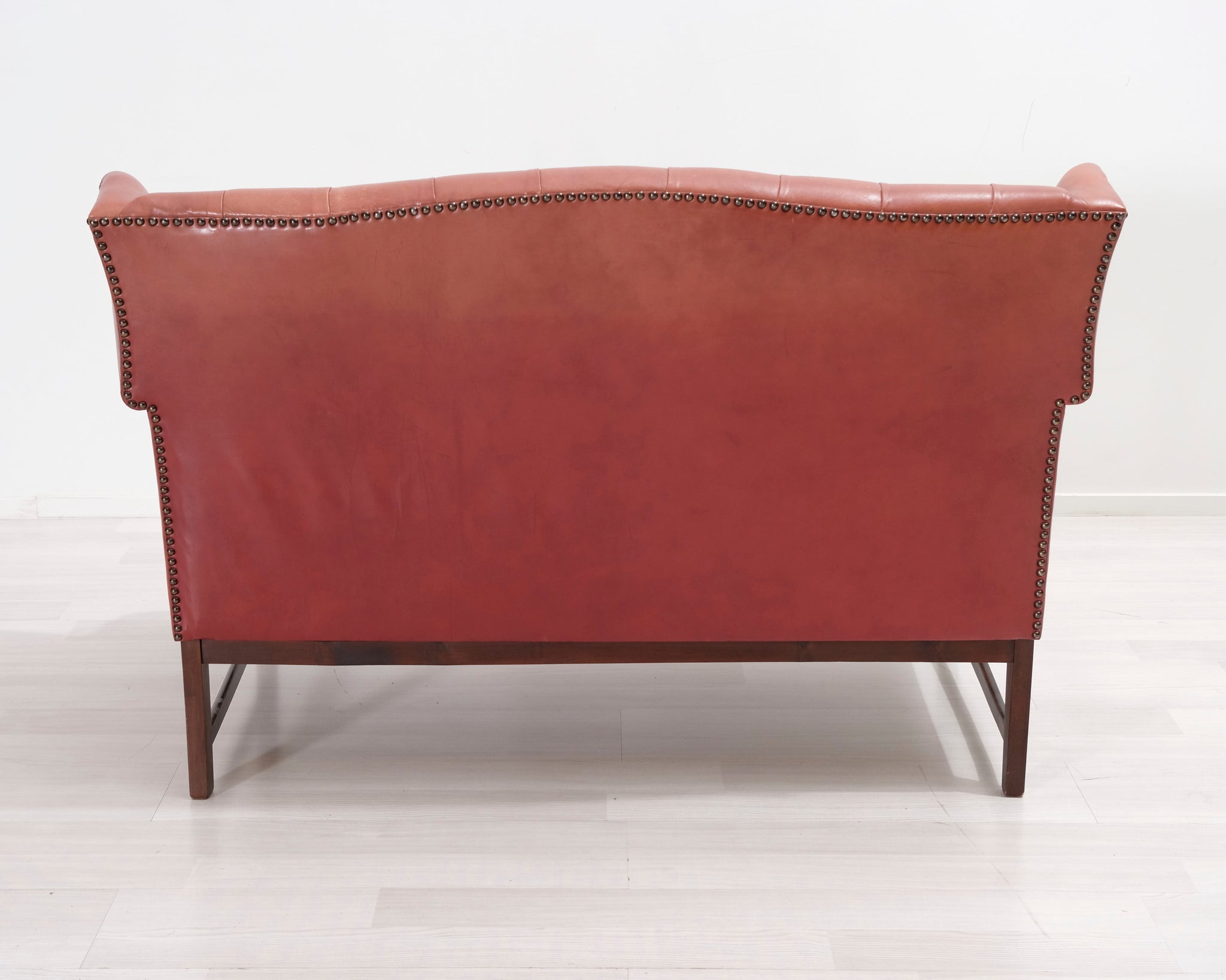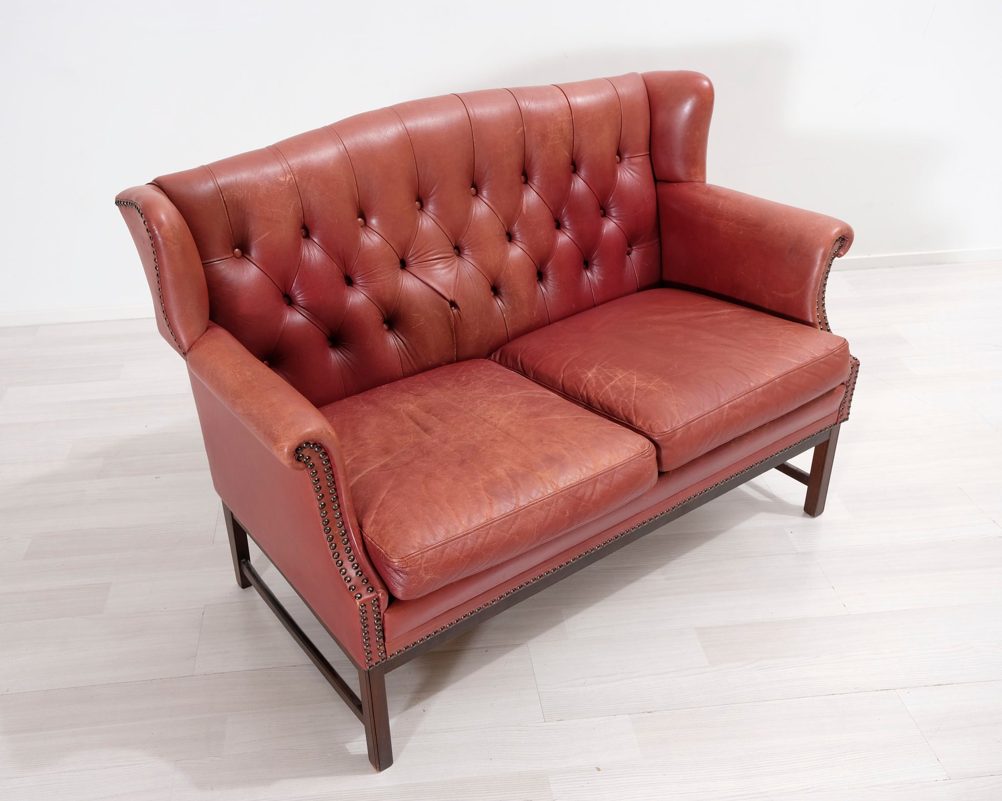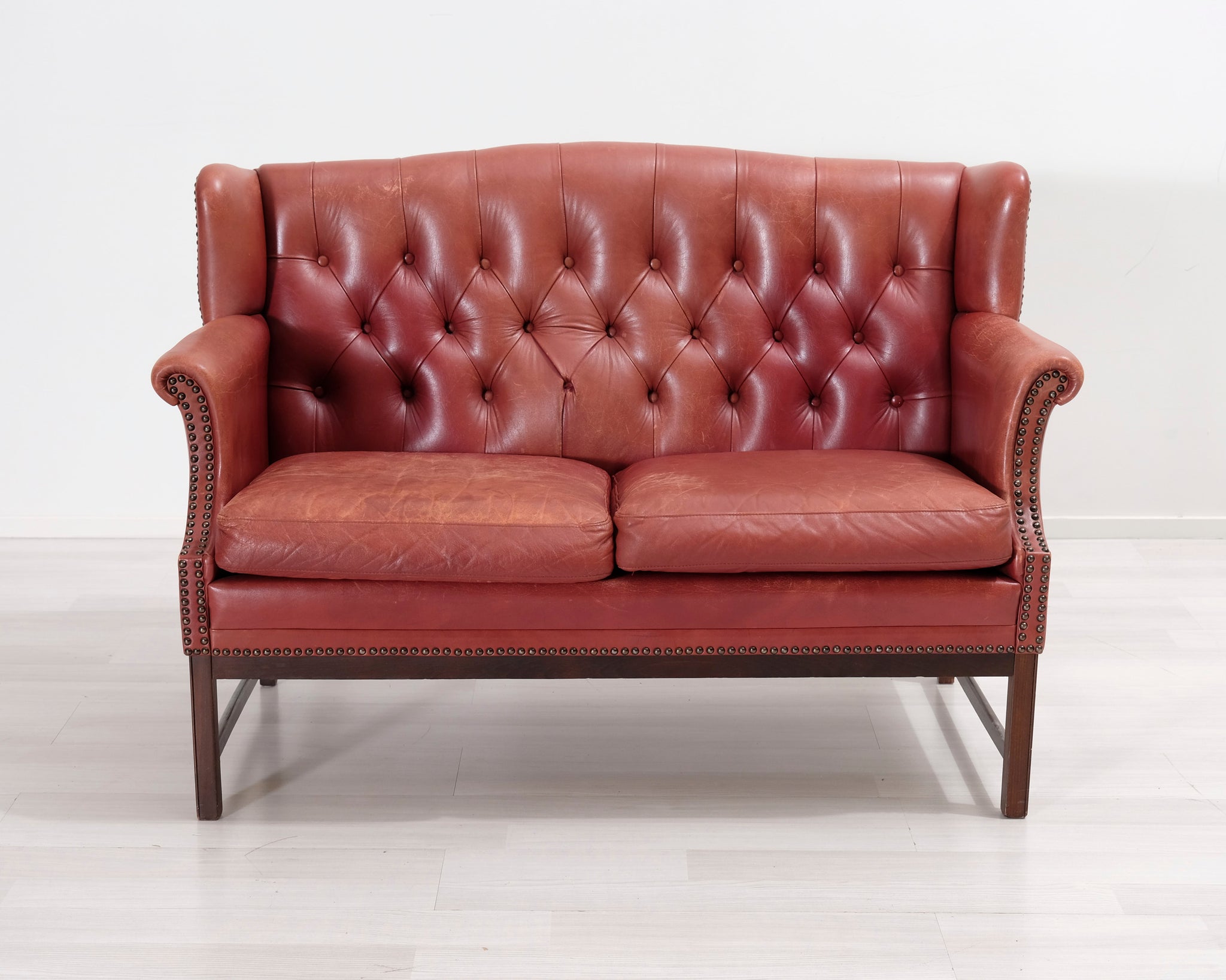 Kahden istuttava nahkasohva punaruskealla verhoilulla. Westchester-tyylinen.