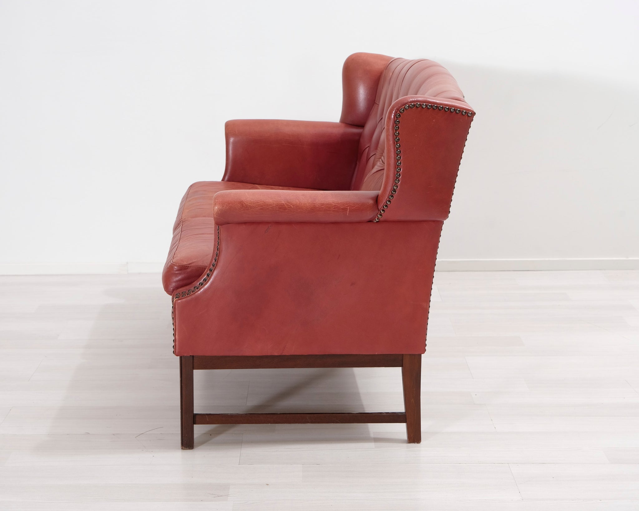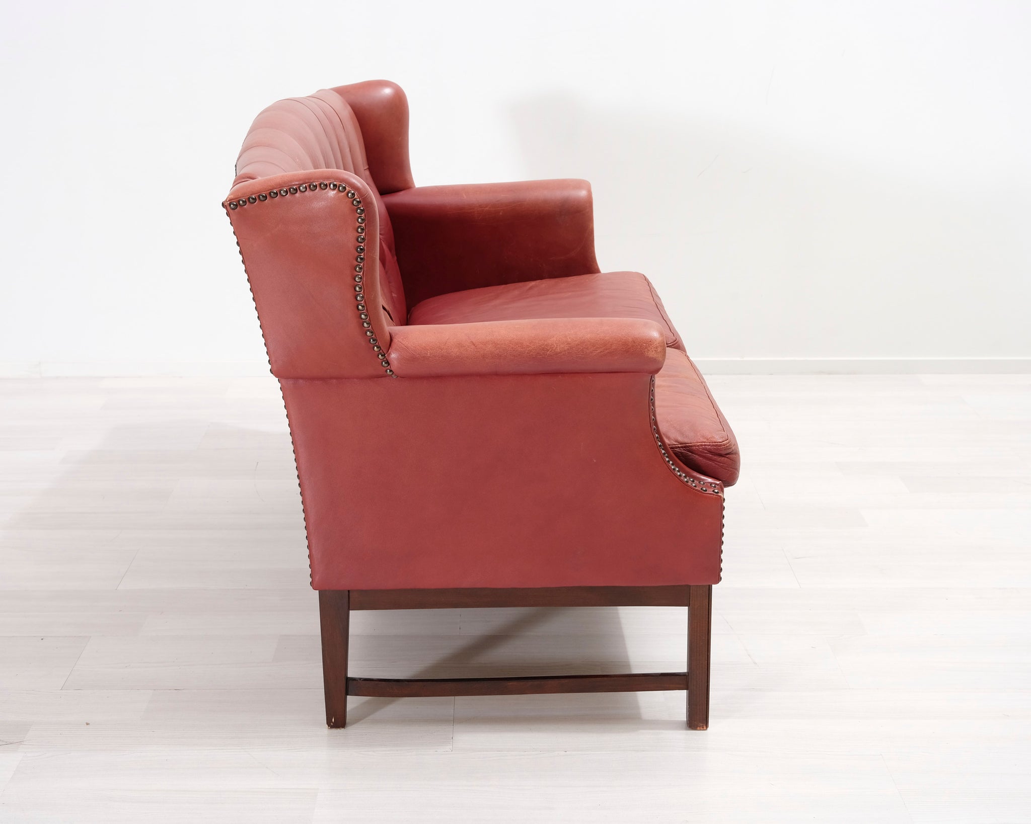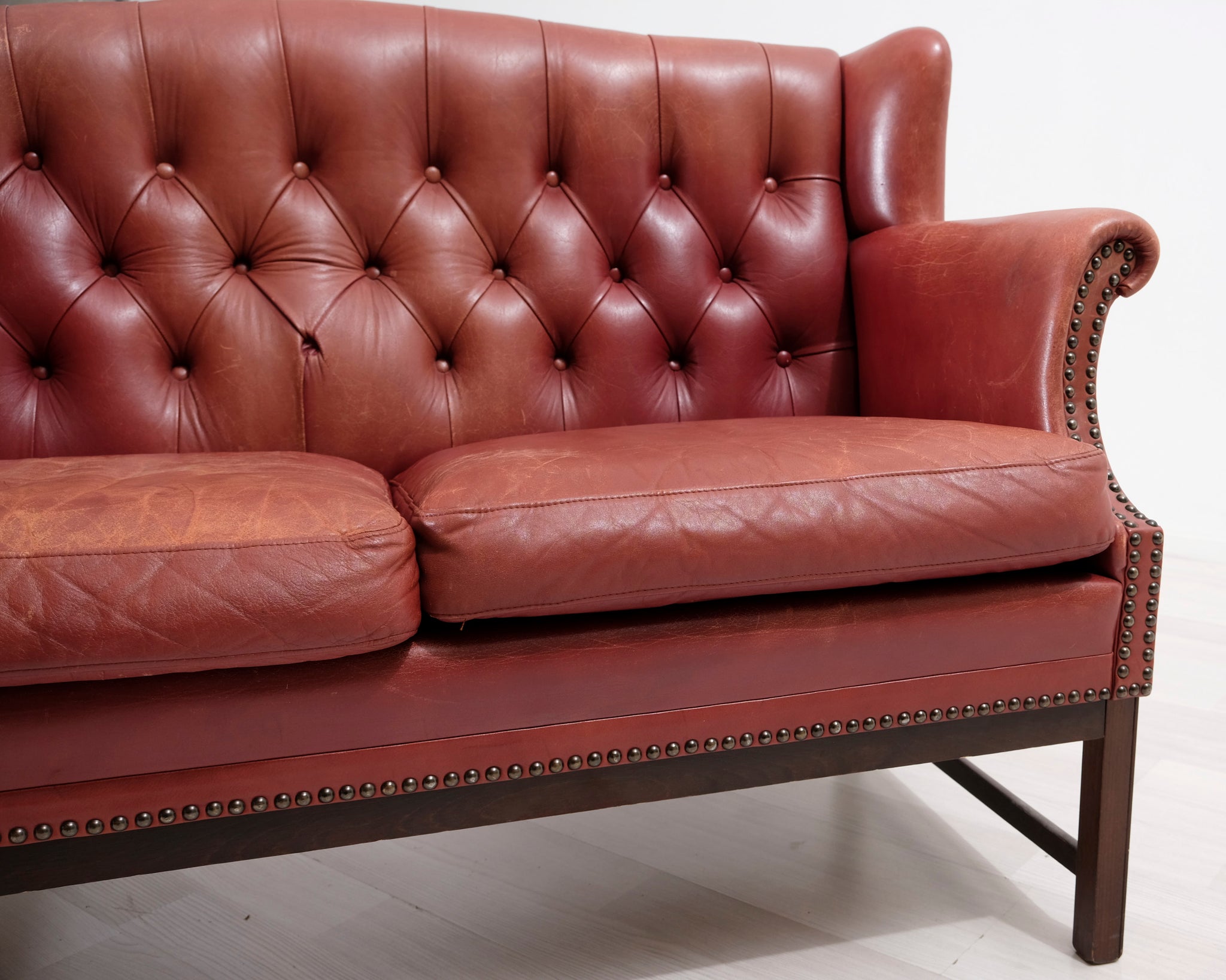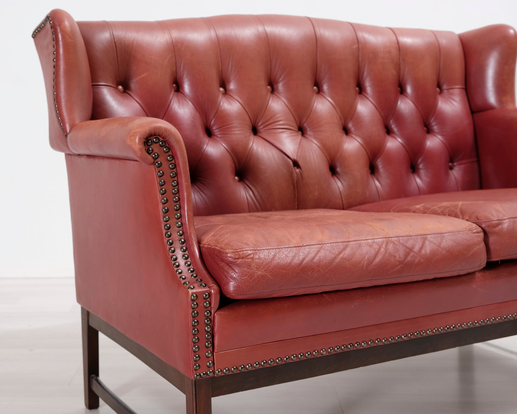 Kahden istuttava nahkasohva punaruskealla verhoilulla. Westchester-tyylinen.