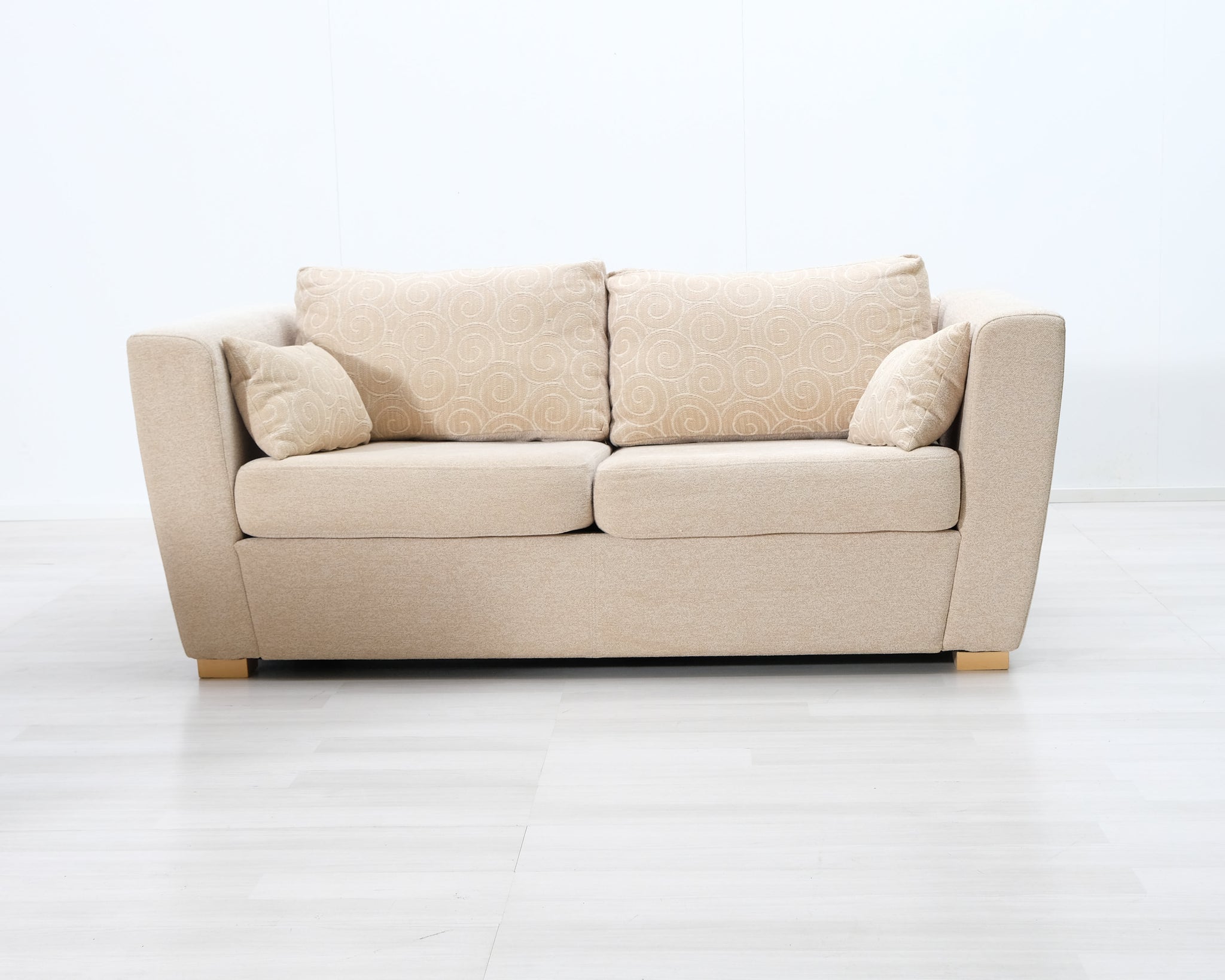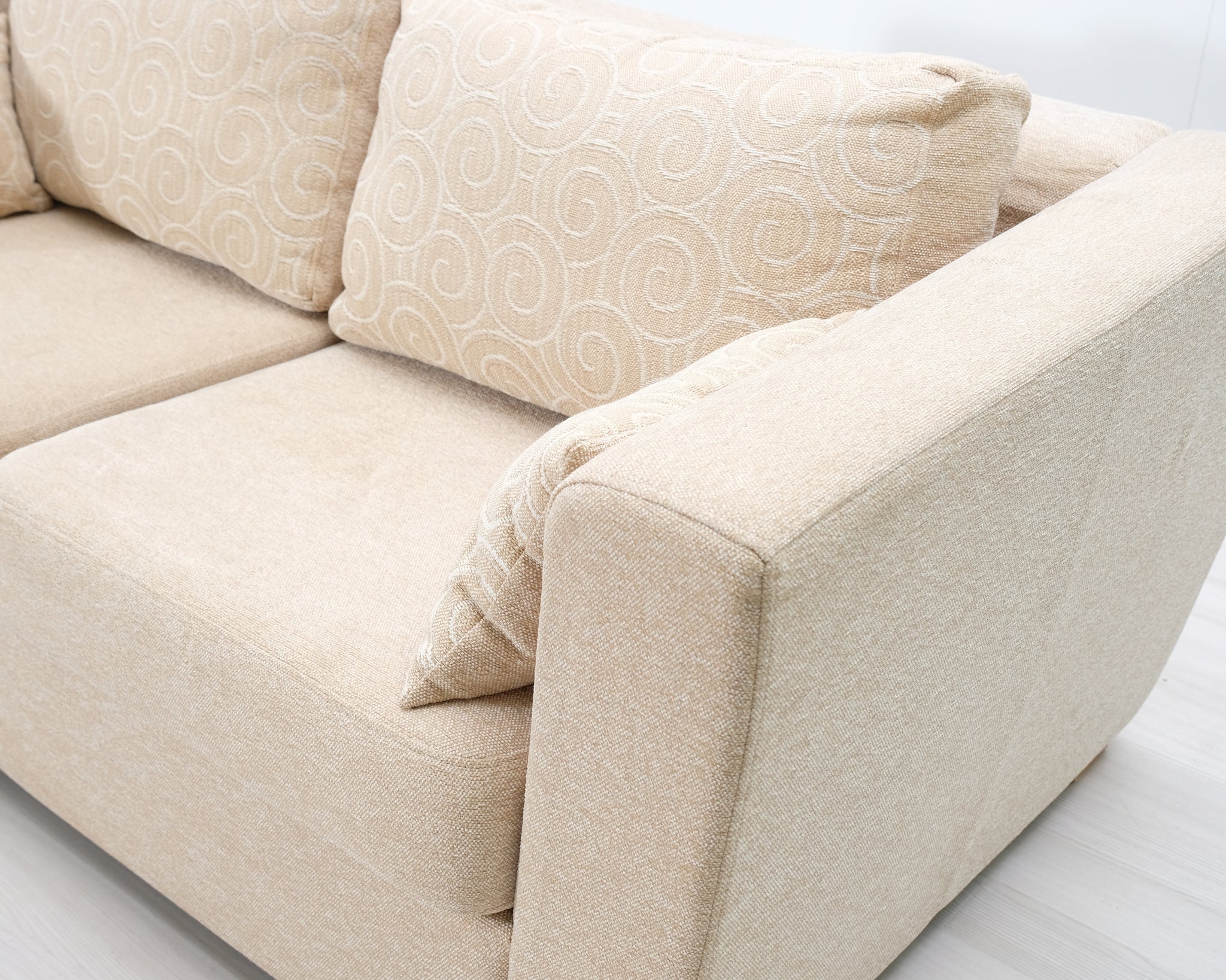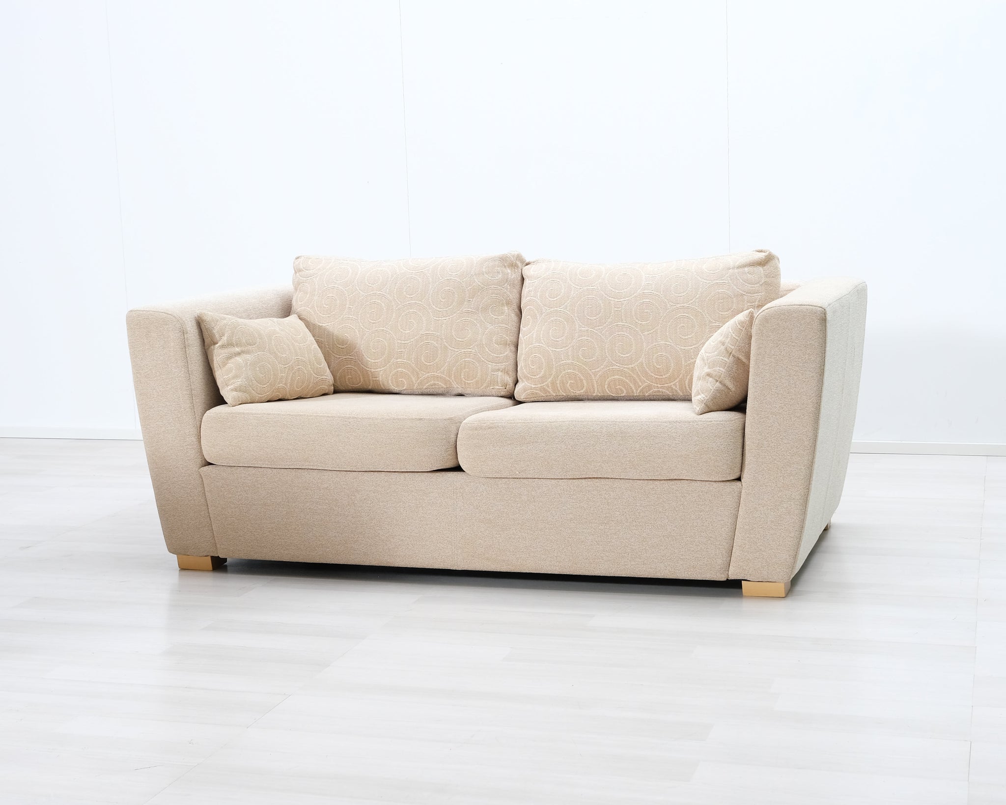 Kotimaisen Askon valmistama kahden istuttava sohva. Runko ja istuintyynyt verhoiltu beigellä kankaalla ja selkätyynyssä ja irtotyynyssä kevyttä kuviointia.