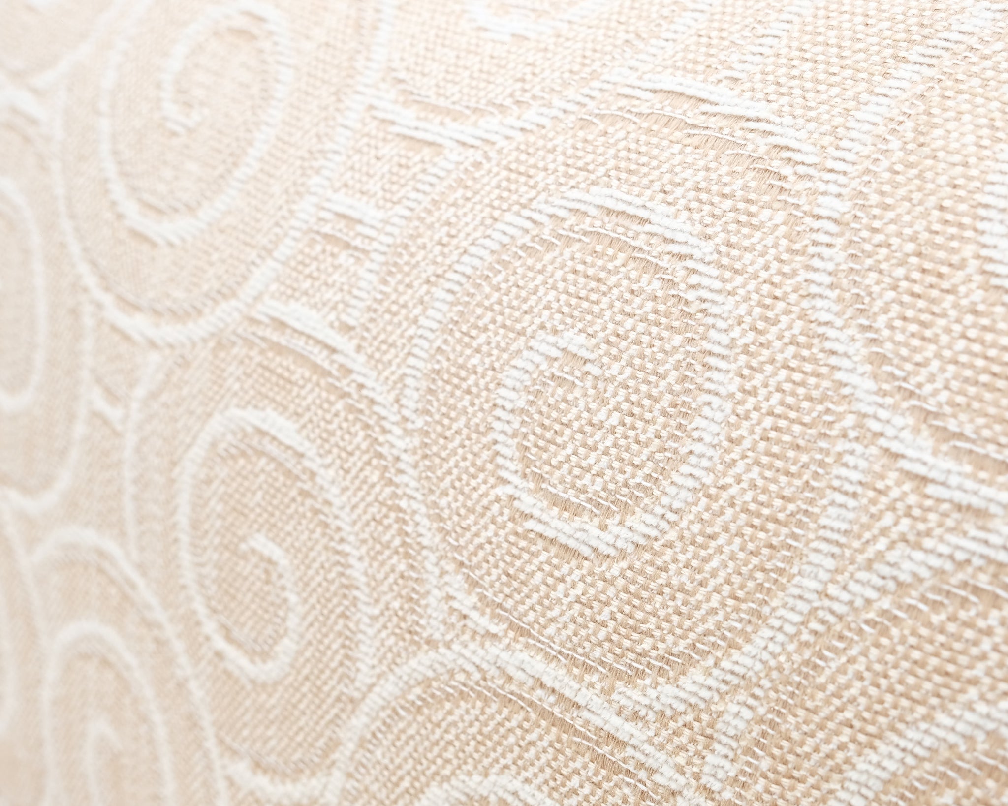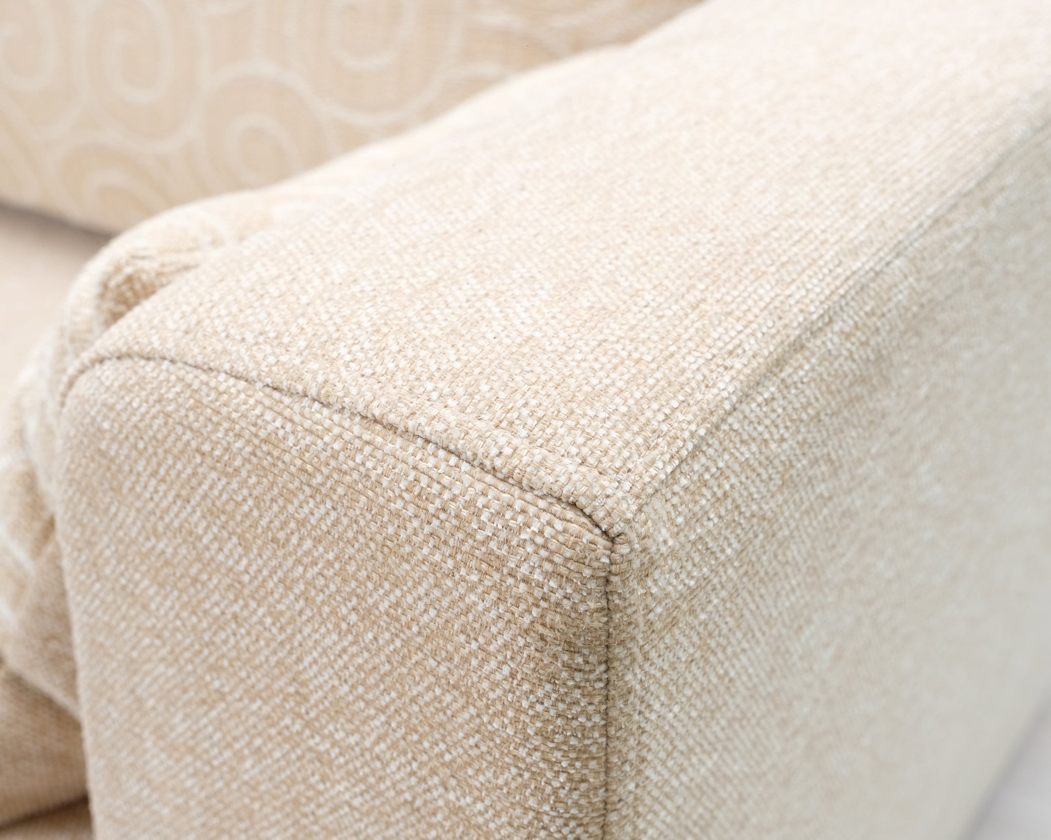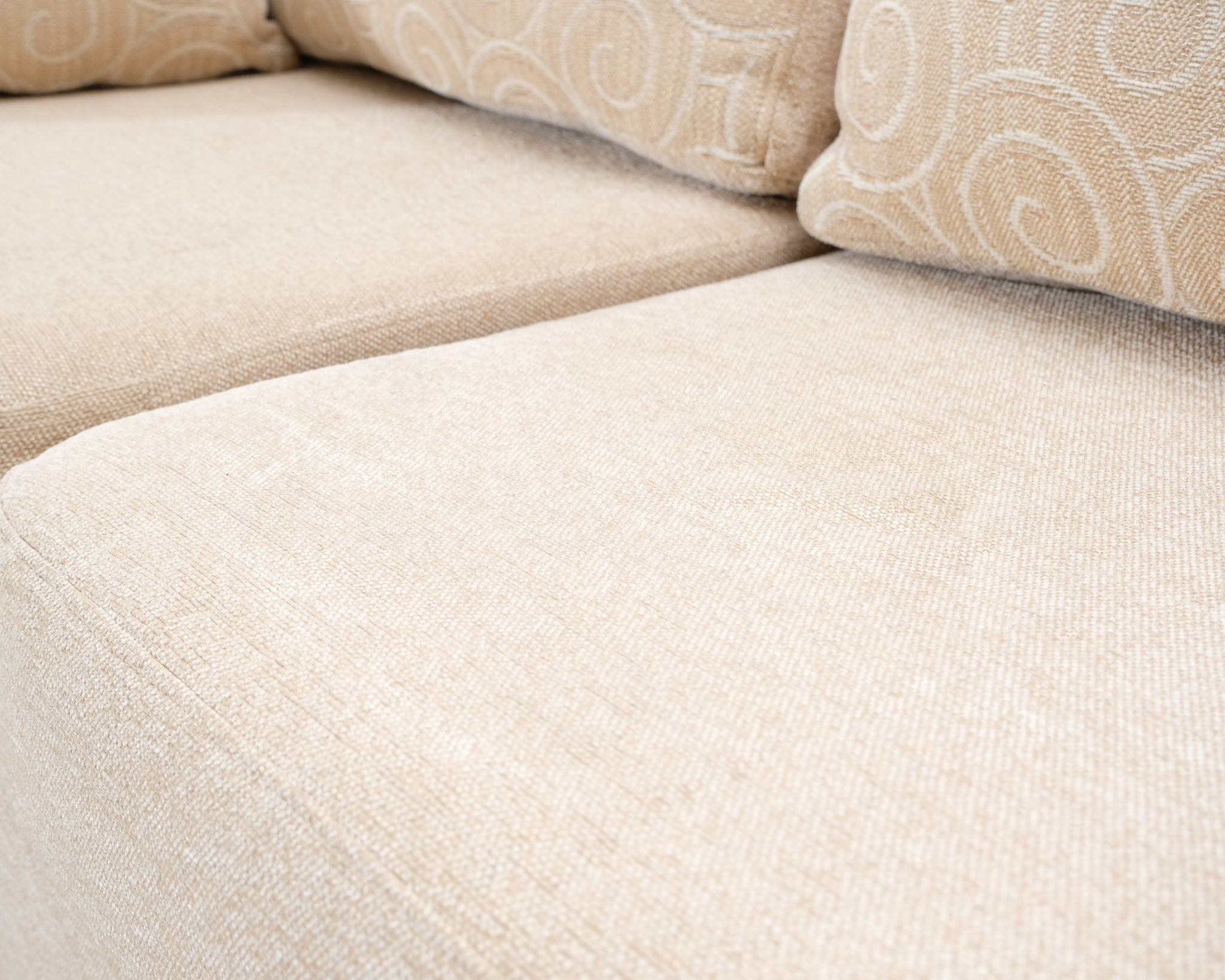 Kotimaisen Askon valmistama kahden istuttava sohva. Runko ja istuintyynyt verhoiltu beigellä kankaalla ja selkätyynyssä ja irtotyynyssä kevyttä kuviointia.