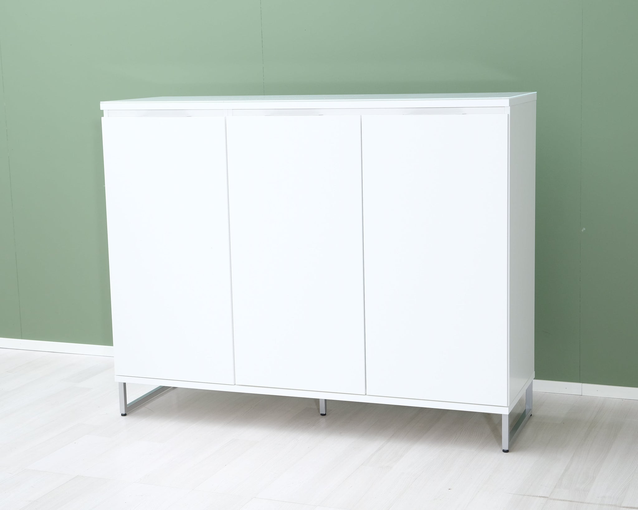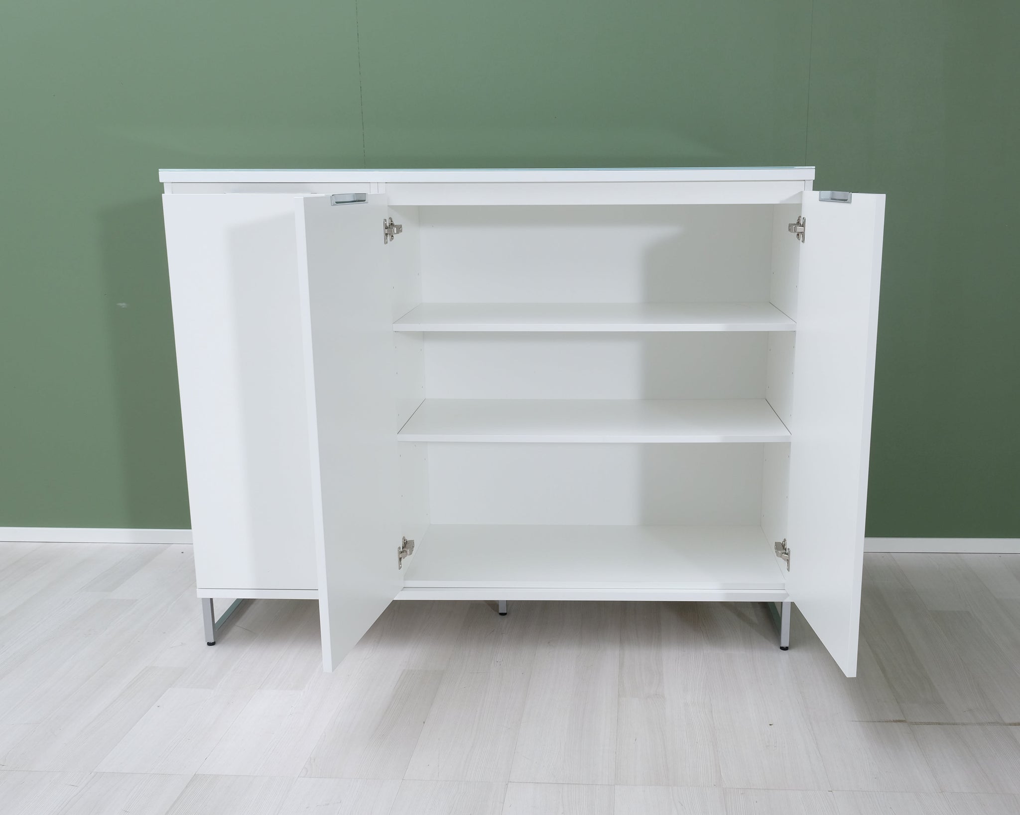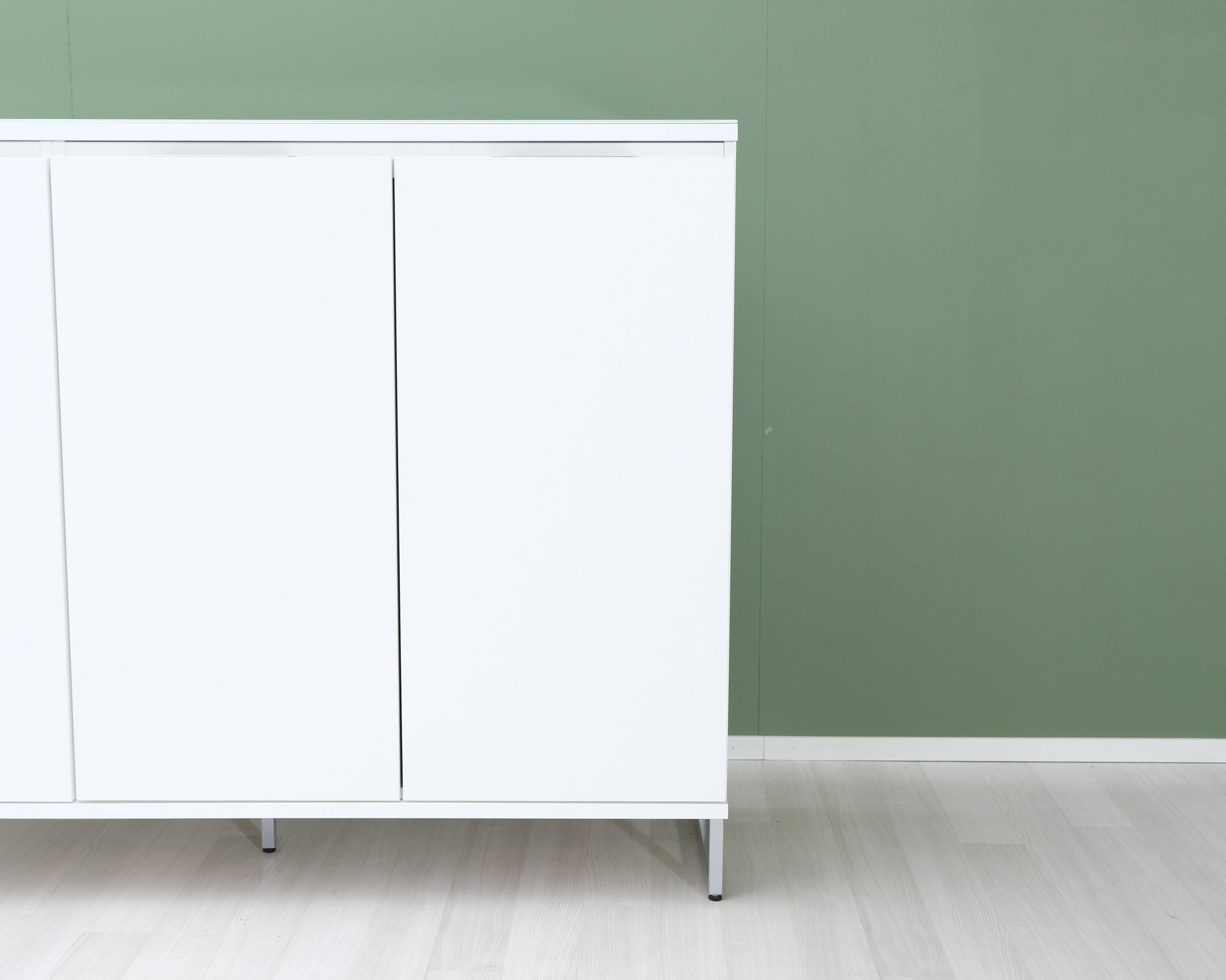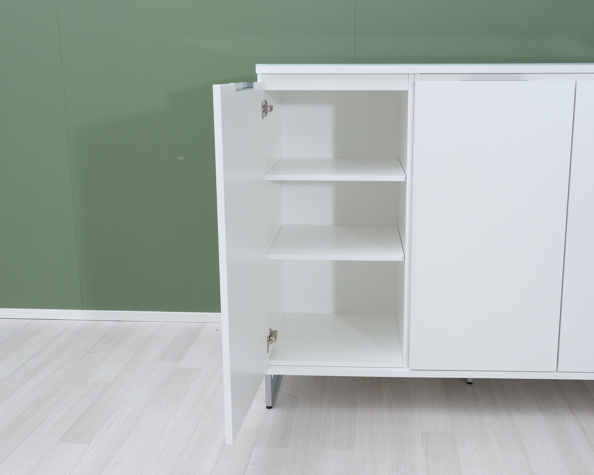 Askon Otso-sarjan valkoinen kaappi kolmella ovella. Kaapin päällä lasilevy.