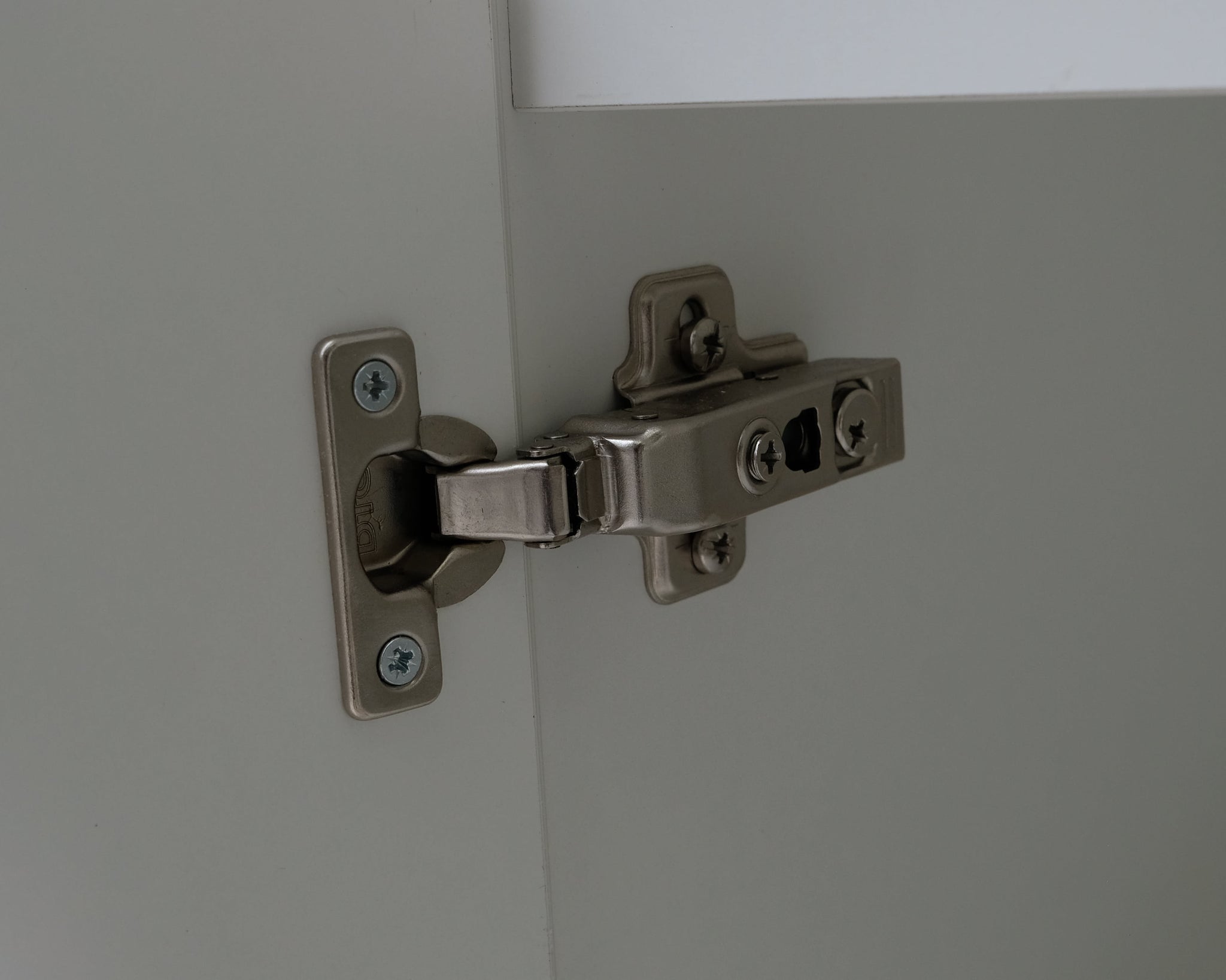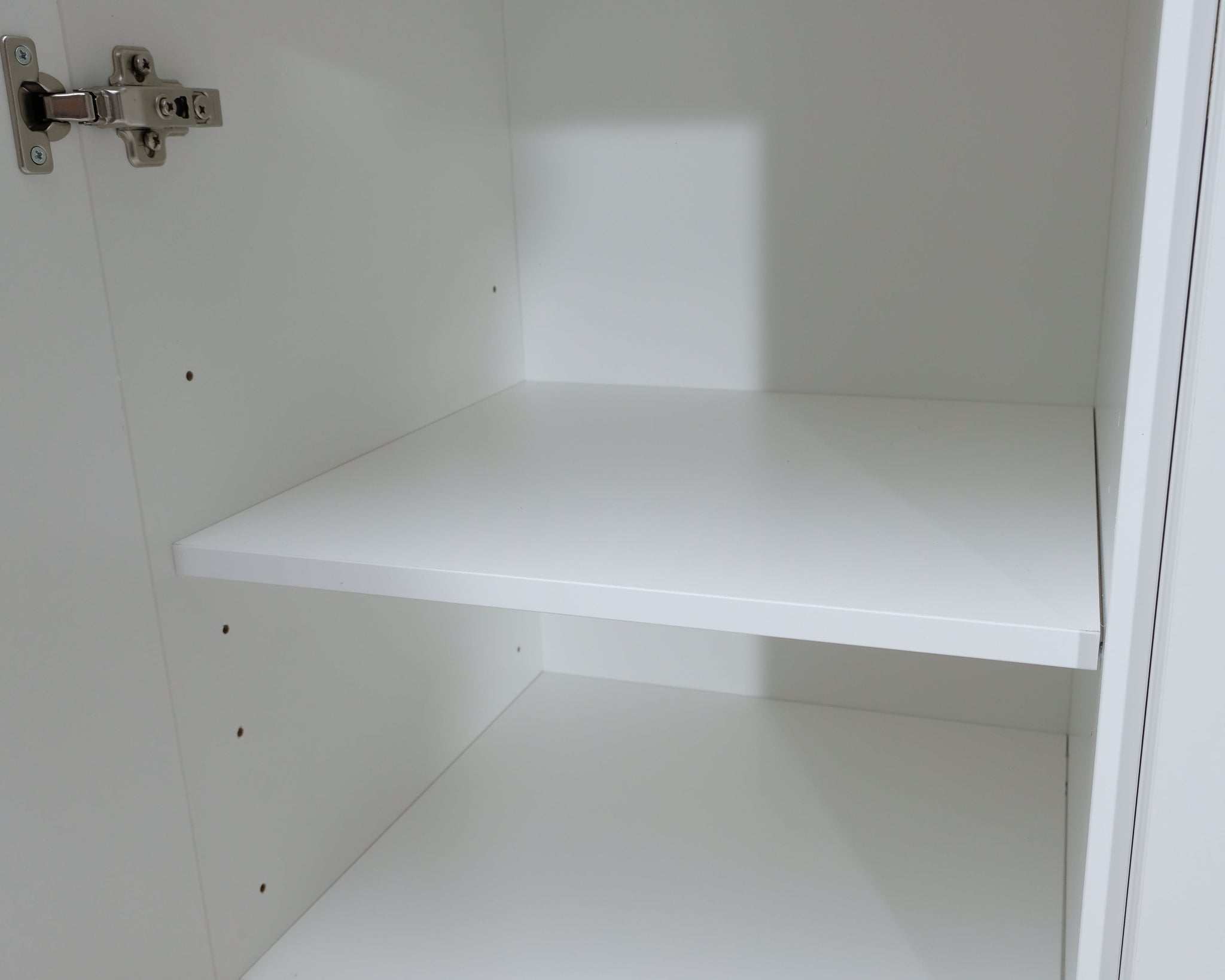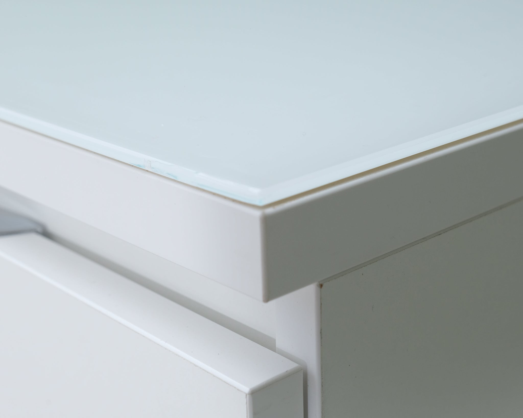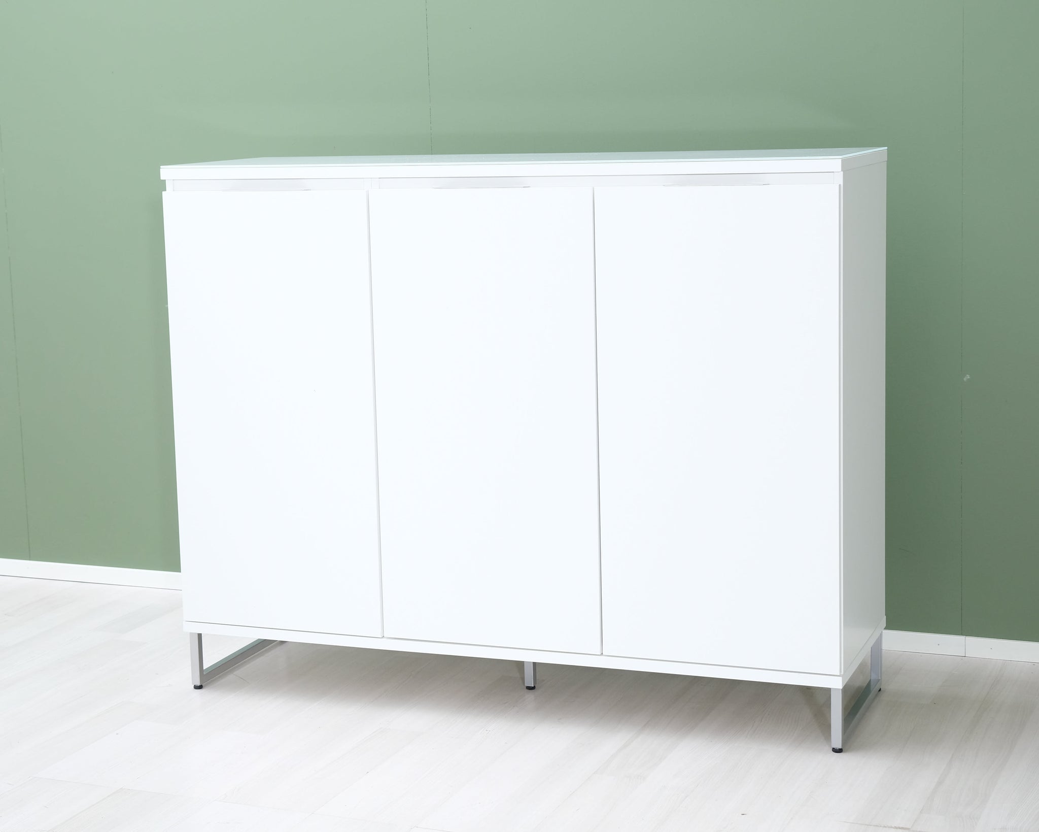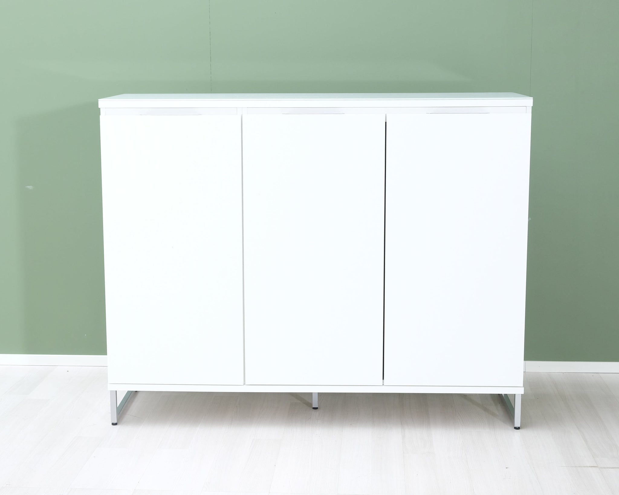 Askon Otso-sarjan valkoinen kaappi kolmella ovella. Kaapin päällä lasilevy.