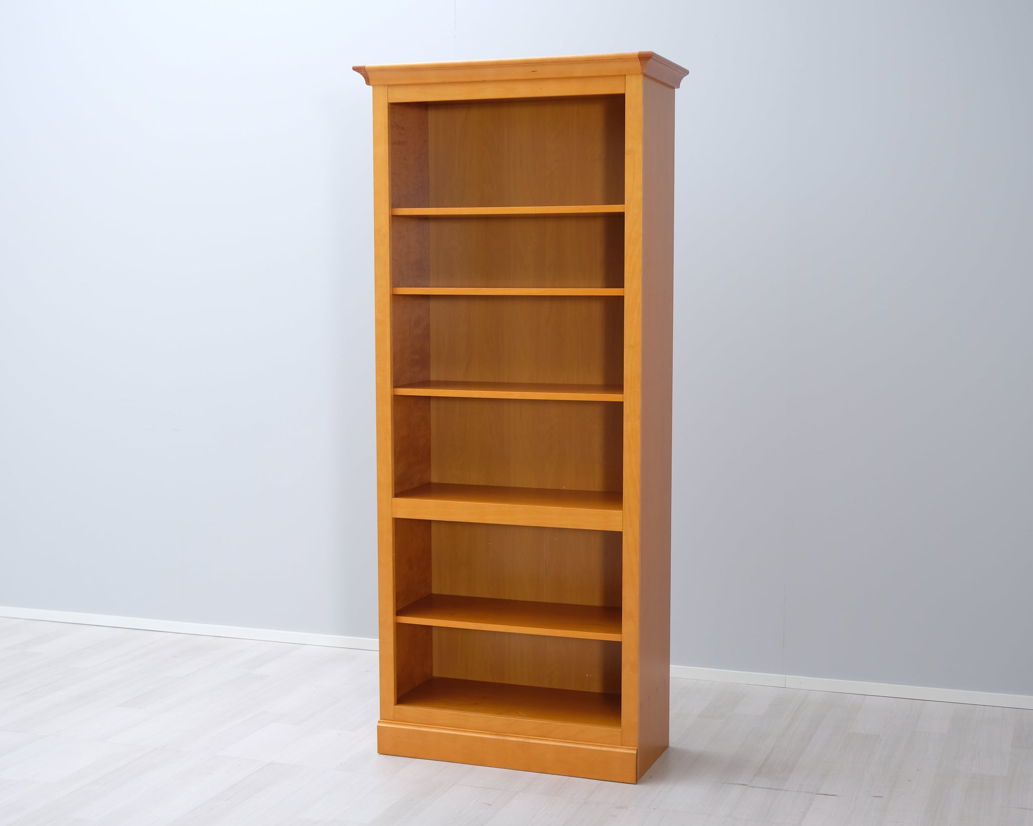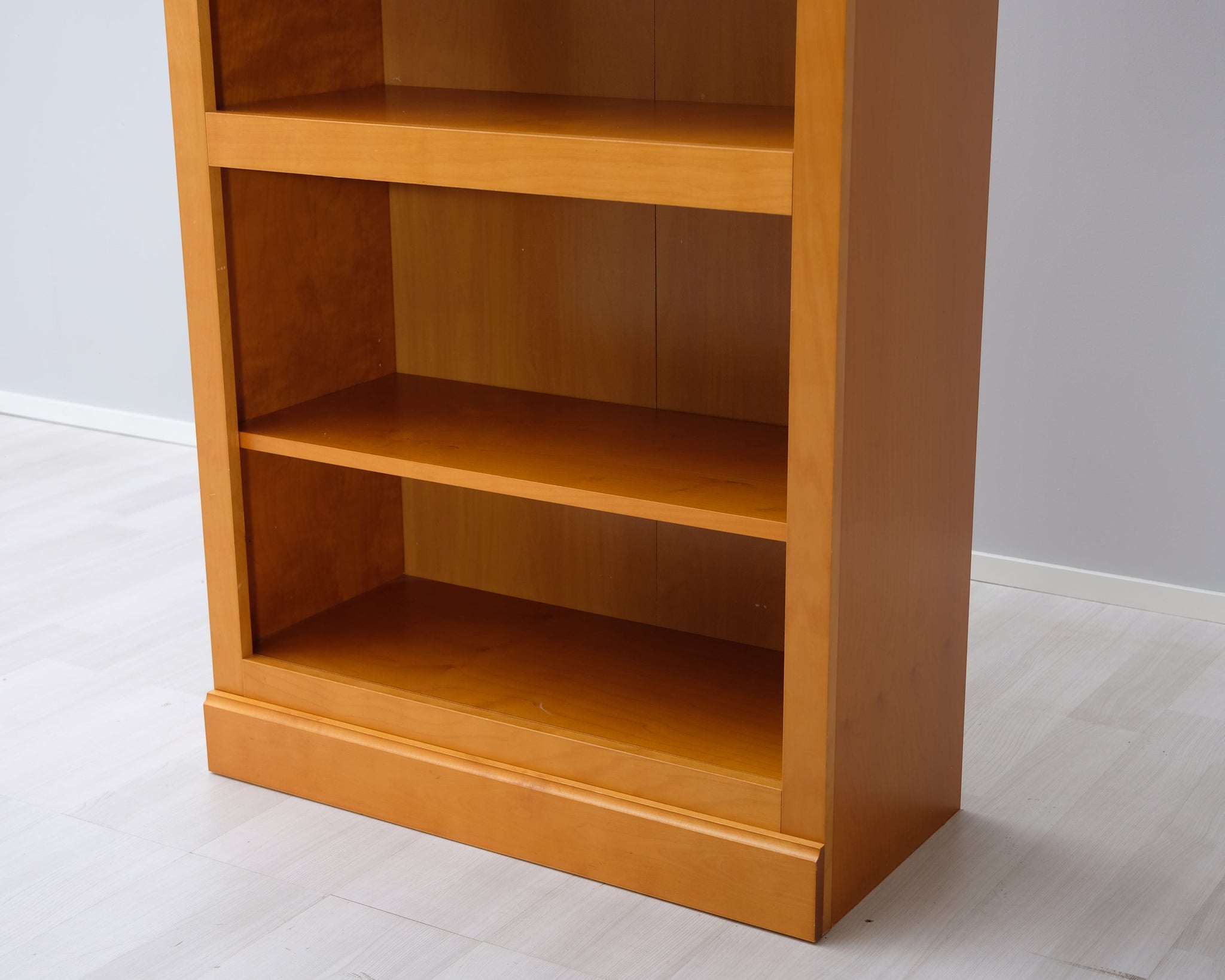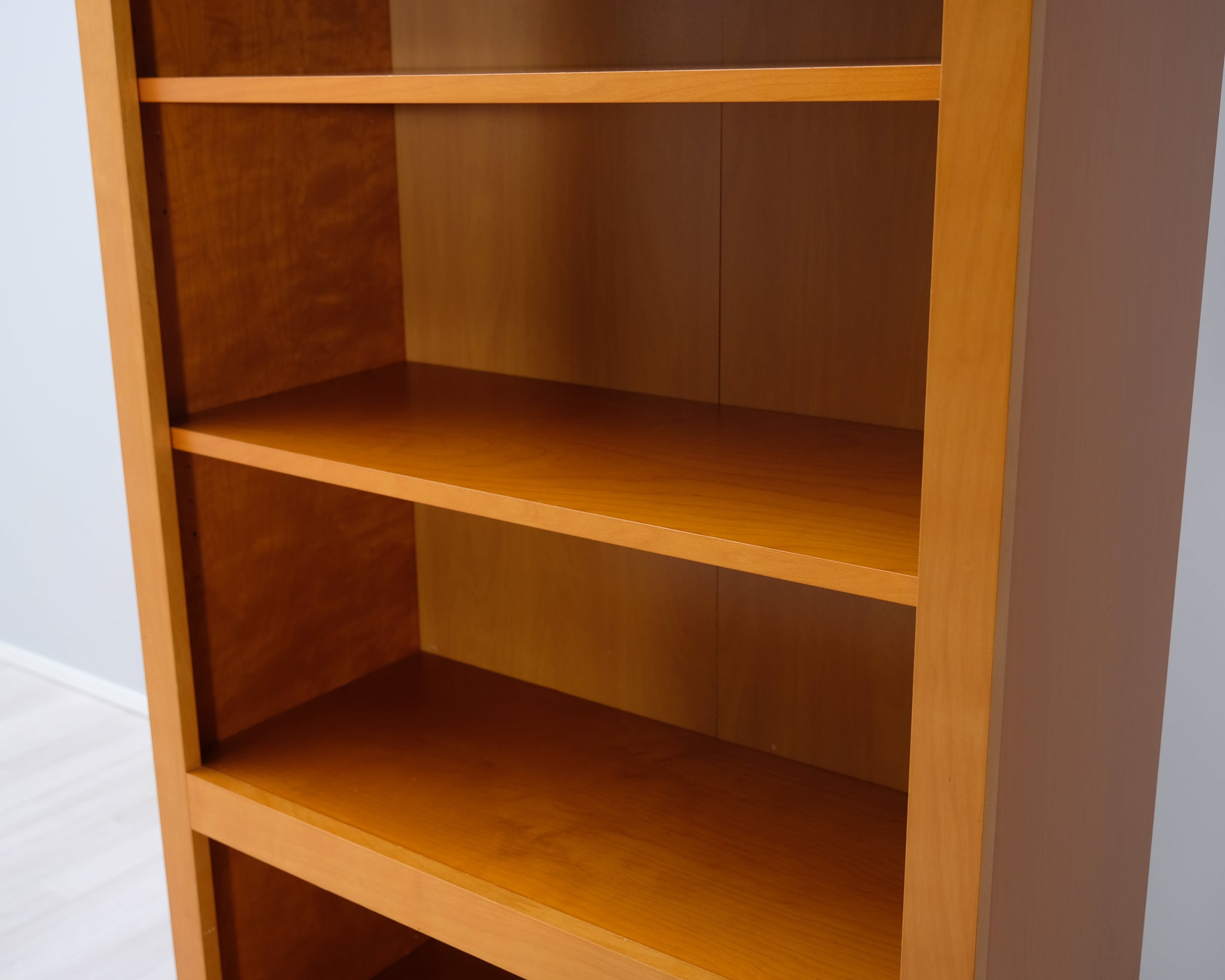 Puinen kirjahylly viidellä hyllylevyllä. Lakkapintainen.
