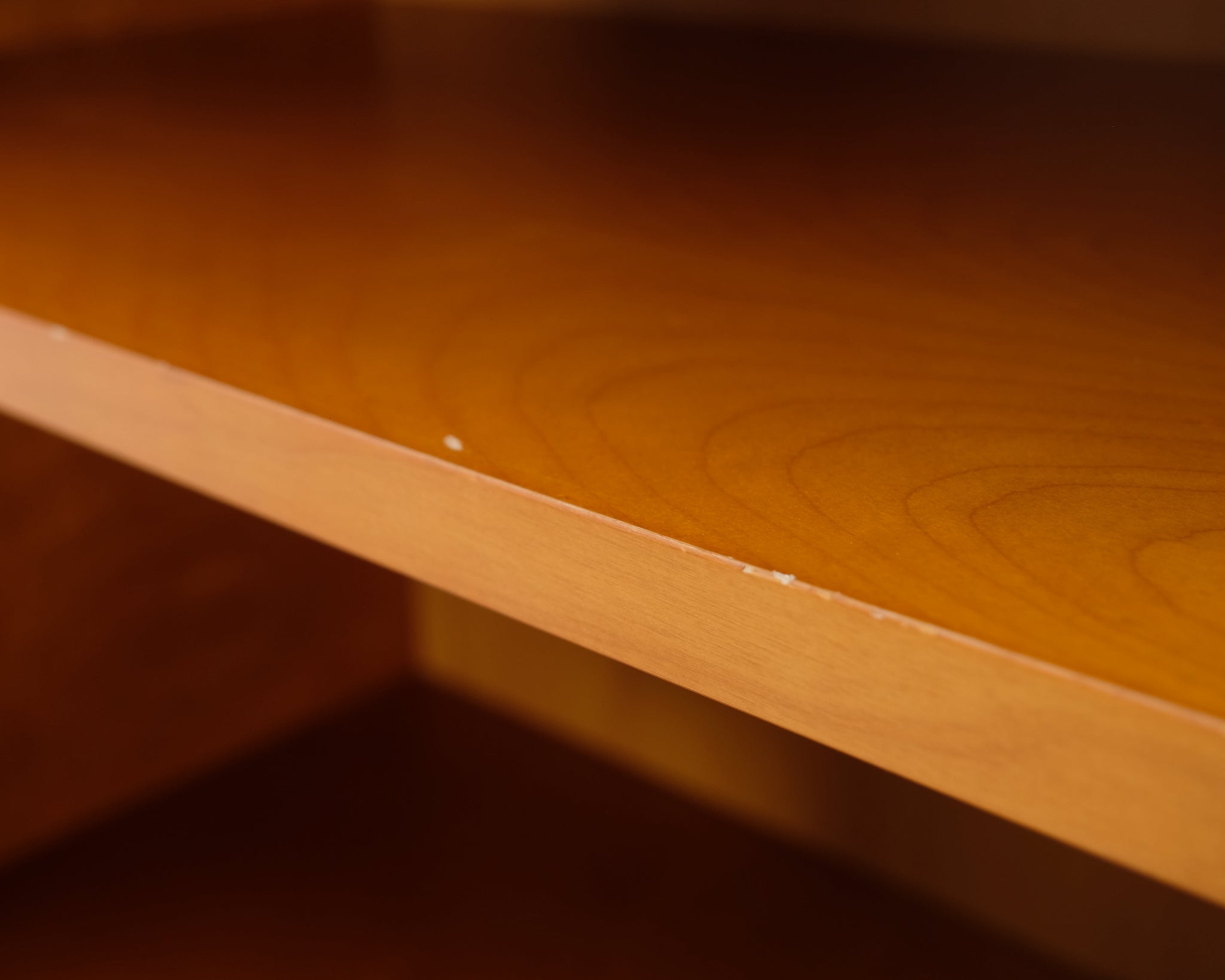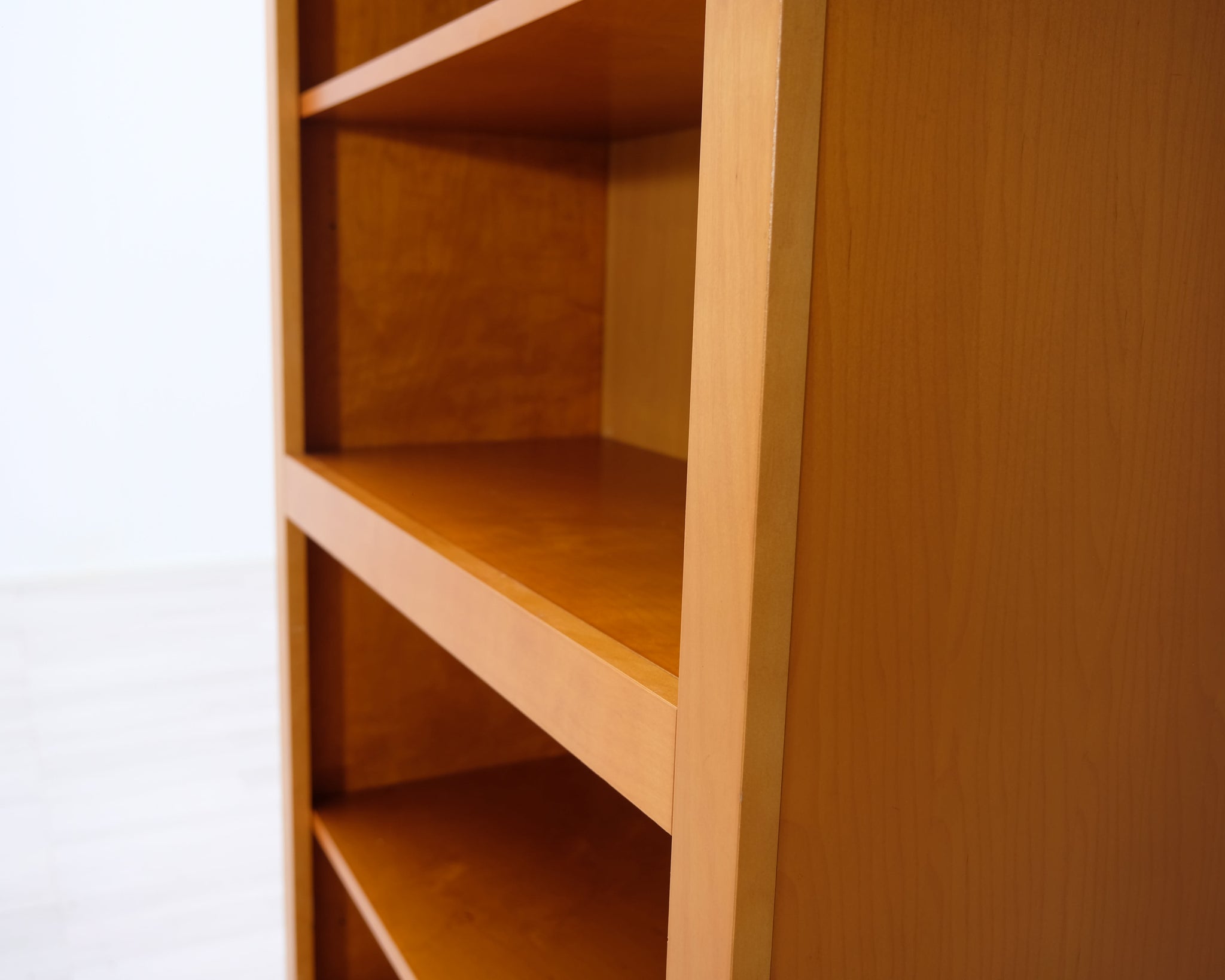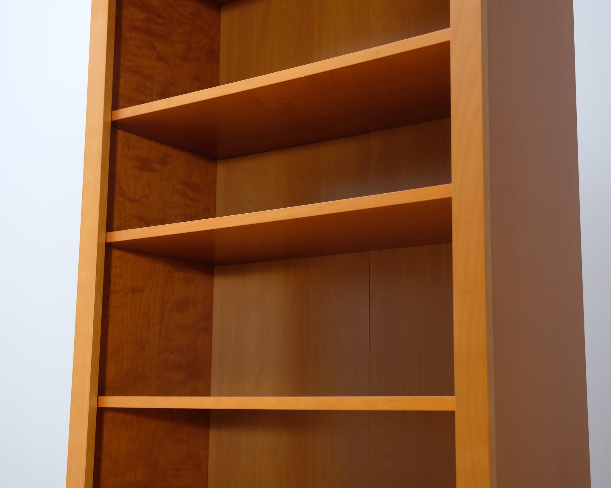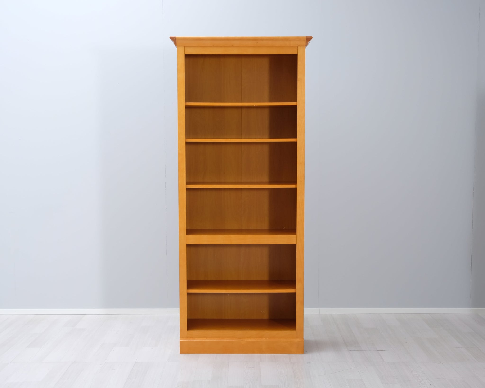 Puinen kirjahylly viidellä hyllylevyllä. Lakkapintainen.