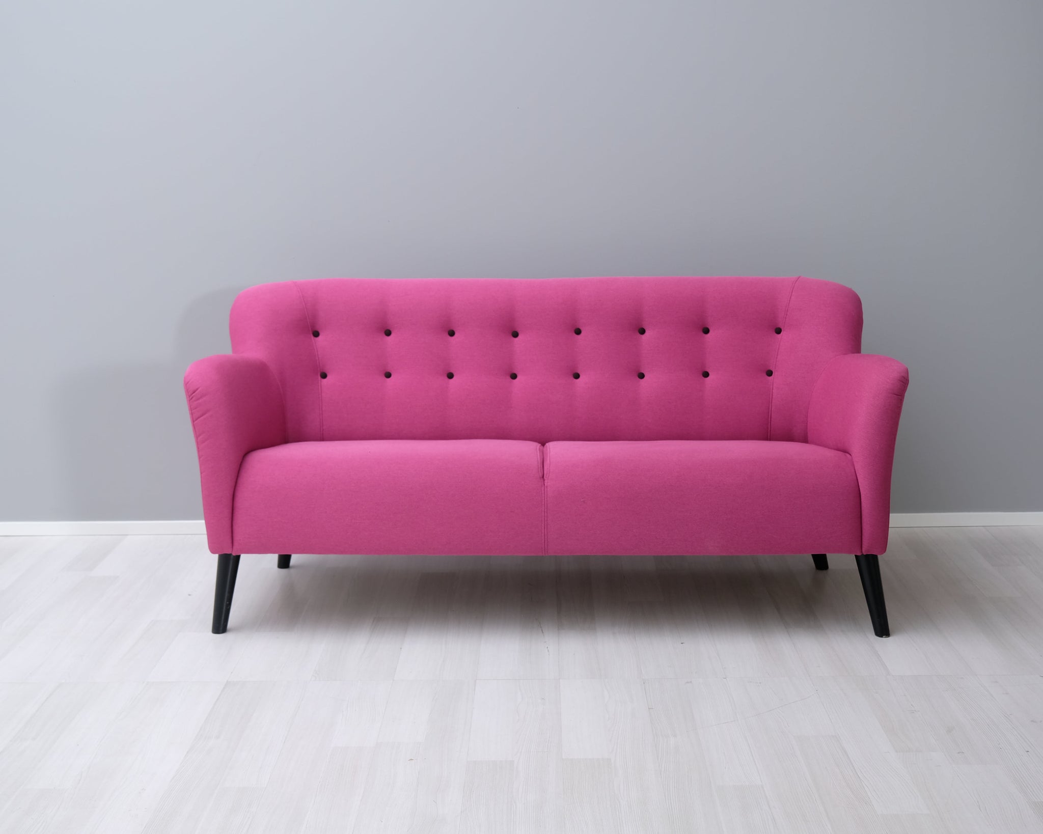 Tämä sohva on todellinen katseenvangitsija! Kahden istuttavassa sohvassa yhdistyy 60-luvun muoto ja räväkkä pinkki verhoilu.