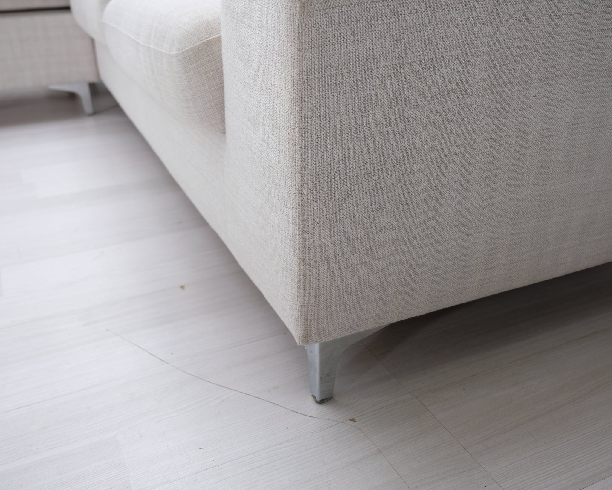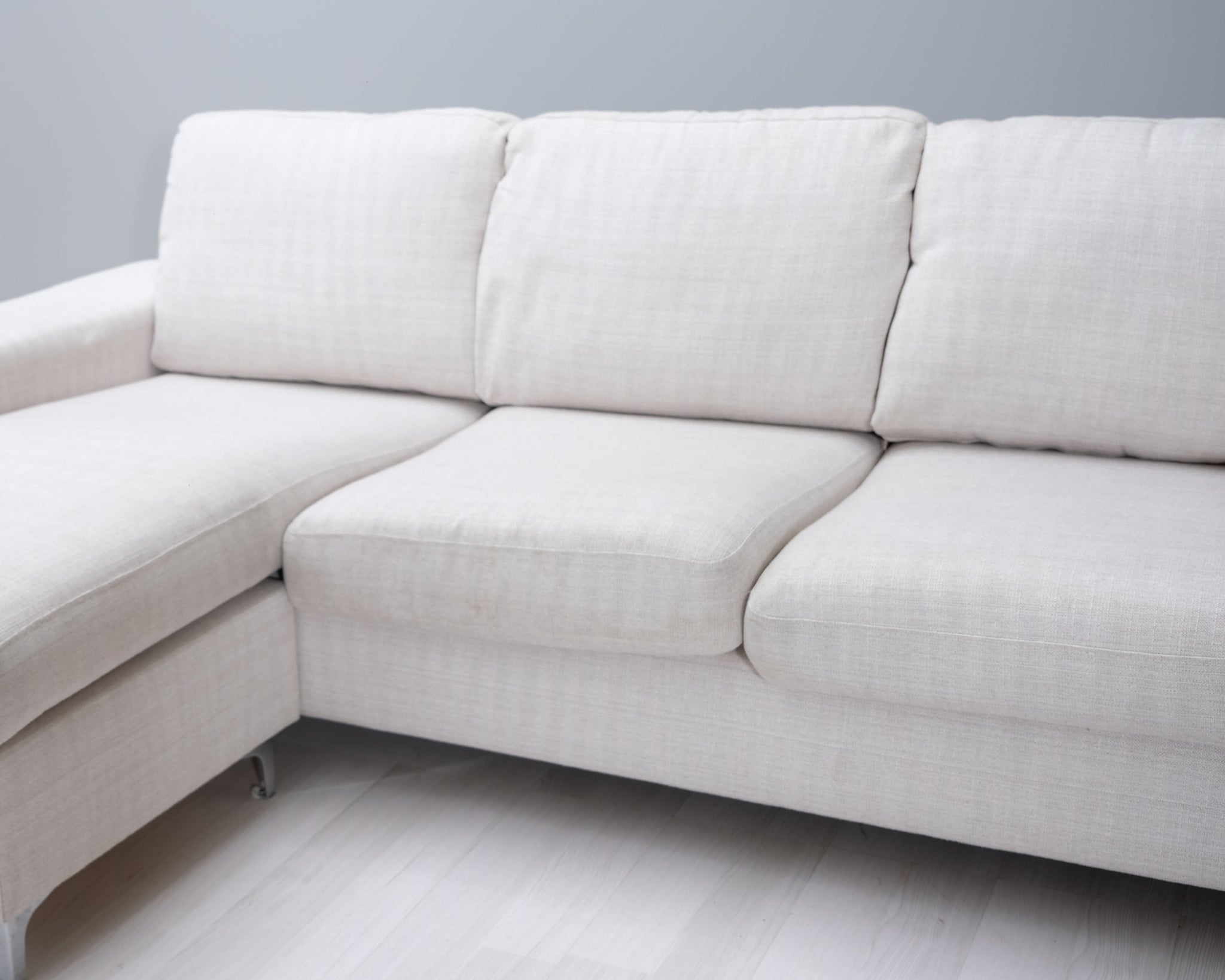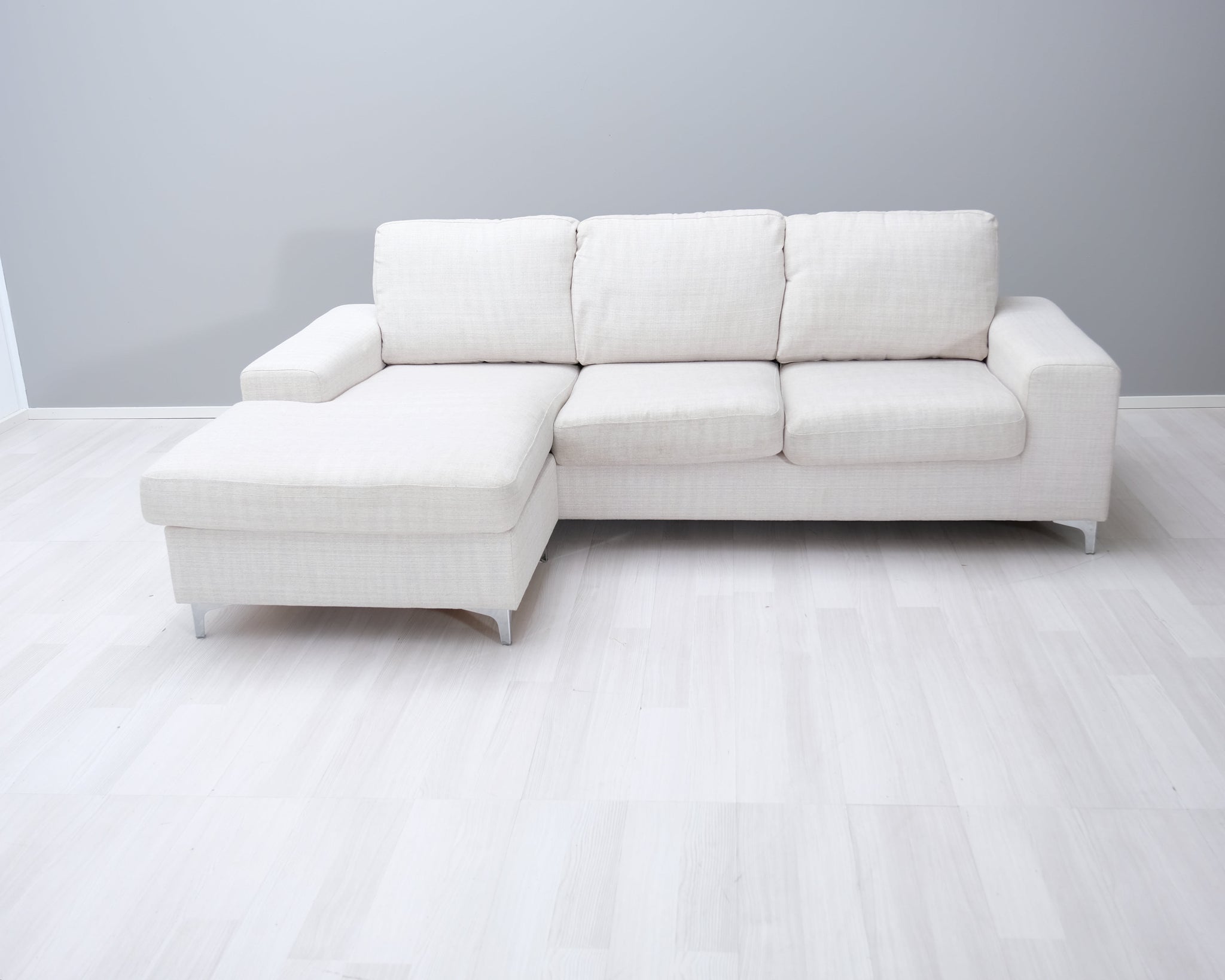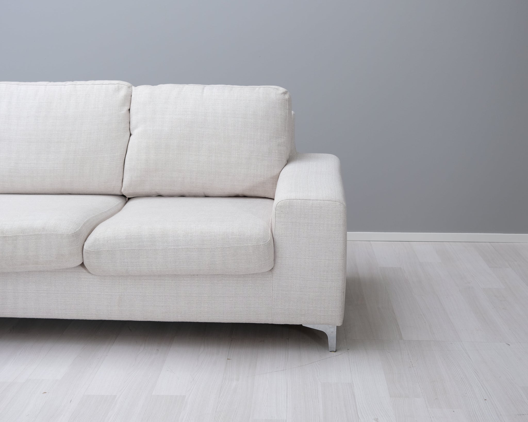 Kotimaisen Askon kolmen istuttava divaanisohva. Kitin värinen kangasverhoilu ja metallijalat.