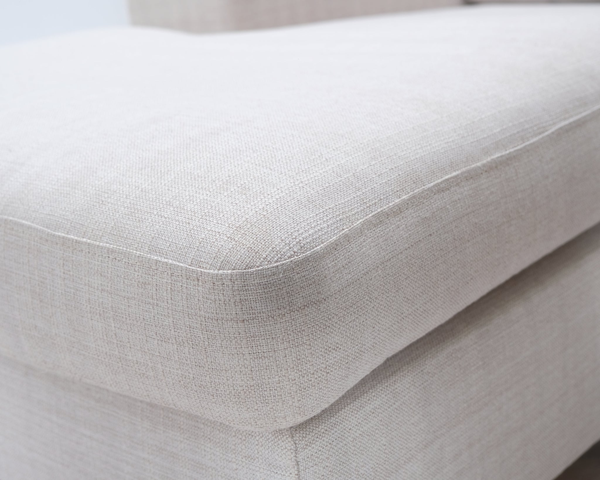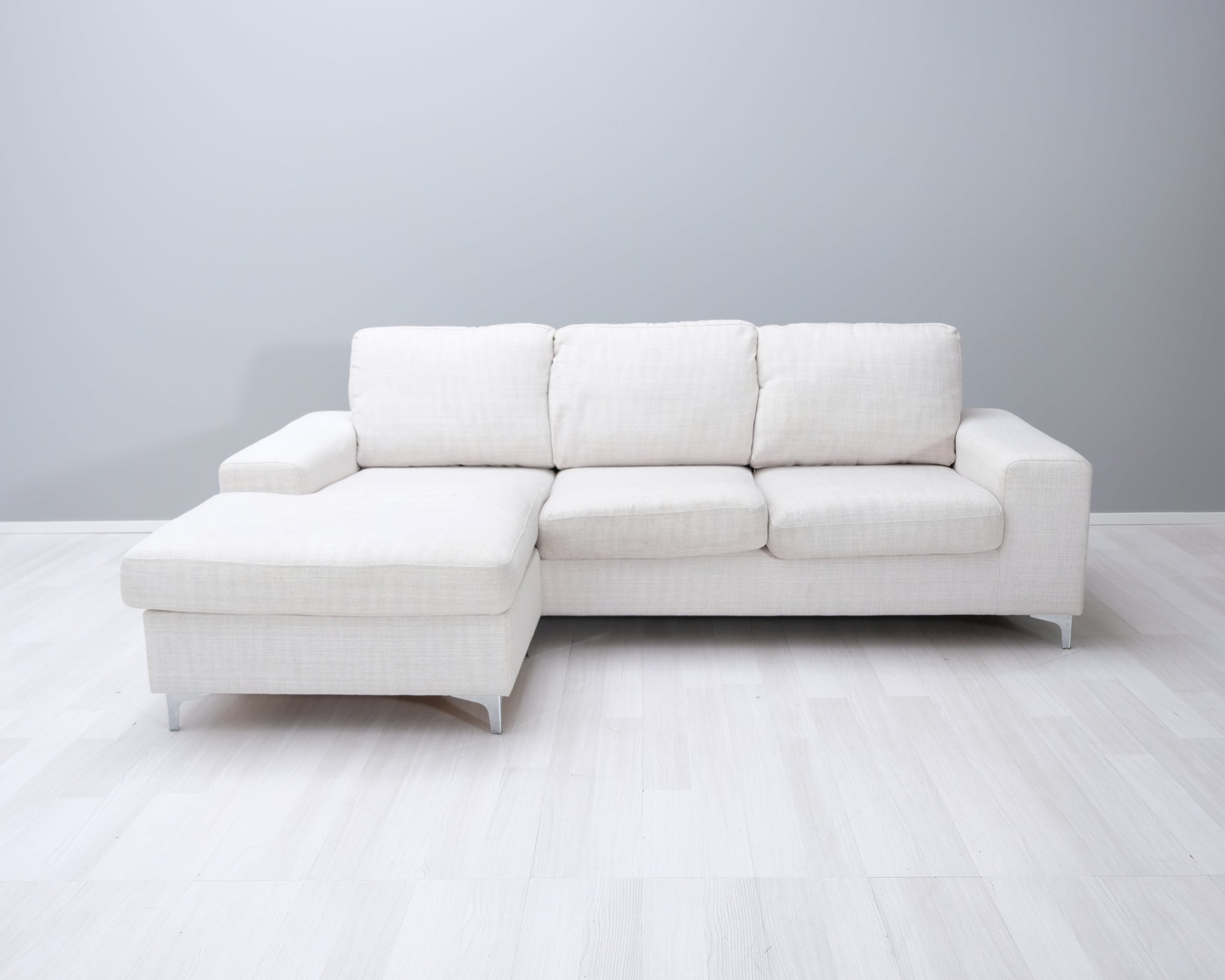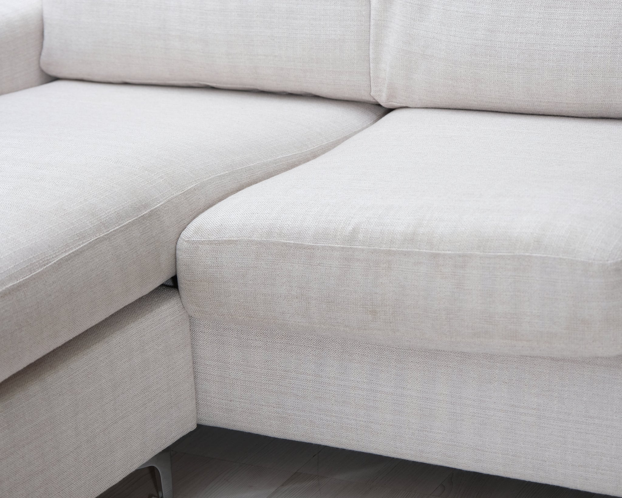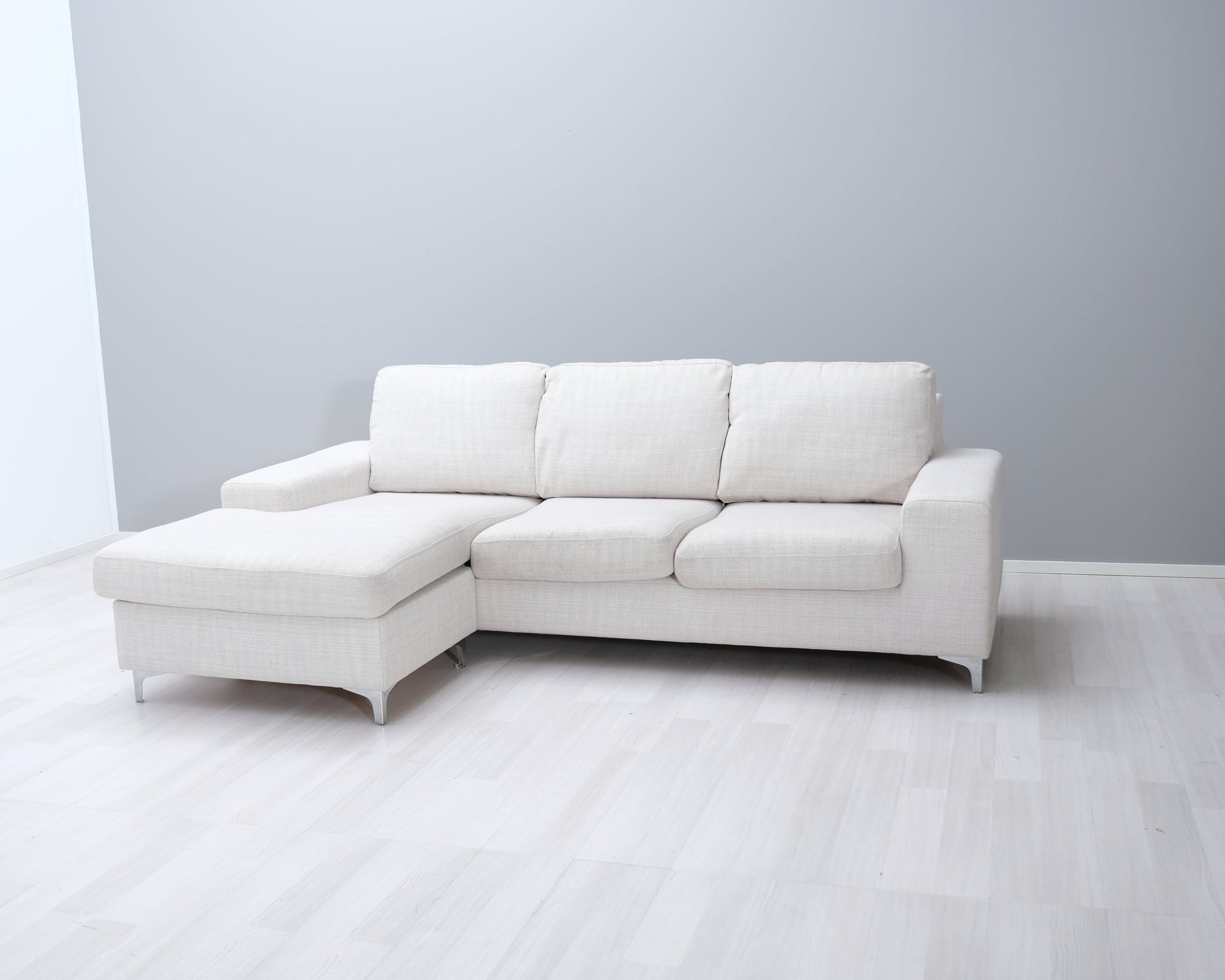 Kotimaisen Askon kolmen istuttava divaanisohva. Kitin värinen kangasverhoilu ja metallijalat.