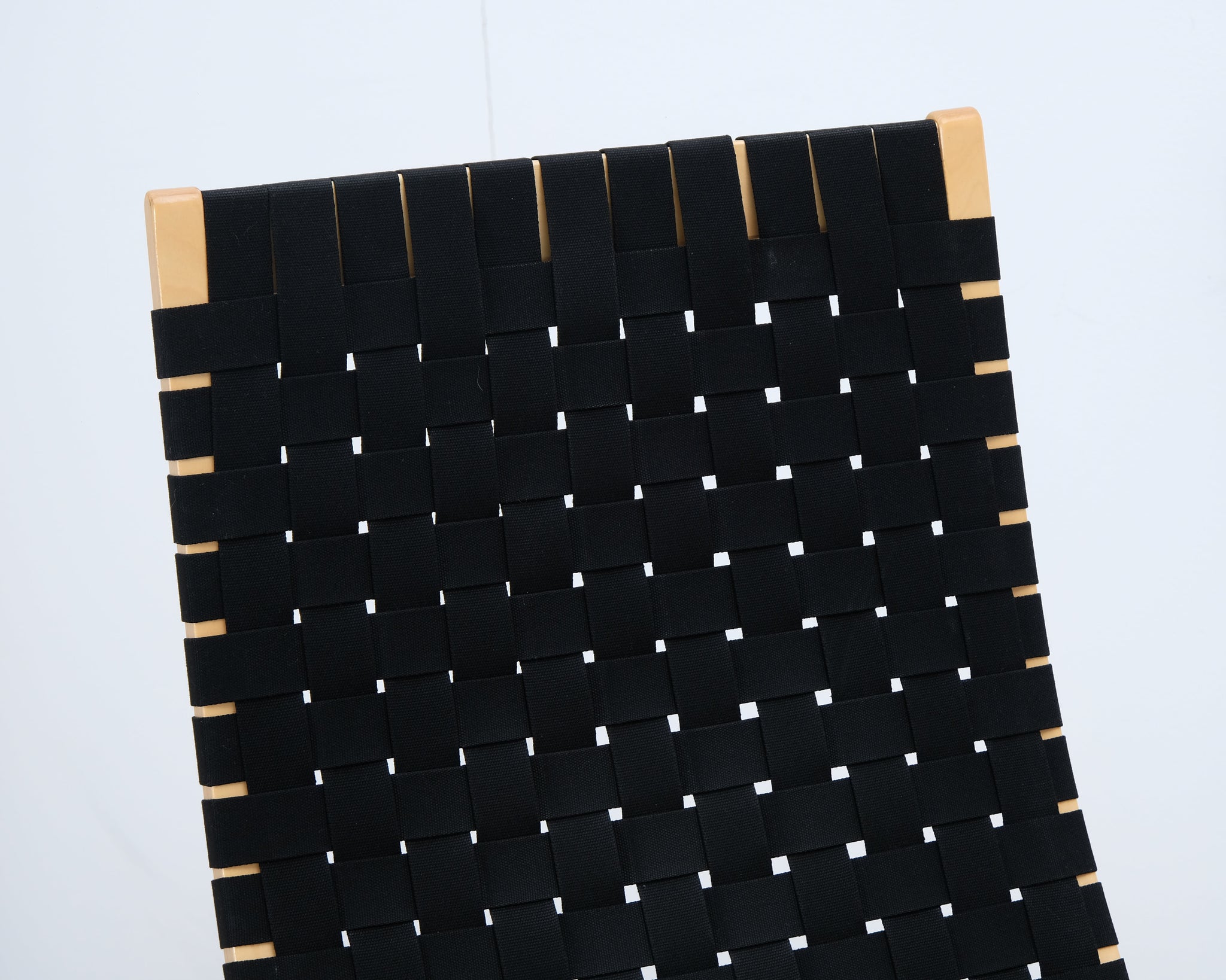 Askon valmistama Harlekiini-lepotuoli on suomalainen klassikko. Jalat ja käsinojat muotoonpuristetusta koivusta ja istuin punottu mustista satulavöistä.