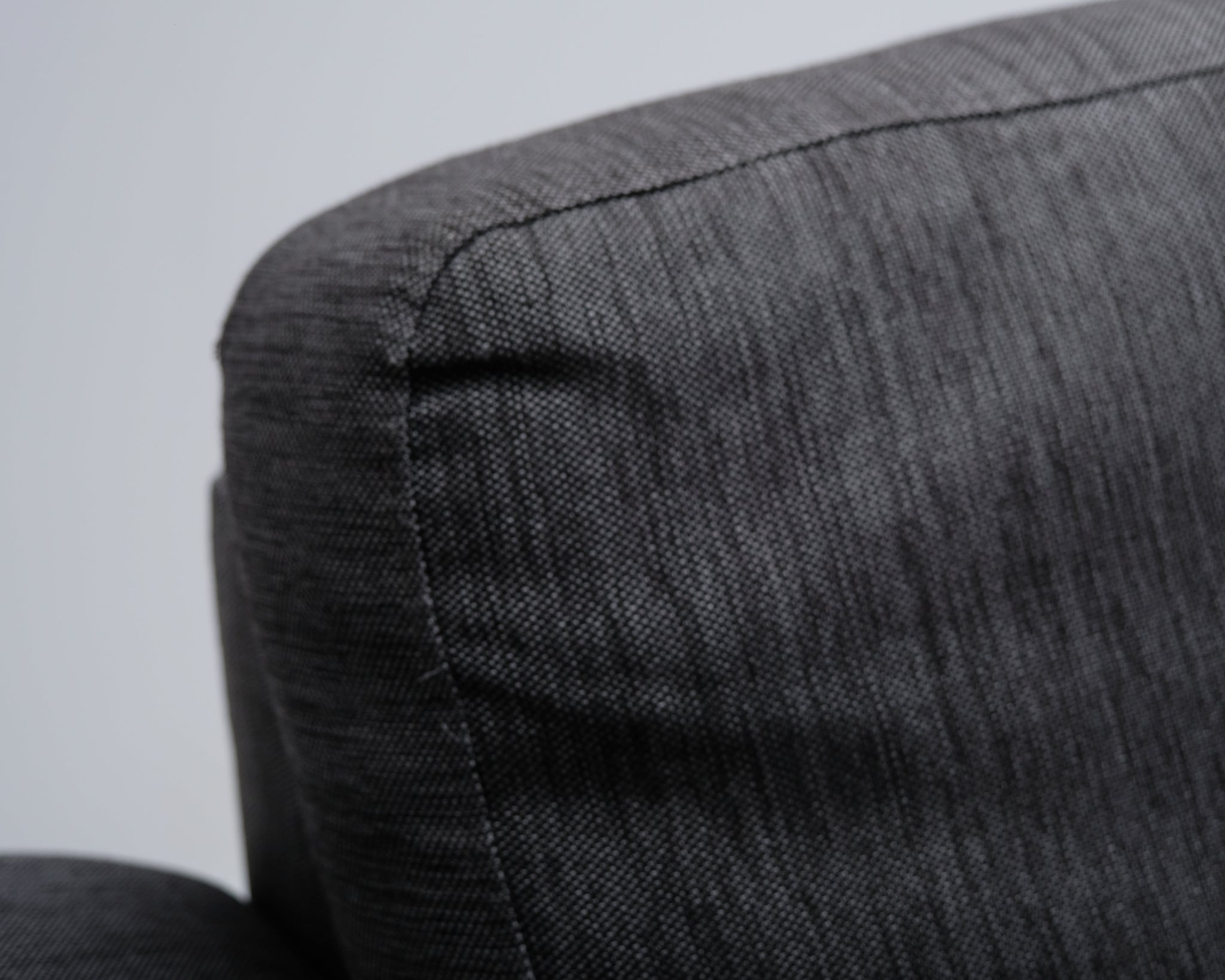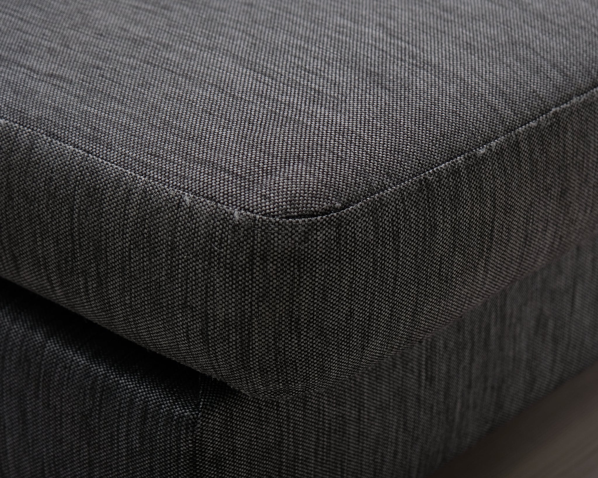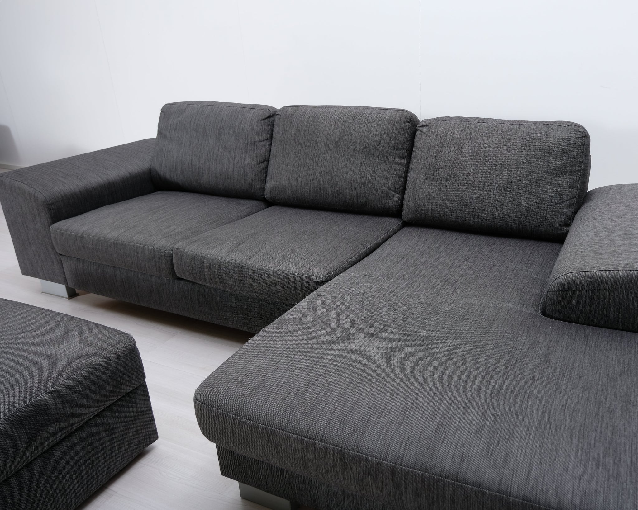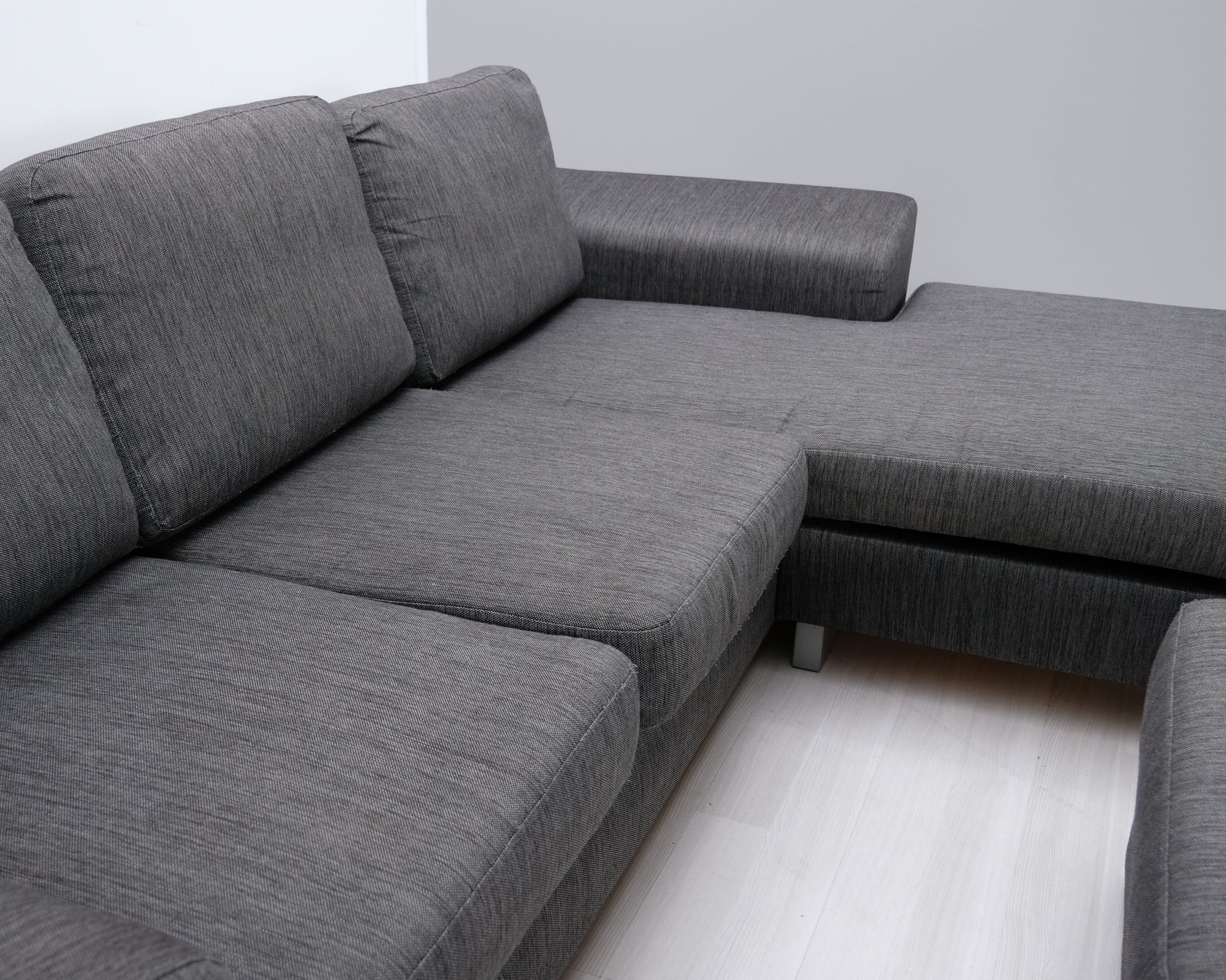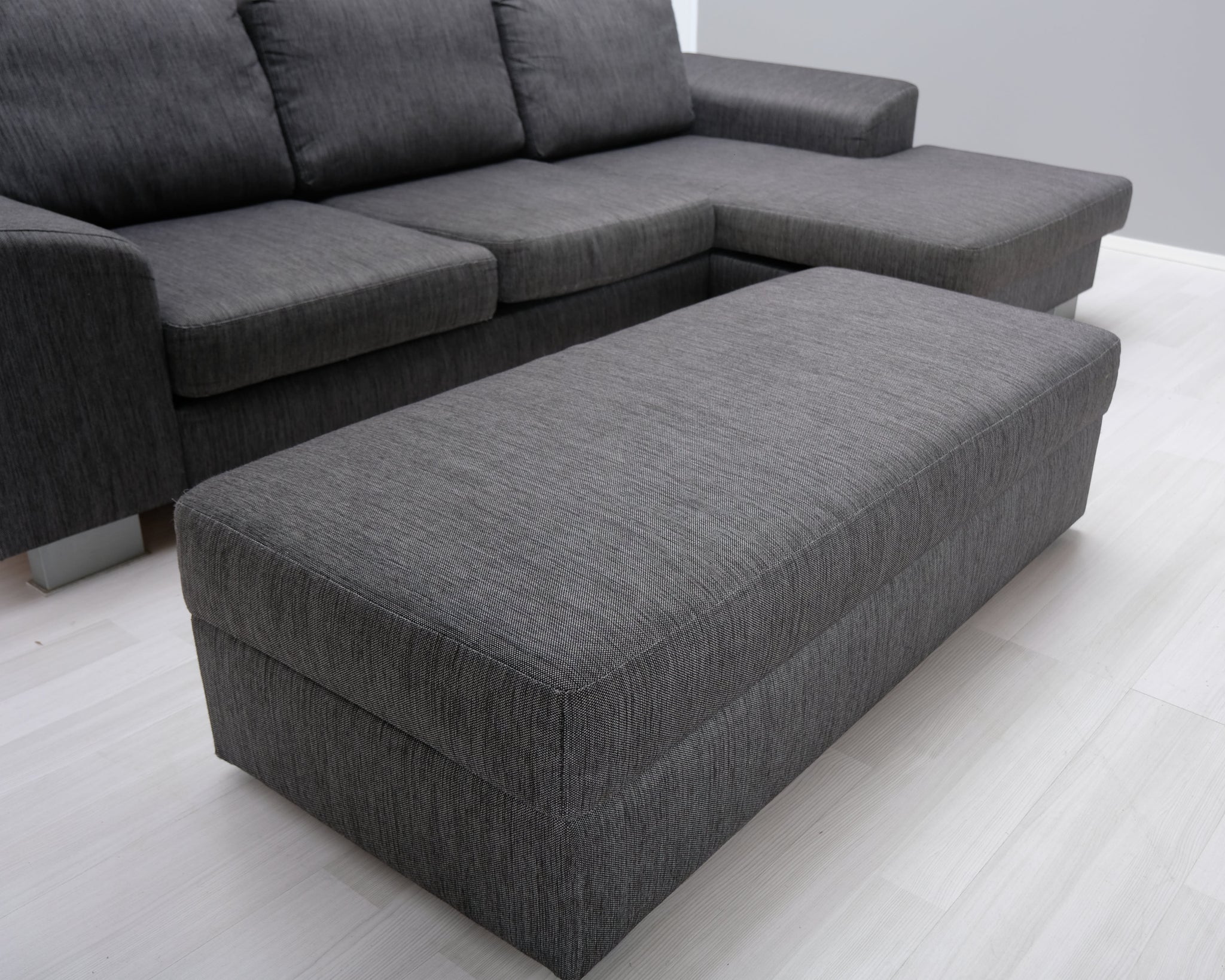 Askon kolmen istuttava divaanisohva ja suurikokoinen rahi. Harmaa kangasverhoilu. Rahin avulla sohvasta saa muokattua kahden hengen varavuoteen.