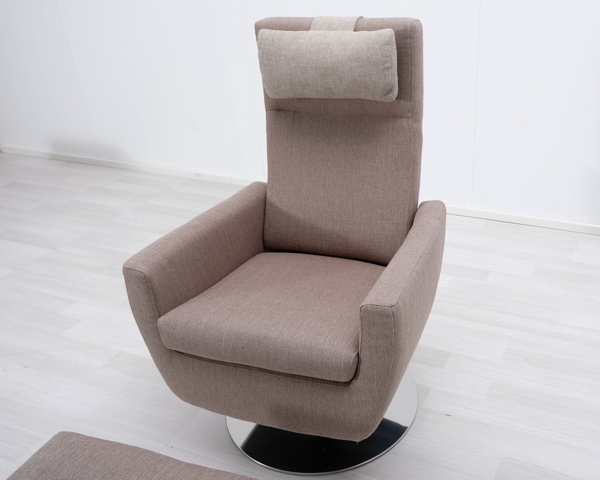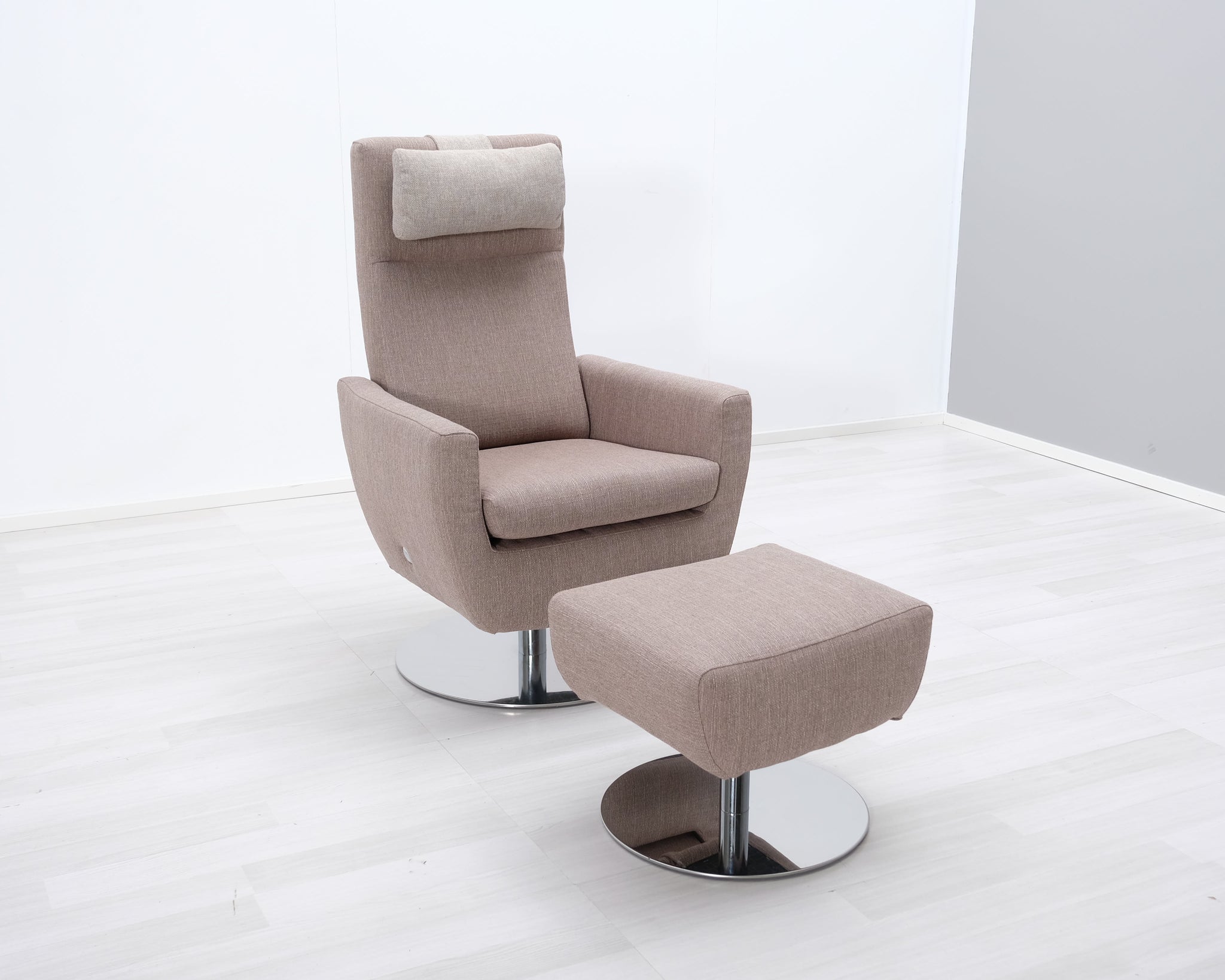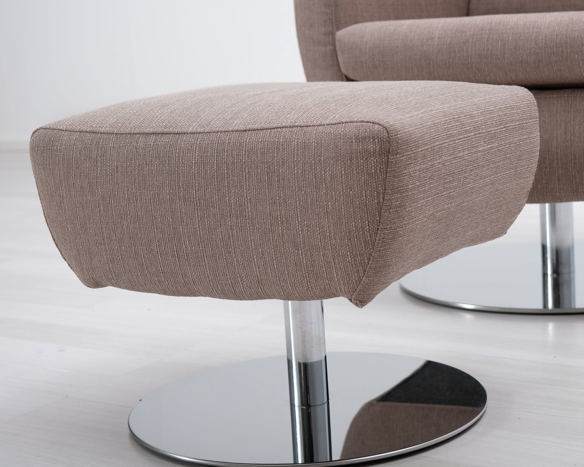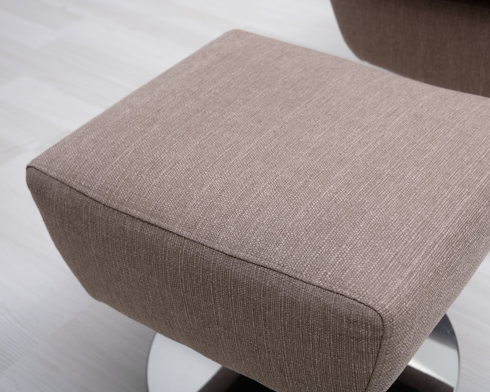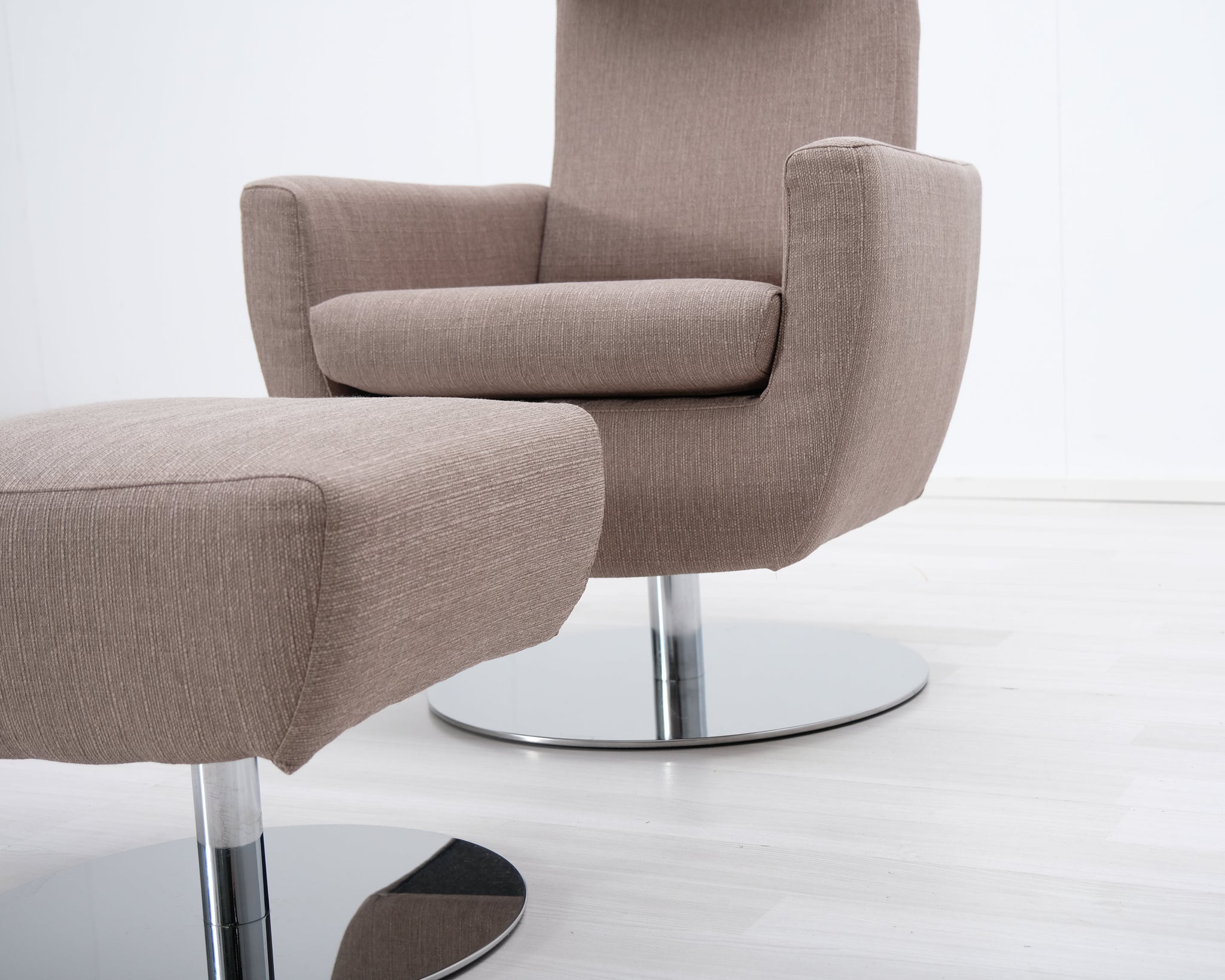 Kotimaisen Askon valmistama nojatuoli ja yhteensopiva rahi. Beige kangasverhoilu ja metallinen laippajalka.