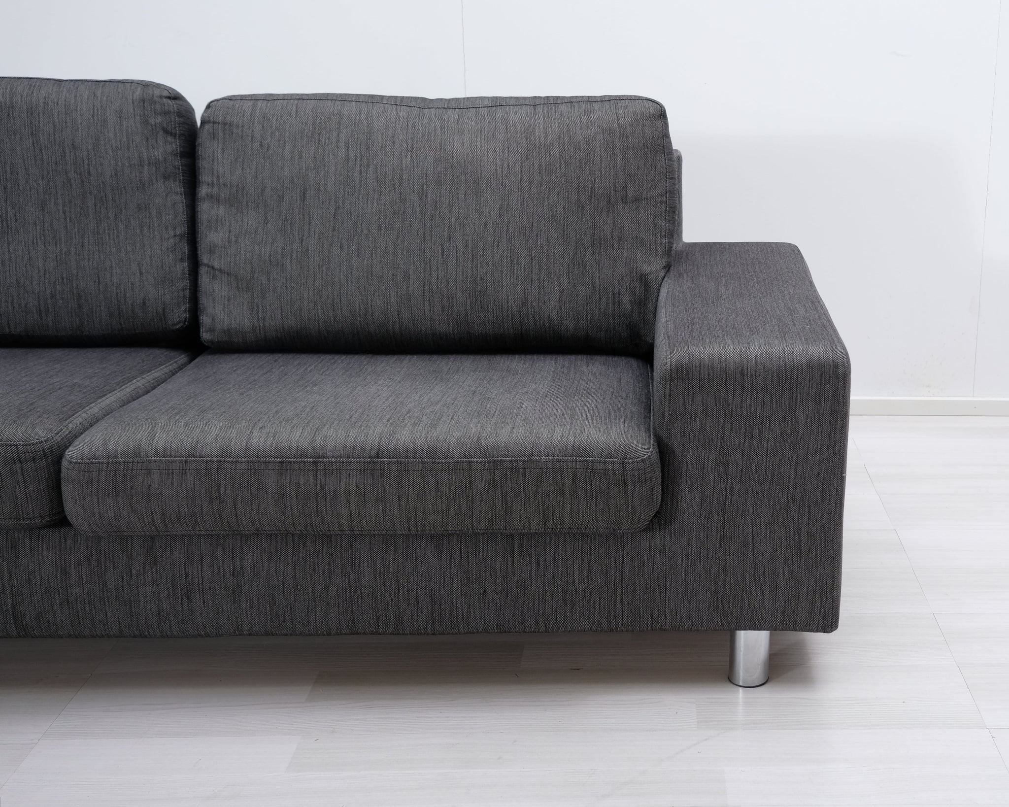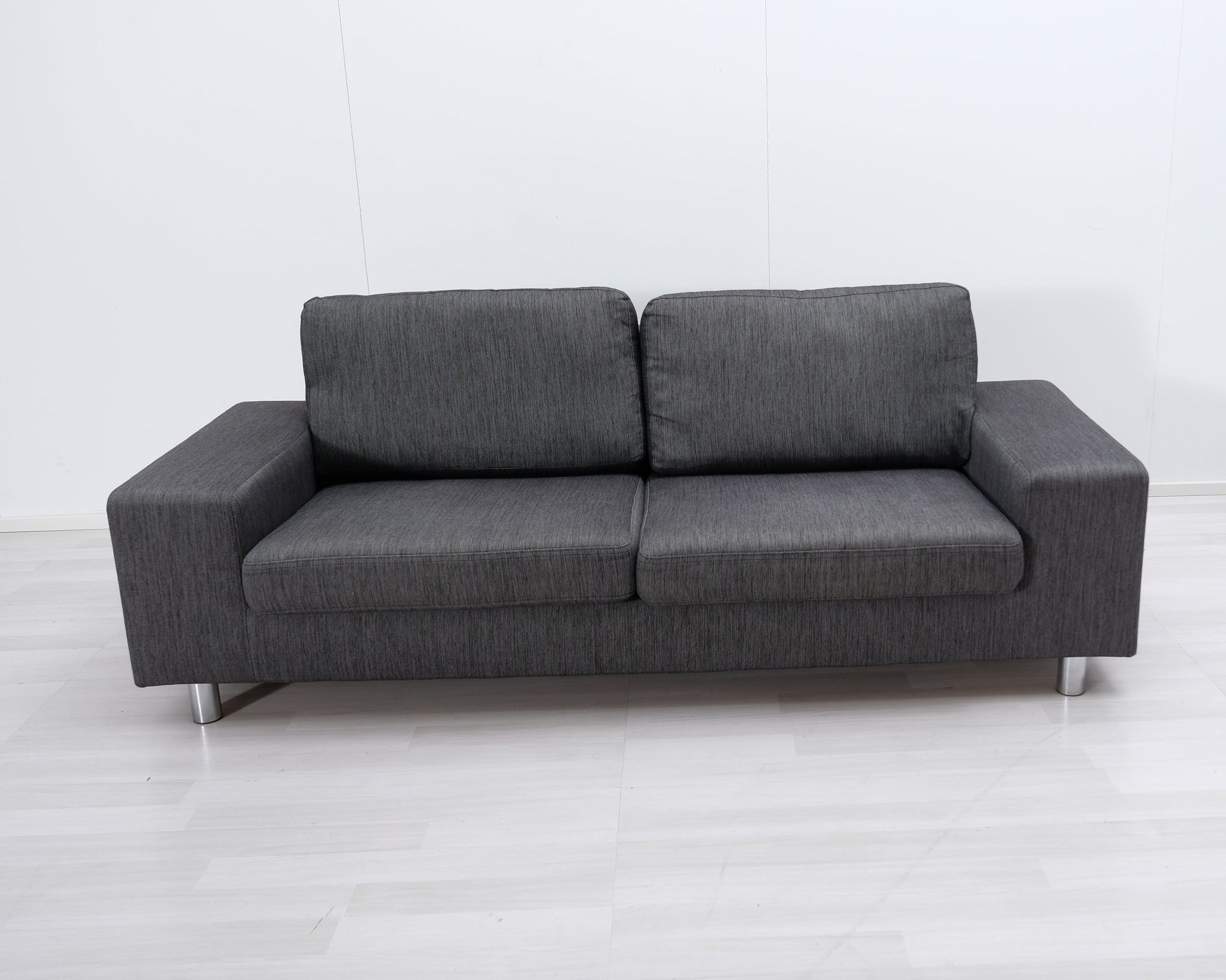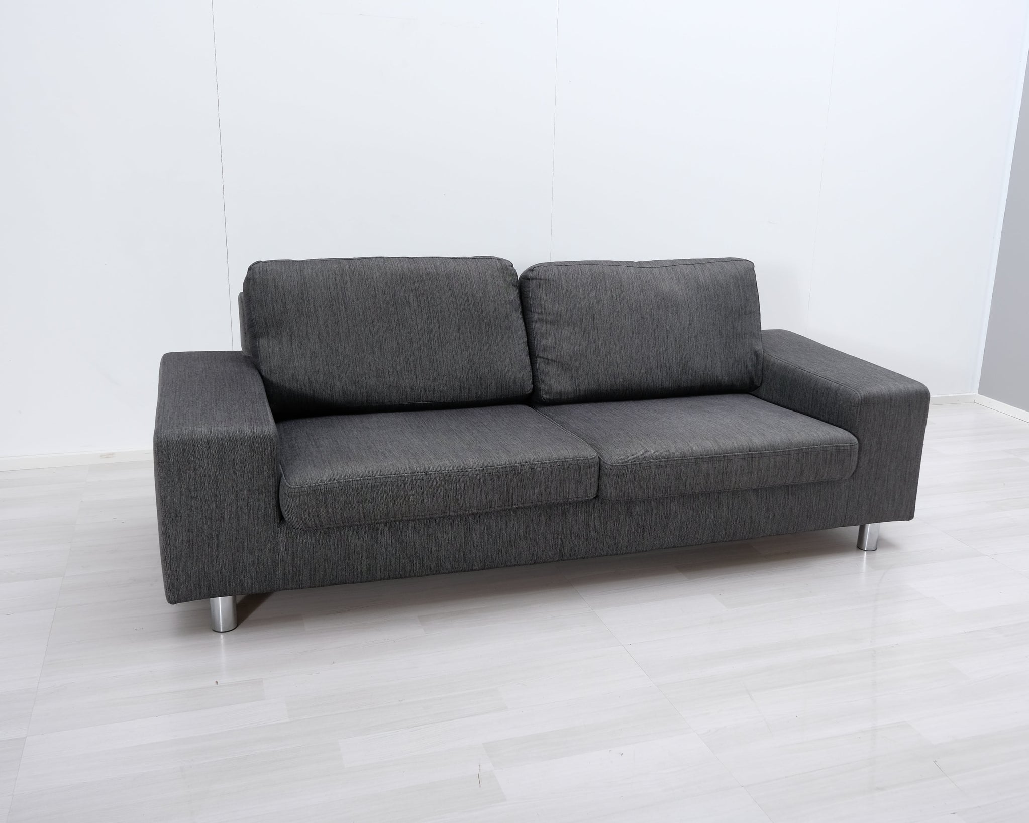 Askon valmistama harmaa kangassohva. Leveät käsinojat ja metallijalat.