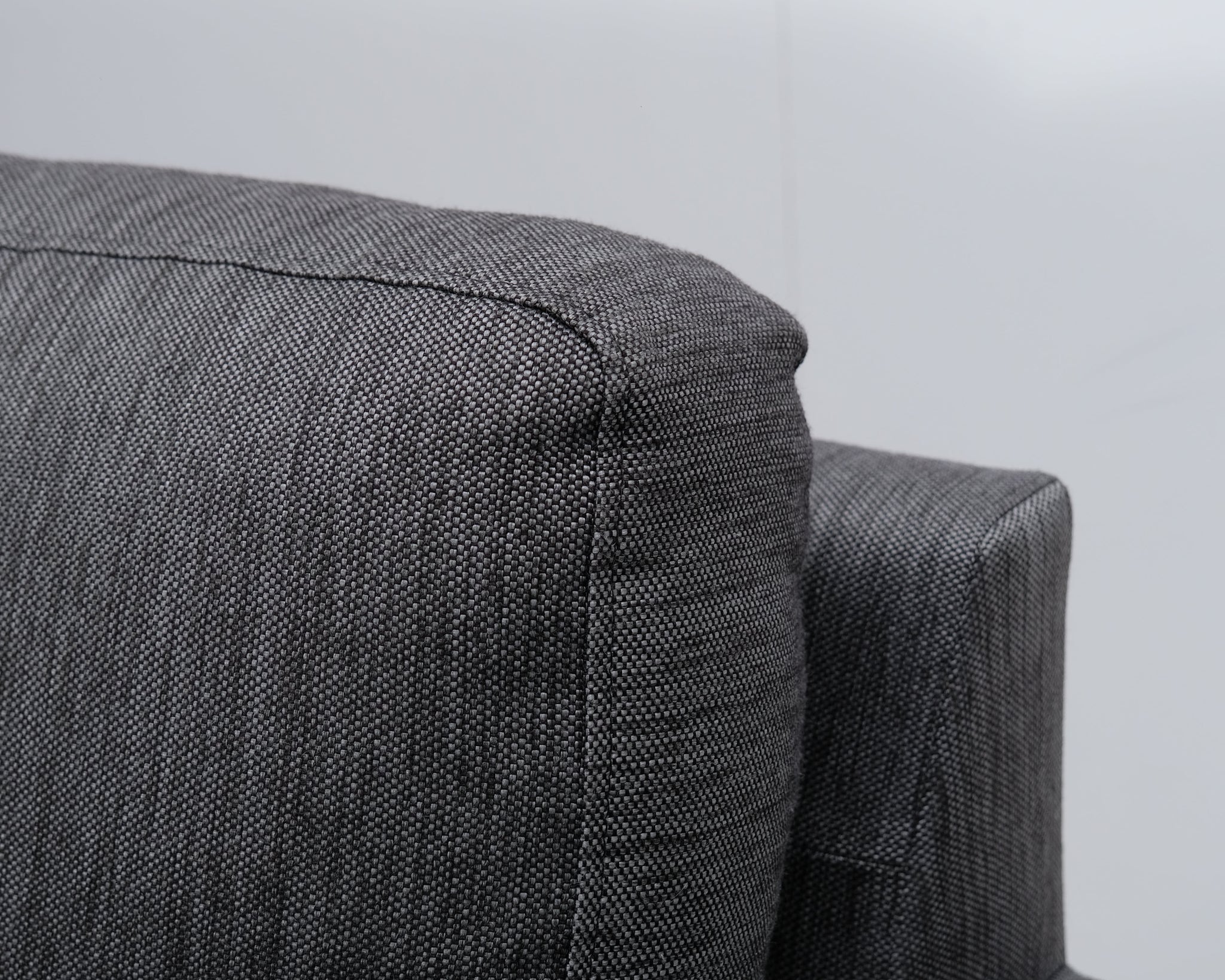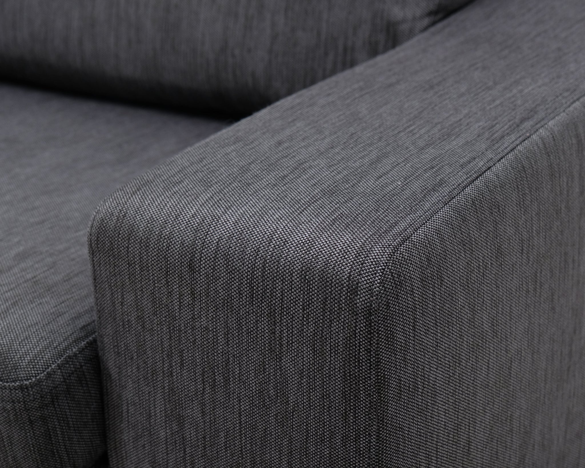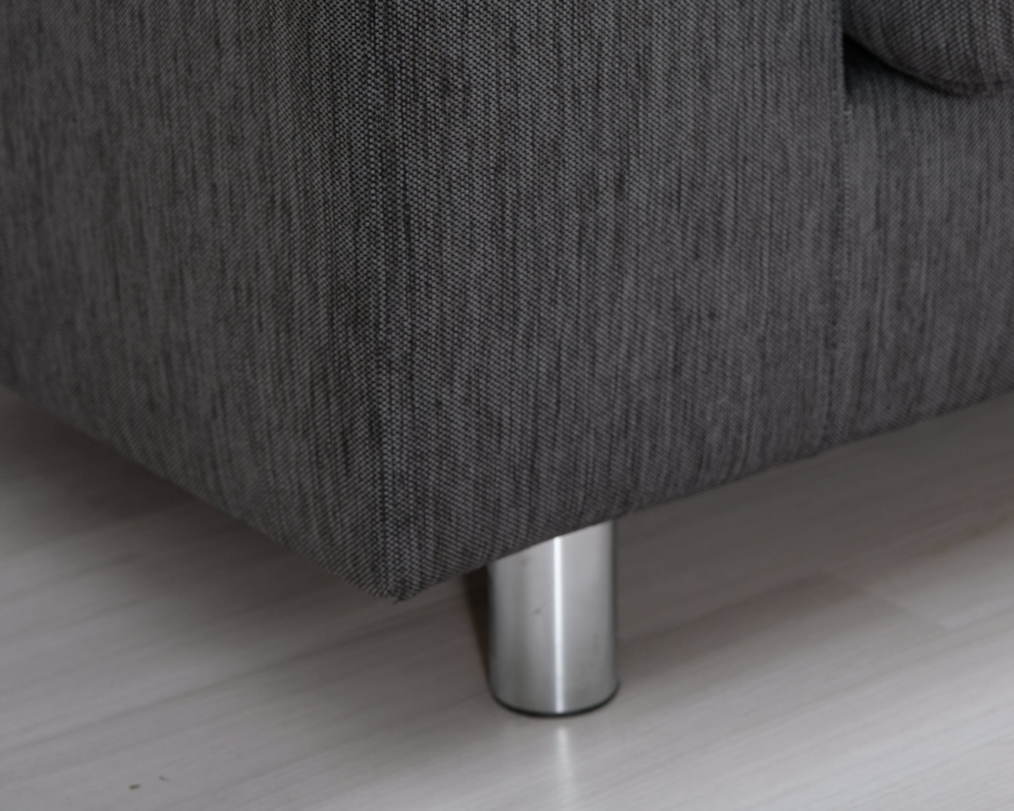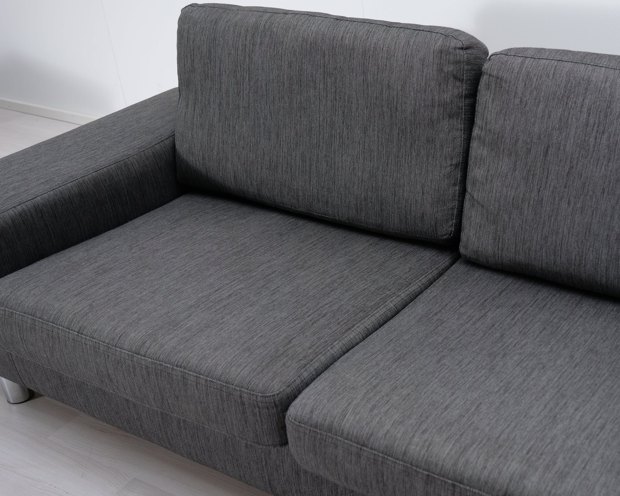 Askon valmistama harmaa kangassohva. Leveät käsinojat ja metallijalat.