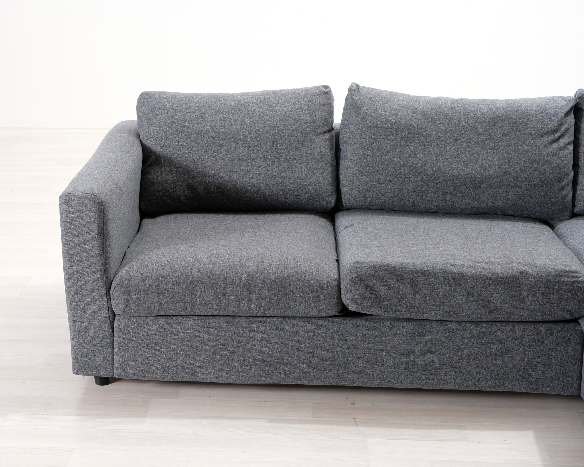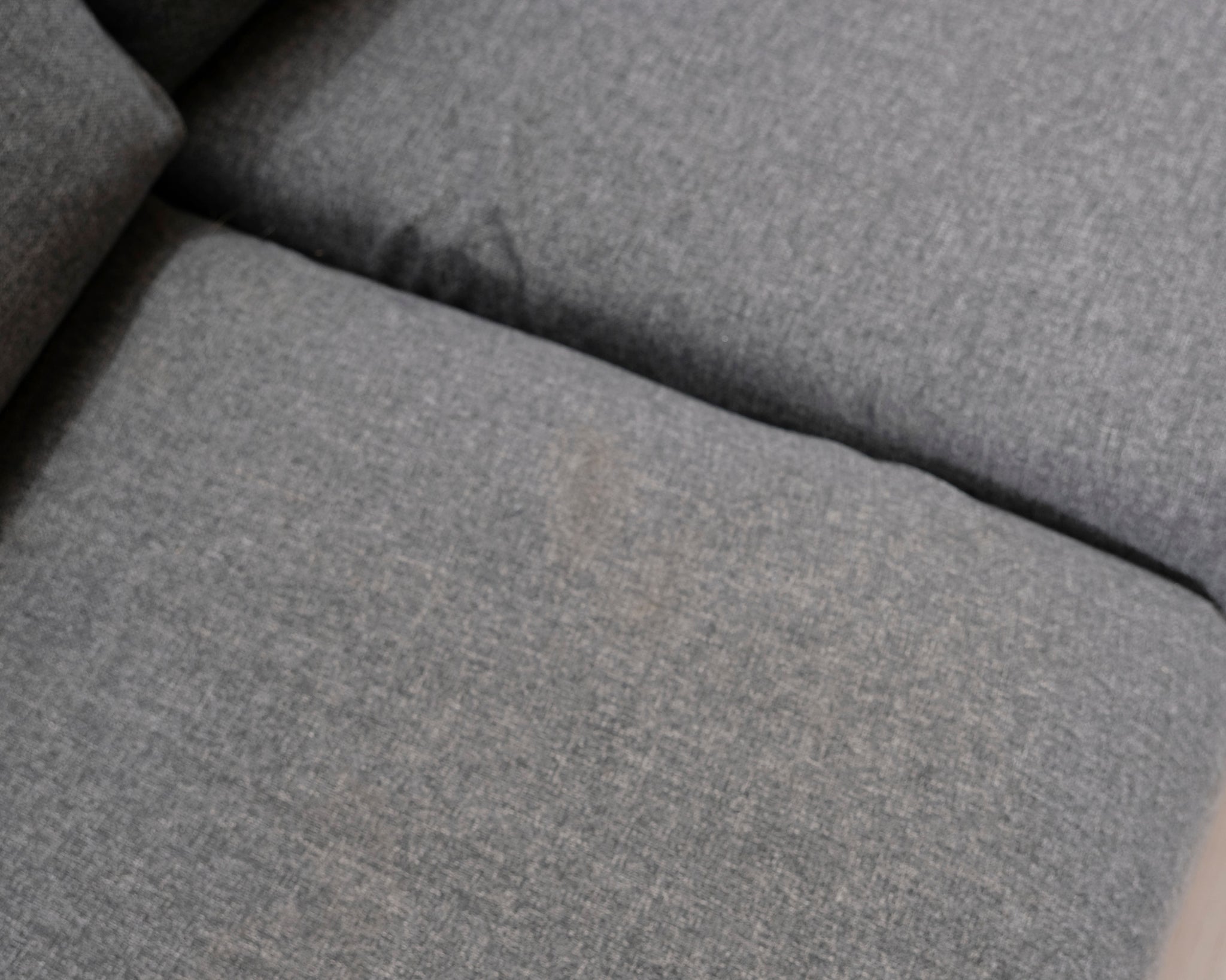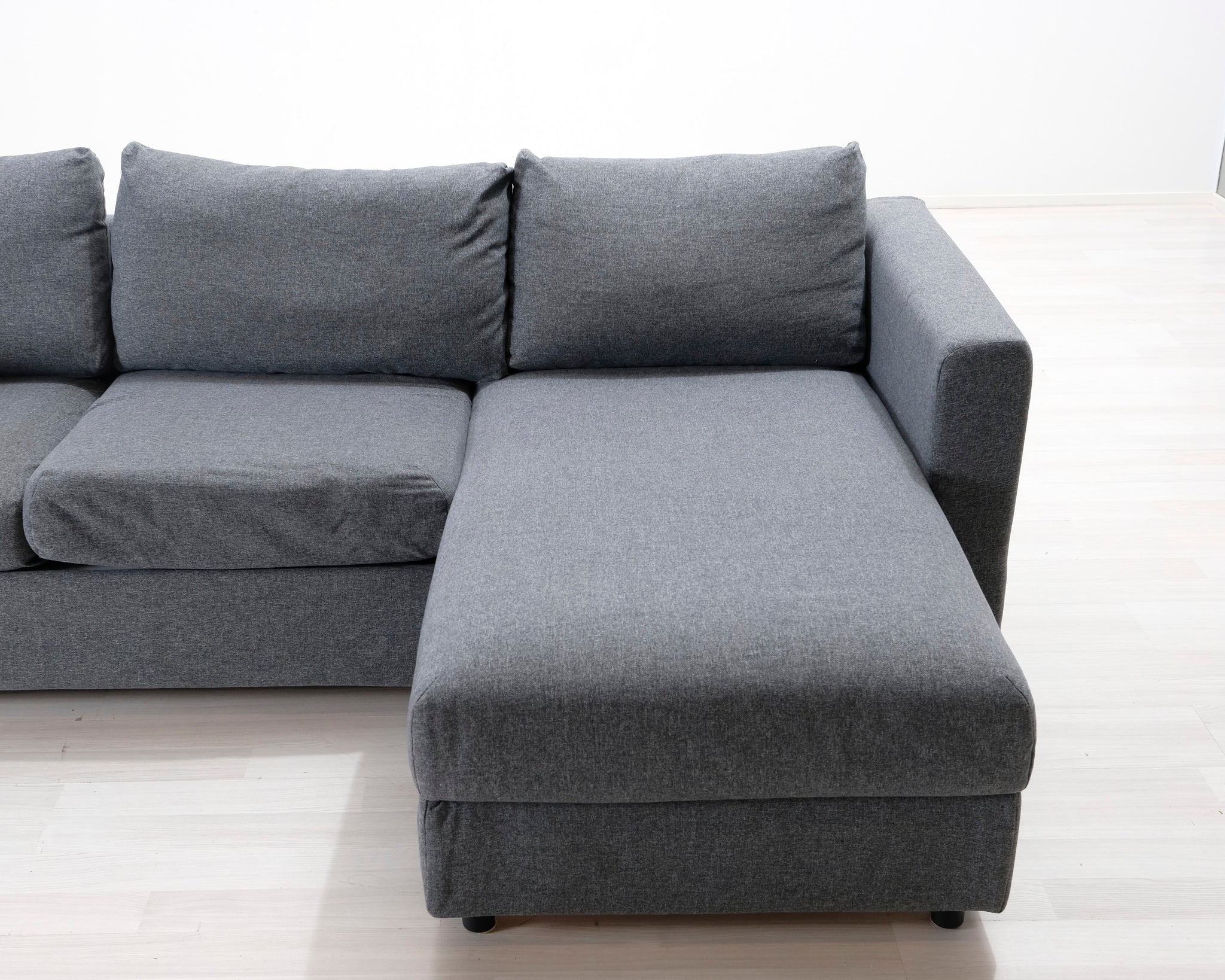Kolmenistuttava divaanisohva. Harmaa kangasverhoilu.