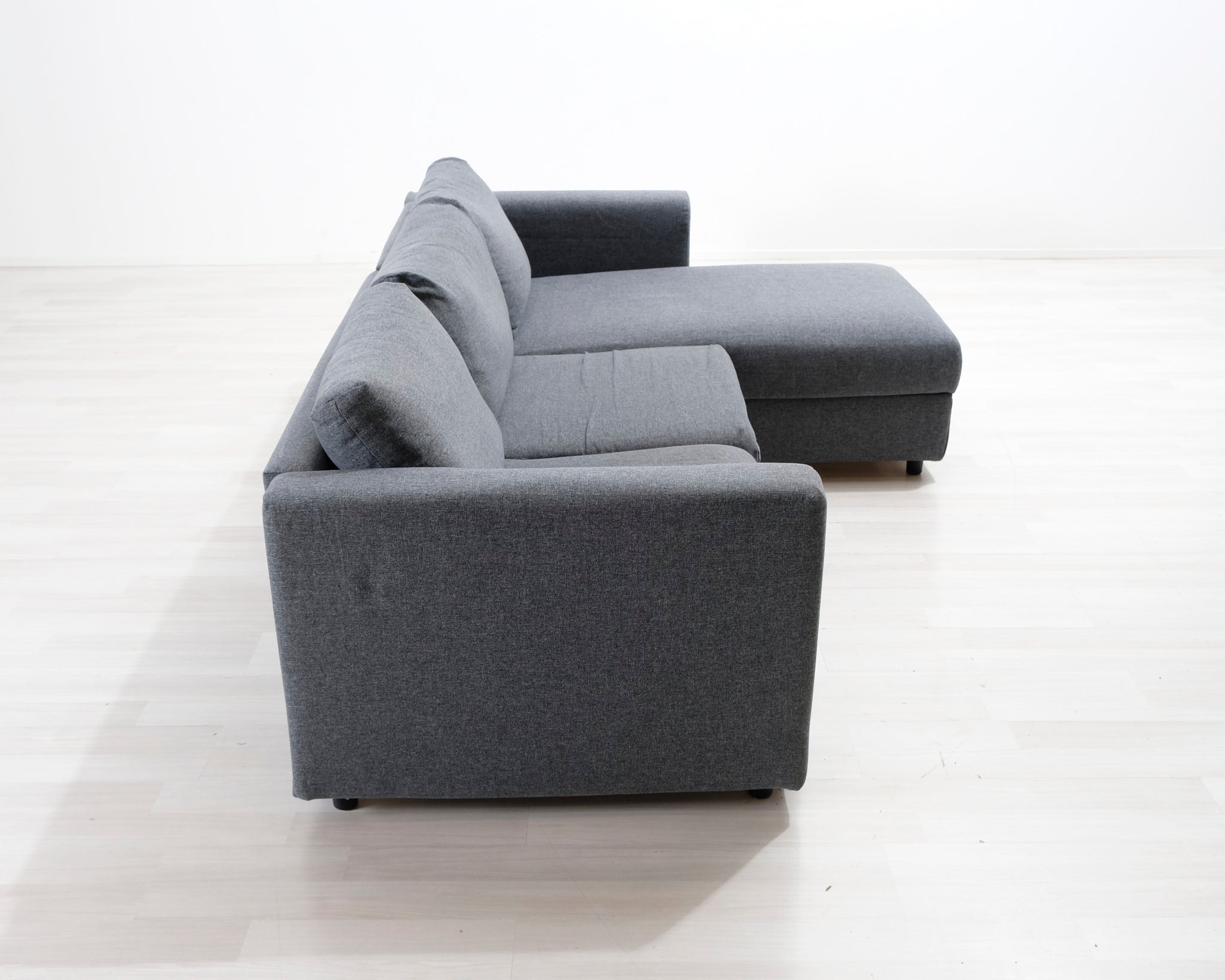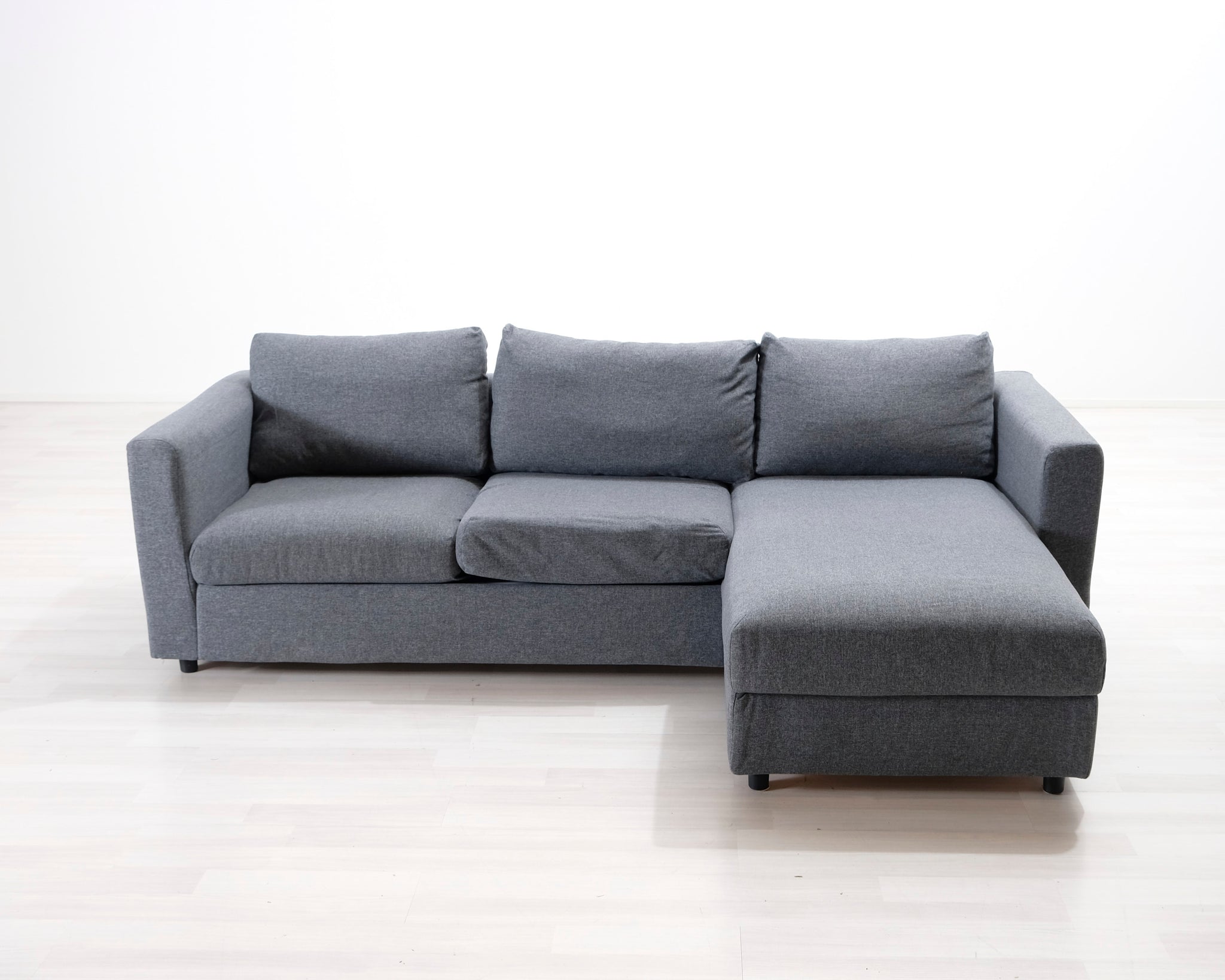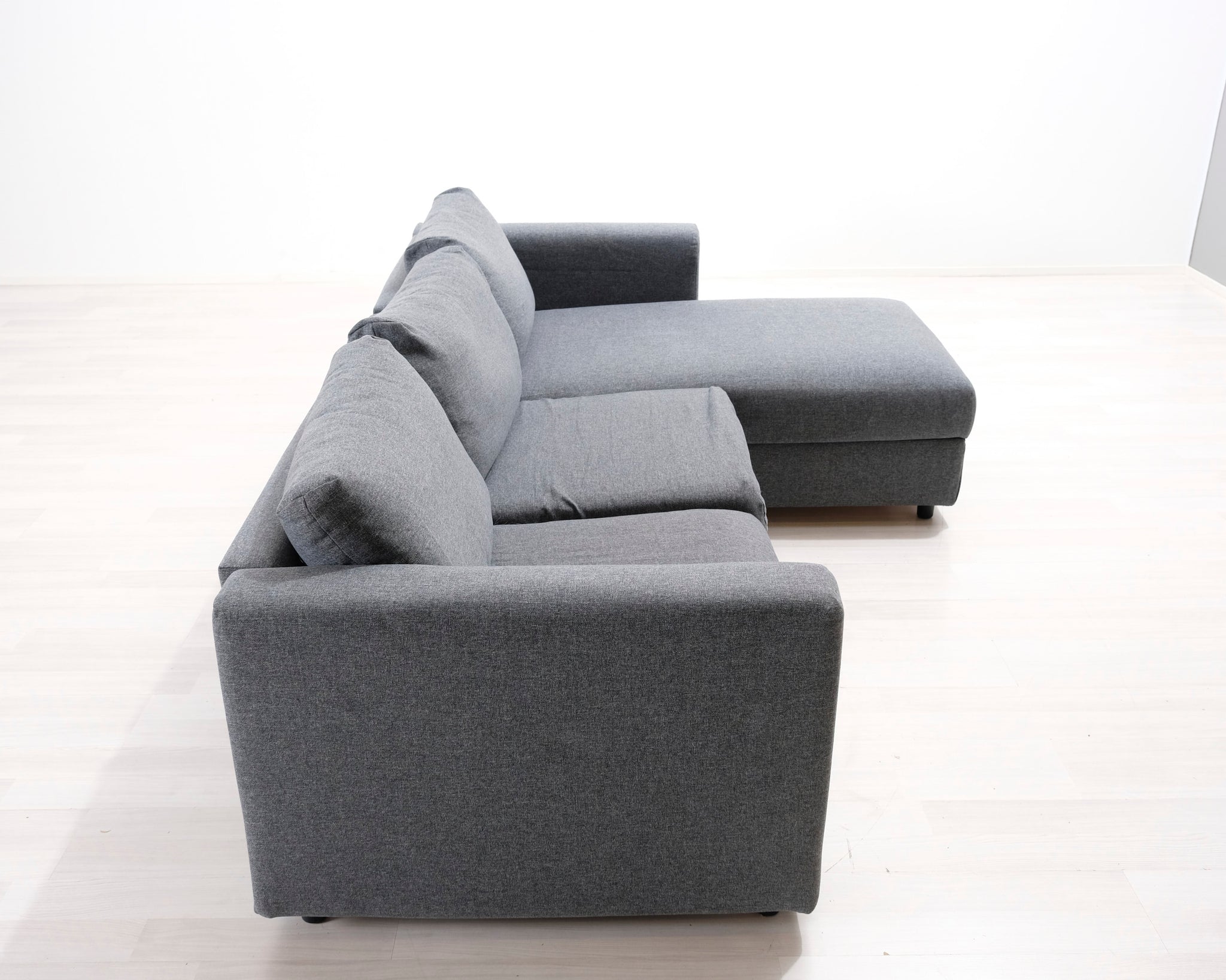 Kolmenistuttava divaanisohva. Harmaa kangasverhoilu.