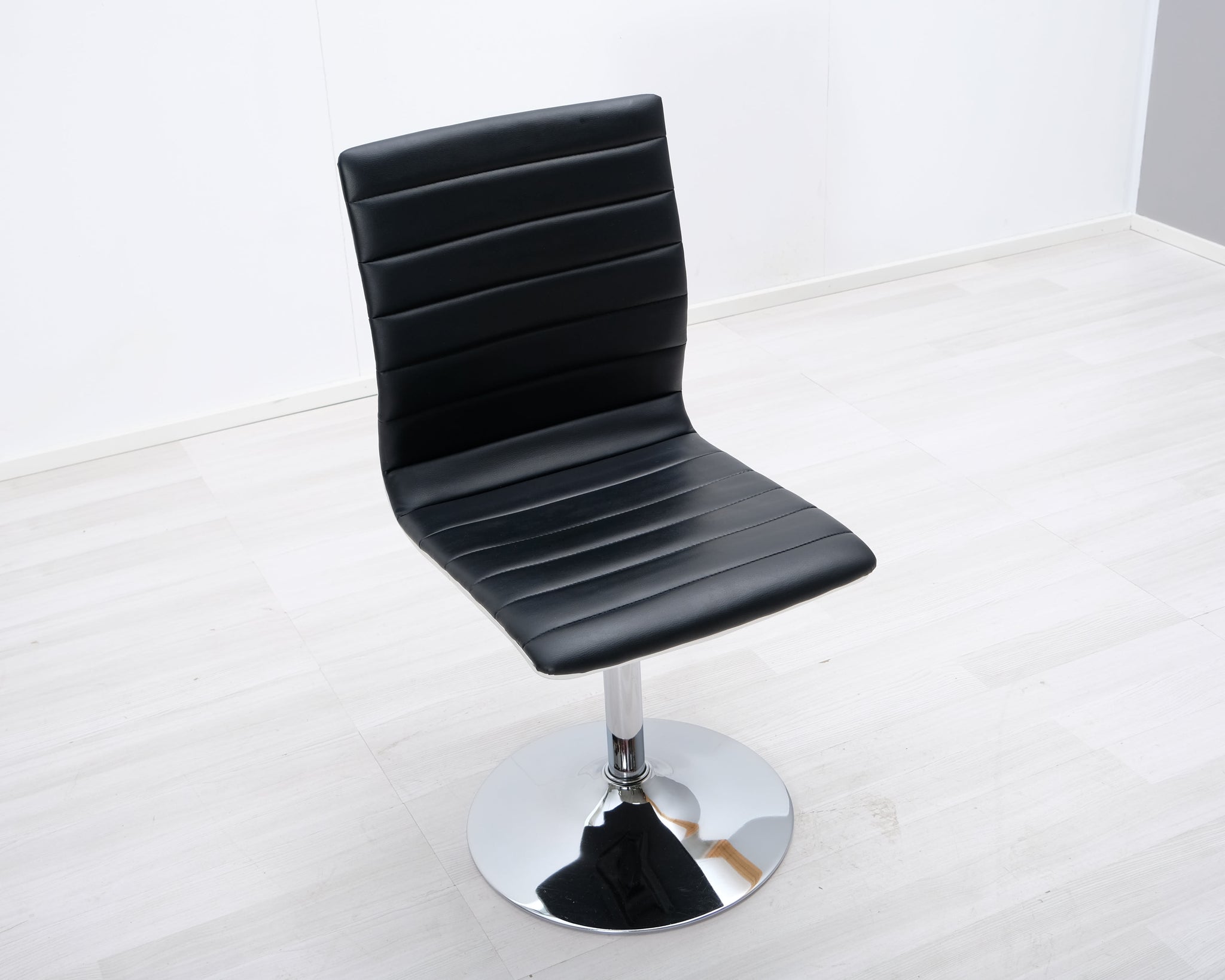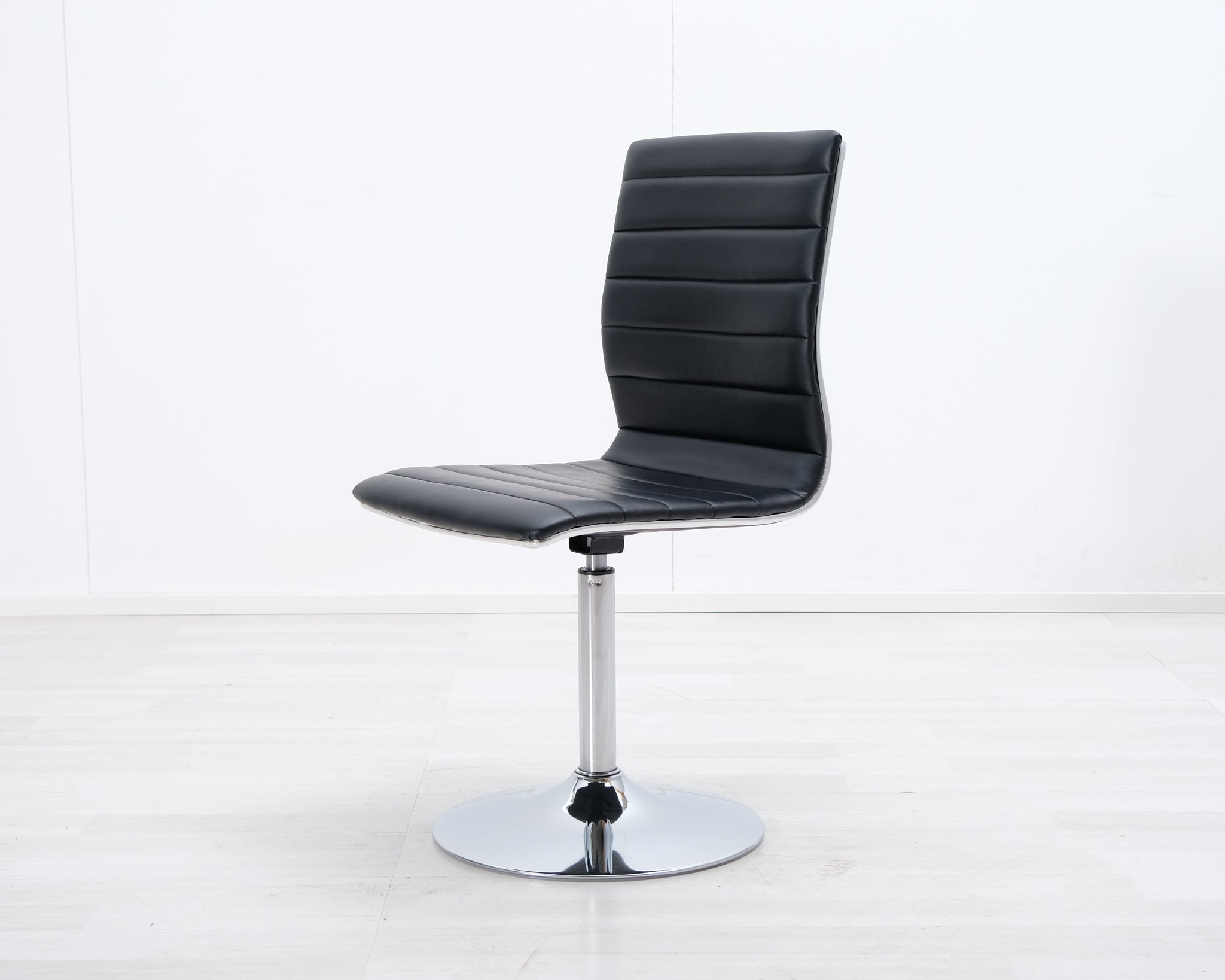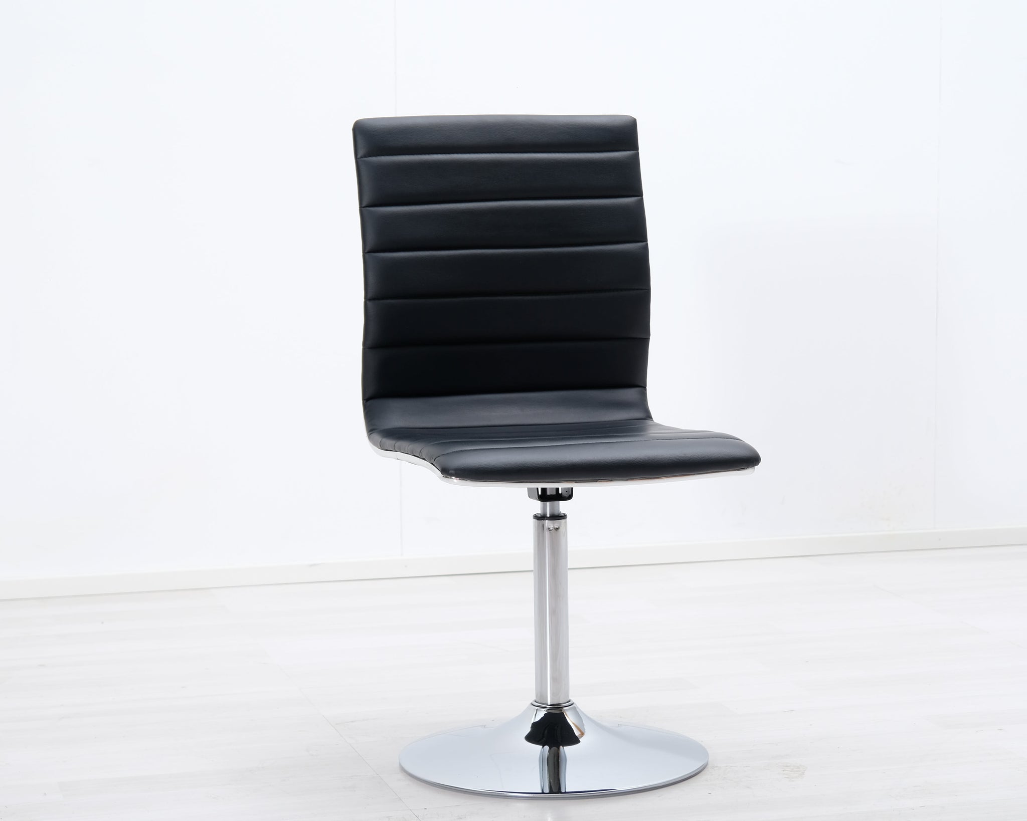 Pyörivä ruokatuoli mustalla keinonahkaistuimella. Metallinen laippajalka.