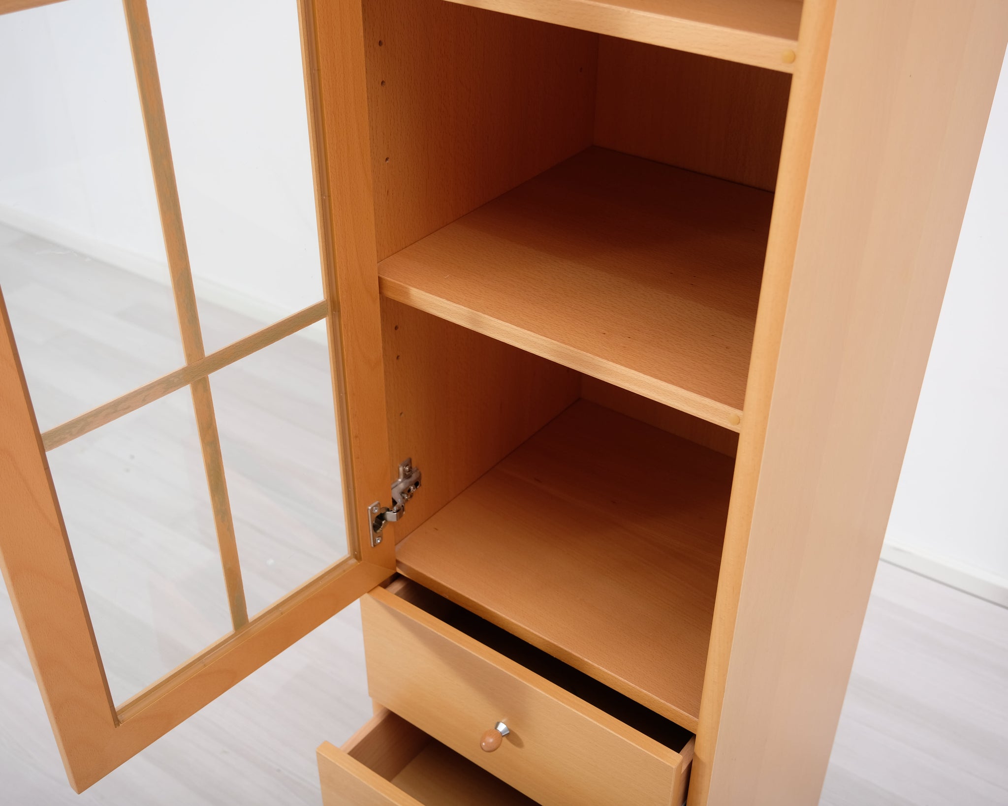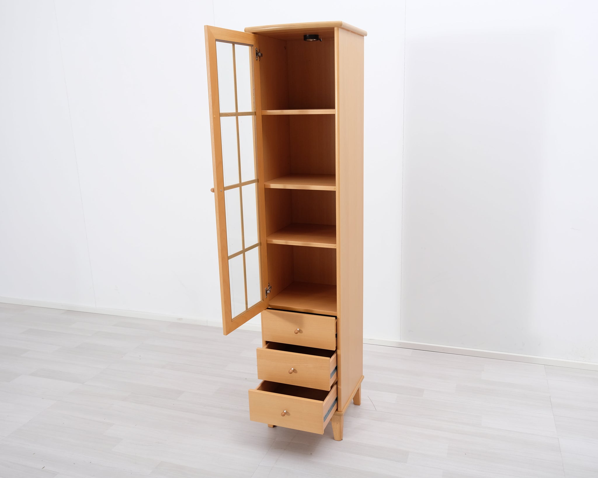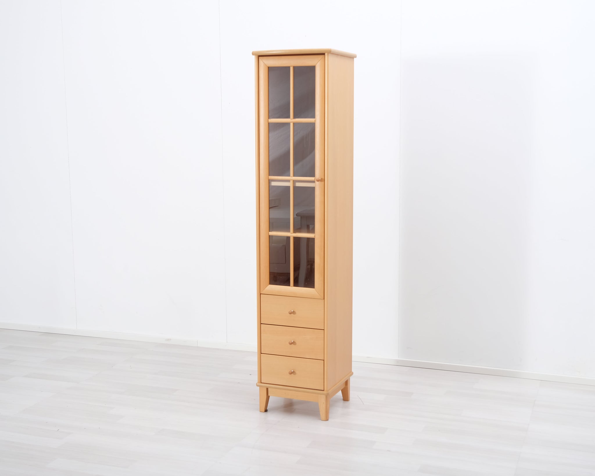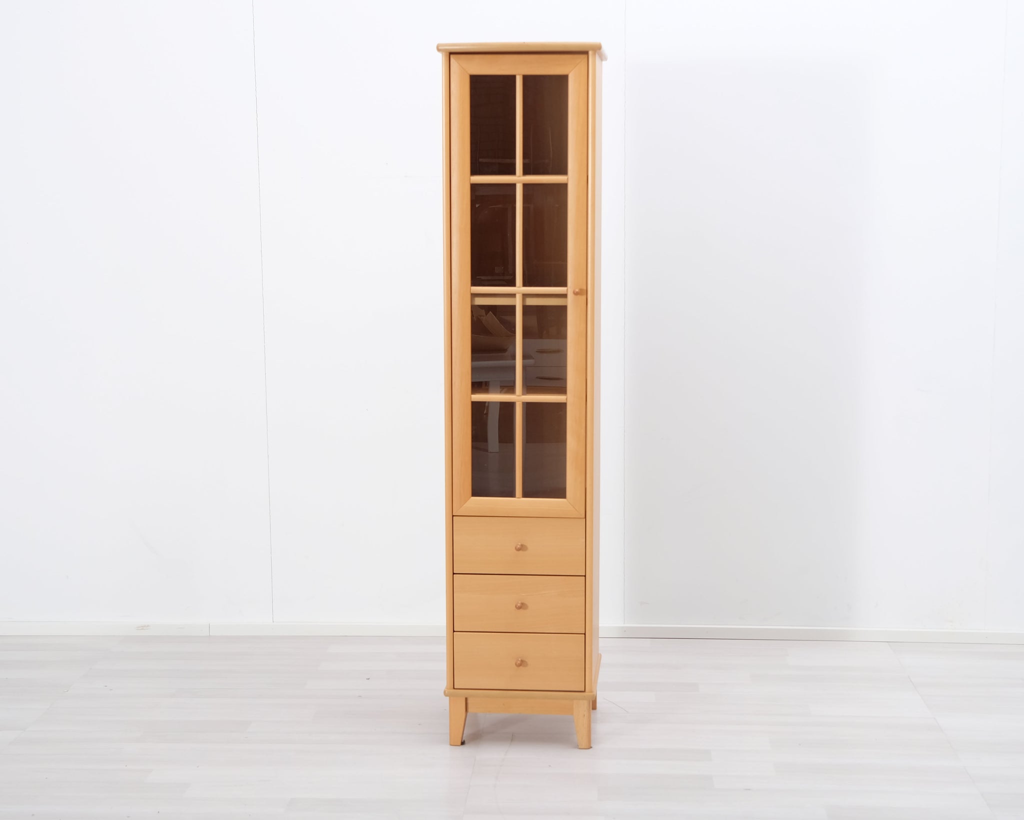Askon valmistama kapea vitriinikaappi. Alaosassa kolme vetolaatikkoa. Lasioven taakse saat laitettua esille kauneimmat astiat ja koriste-esineet.