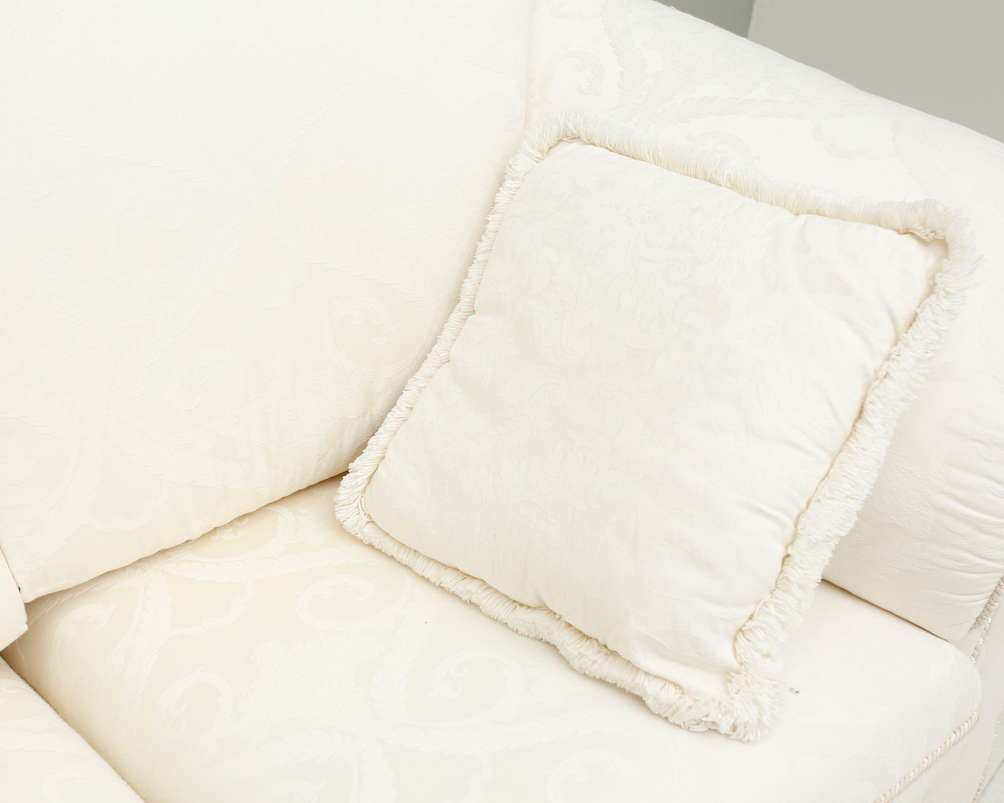 Tässä kirkkaanvalkoisessa kangassohvassa on hillitty, vaalea kukkakuvio. Katso myös yhteensopiva [3-istuttava sohva](/products/6857) ja tilaa itsellesi koko kokonaisuus!