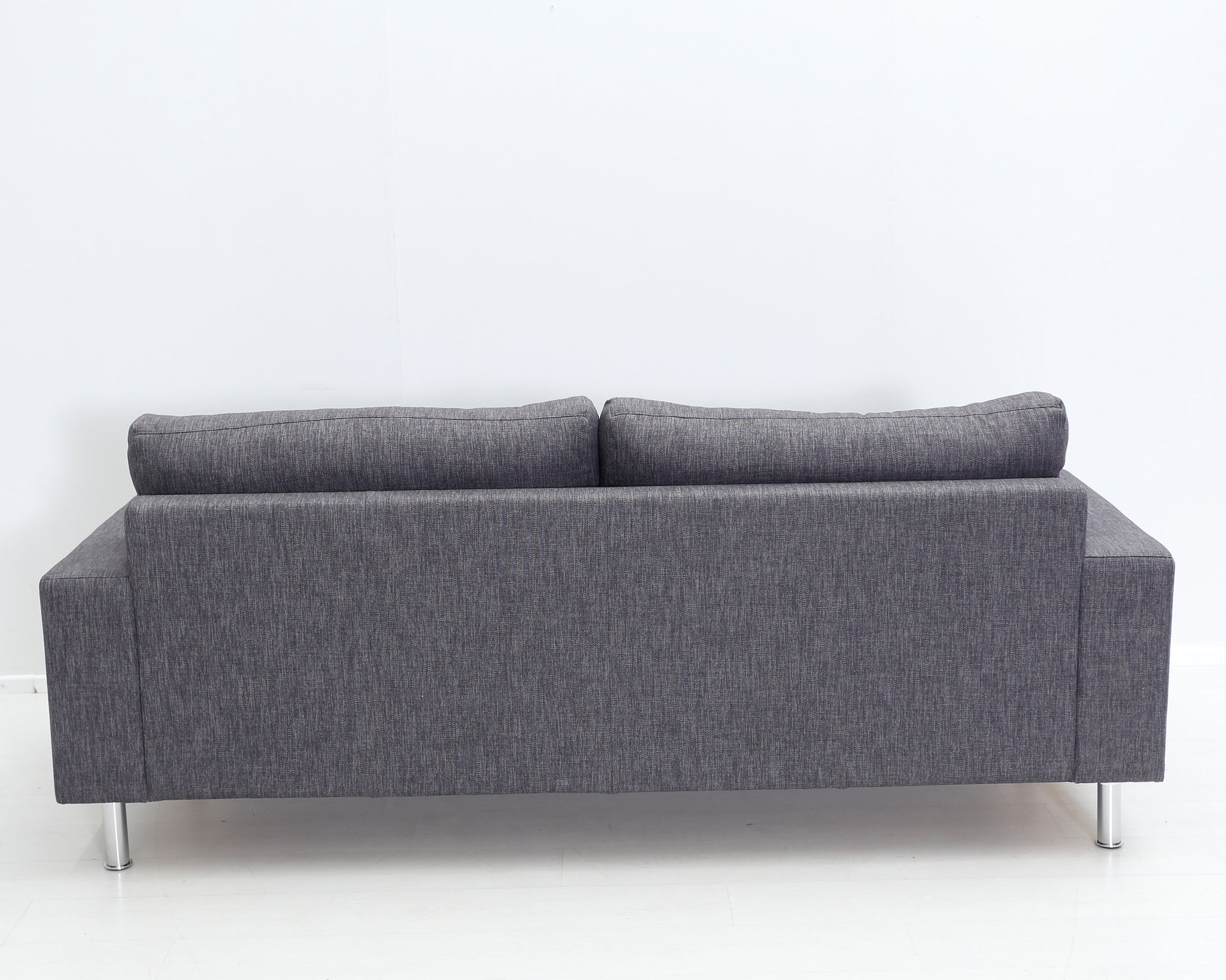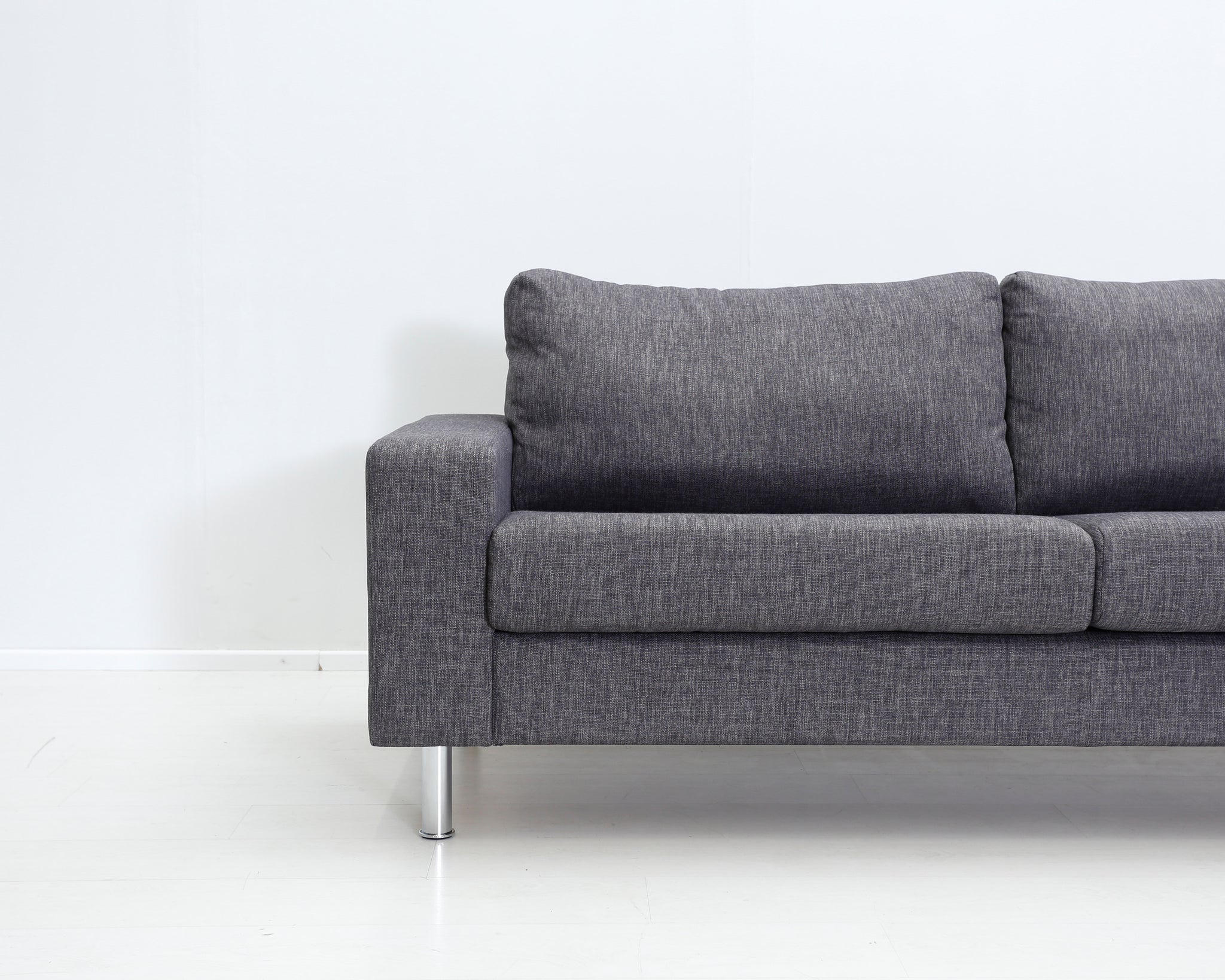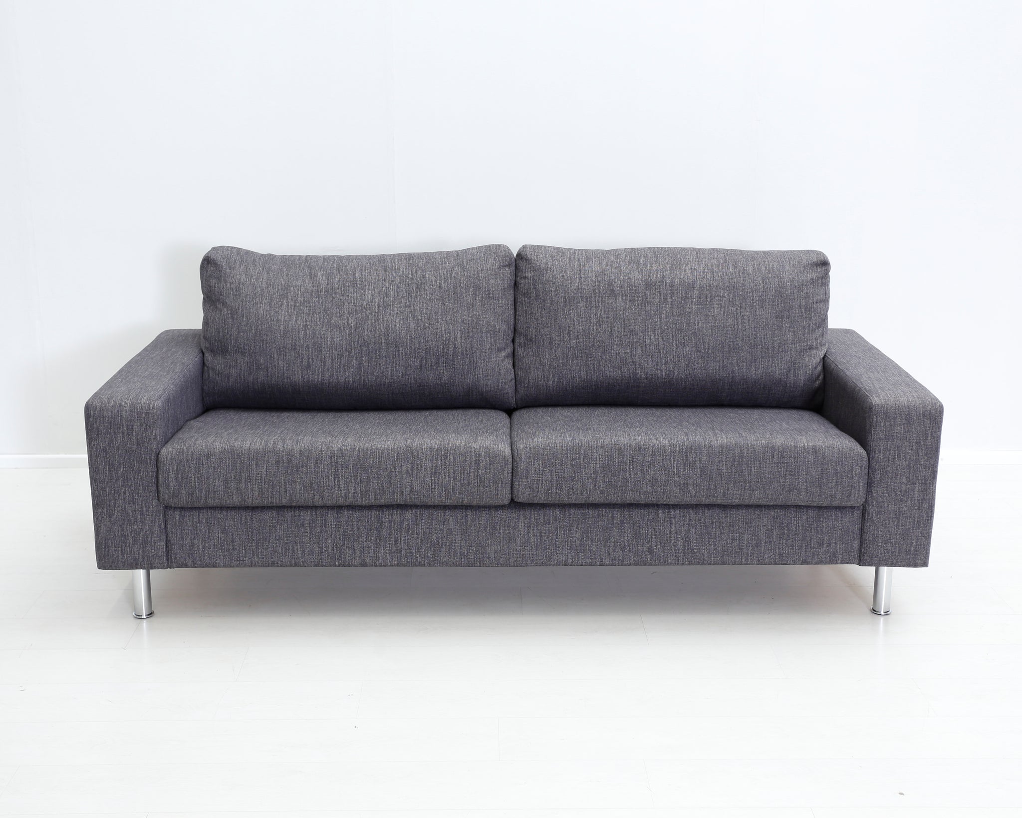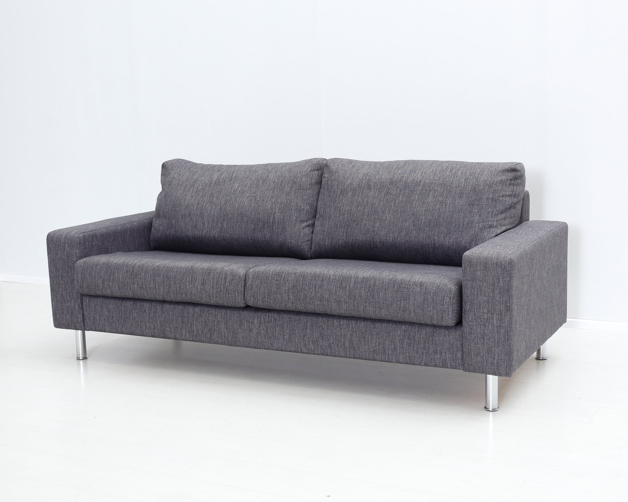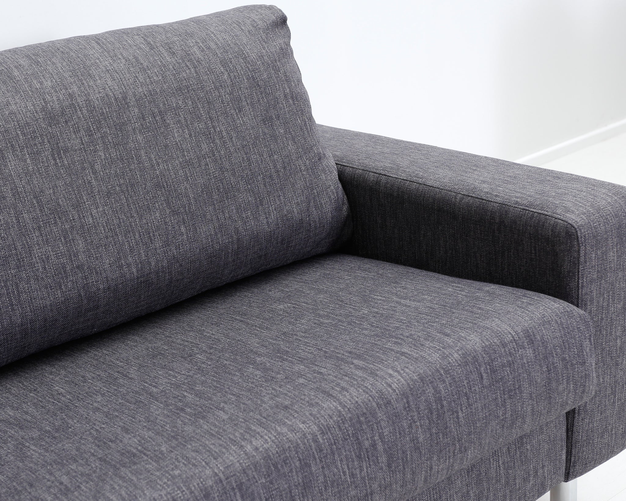 Pieni ja siro kangassohva reilulla maavaralla. Korkeat jalat helpottavat siivoamista sohvan alta. Harmaa väri on helppo yhdistää moneen kotiin.