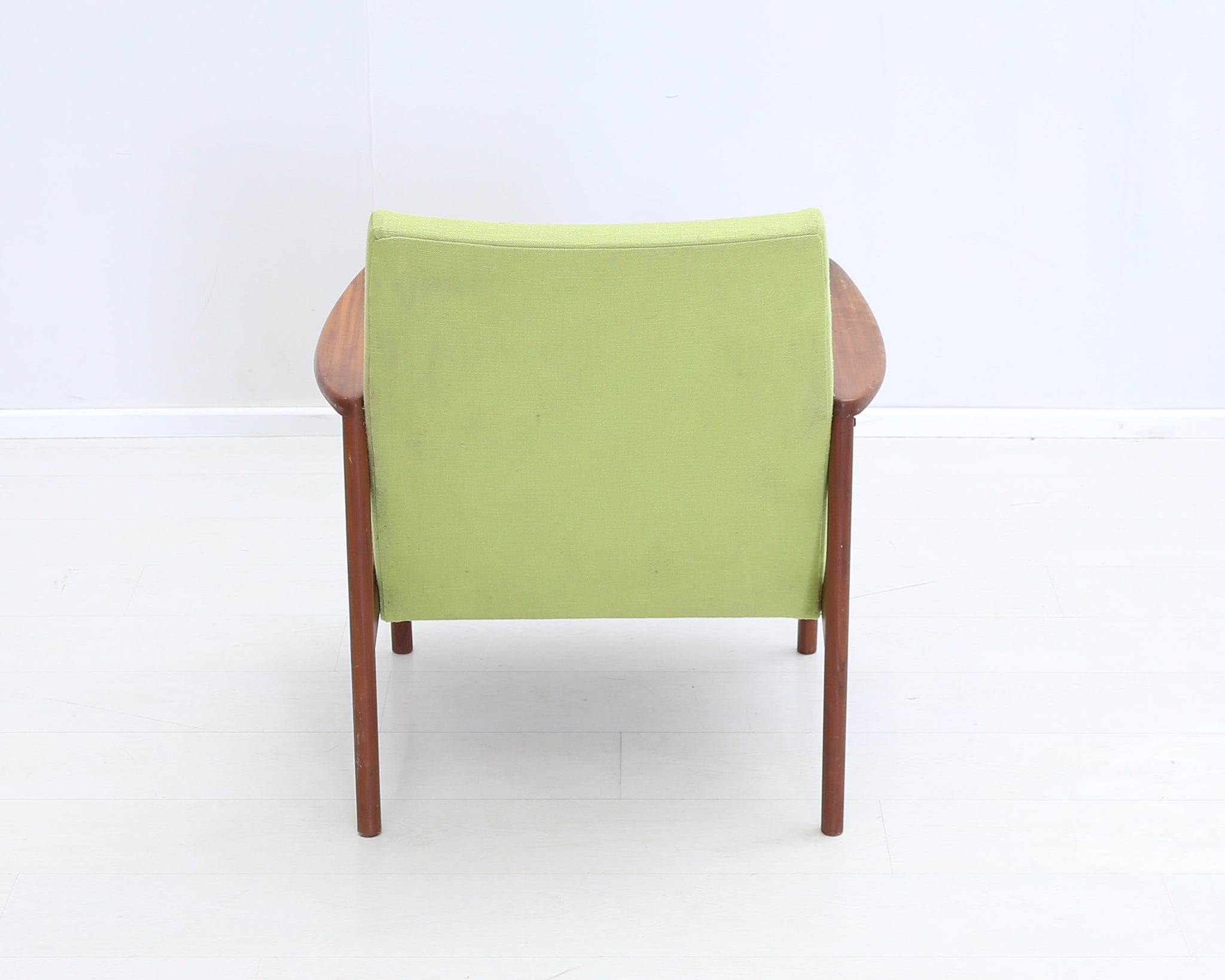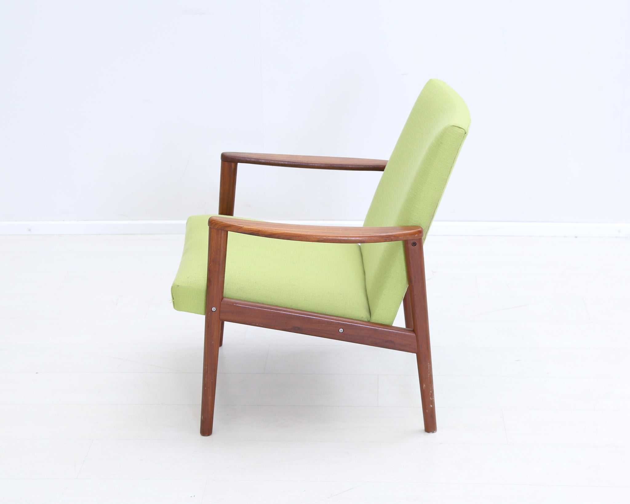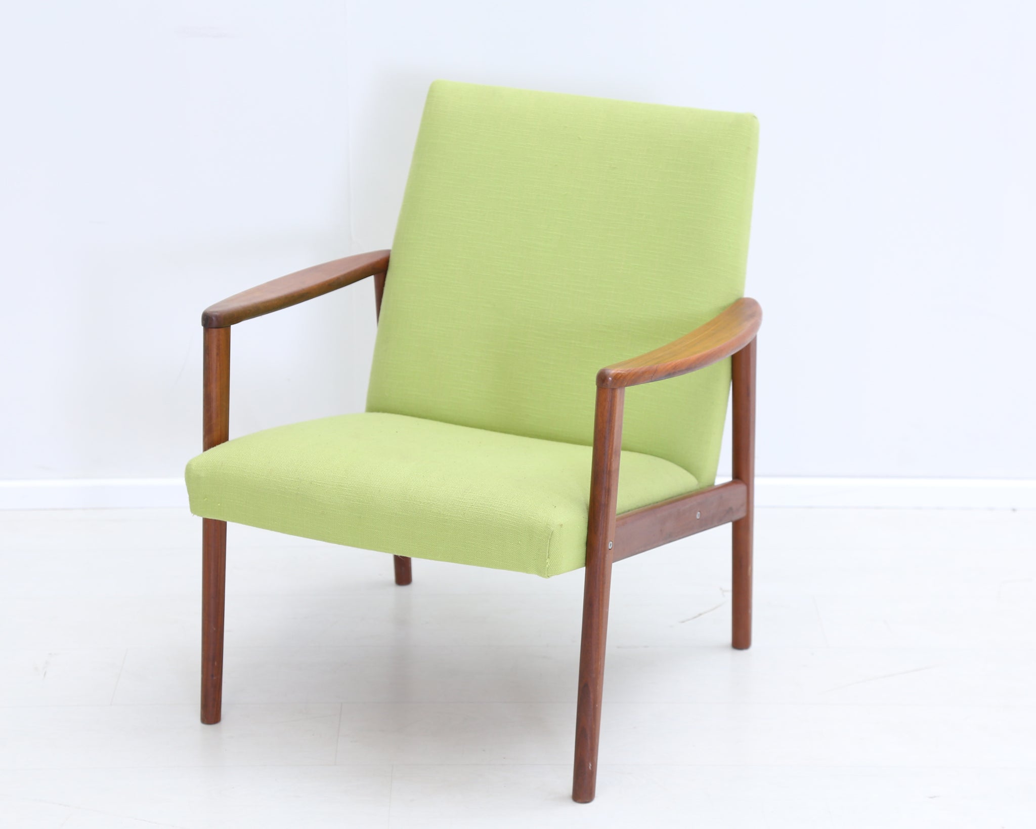 60-luvun henkeä huokuva nojatuoli, jossa sirot puiset käsinojat. Pirteä vihreä verhoilu tuo väriä tilaan.