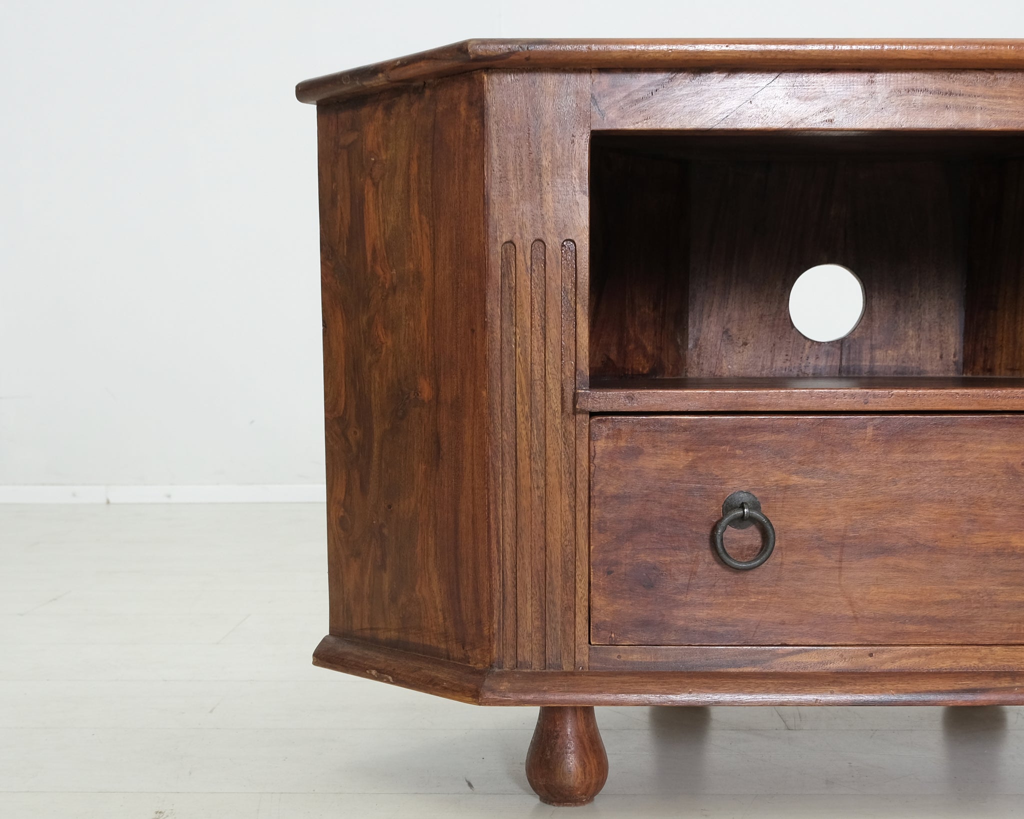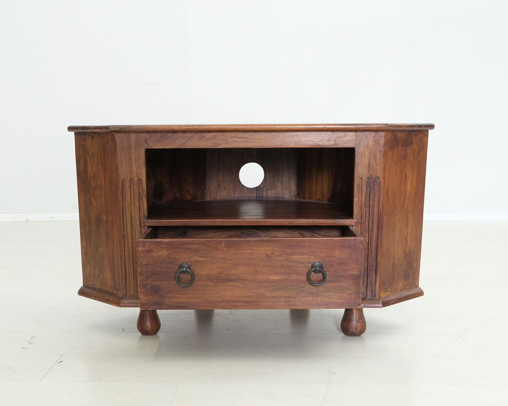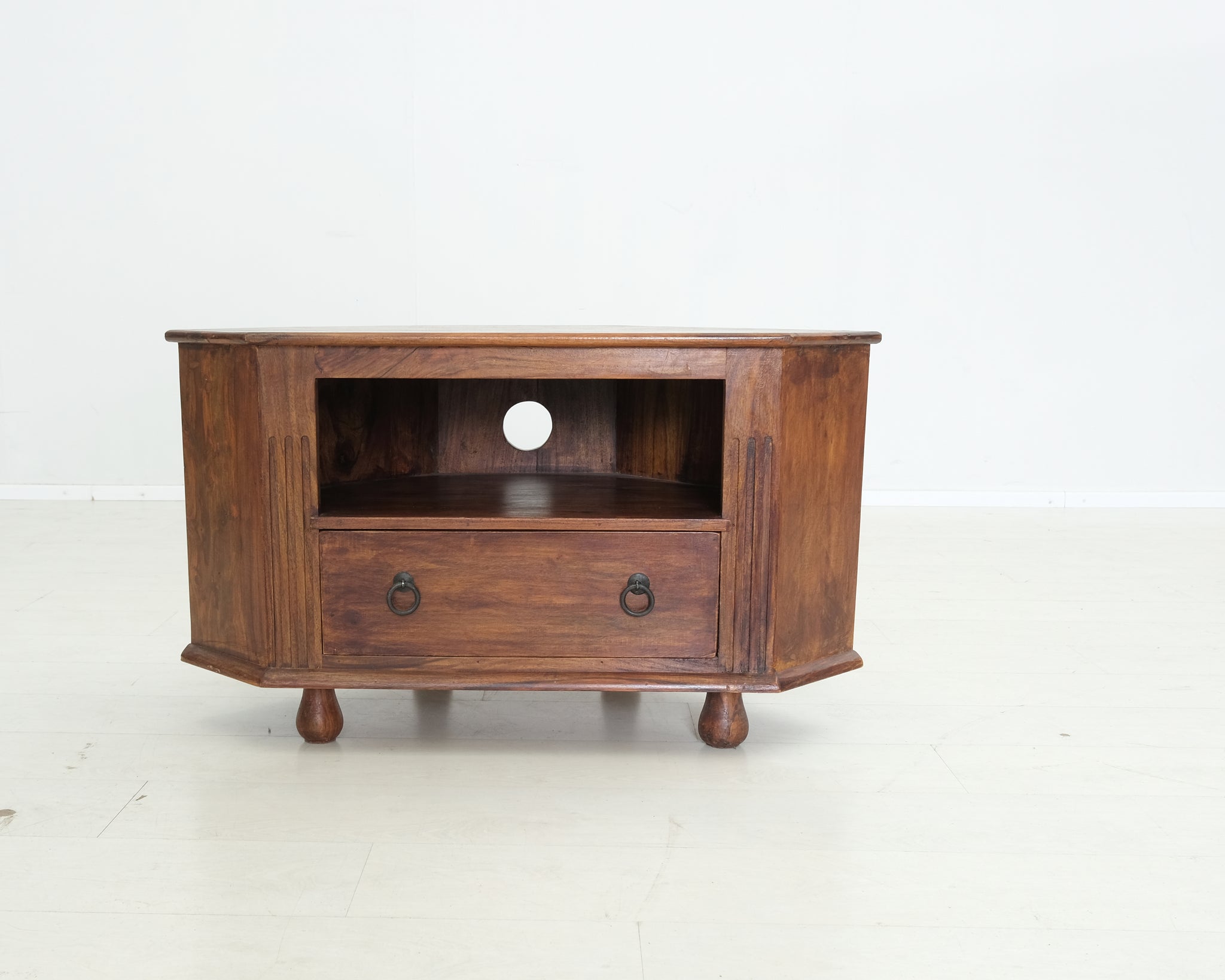 Acazian kalusteet valmistetaan nimensä mukaisesti akaasiapuusta, jolla on materiaalina luonnostaan tunnistettava ilme. Tason takaosassa reikä, josta saat pujotettua johdot medialaitteille.