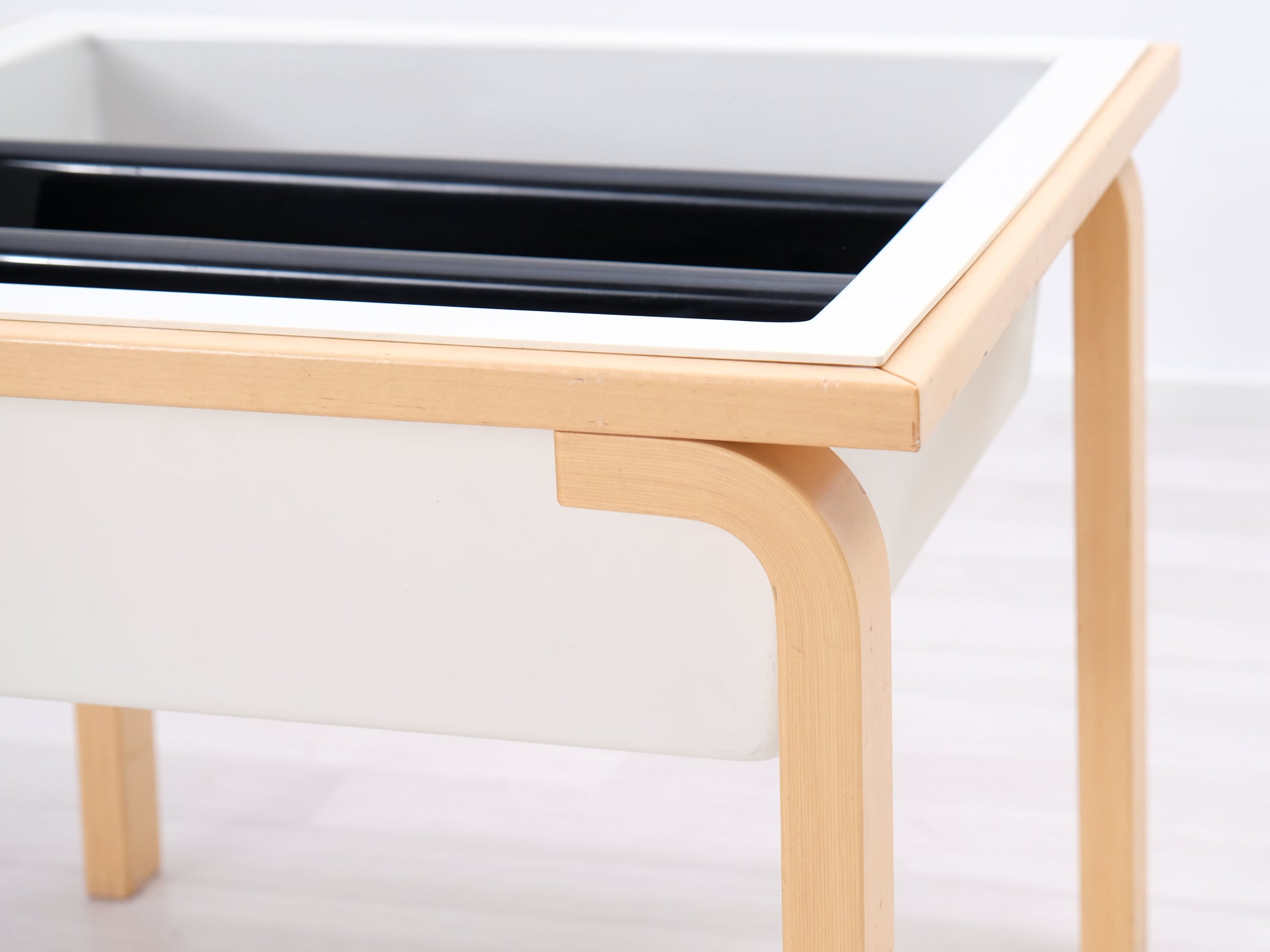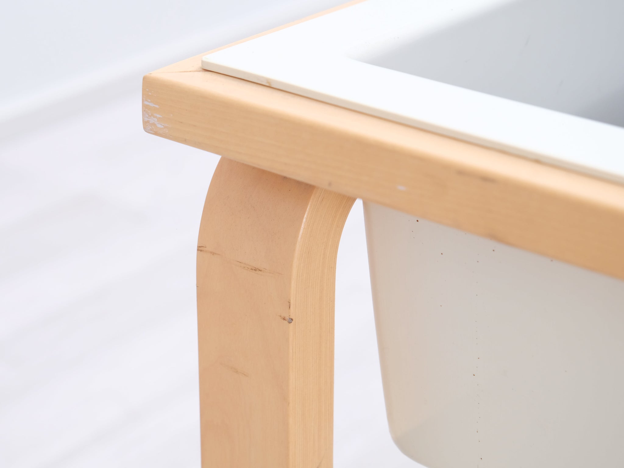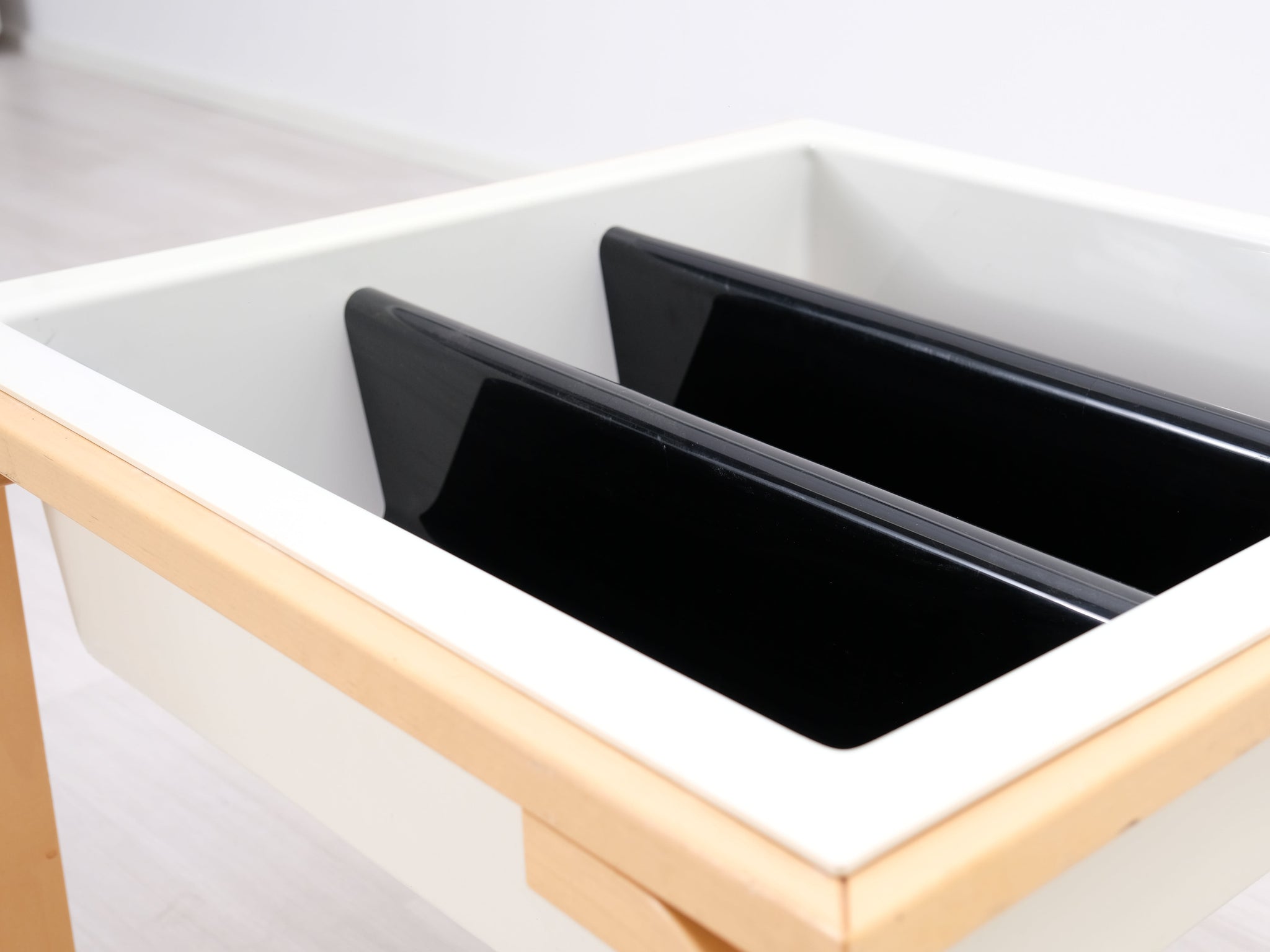 Korotettu lehtiteline. Telineen runko on valmistettu koivusta ja laatikko valkoista muovia. Lehtiä ja papereita voi kätevästi asetella kolmeen lokeroon.