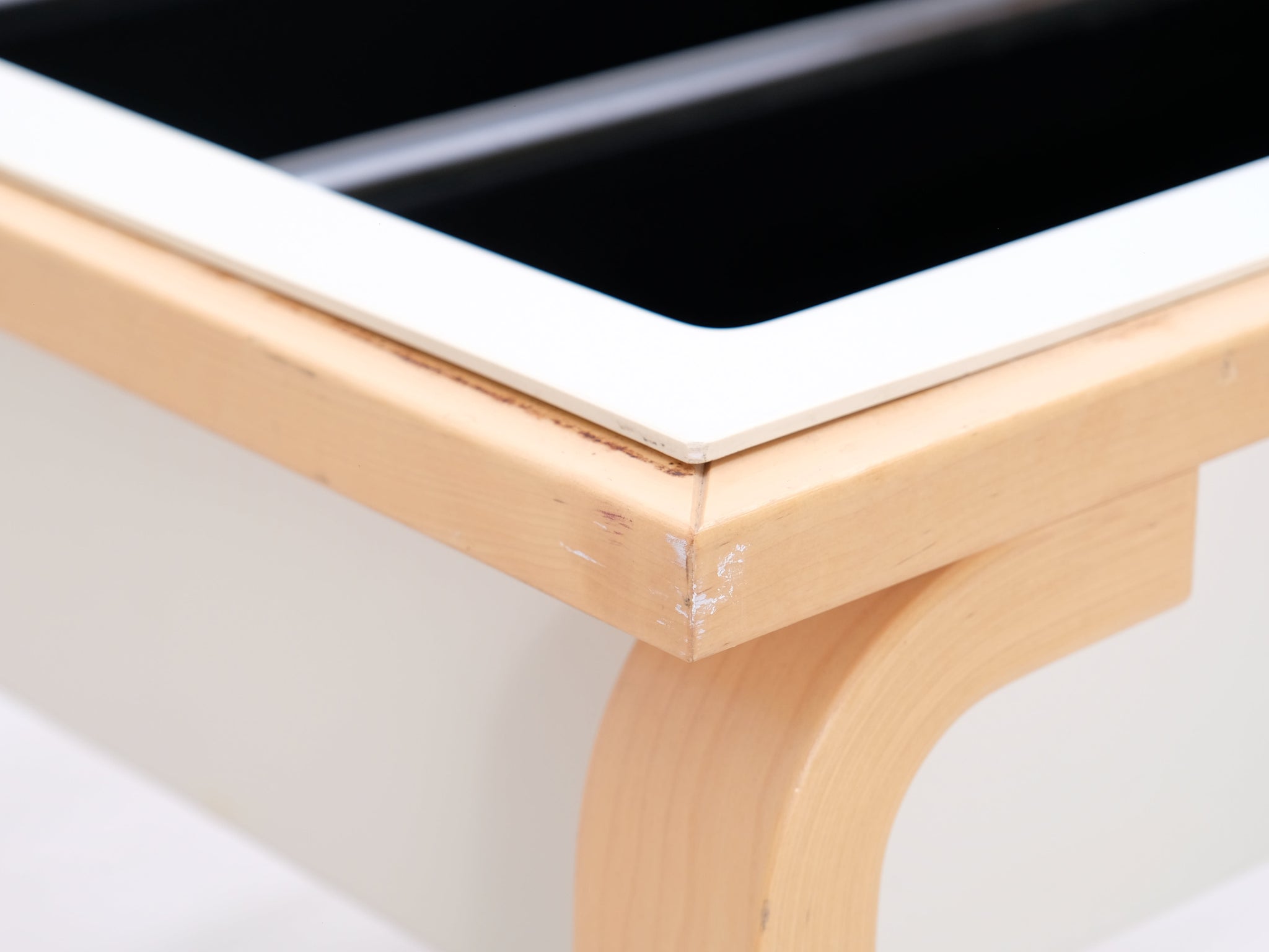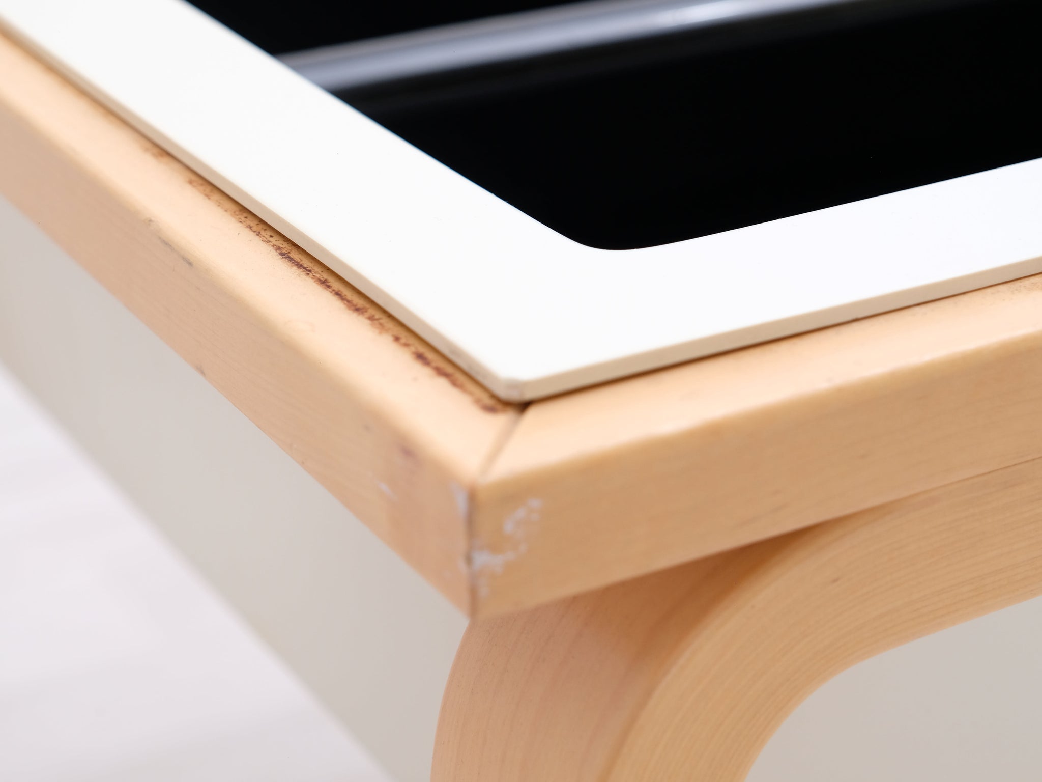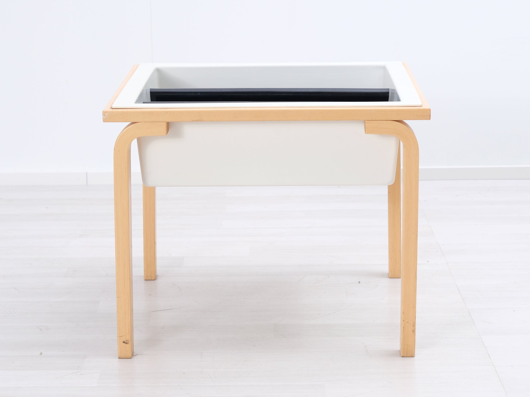 Korotettu lehtiteline. Telineen runko on valmistettu koivusta ja laatikko valkoista muovia. Lehtiä ja papereita voi kätevästi asetella kolmeen lokeroon.