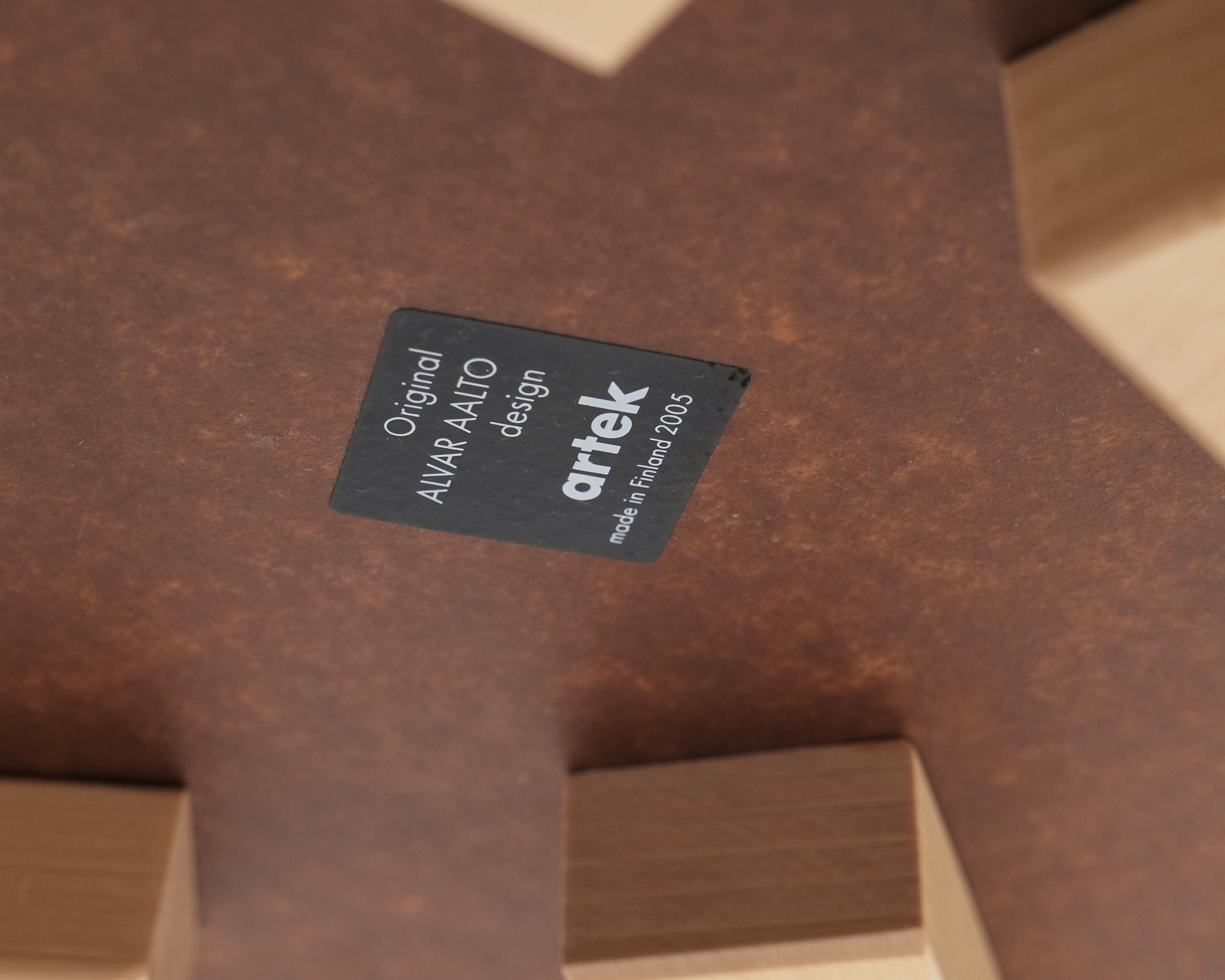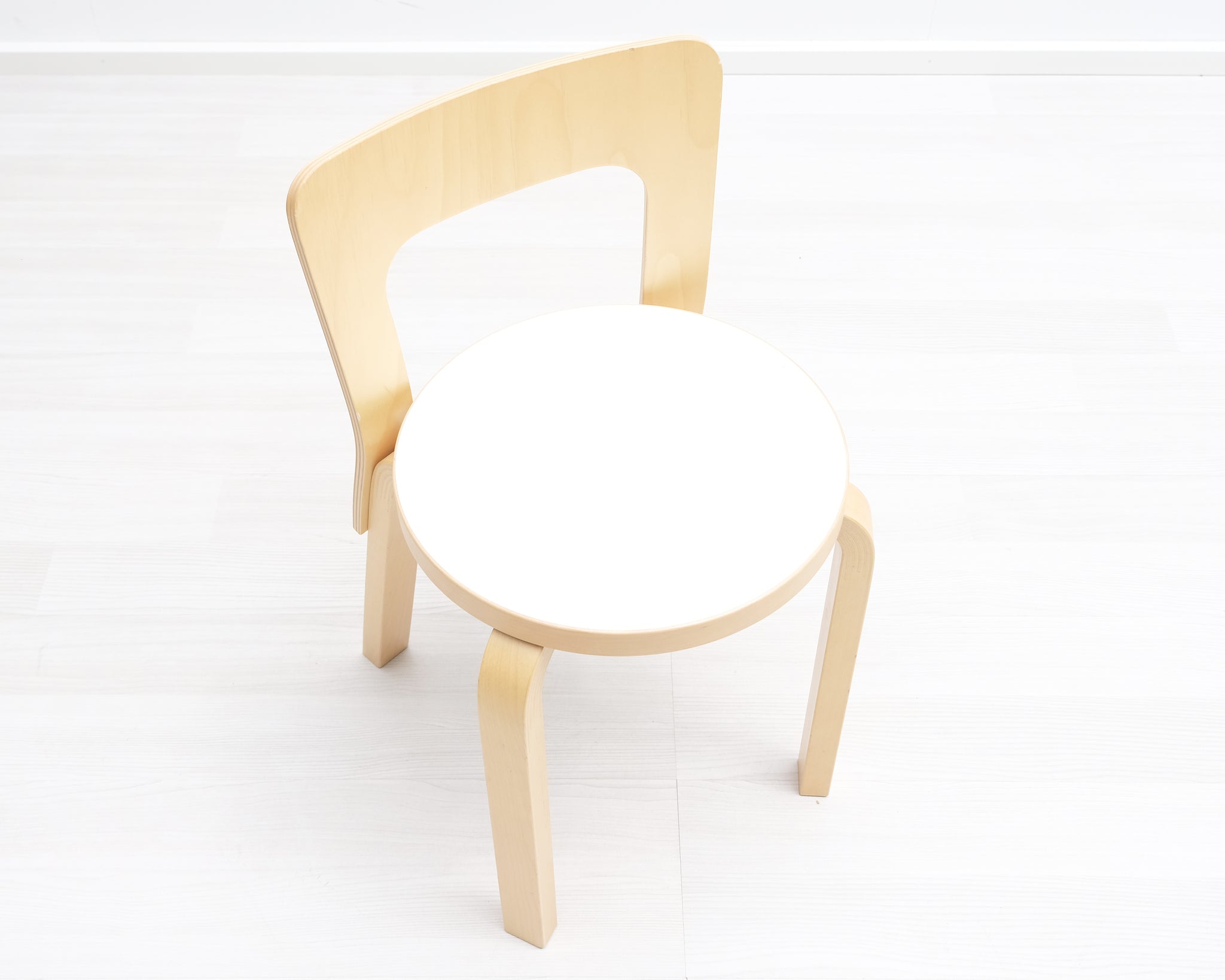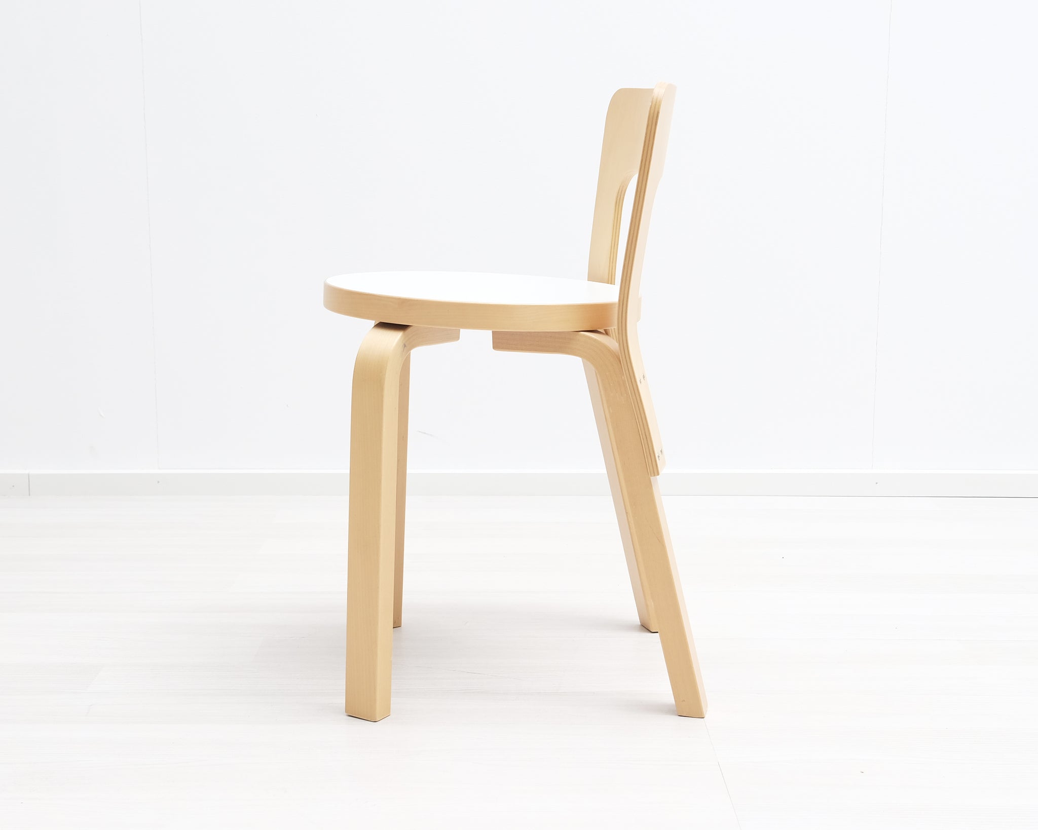 Alvar Aallon suunnittelemassa tuolissa on tunnusomaiset L-jalat. Tässä tuolissa klassinen koivun ja valkoisen laminaatin yhdistelmä.