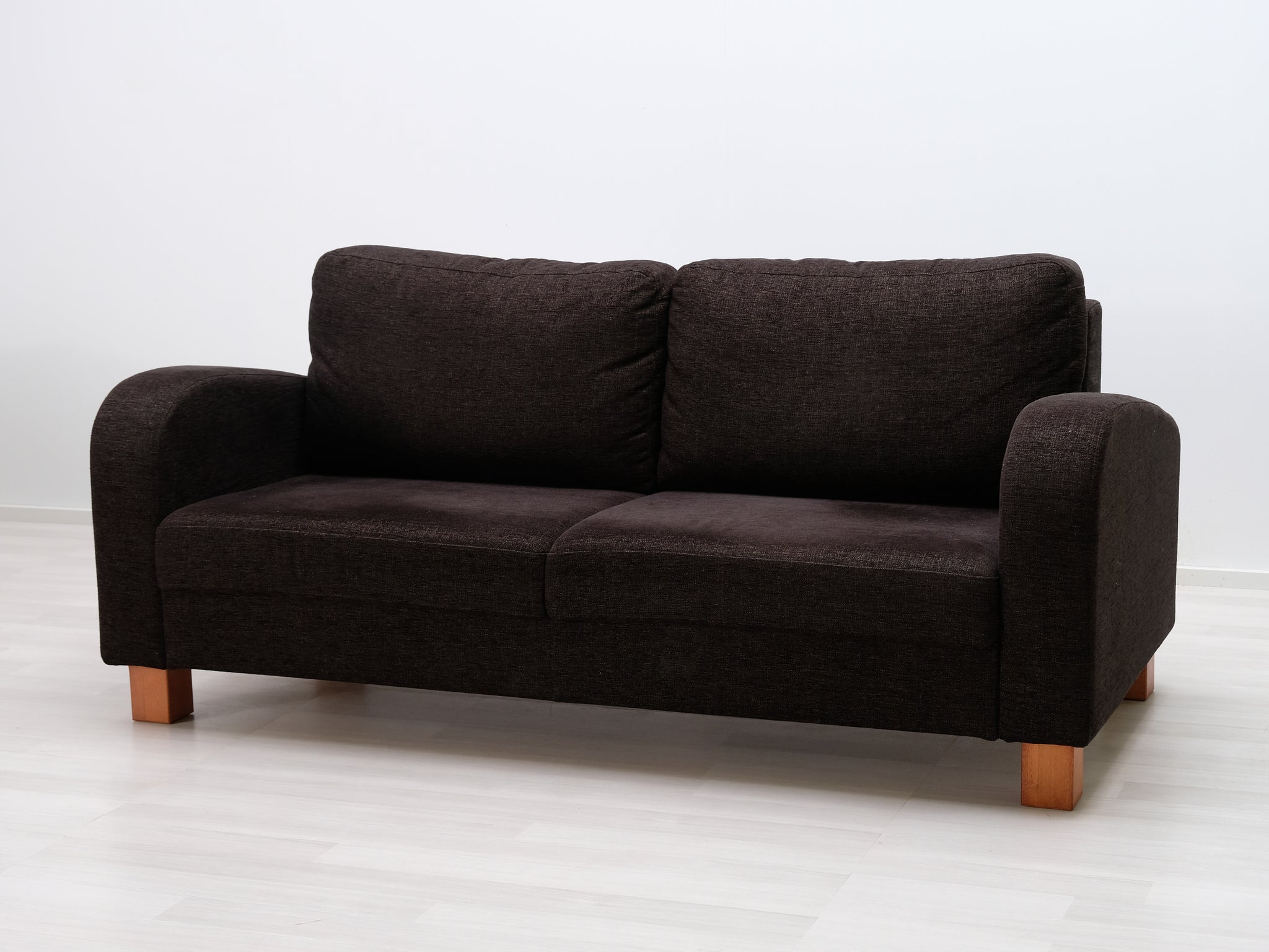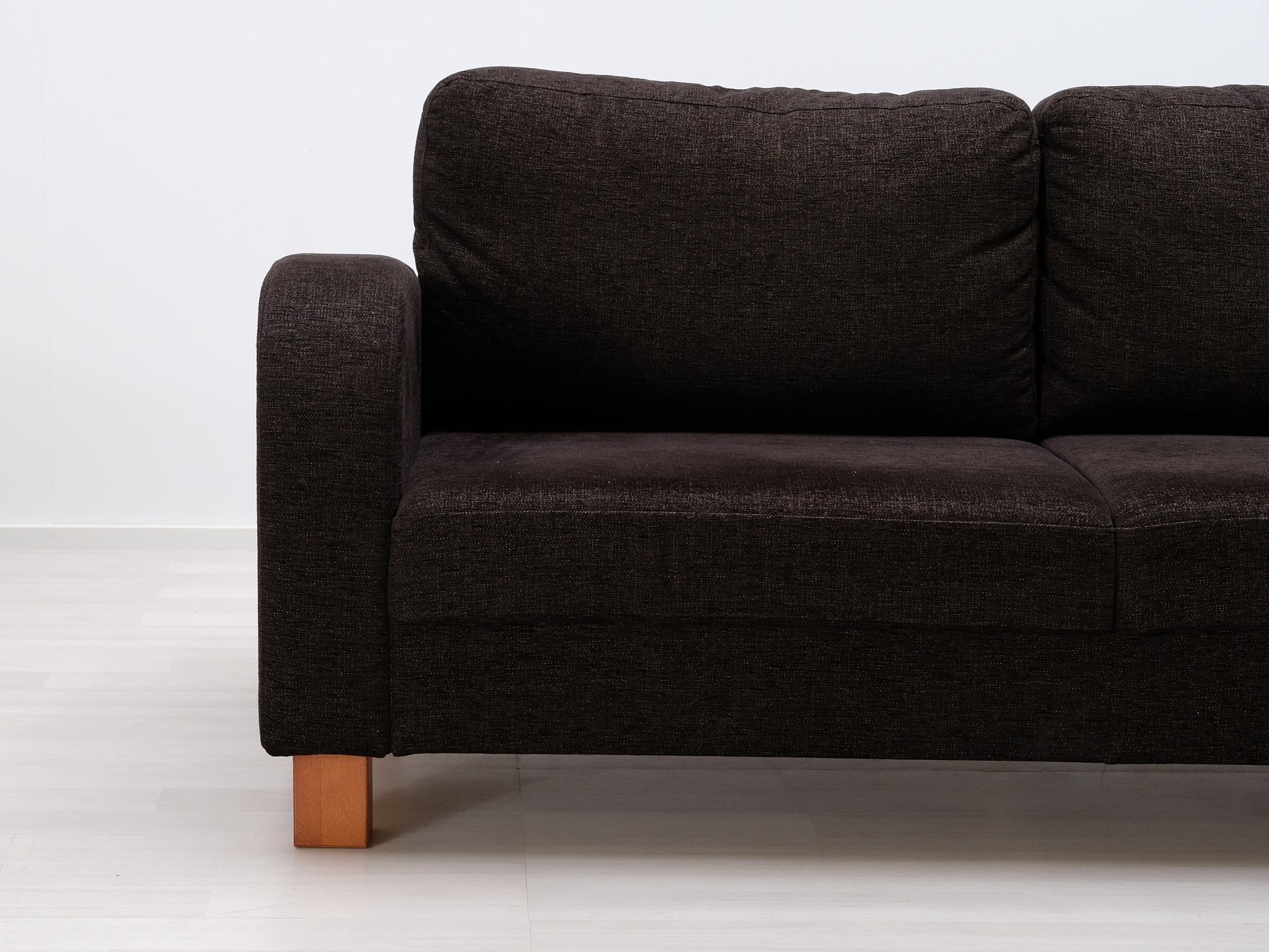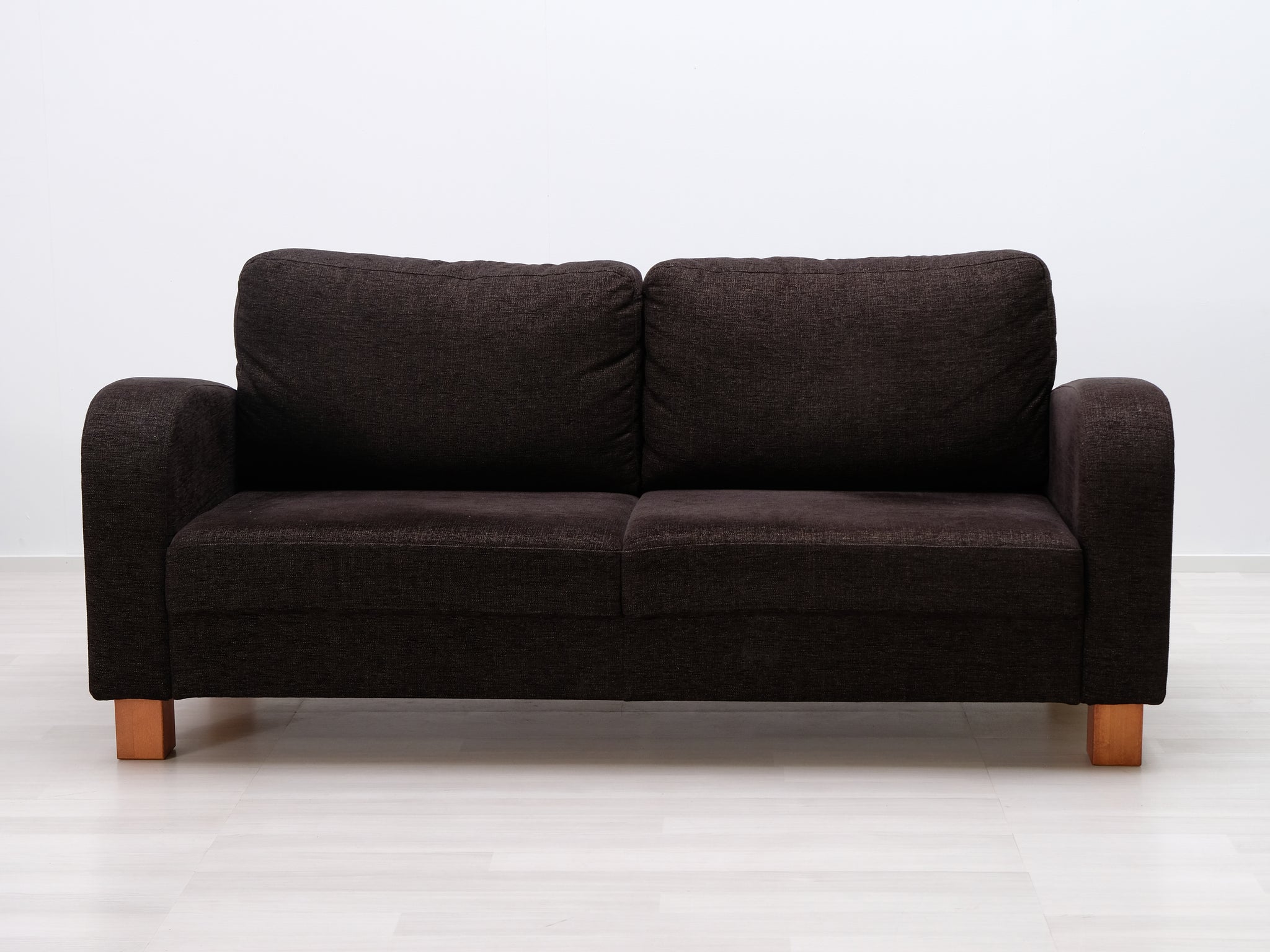 Ruskea kangassohva. Pehmeä selkämys ja istuintyynyt takaavat mainion istuvuuden. Puiset jalat korottavat sohvan ilmaan niin, että sen alta on helppo imuroida.