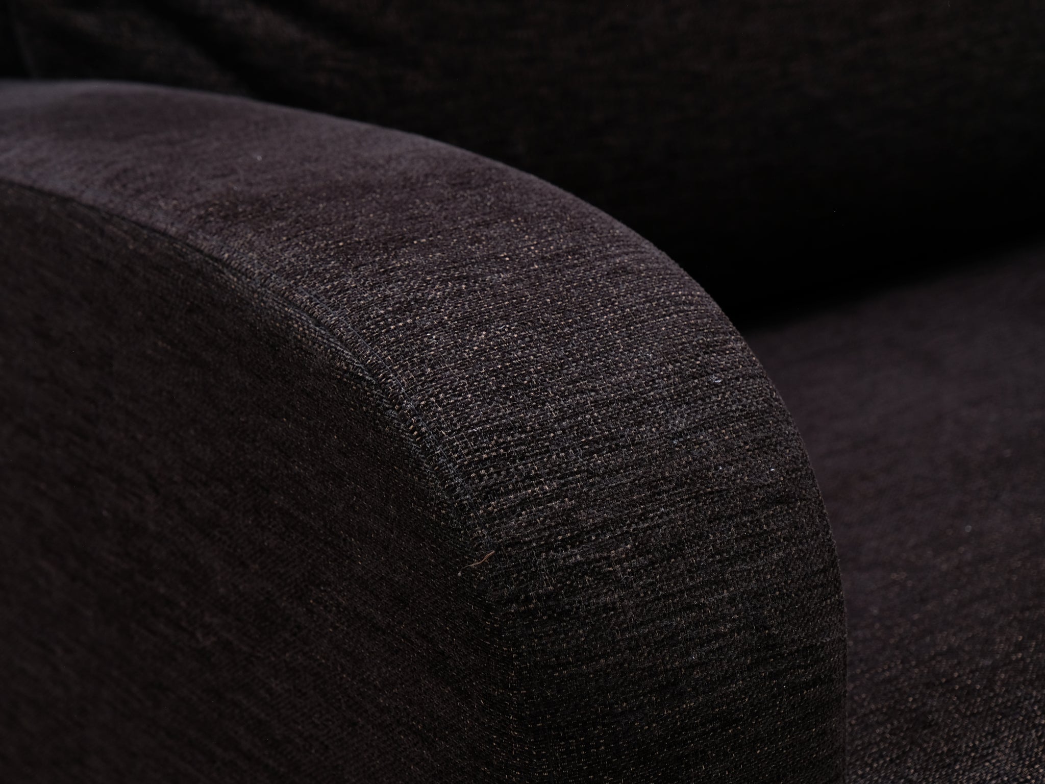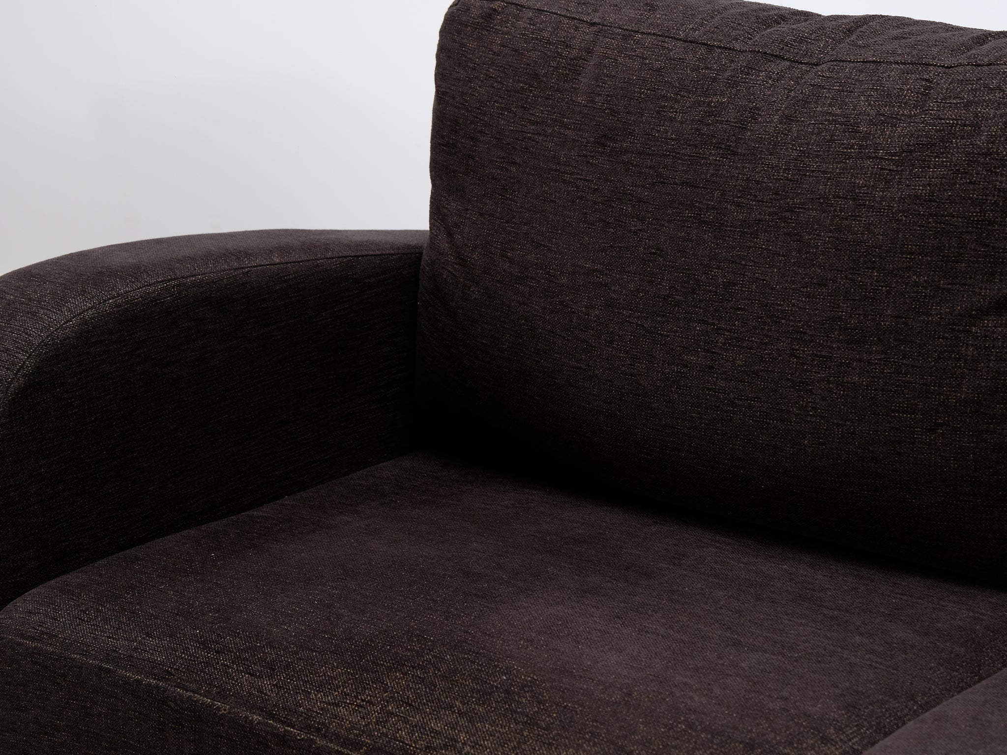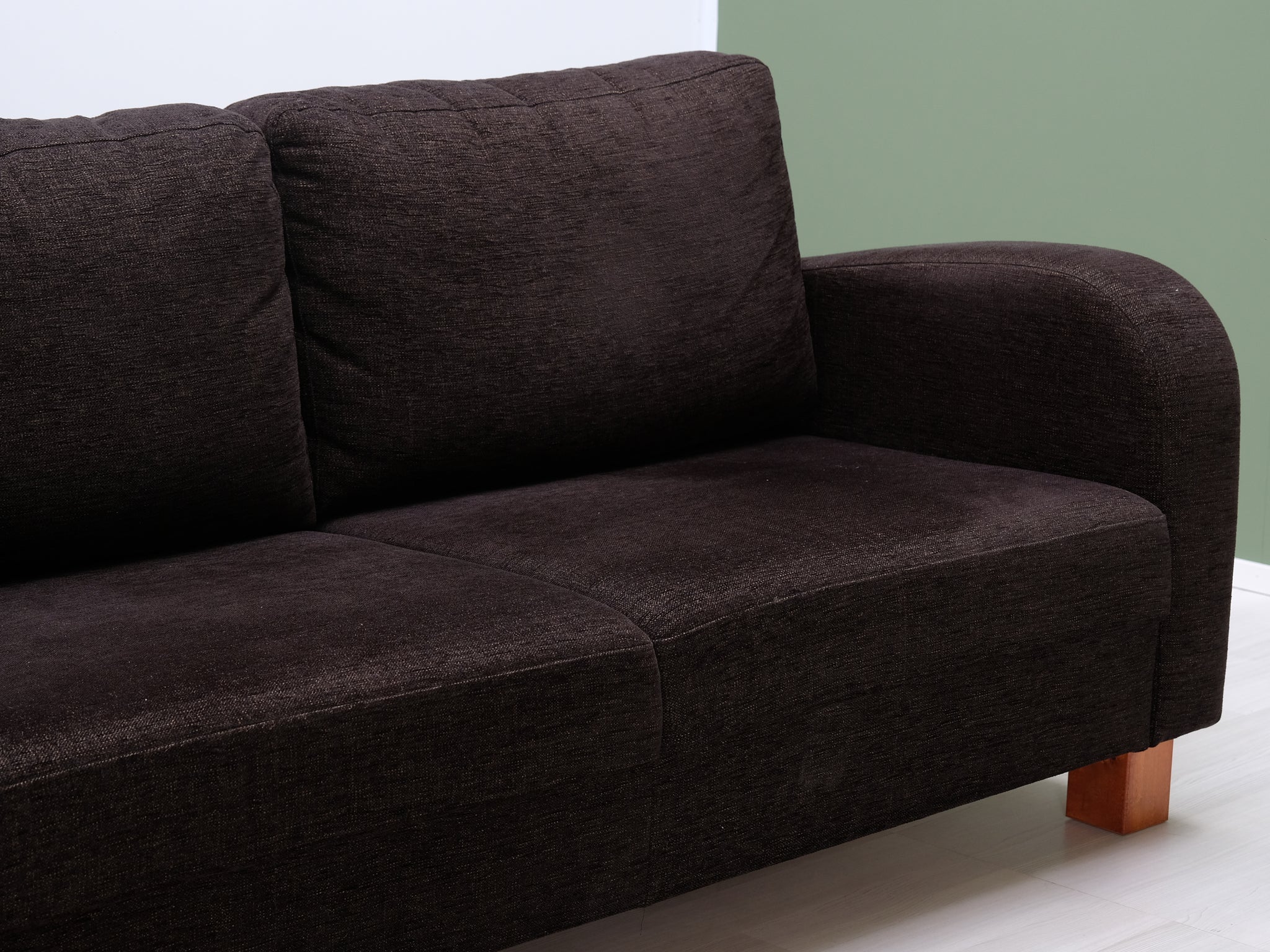 Ruskea kangassohva. Pehmeä selkämys ja istuintyynyt takaavat mainion istuvuuden. Puiset jalat korottavat sohvan ilmaan niin, että sen alta on helppo imuroida.