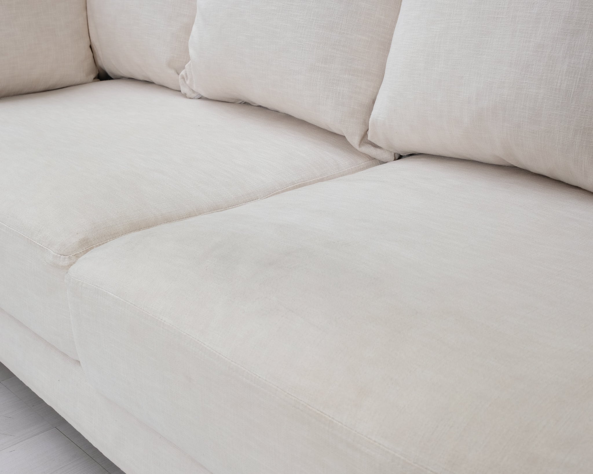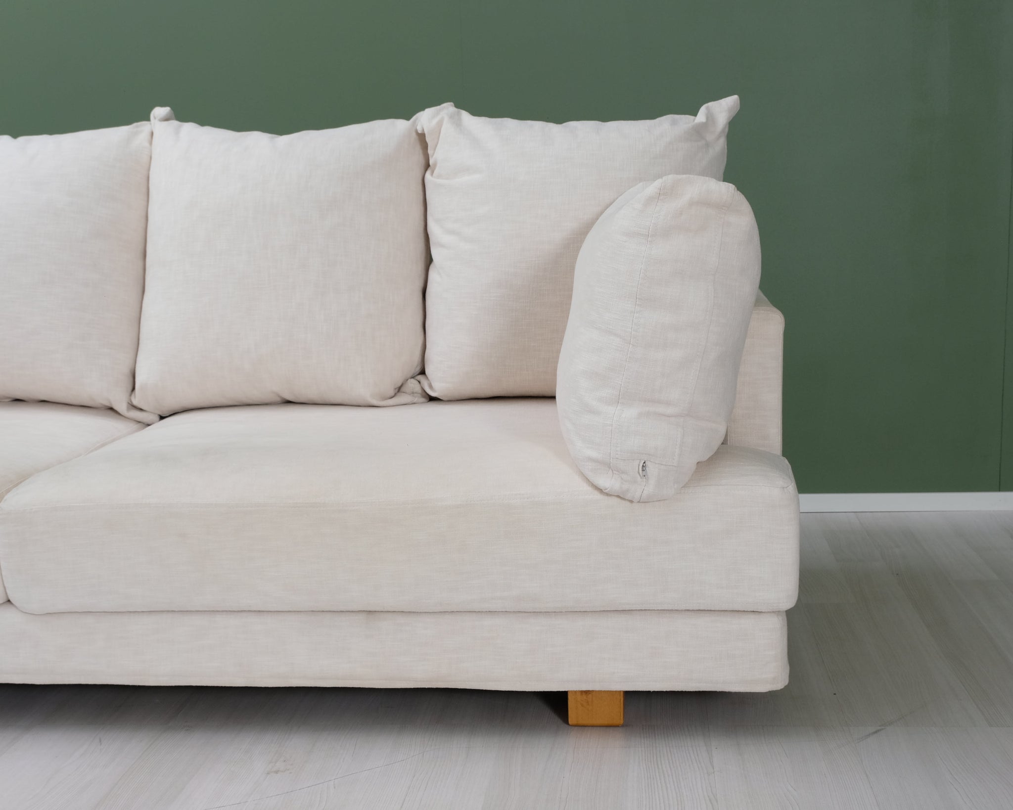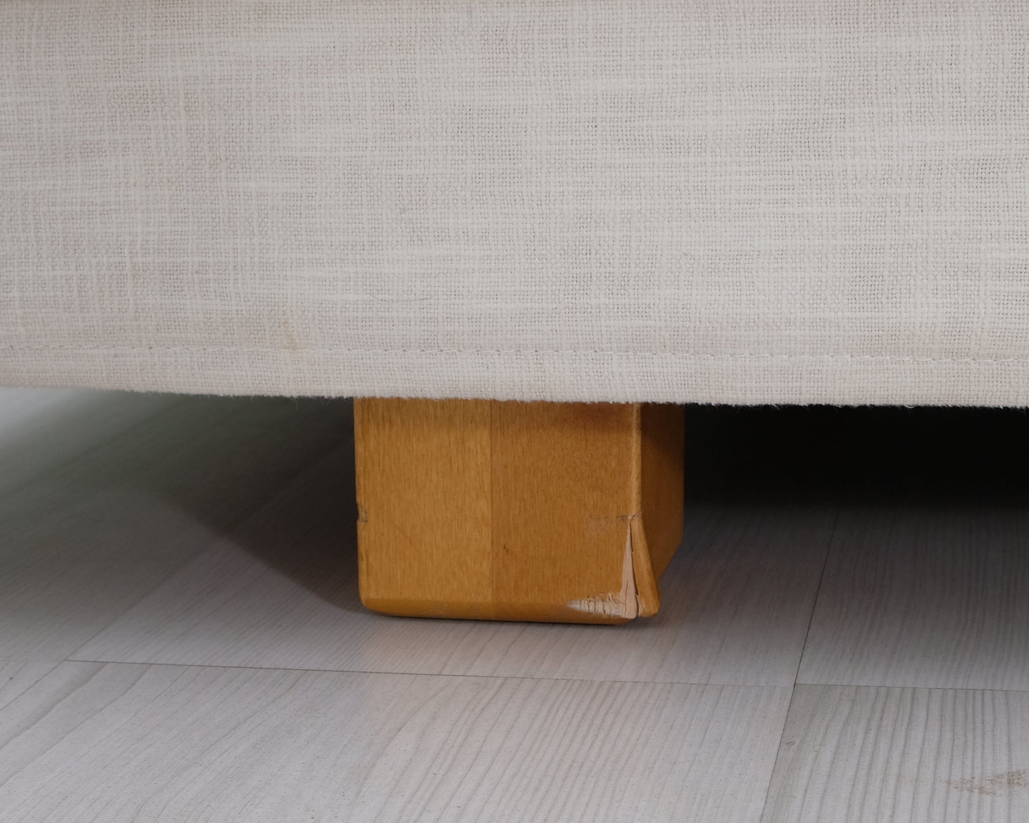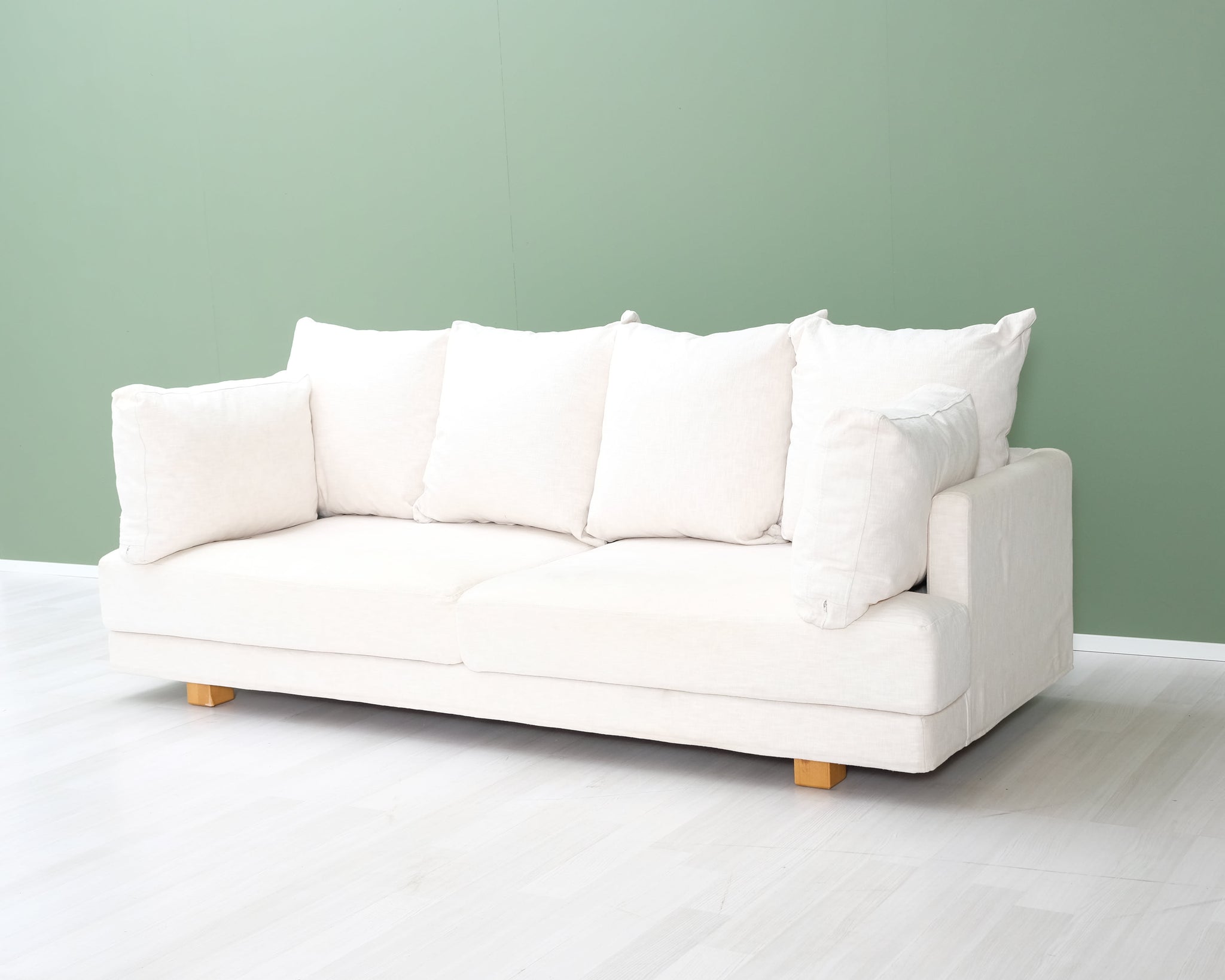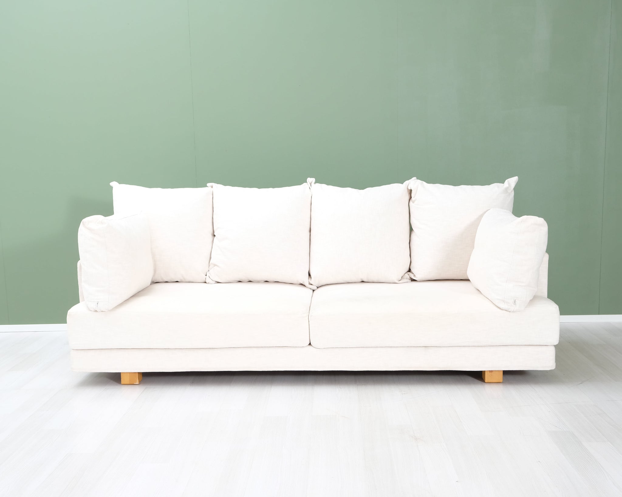 Tyylikäs, kolmelle hengelle sopiva sohva. Valkoinen kangasverhoilu ja puiset jalat.