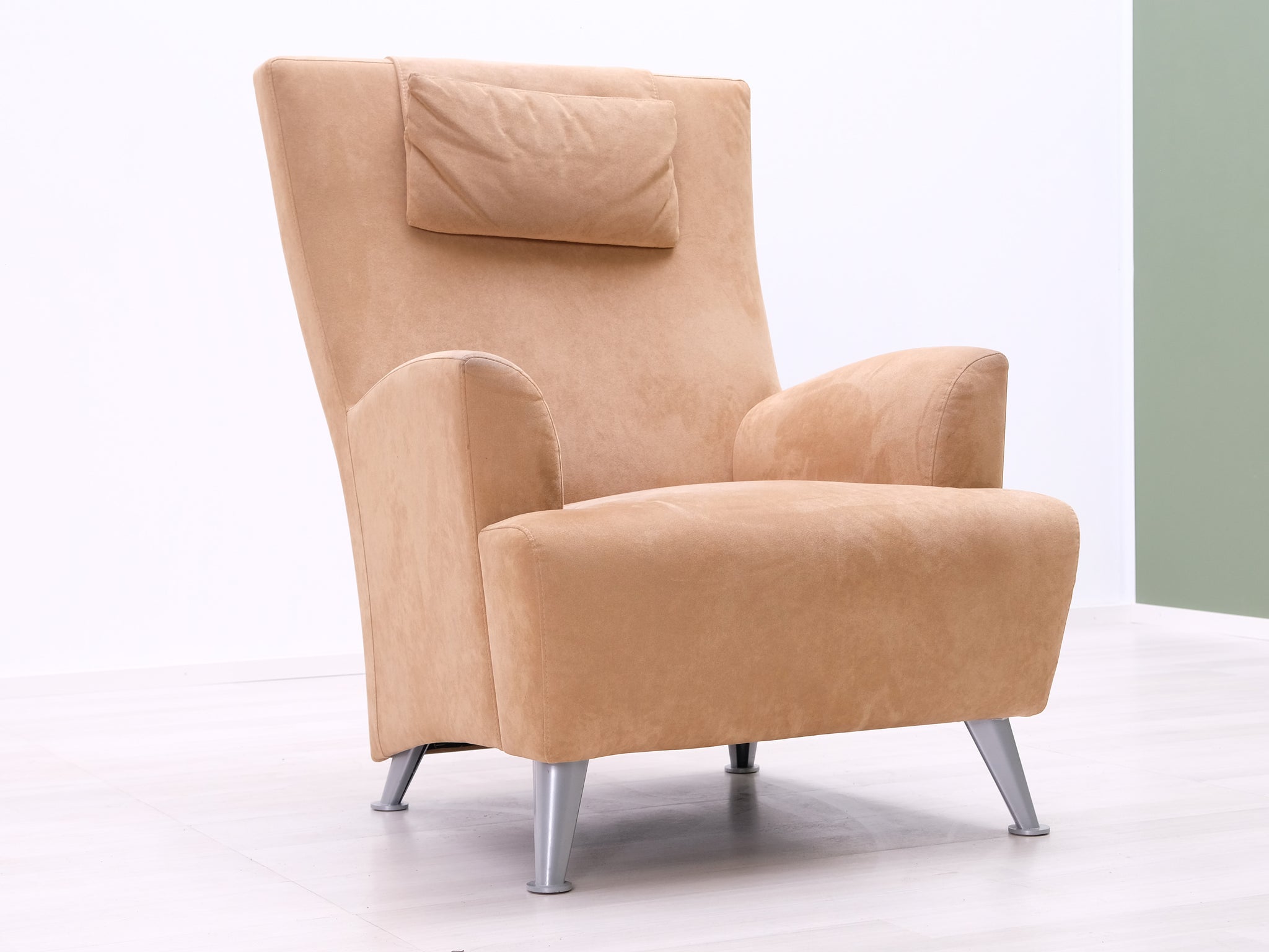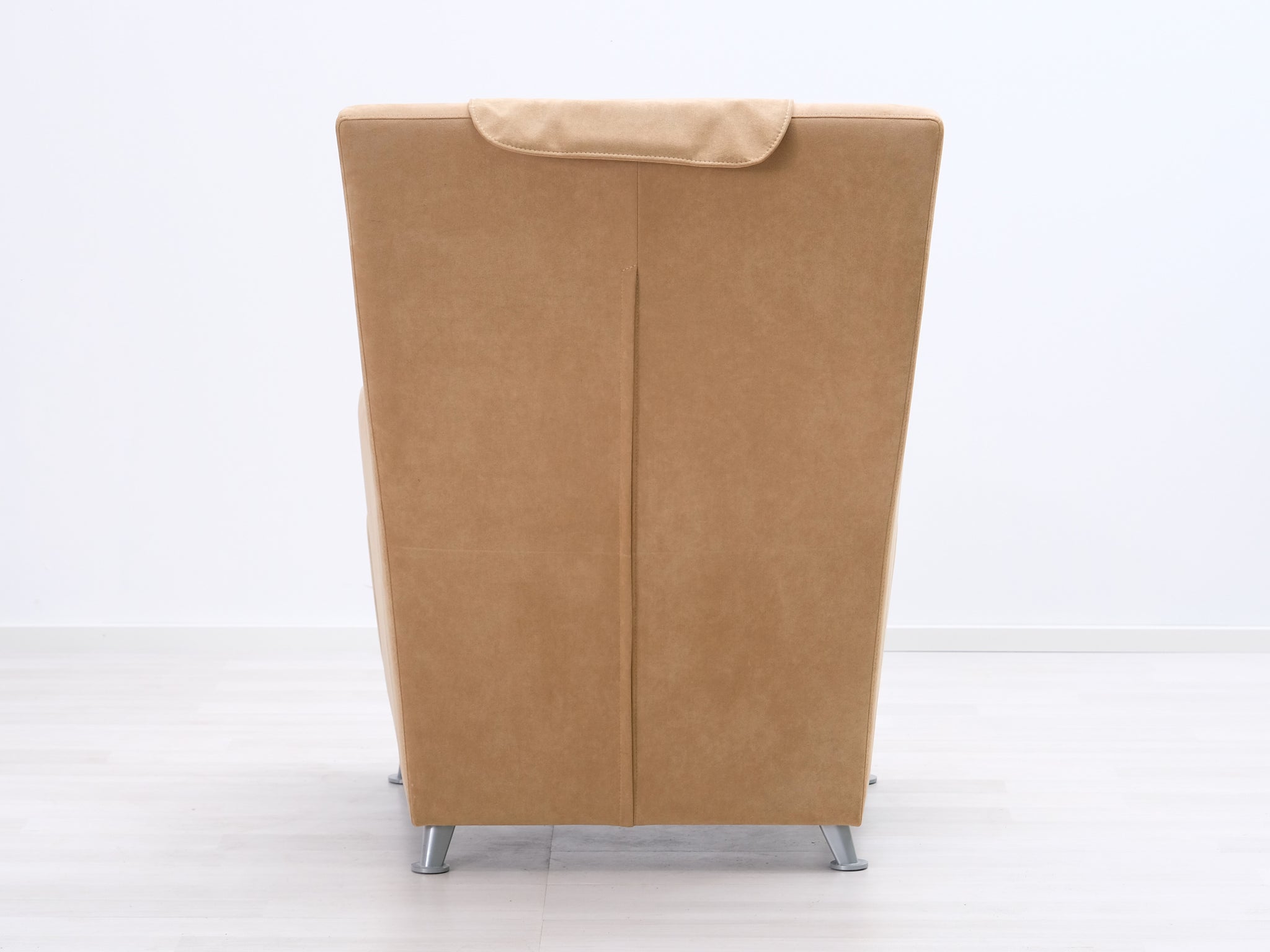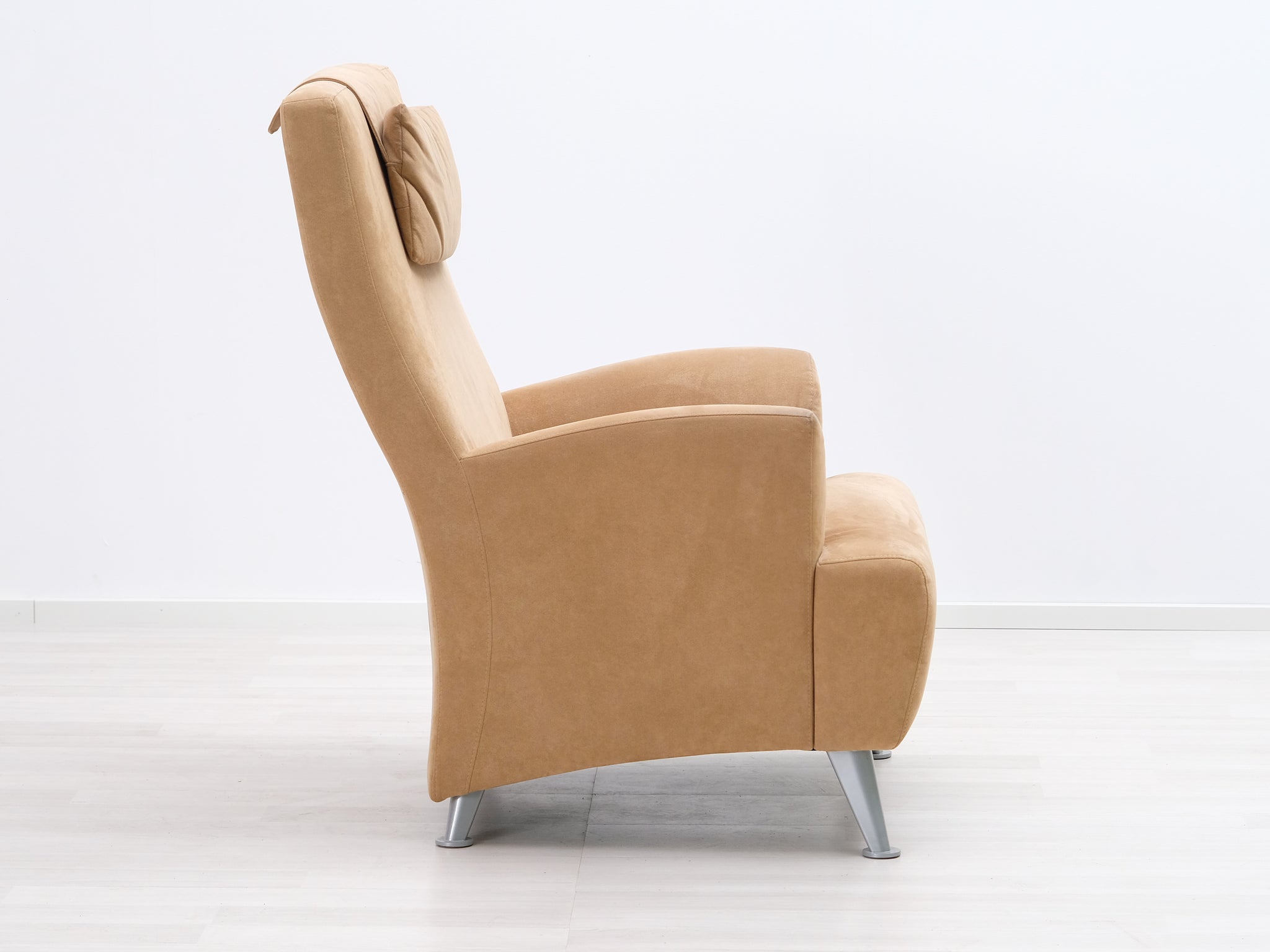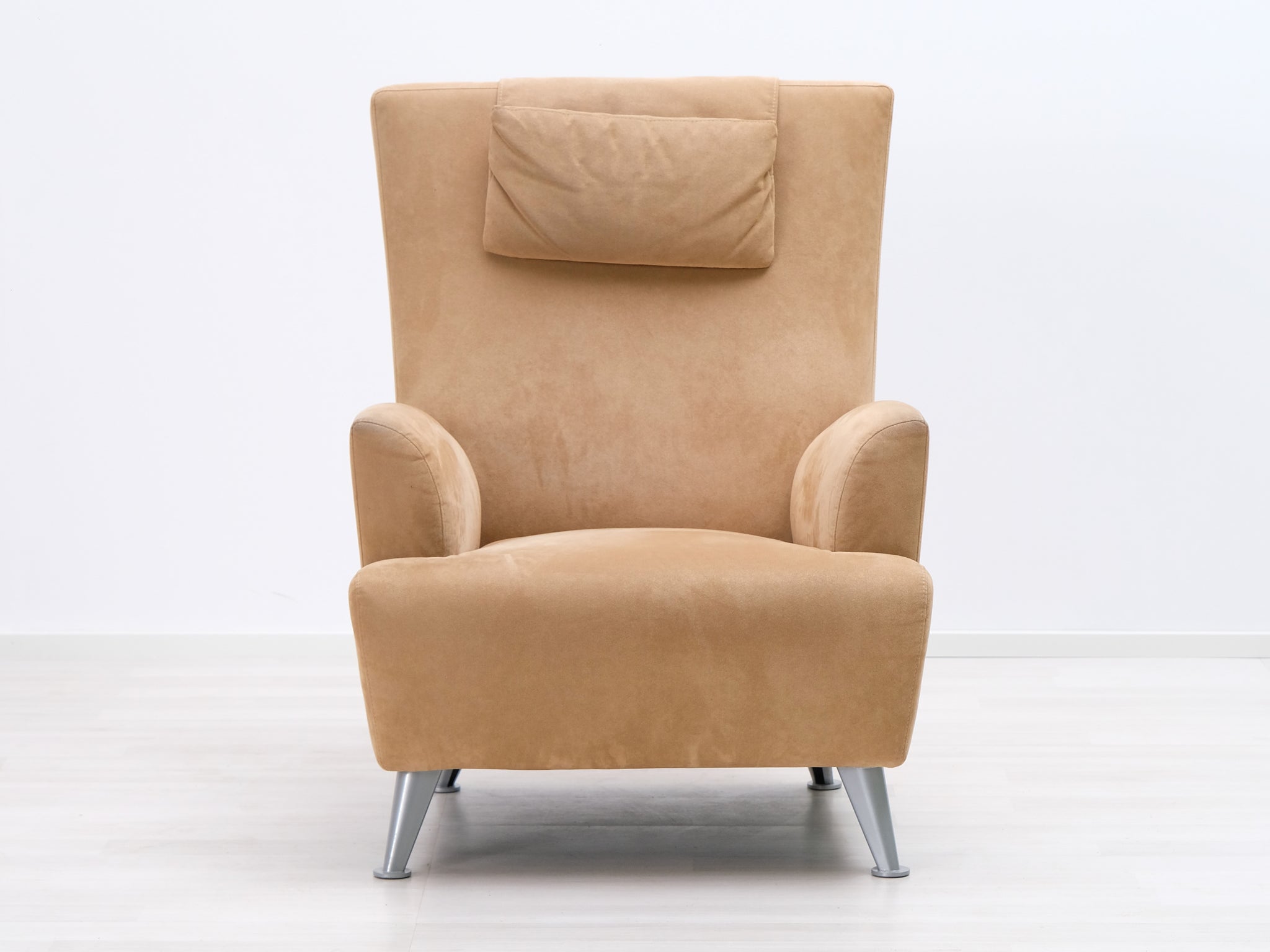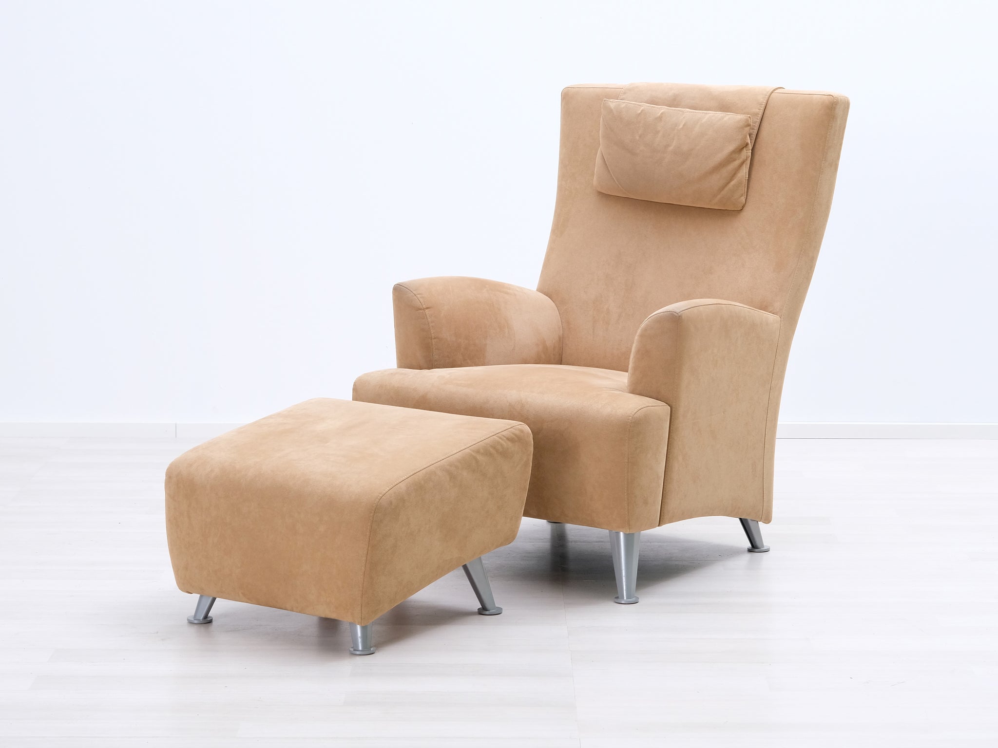 Korkeaselkäinen nojatuoli yhdessä rahin kanssa muodostavat ryhdikkään ja rentouttavan kokonaisuuden. Kiinteä kangasverhoilu ja metalliset jalat.
