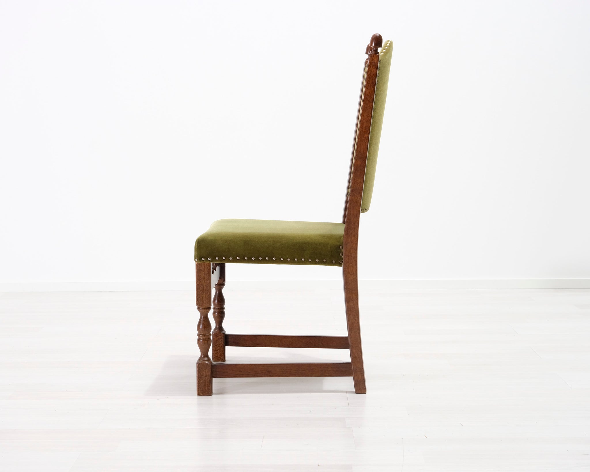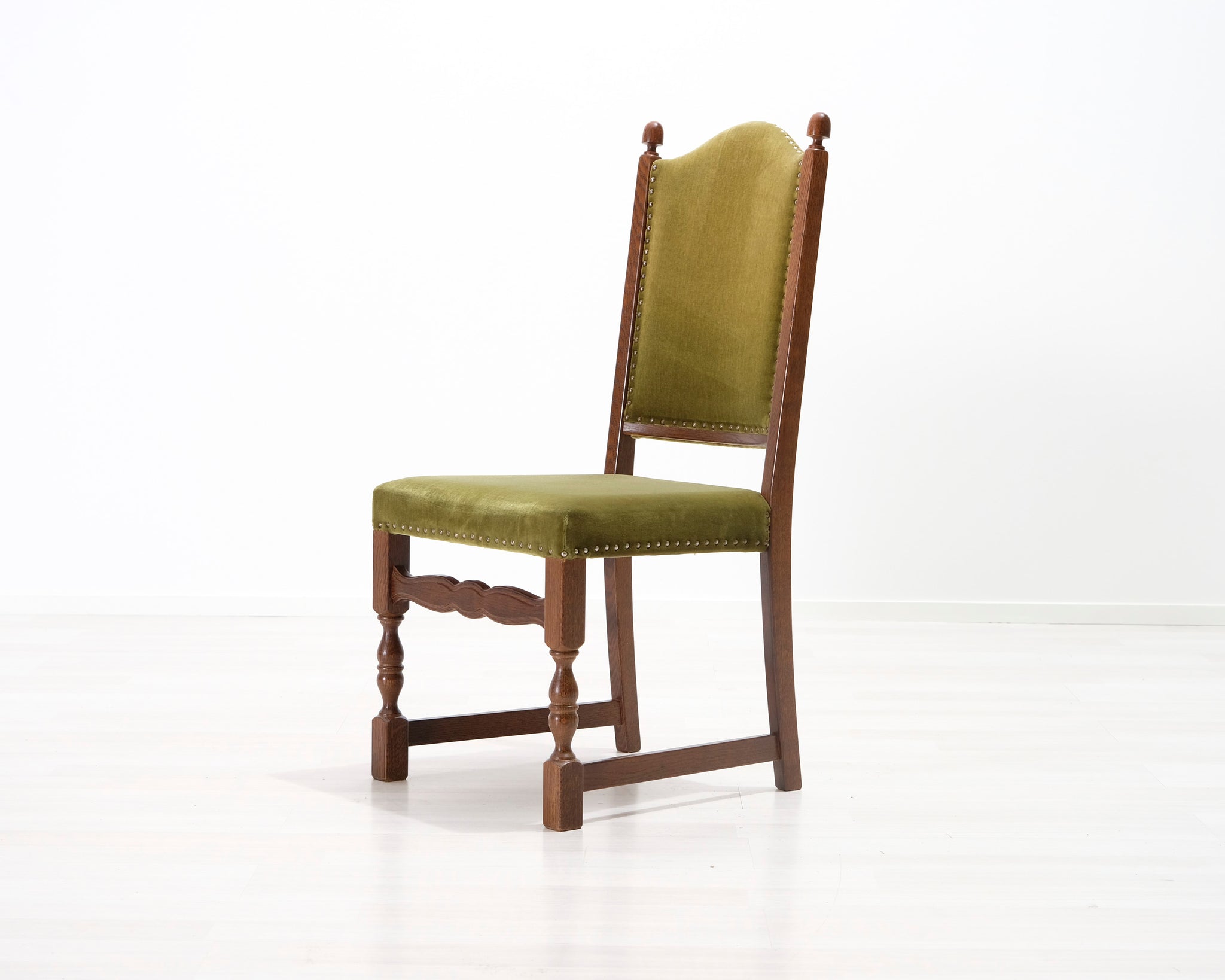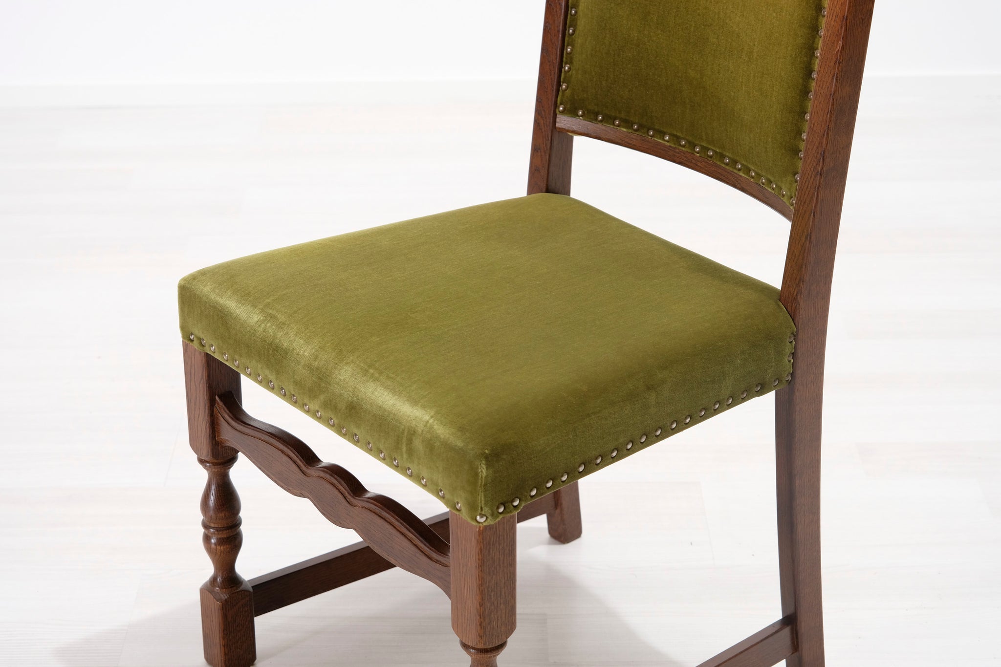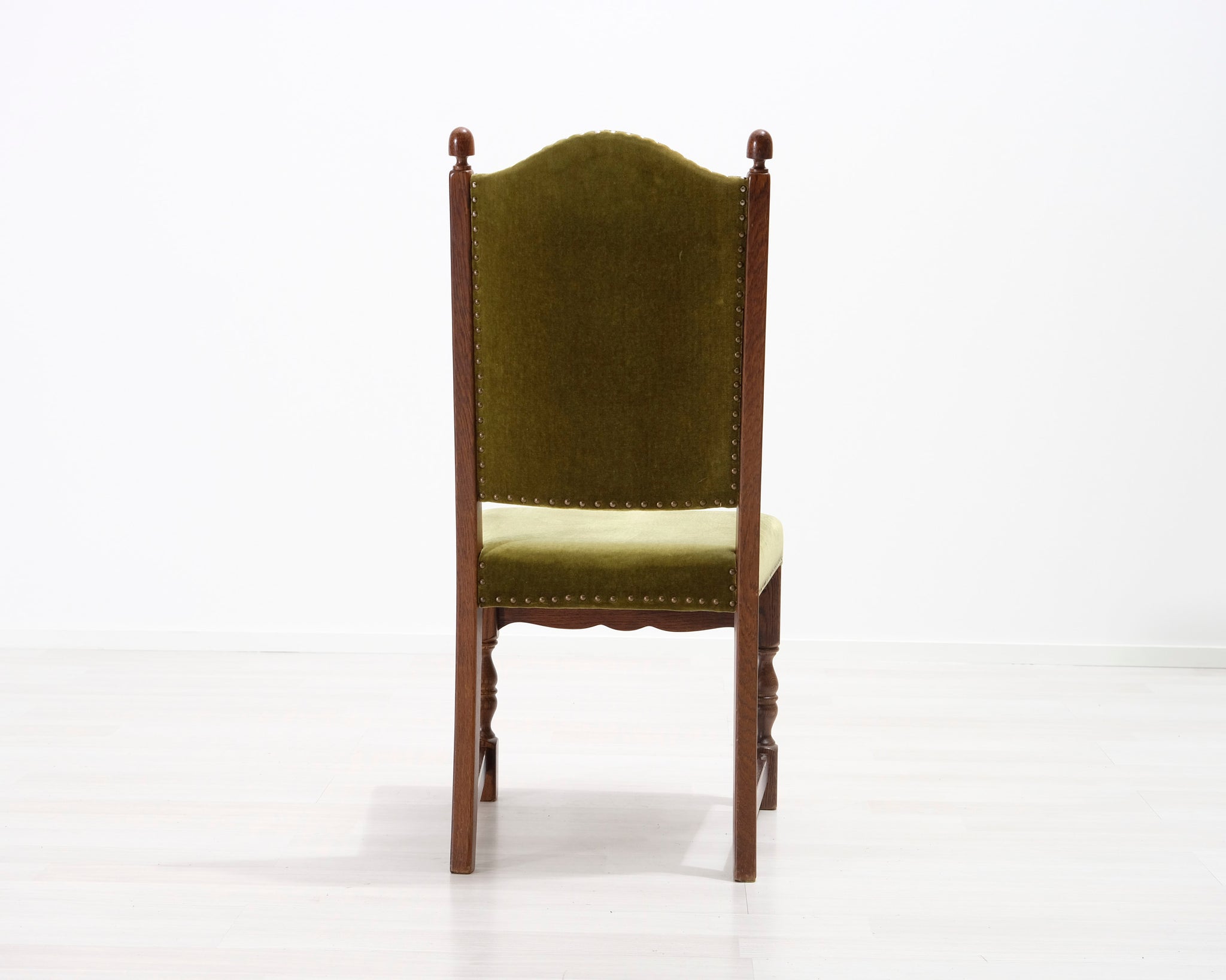 Antiikkituoli 1800-luvulta. Vihreällä samettikankaalla verhoiltu istuin ja selkänoja. Koristeelliset niitit ja runko.