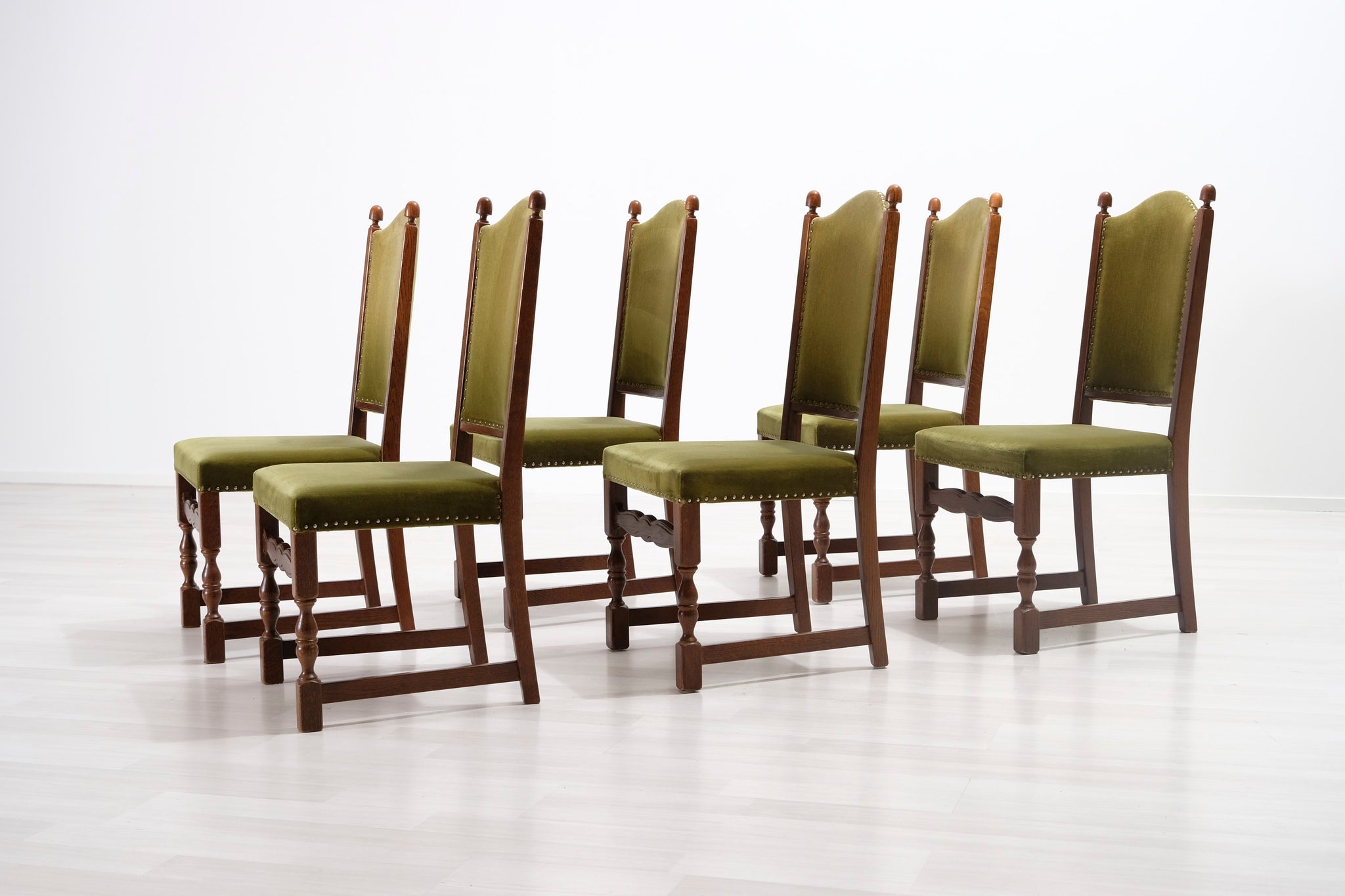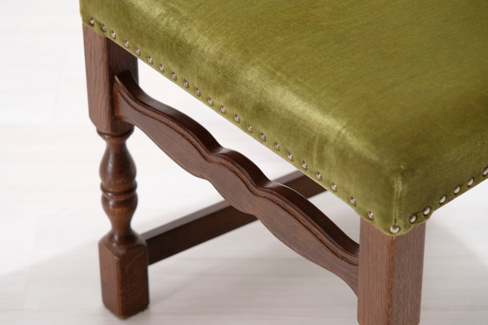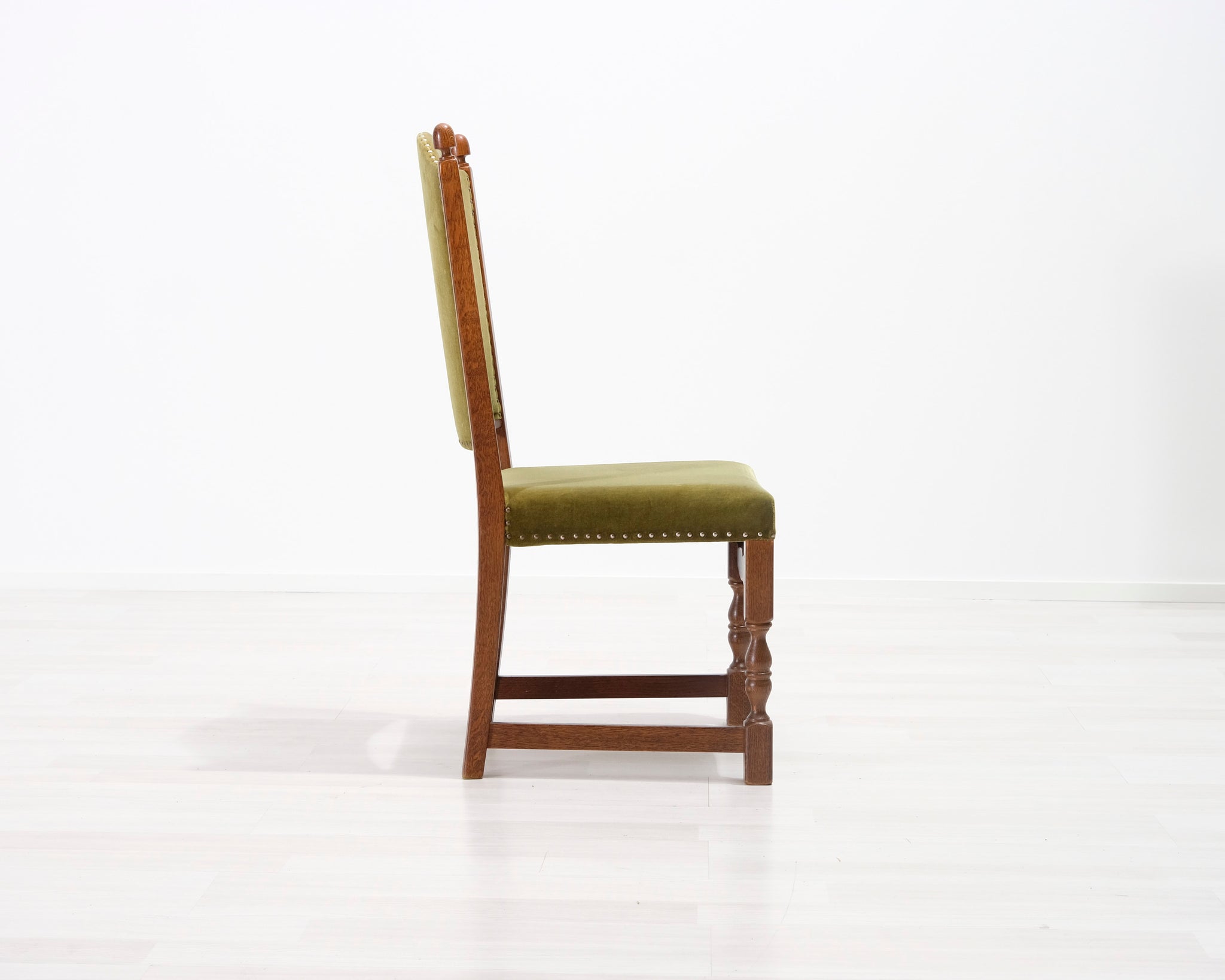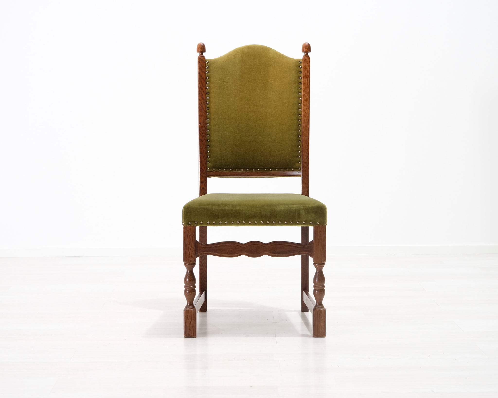 Antiikkituoli 1800-luvulta. Vihreällä samettikankaalla verhoiltu istuin ja selkänoja. Koristeelliset niitit ja runko.