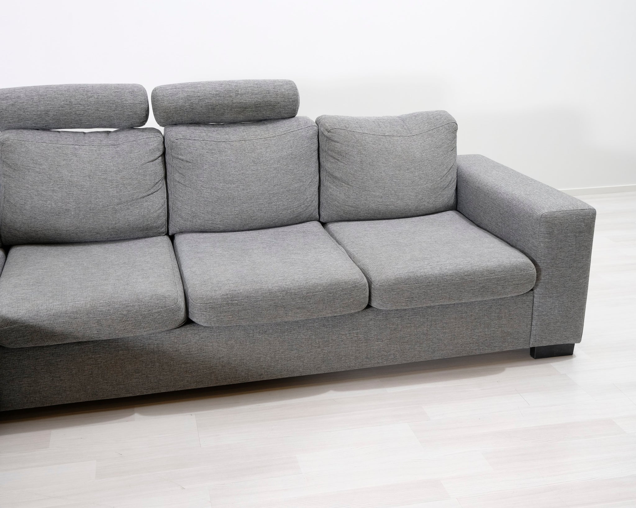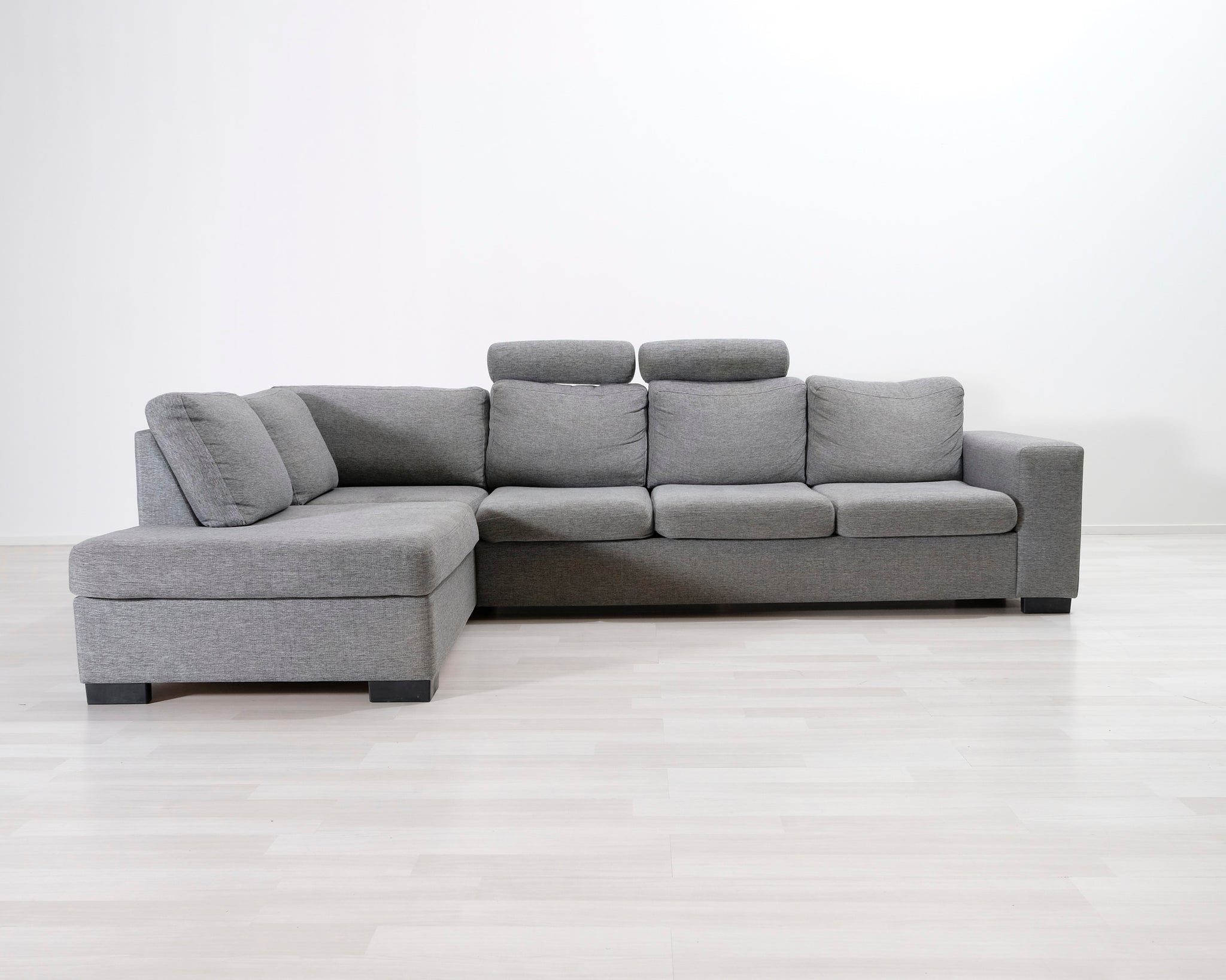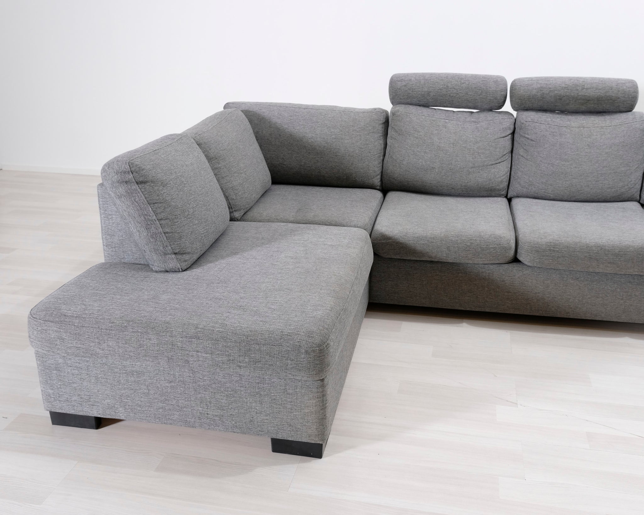 Suuri, harmaalla kankaalla verhoiltu avokulmasohva. Niskatyynyt antavat sohvalle lisämukavuutta.